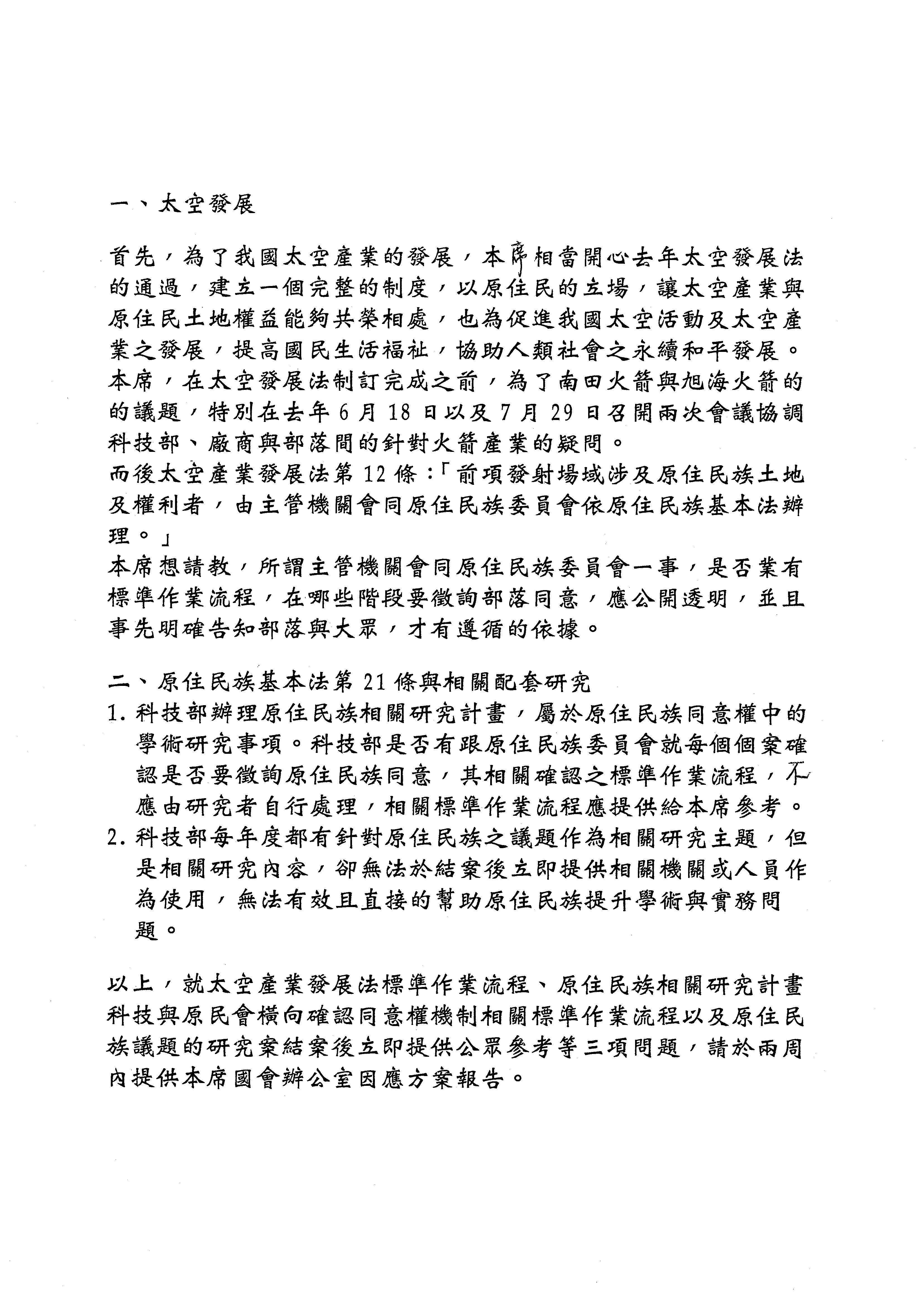 李委員德維:韓國發射首架純韓國製的運載火箭世界號(KSLV-Ⅱ),成為全世界第七個成功獨立發射中大型運載火箭的國家,也為韓國航太產業開啟新紀元。請問在新的太空時代這個部分,韓國又比臺灣搶先一步嗎?我們的計畫是怎麼樣?我們的航太產業準備得怎麼樣?