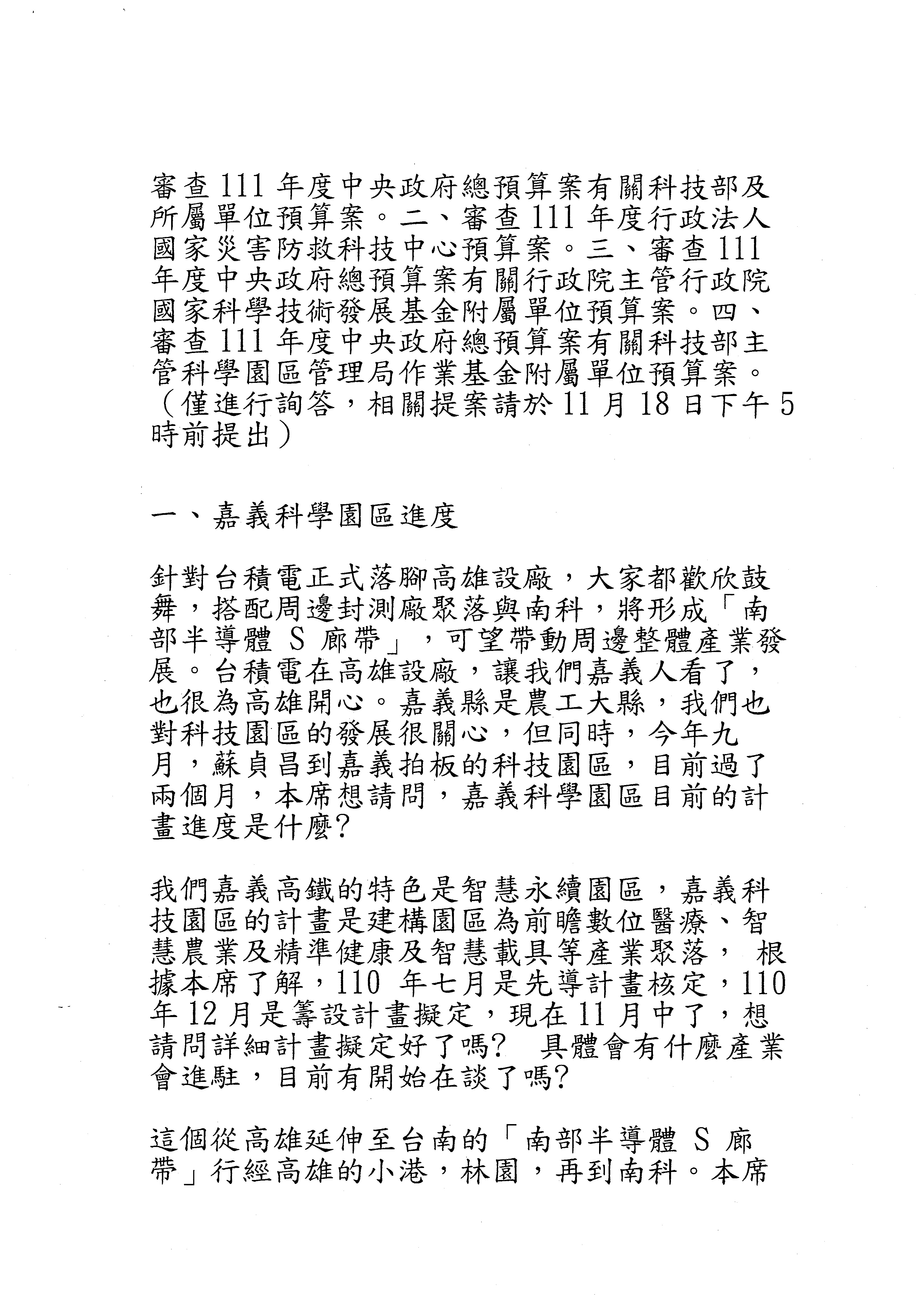主席:111年度中央政府總預算案有關科技部及所屬單位預算案、行政法人國家災害防救科技中心預算案、中央政府總預算案有關行政院主管行政院國家科學技術發展基金附屬單位預算案及中央政府總預算案有關科技部主管科學園區管理局作業基金附屬單位預算案,另定11月29日繼續審查。