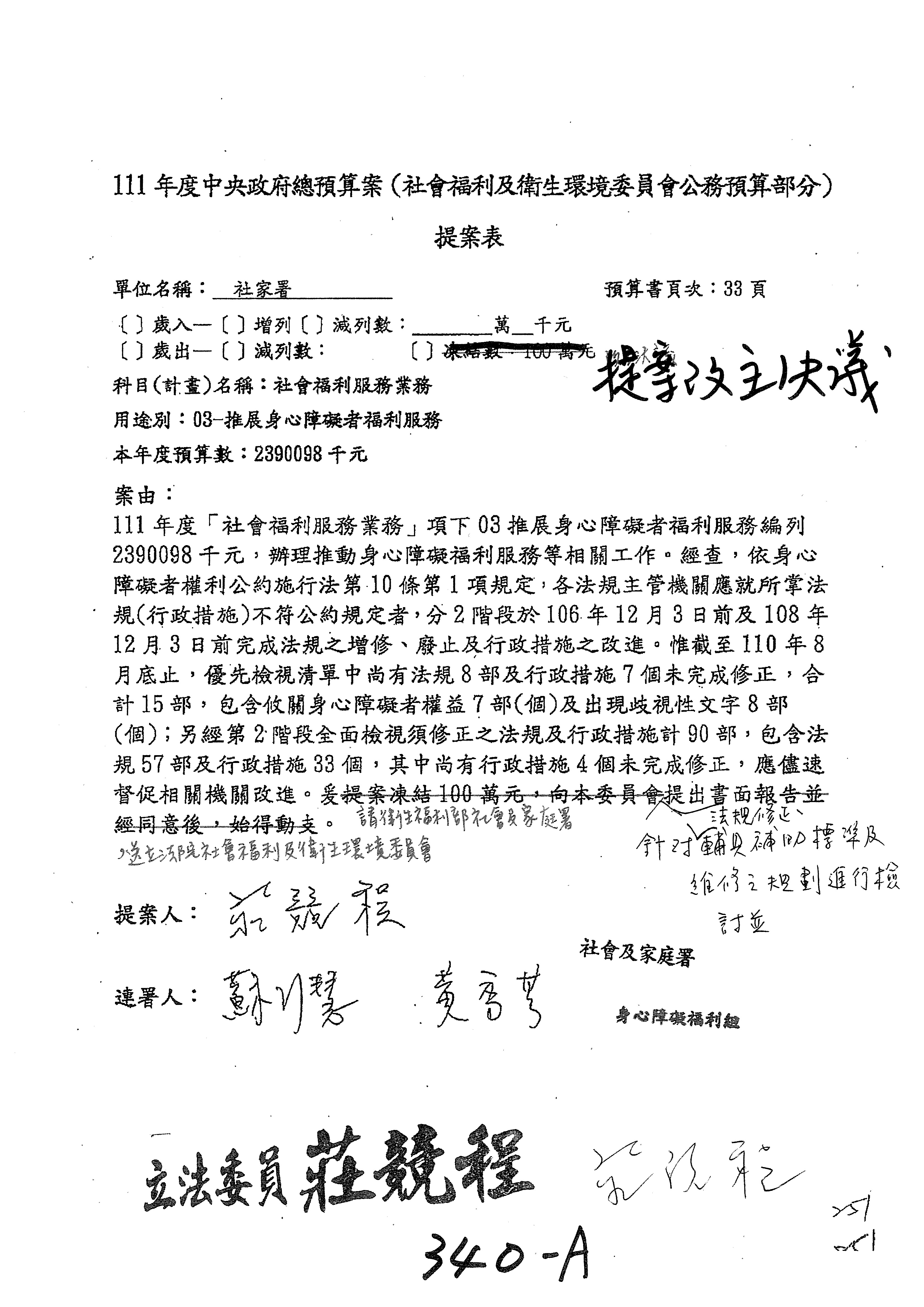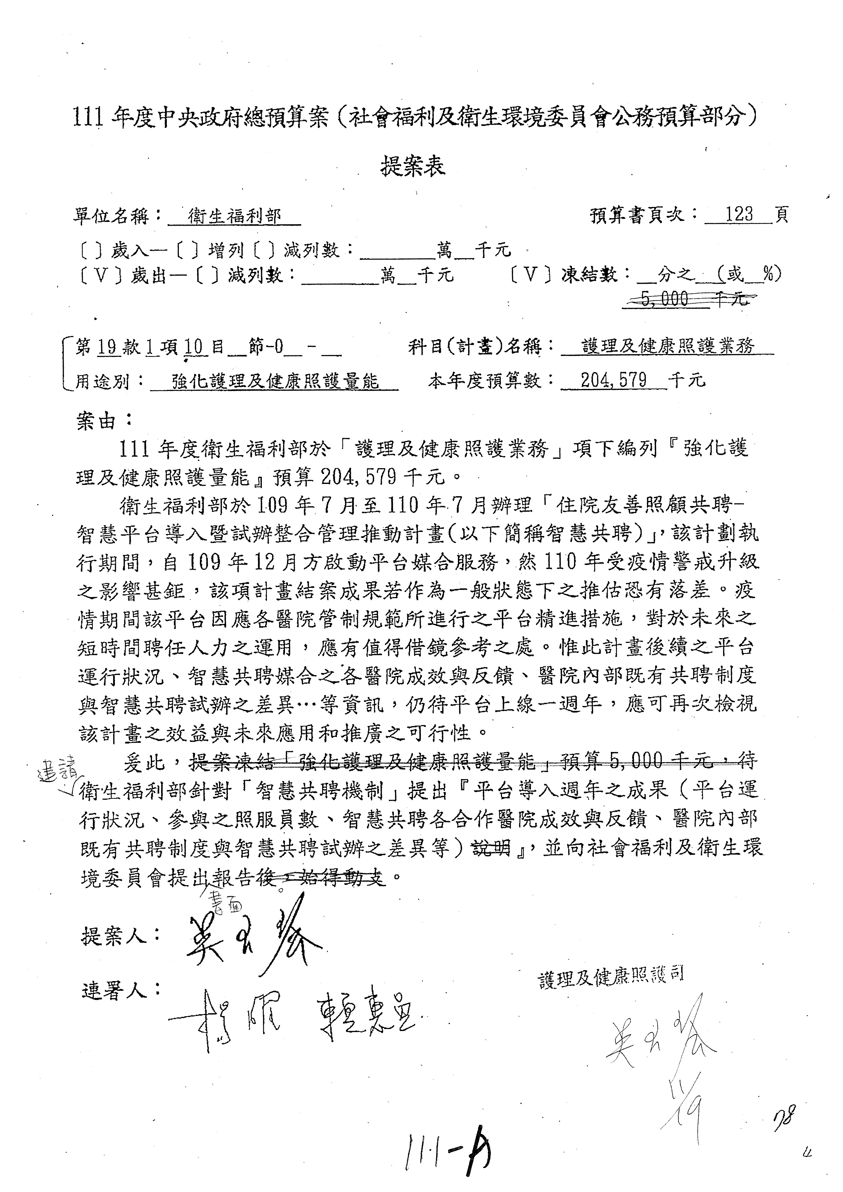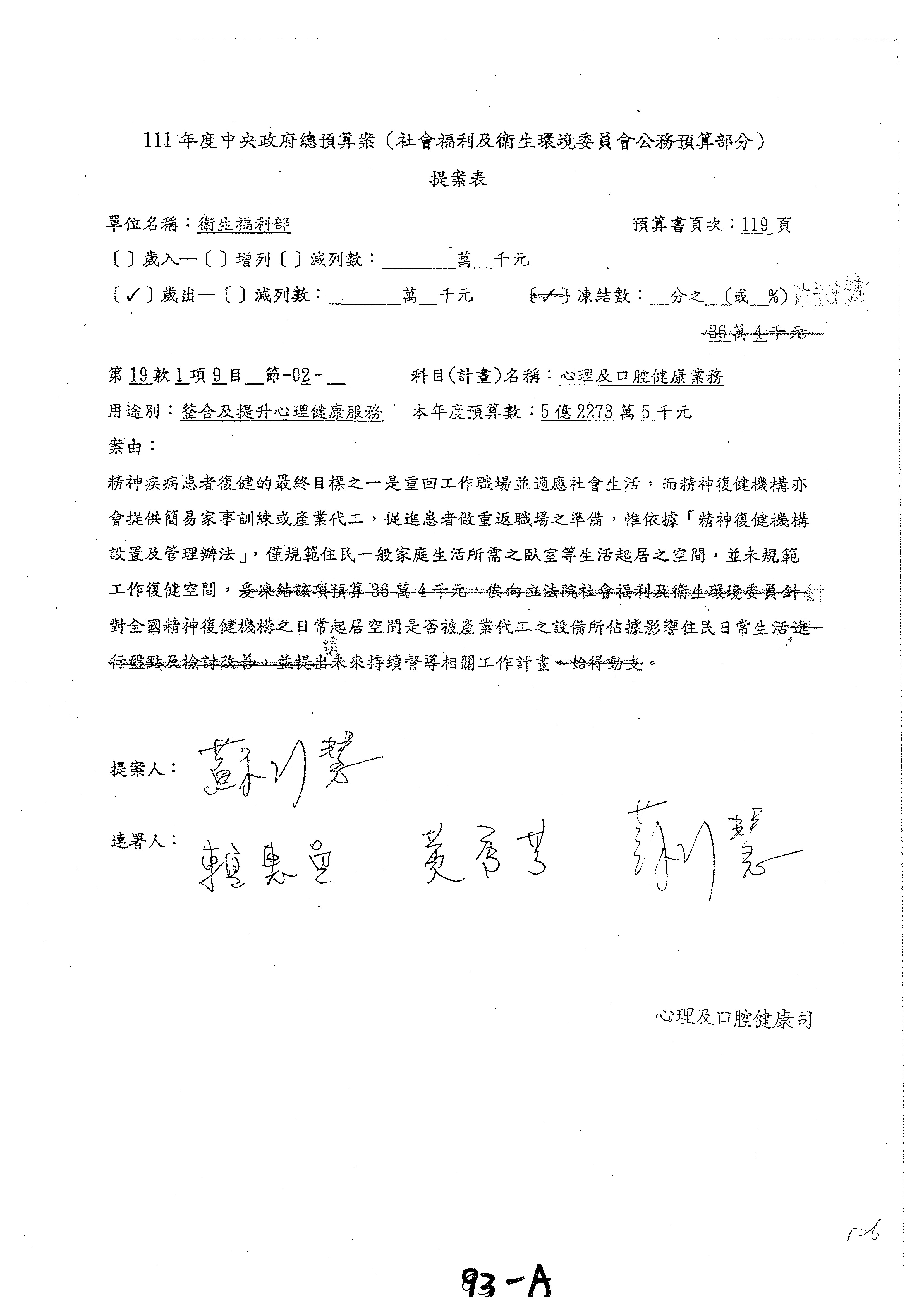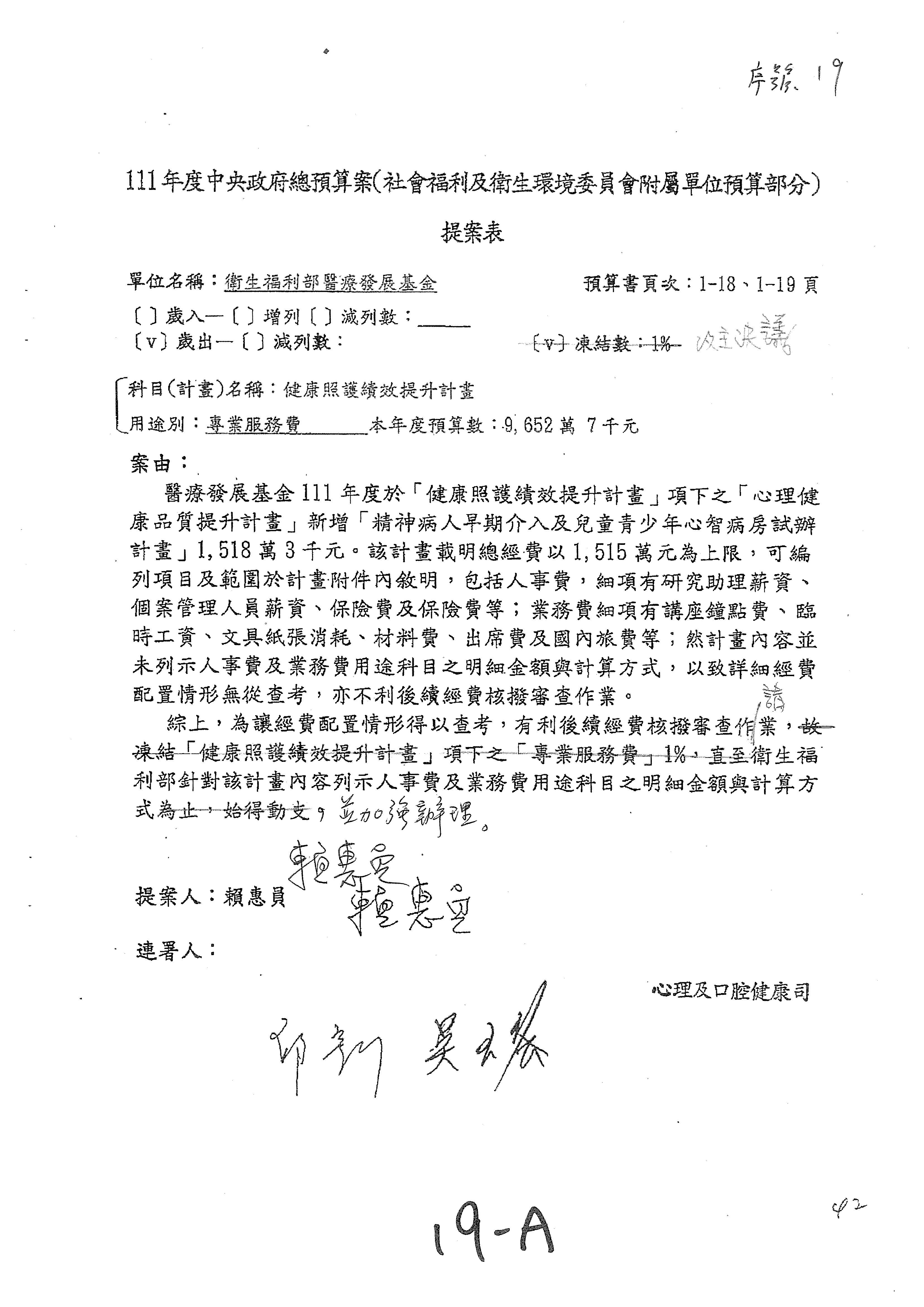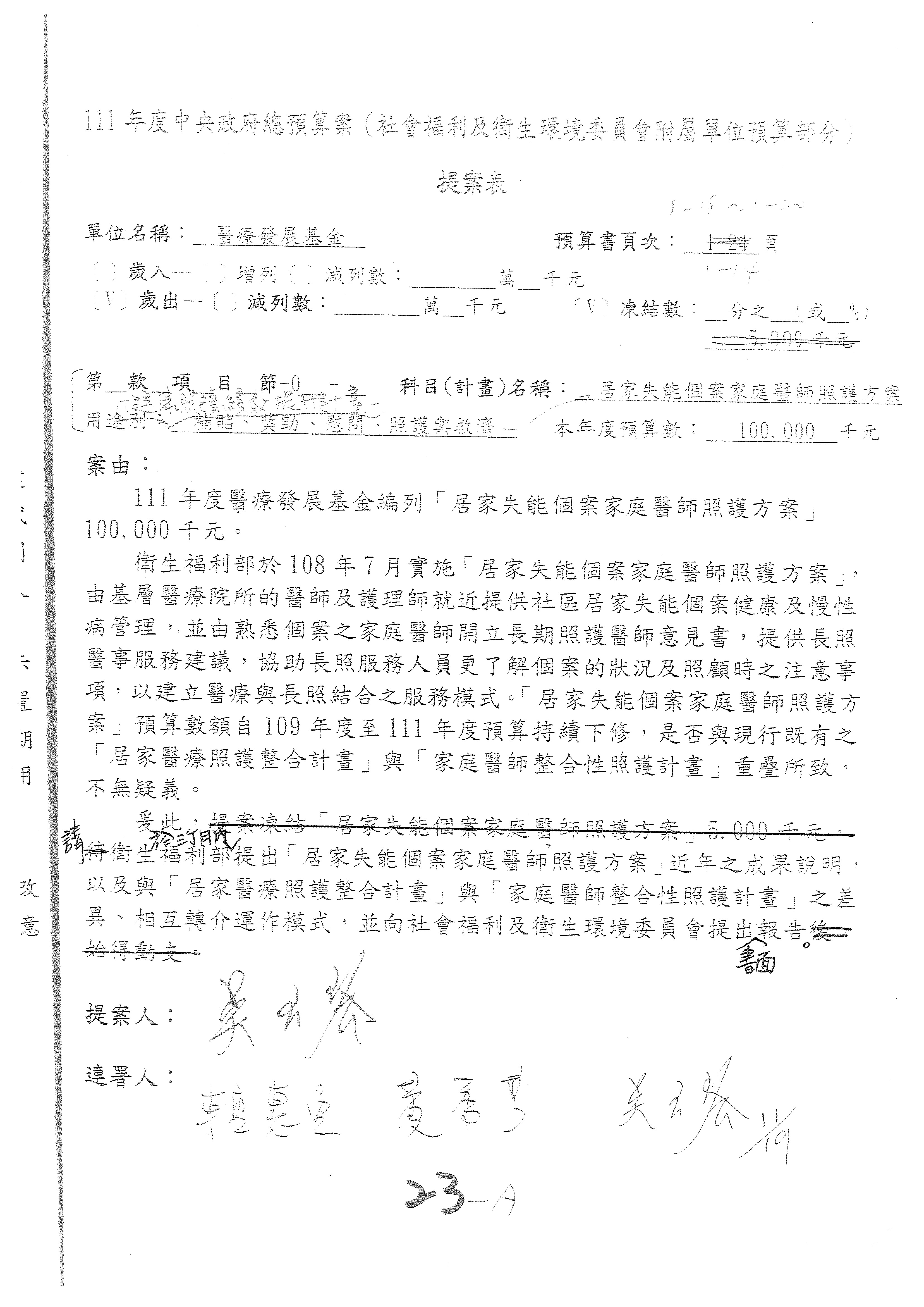 祝司長健芳:吳委員已經簽字,凍結「創新專業服務試辦計畫」這個分支計畫100萬元,並提出書面報告。