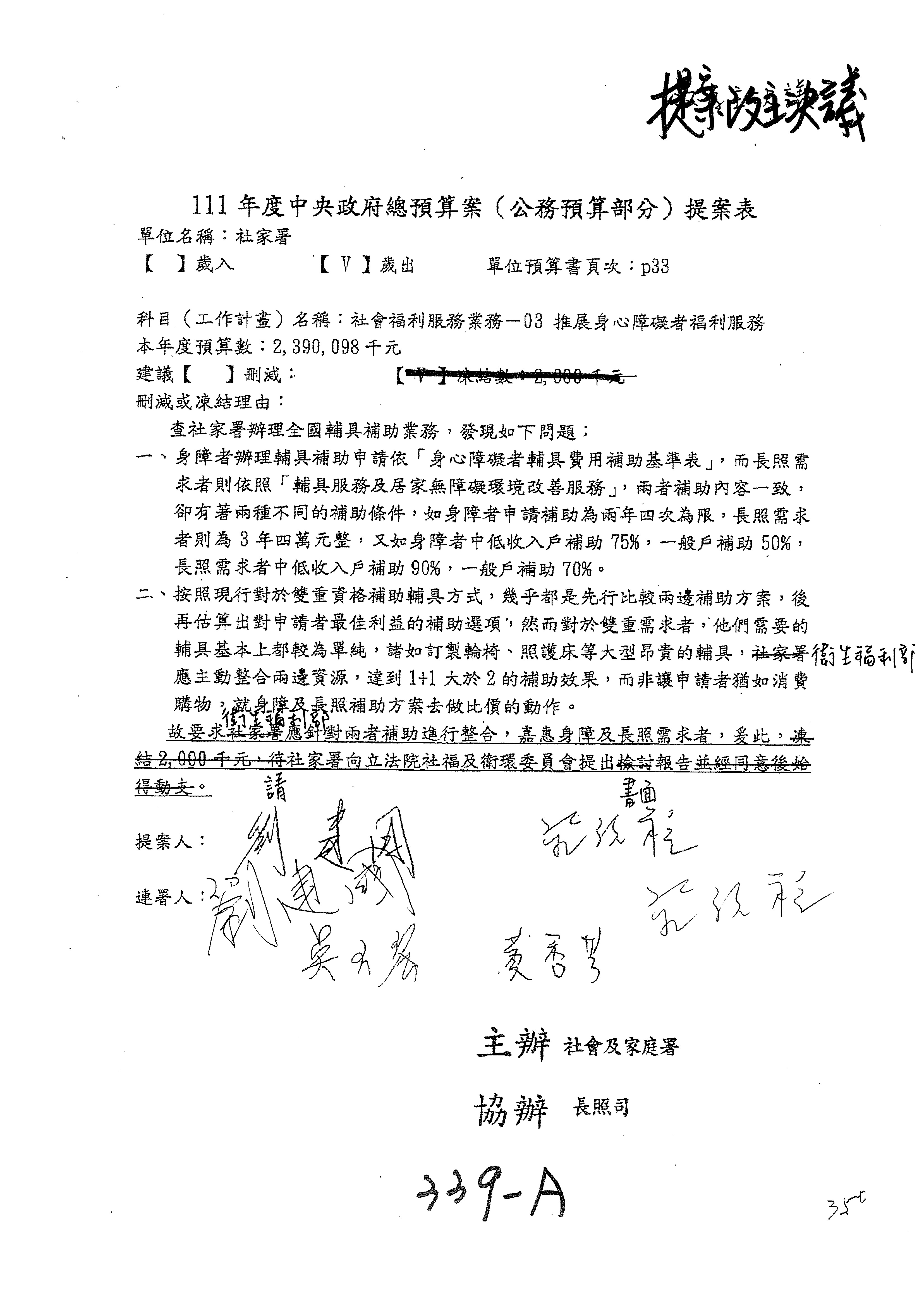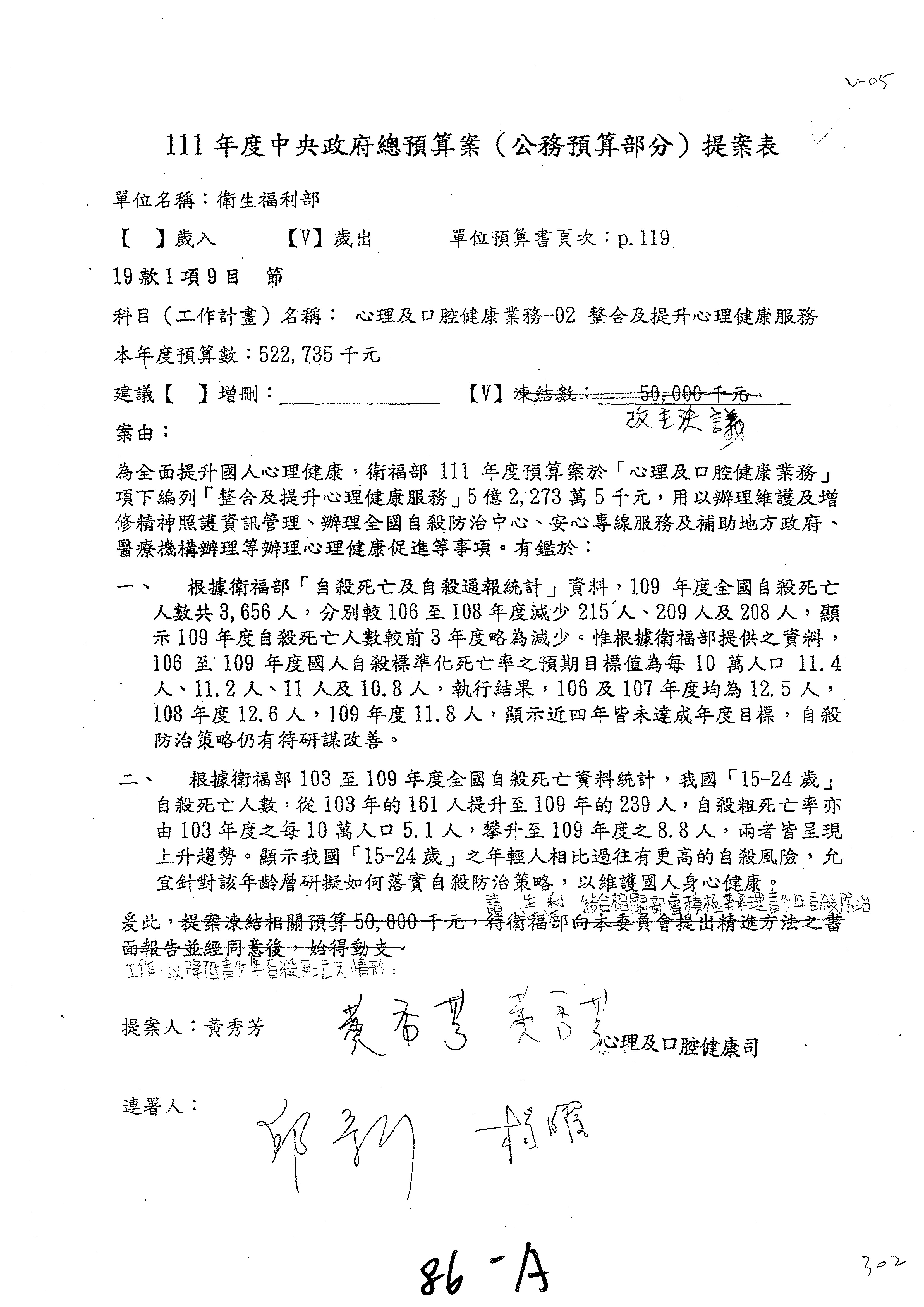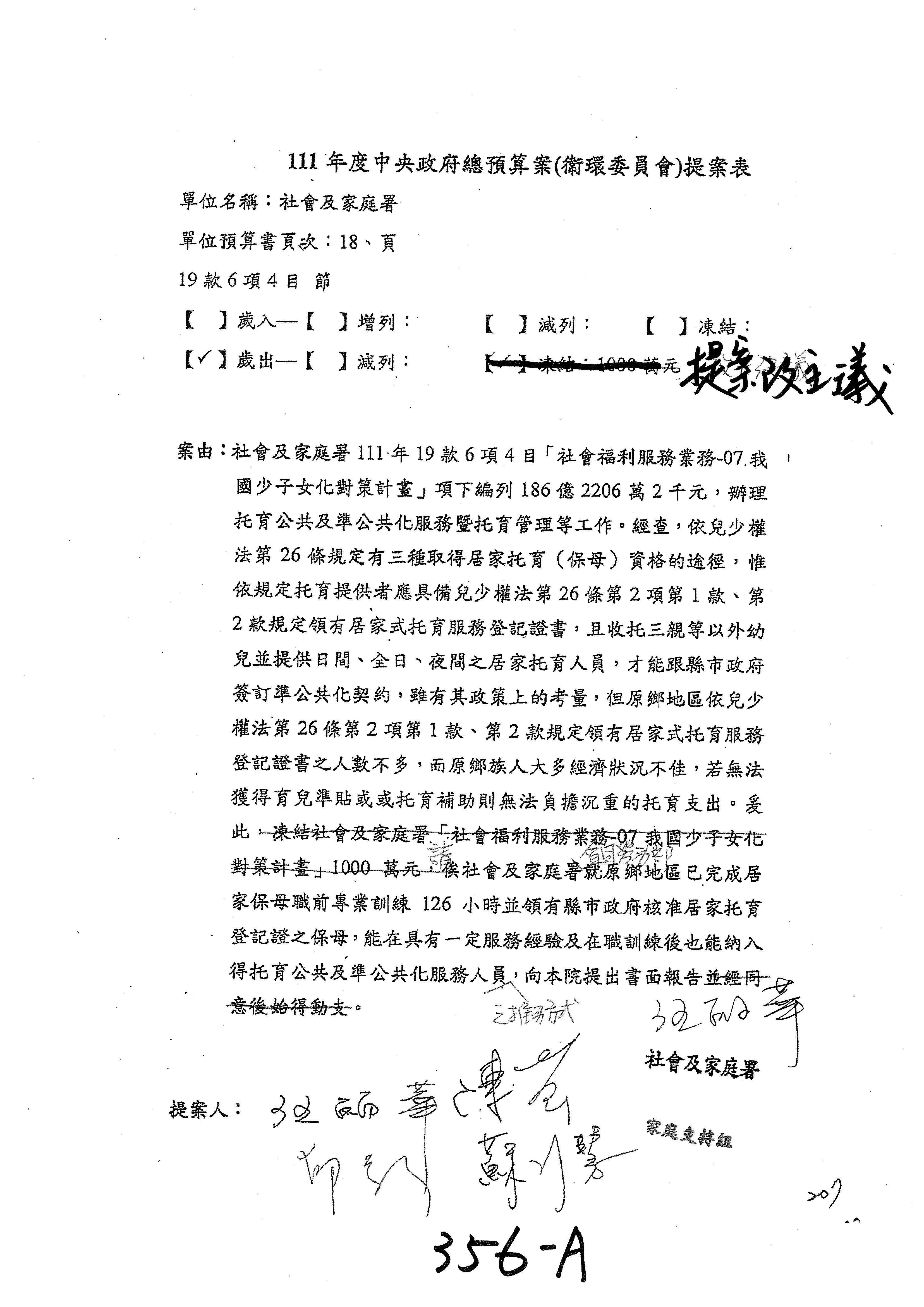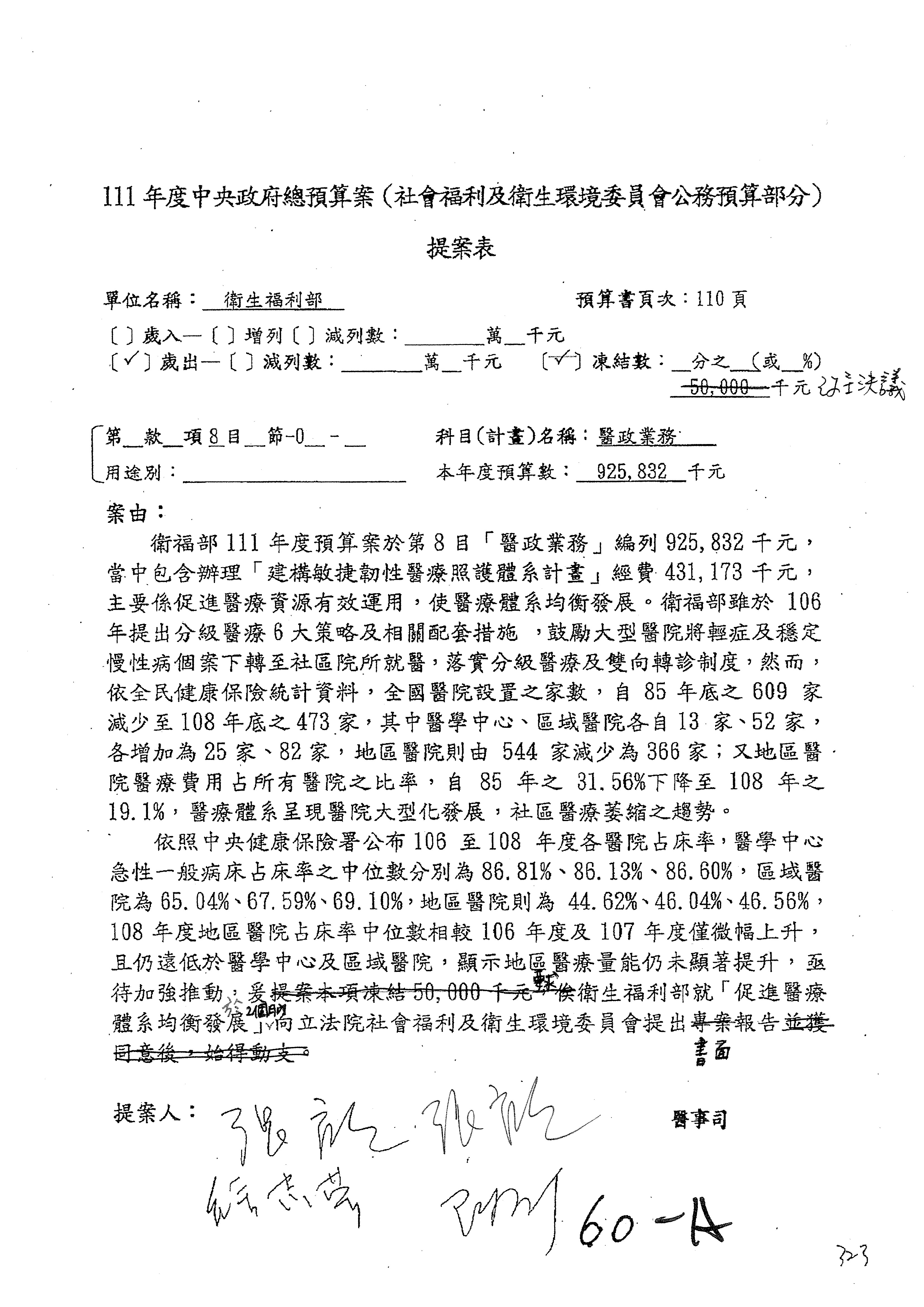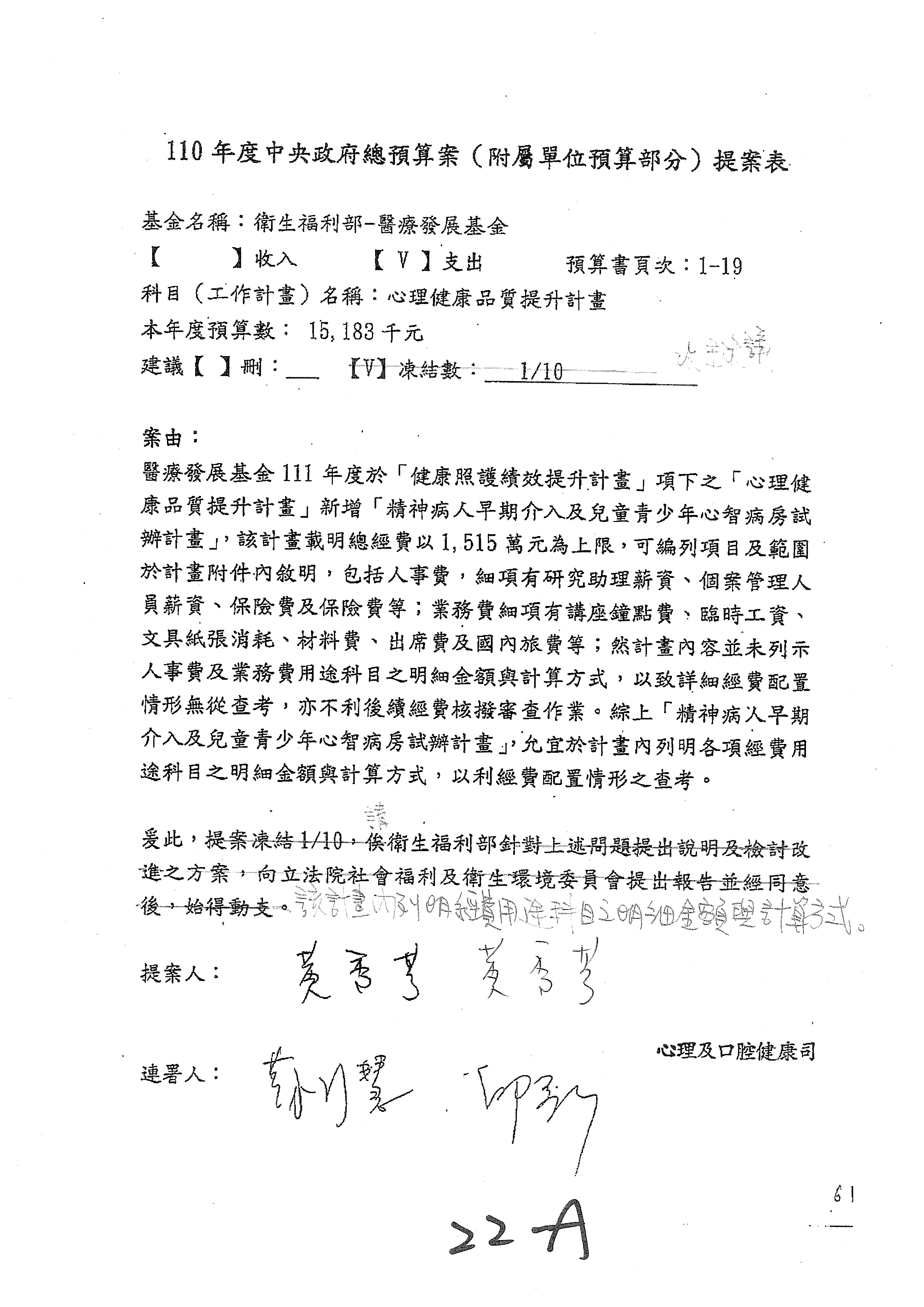 祝司長健芳:吳委員已經簽字,凍結「創新專業服務試辦計畫」這個分支計畫100萬元,並提出書面報告。