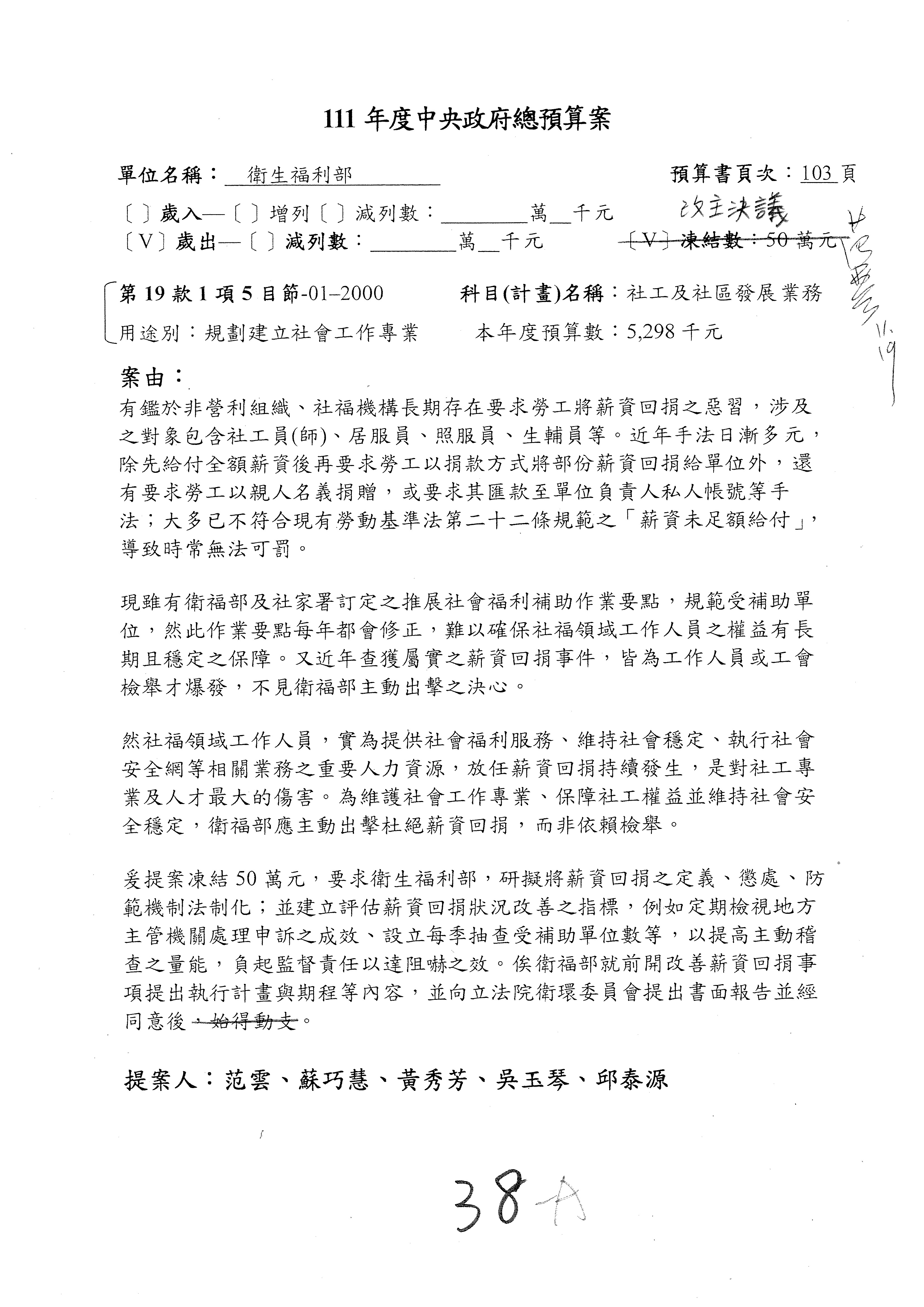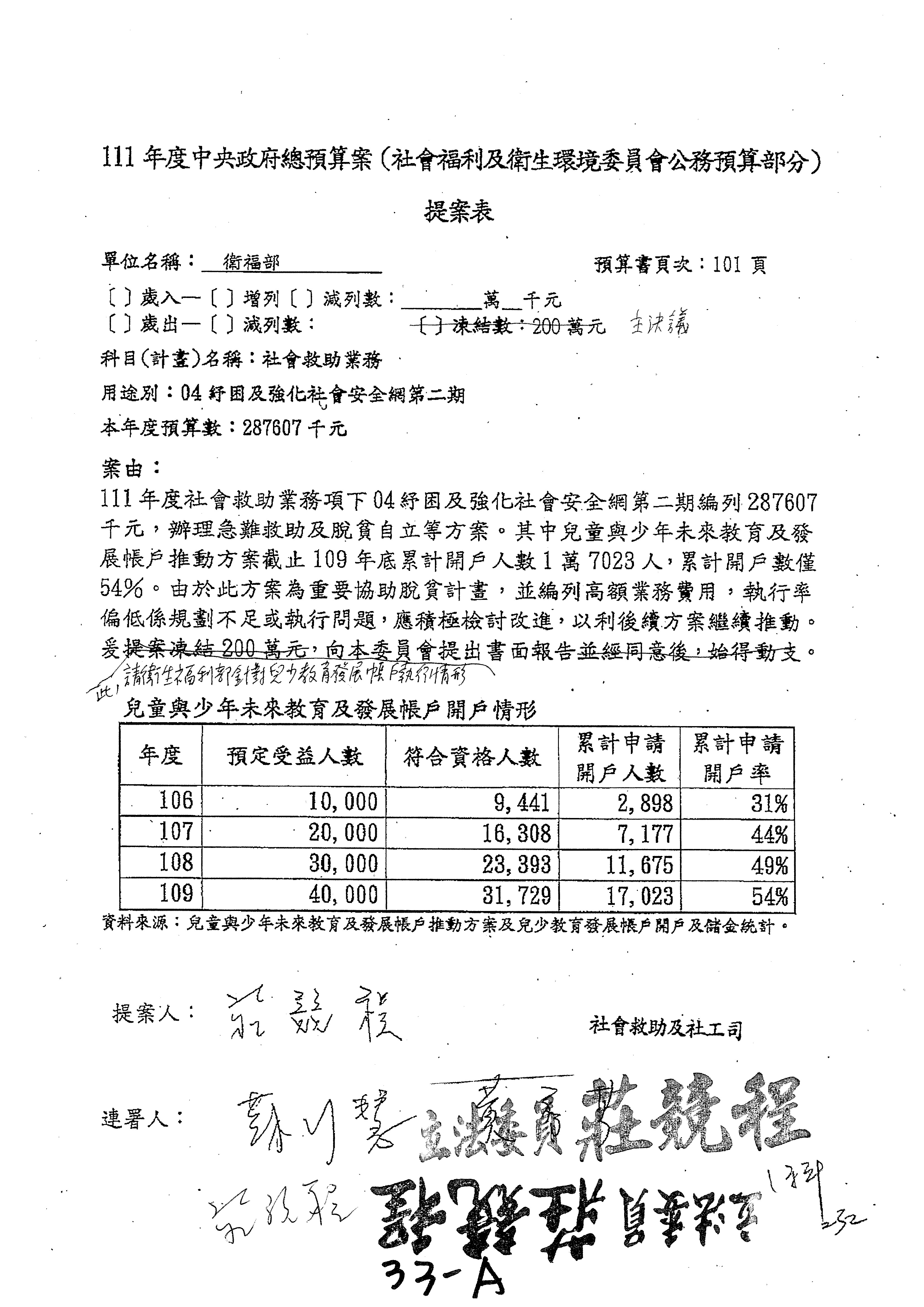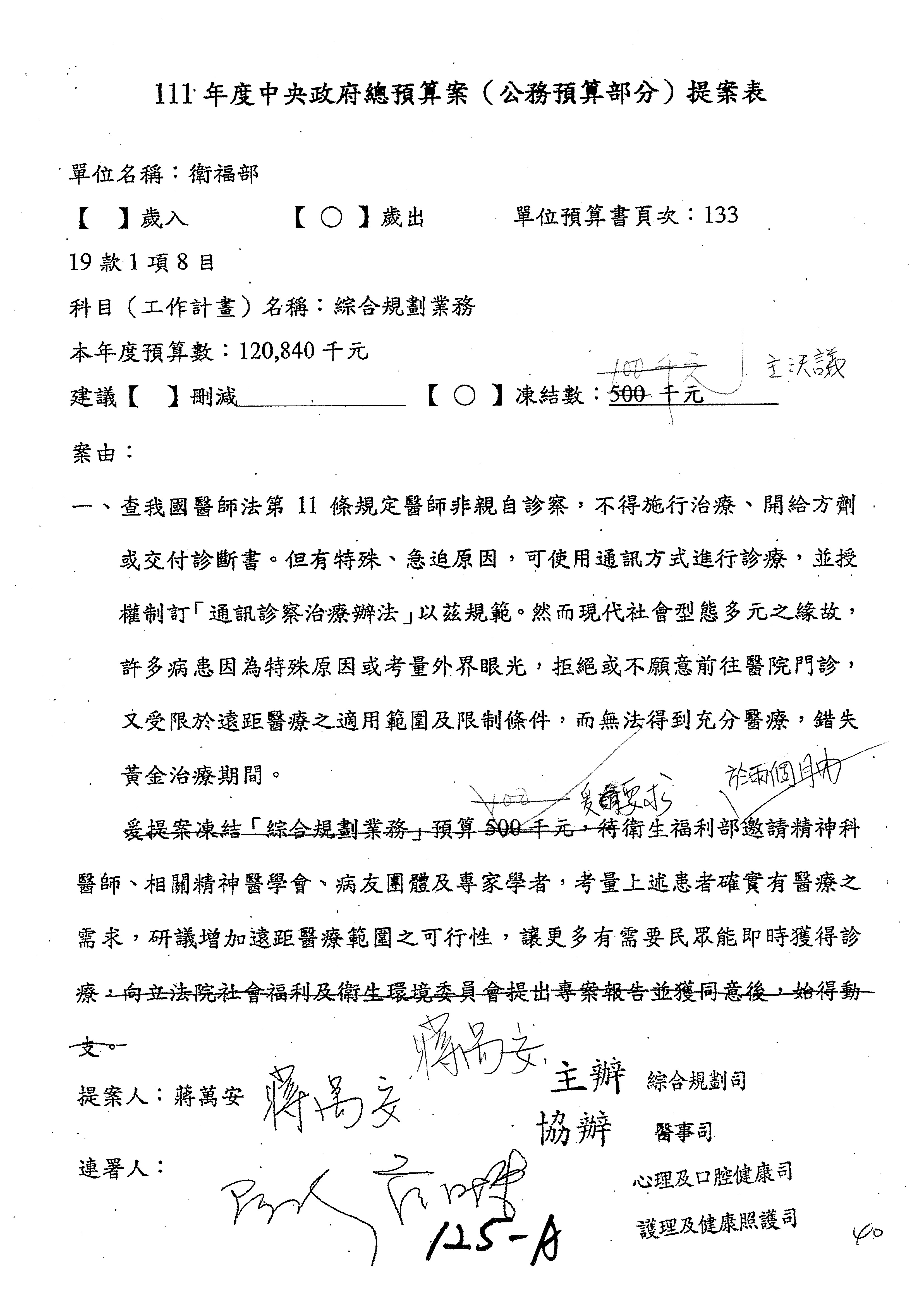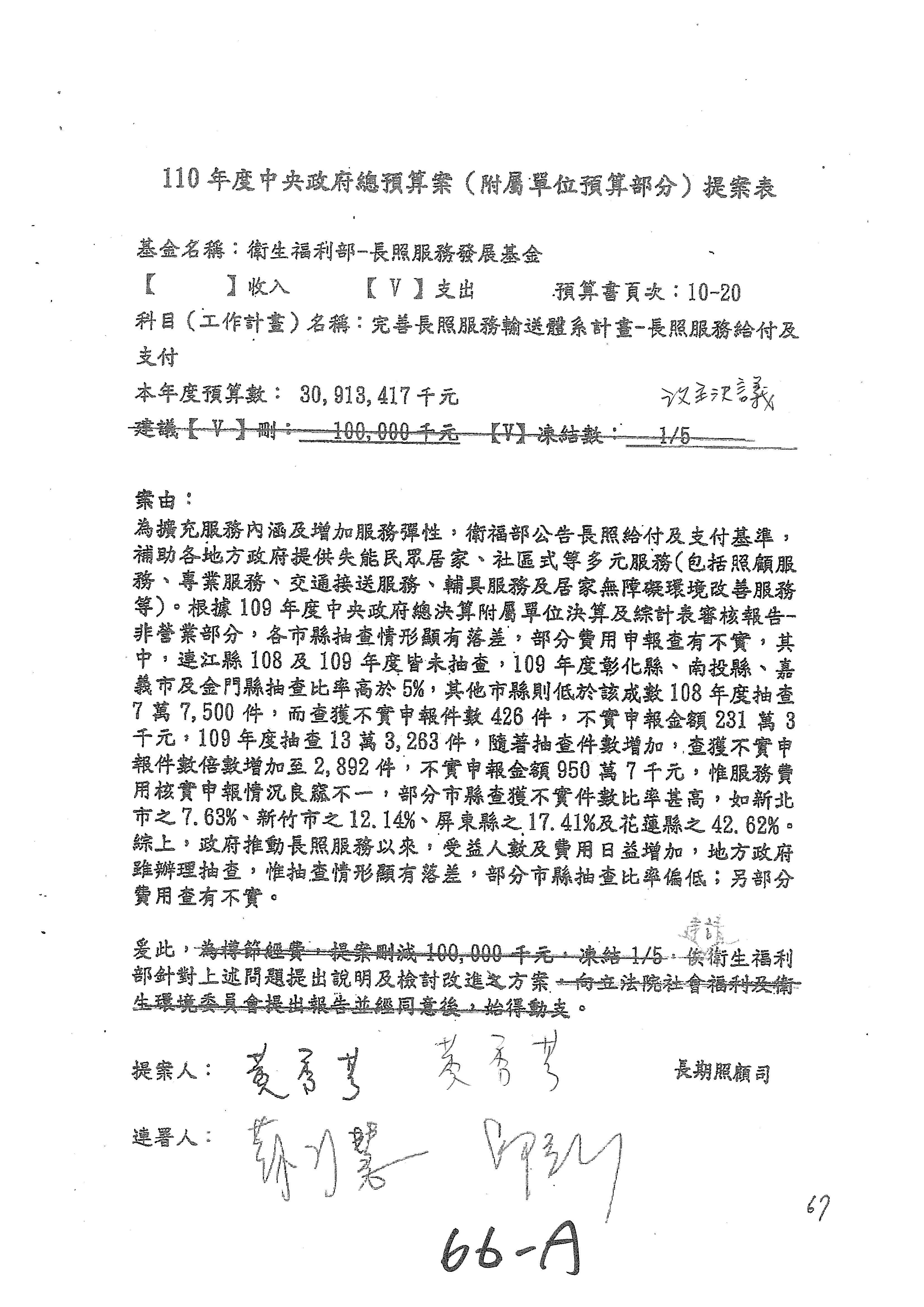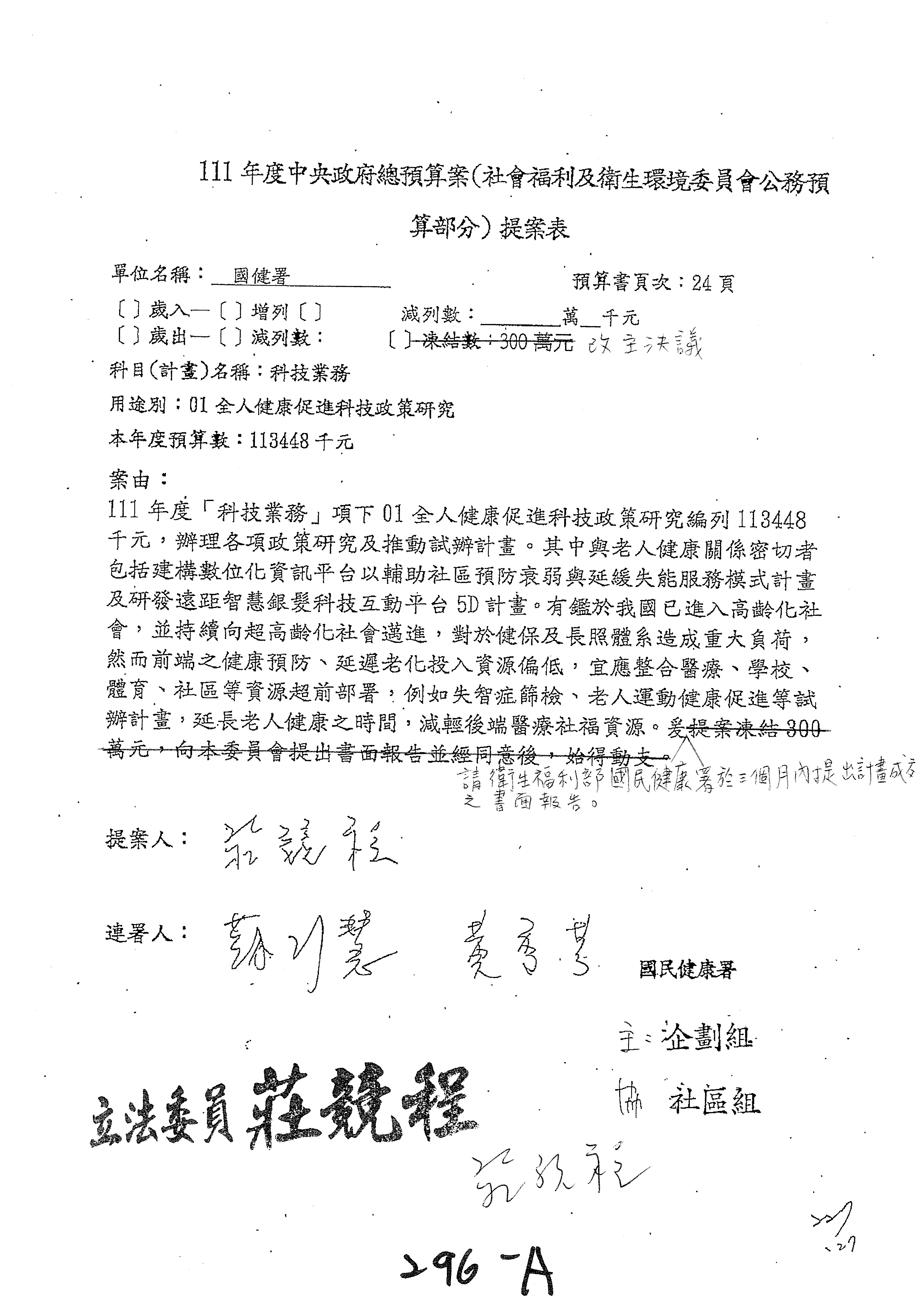 祝司長健芳:吳委員已經簽字,凍結「創新專業服務試辦計畫」這個分支計畫100萬元,並提出書面報告。