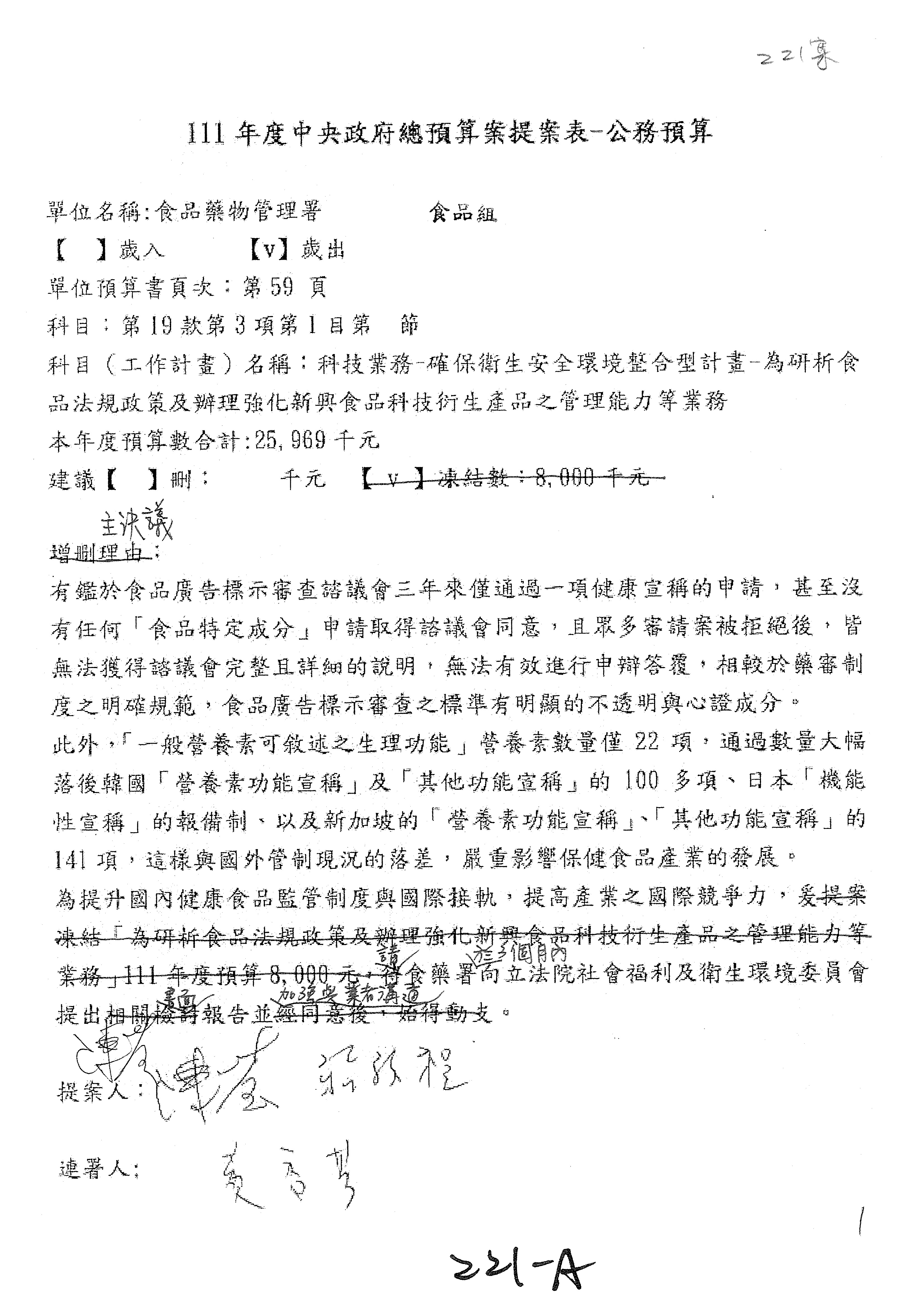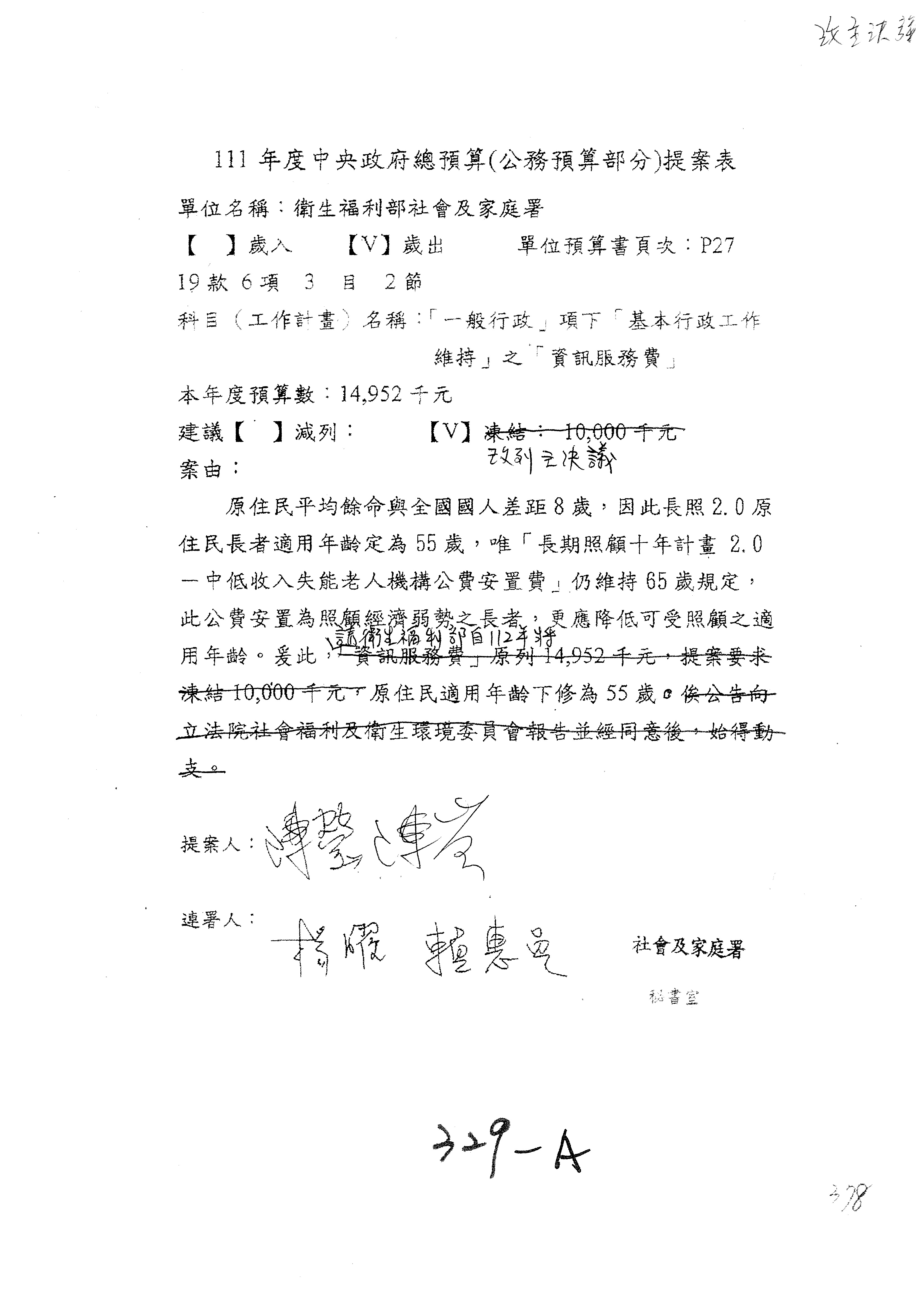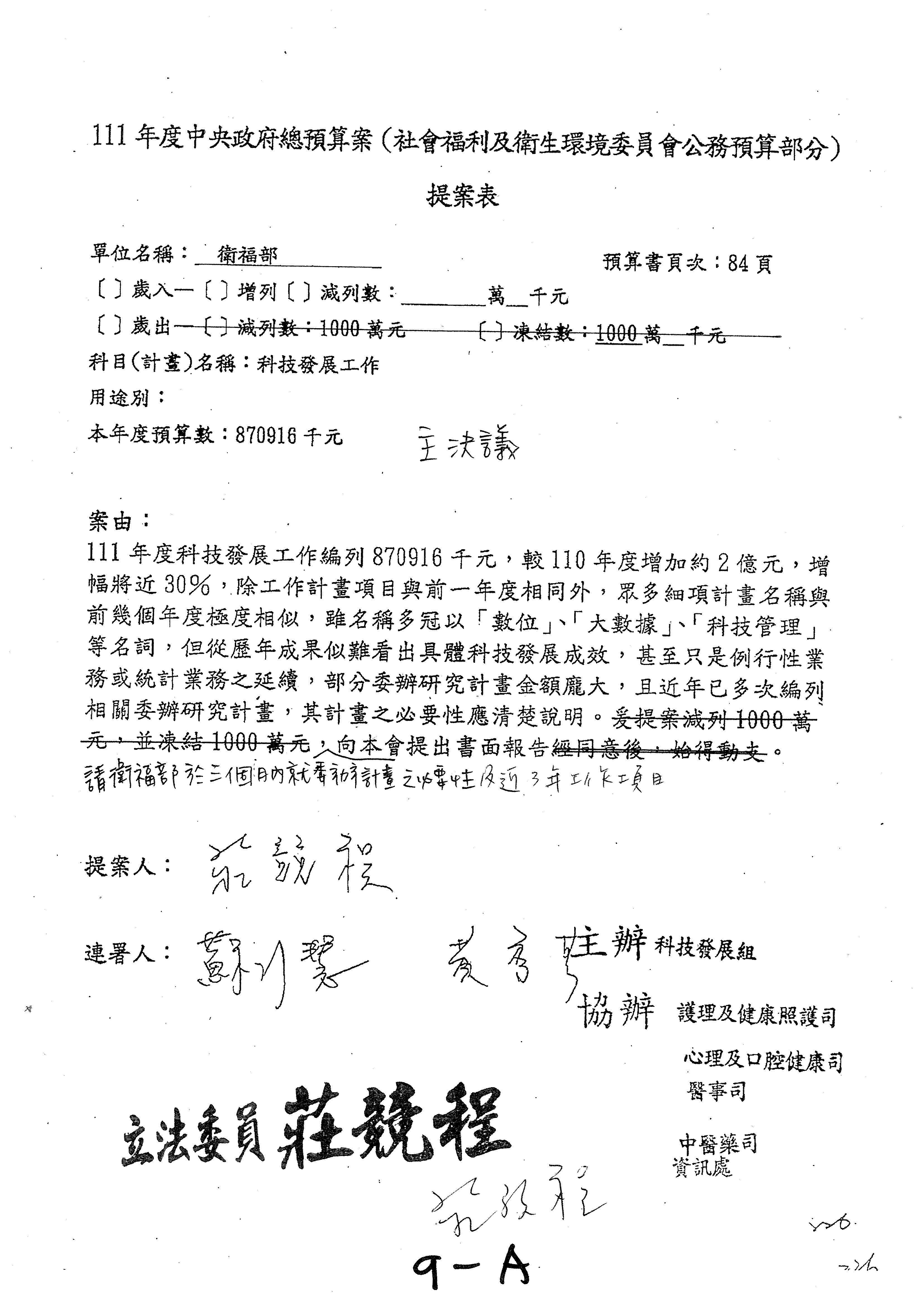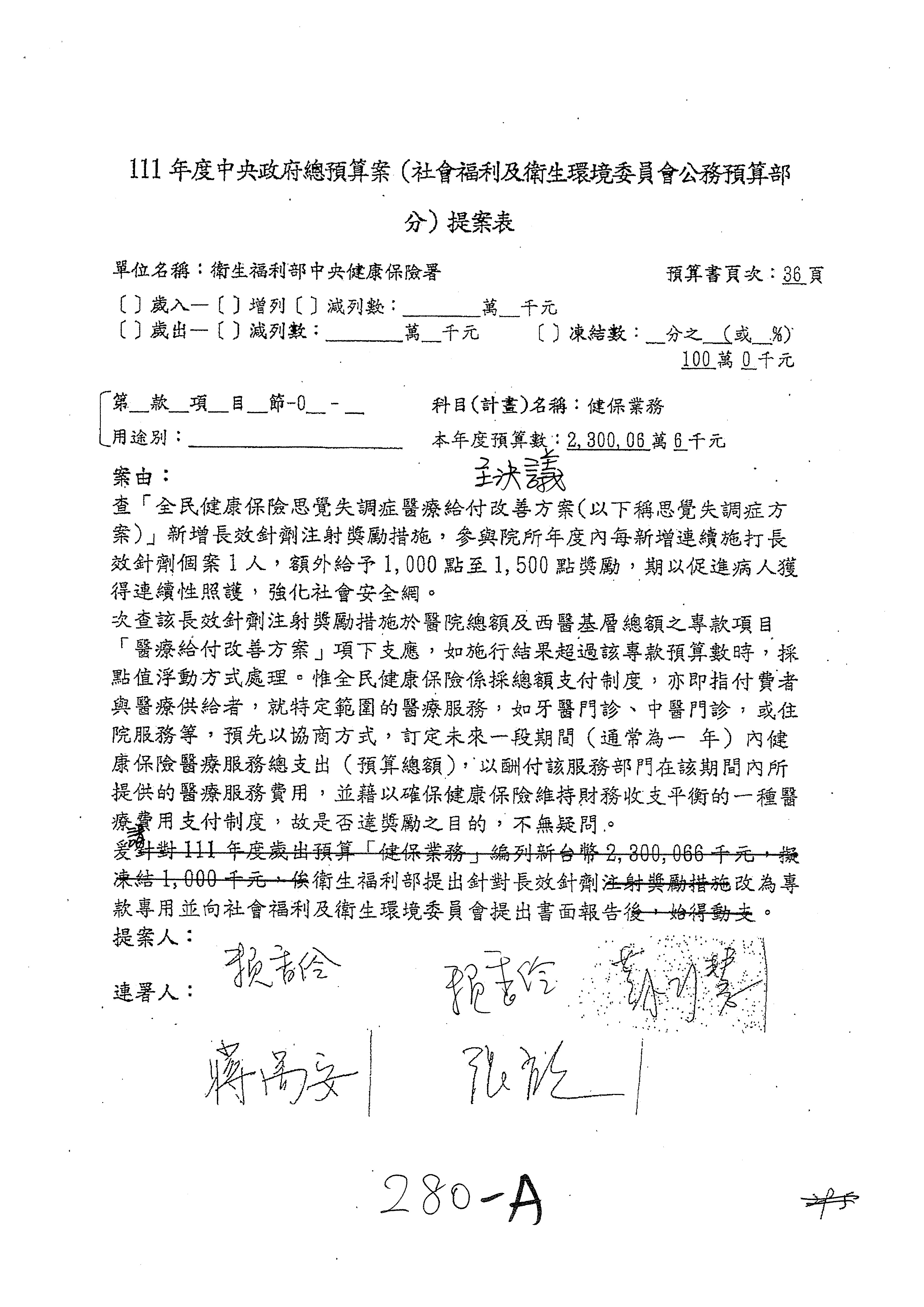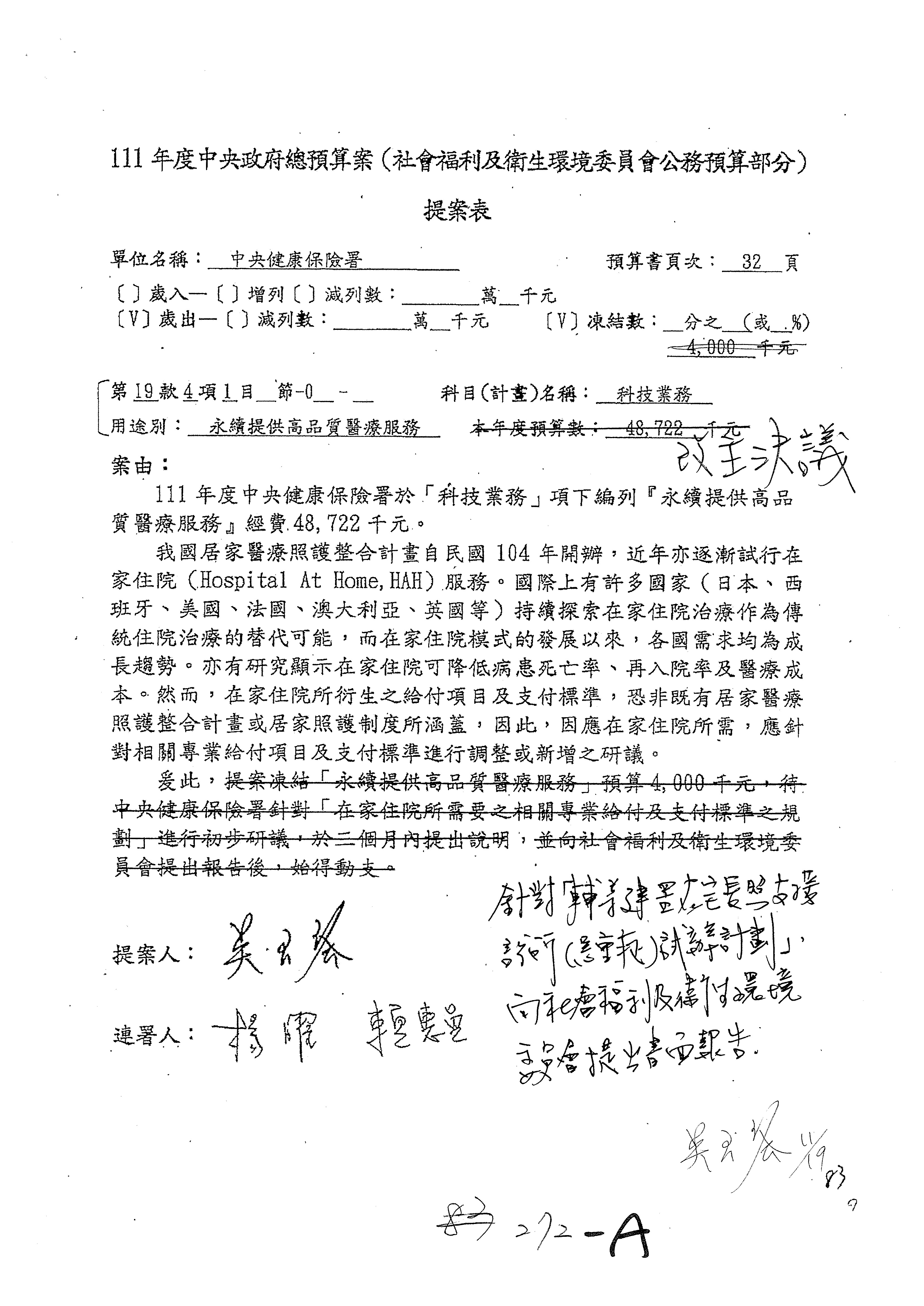 祝司長健芳:吳委員已經簽字,凍結「創新專業服務試辦計畫」這個分支計畫100萬元,並提出書面報告。