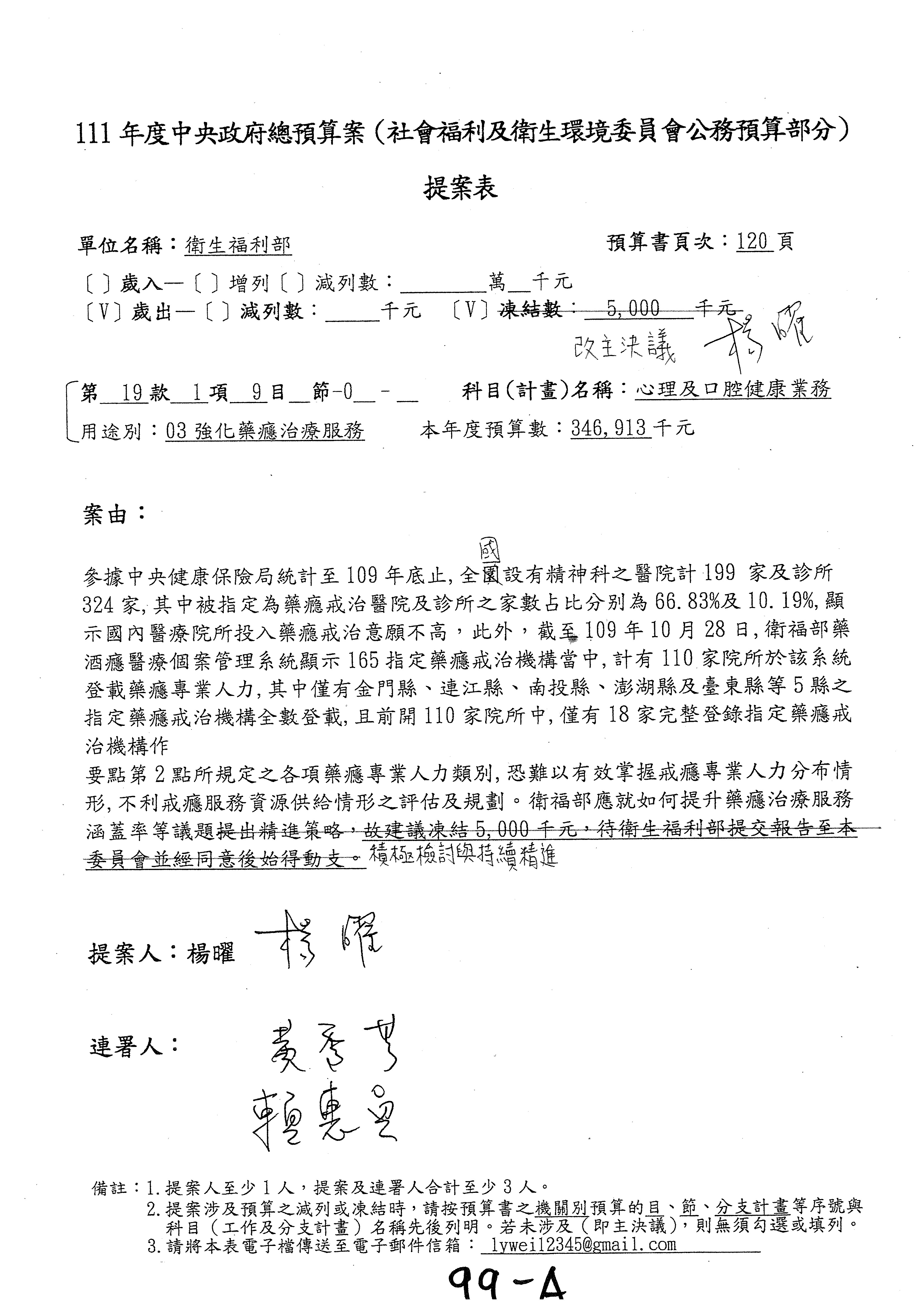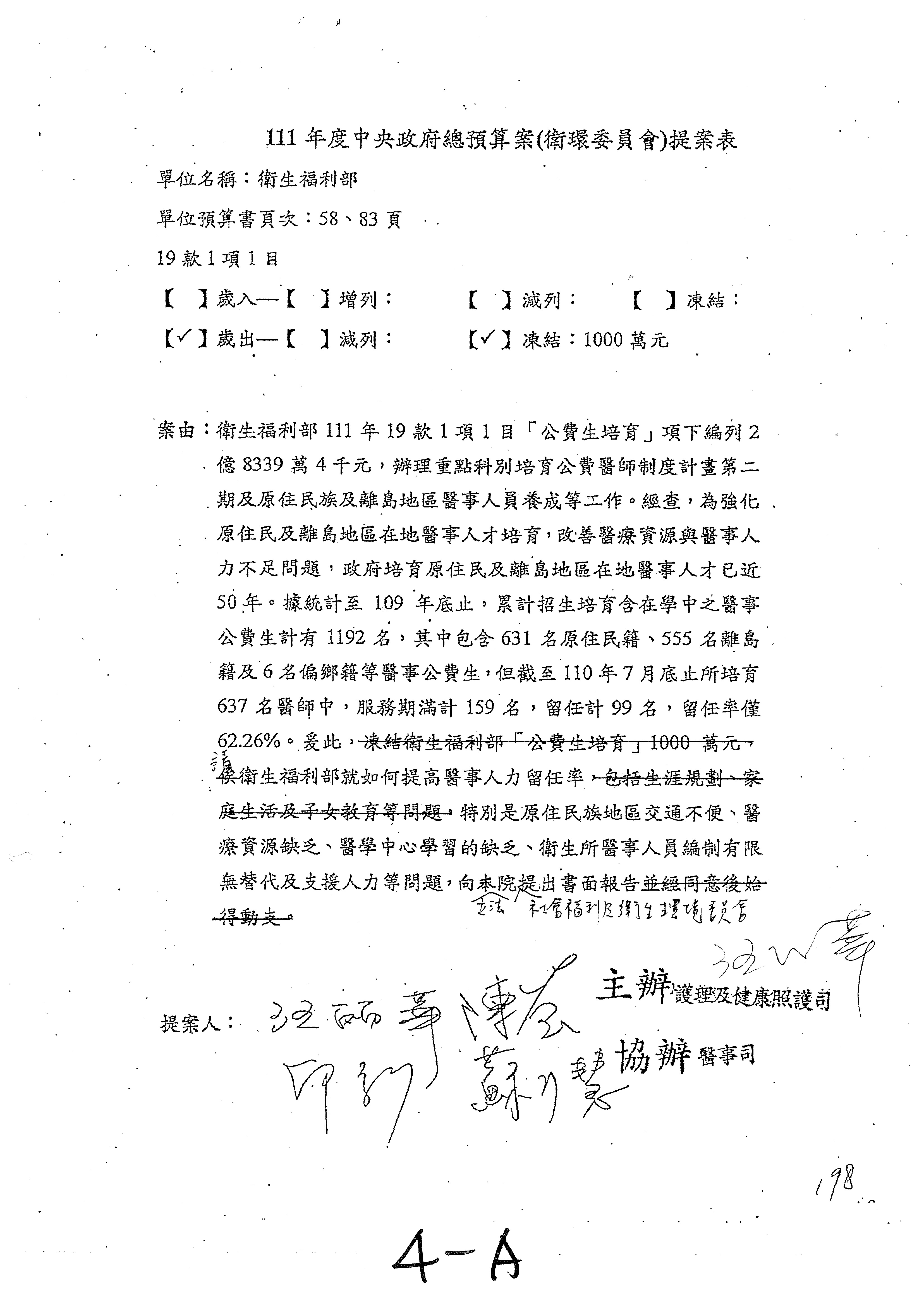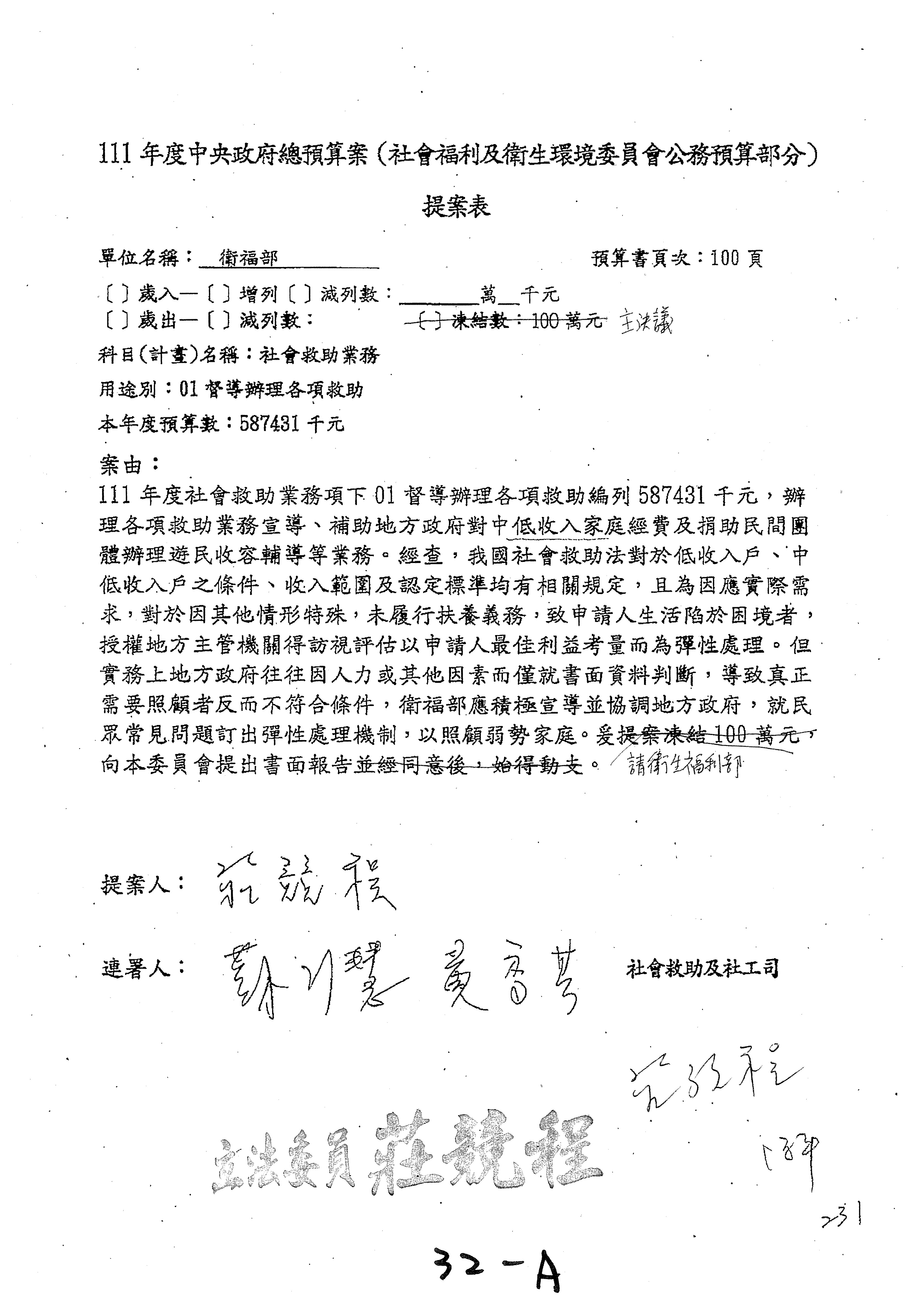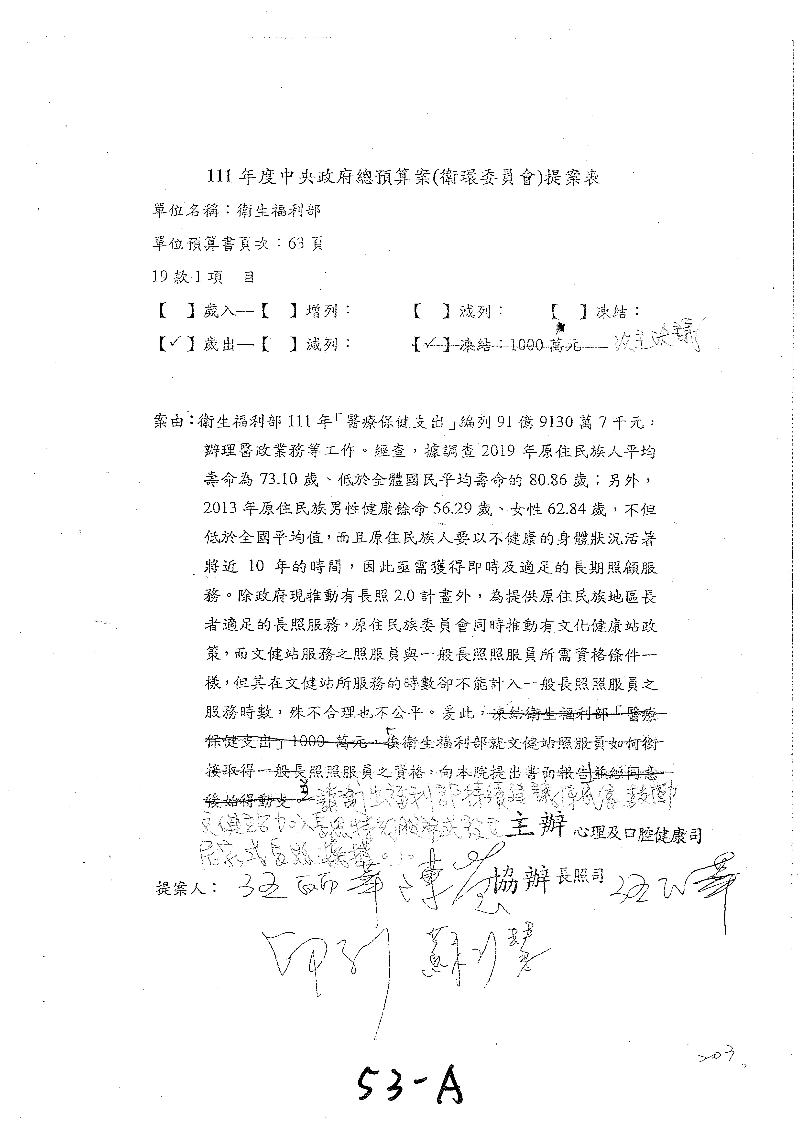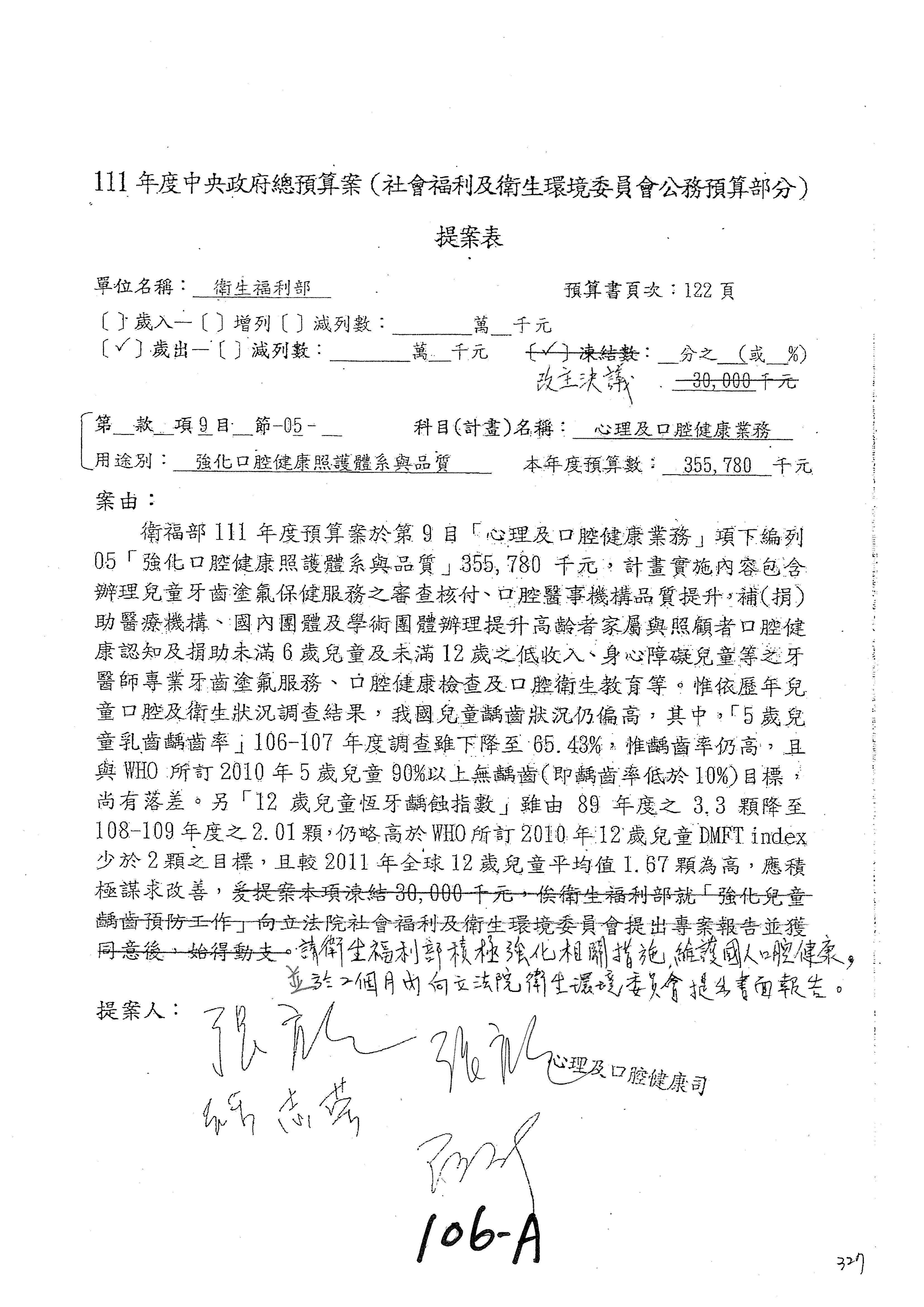 祝司長健芳:吳委員已經簽字,凍結「創新專業服務試辦計畫」這個分支計畫100萬元,並提出書面報告。