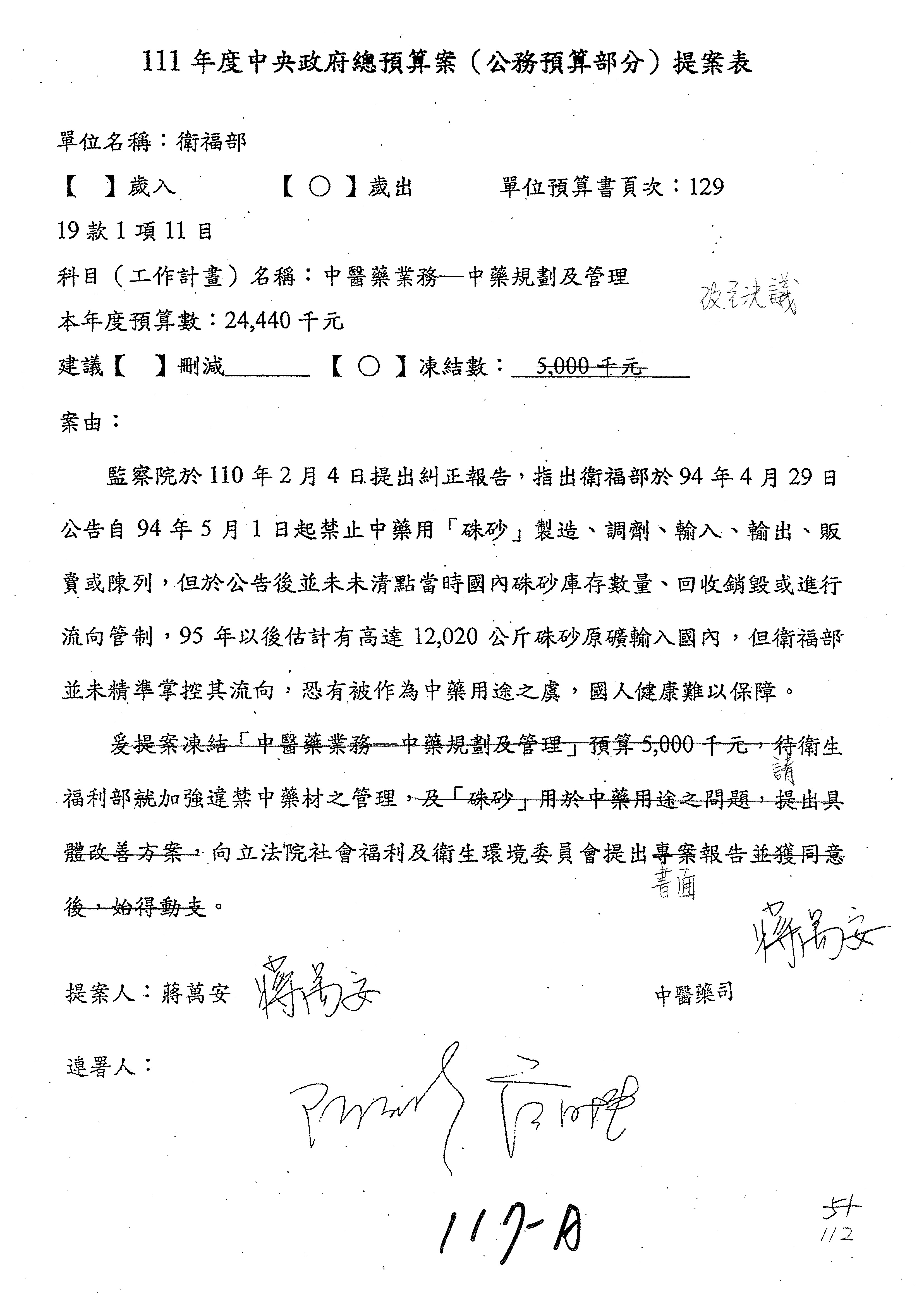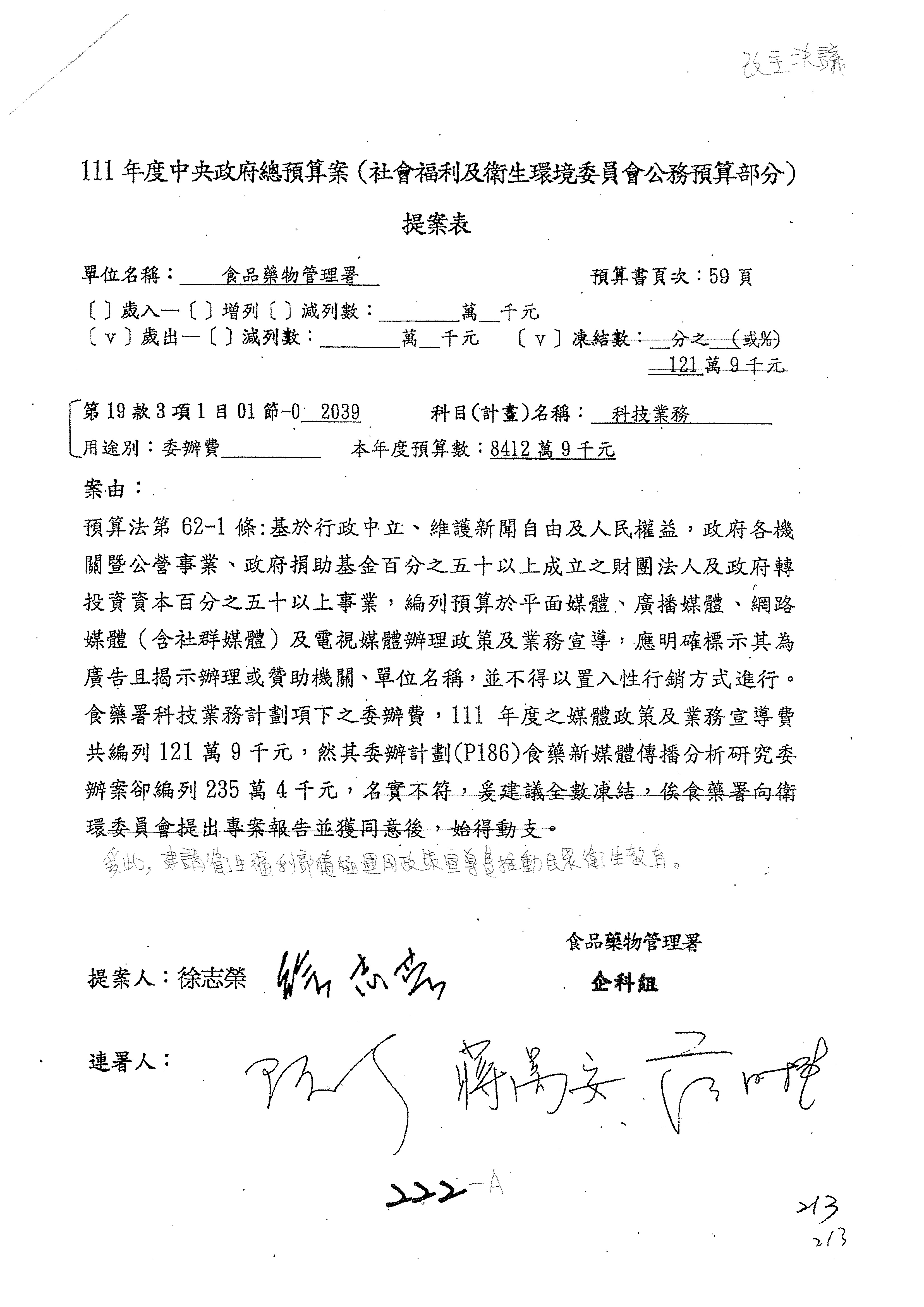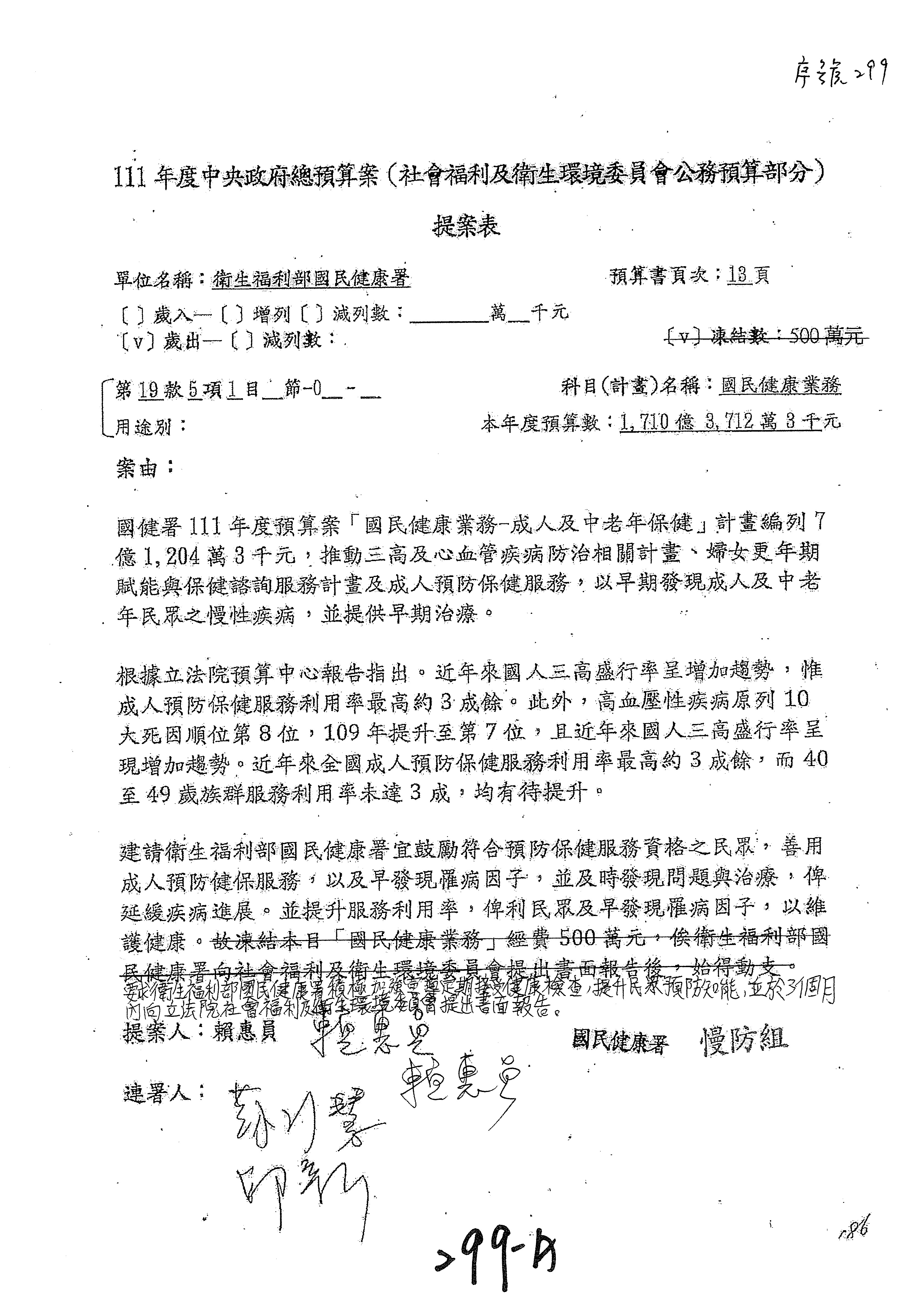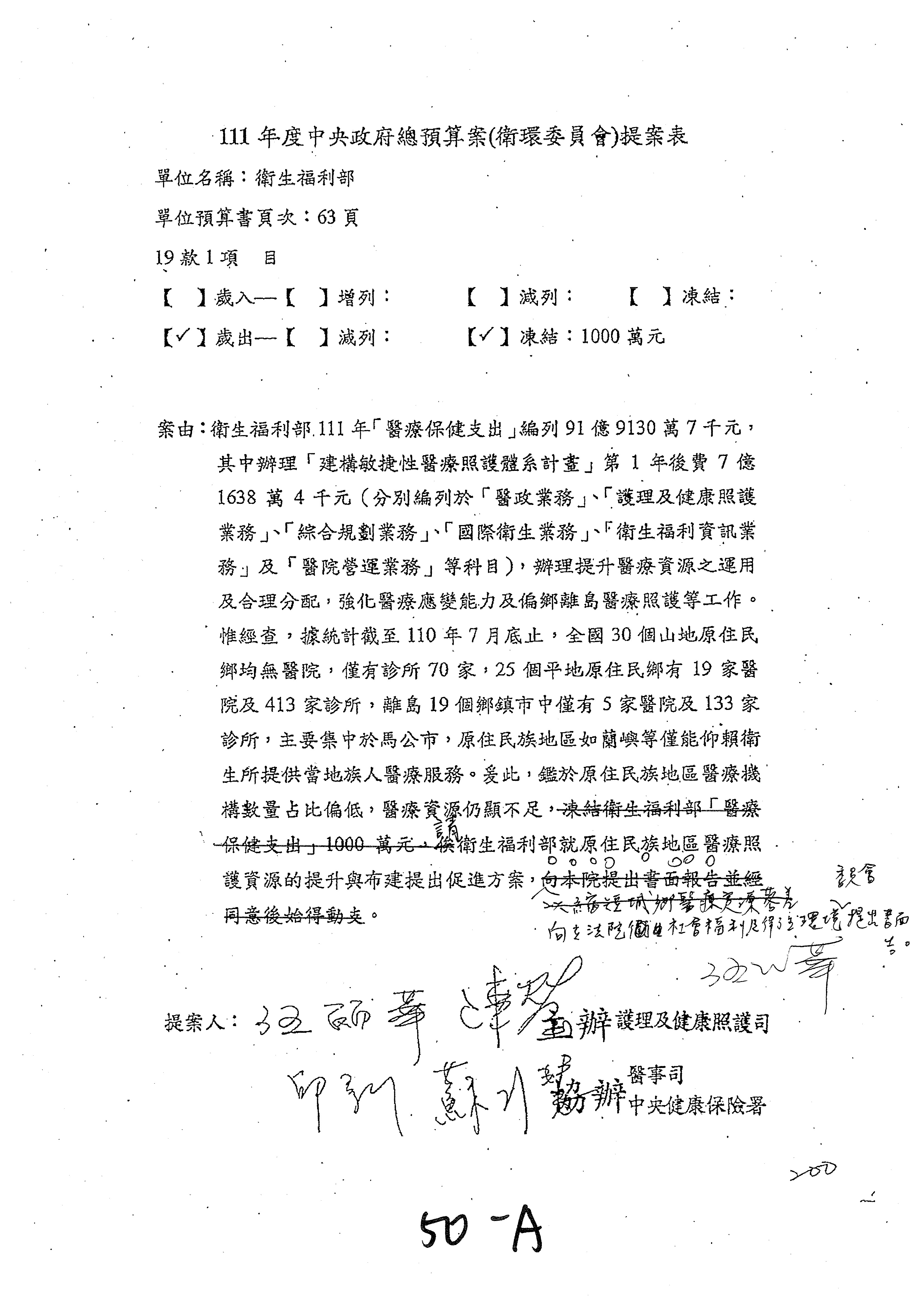 祝司長健芳:吳委員已經簽字,凍結「創新專業服務試辦計畫」這個分支計畫100萬元,並提出書面報告。