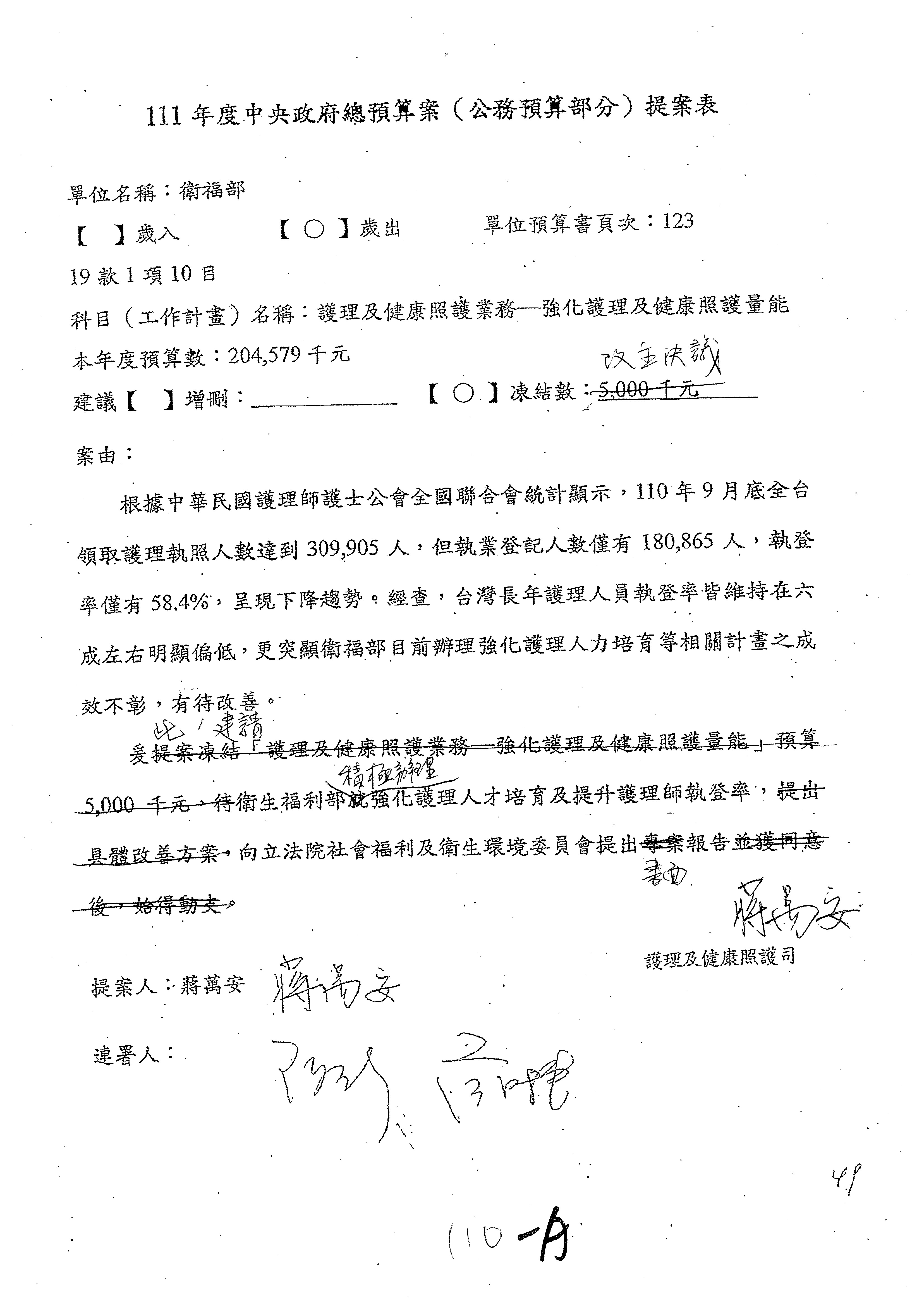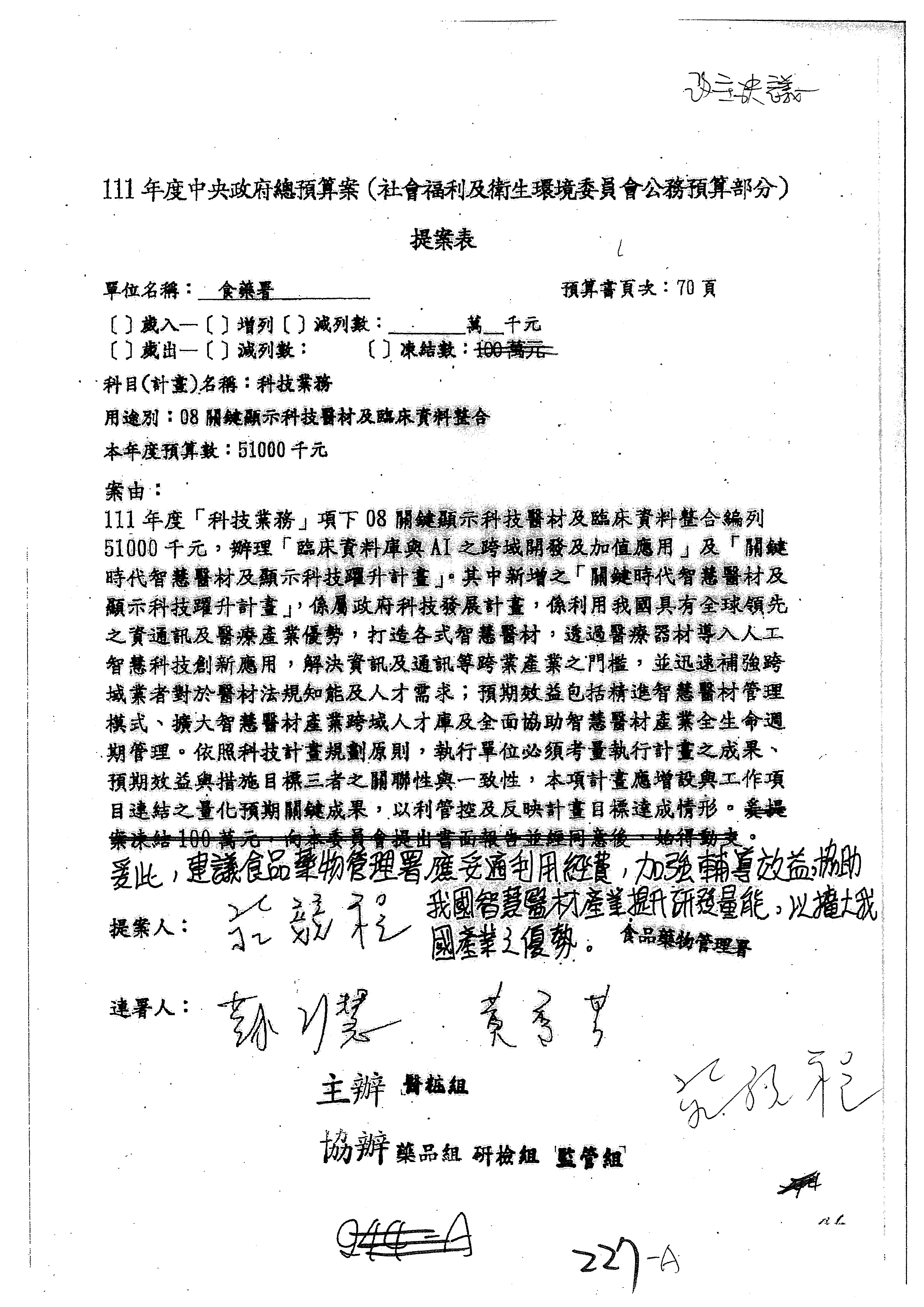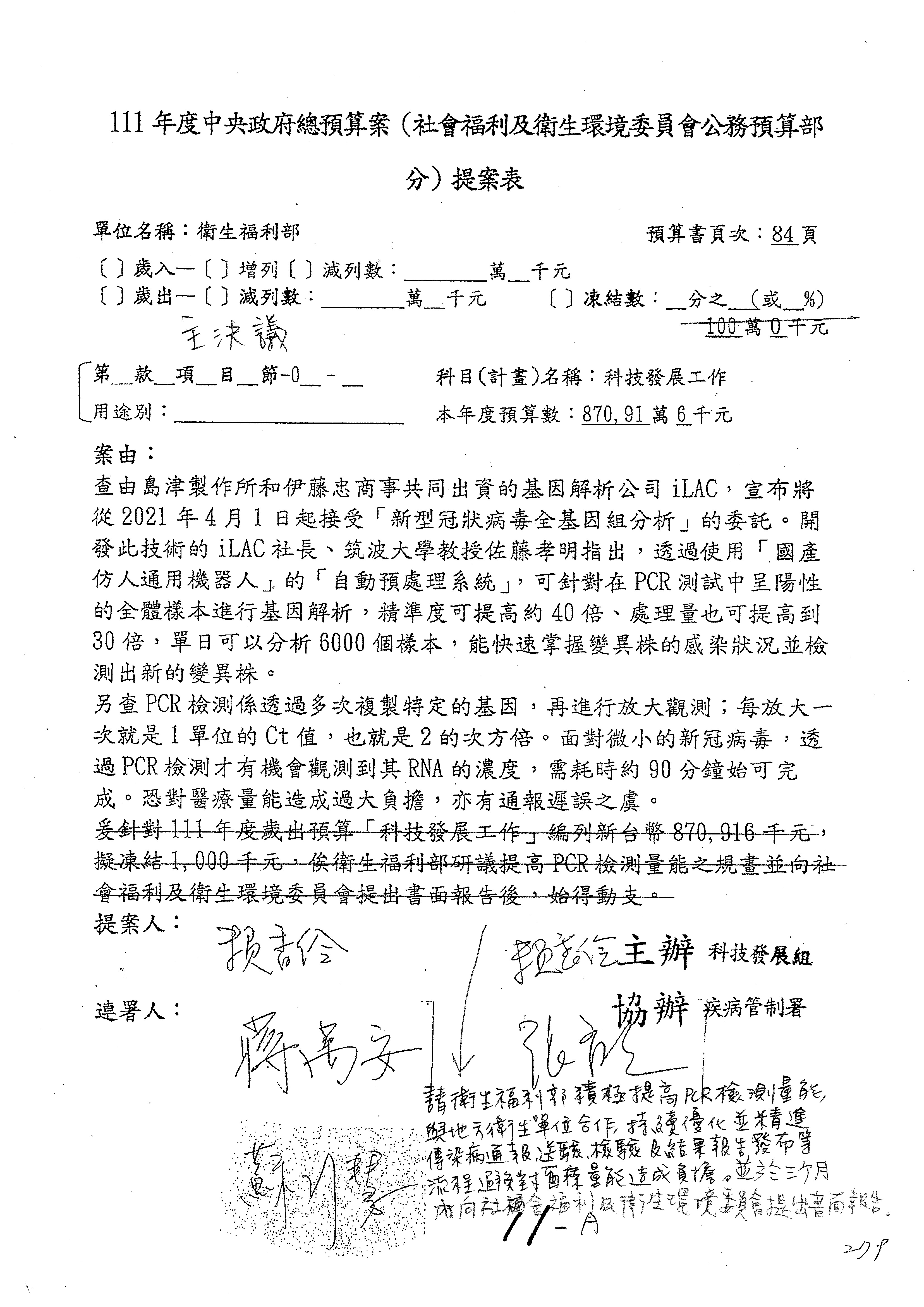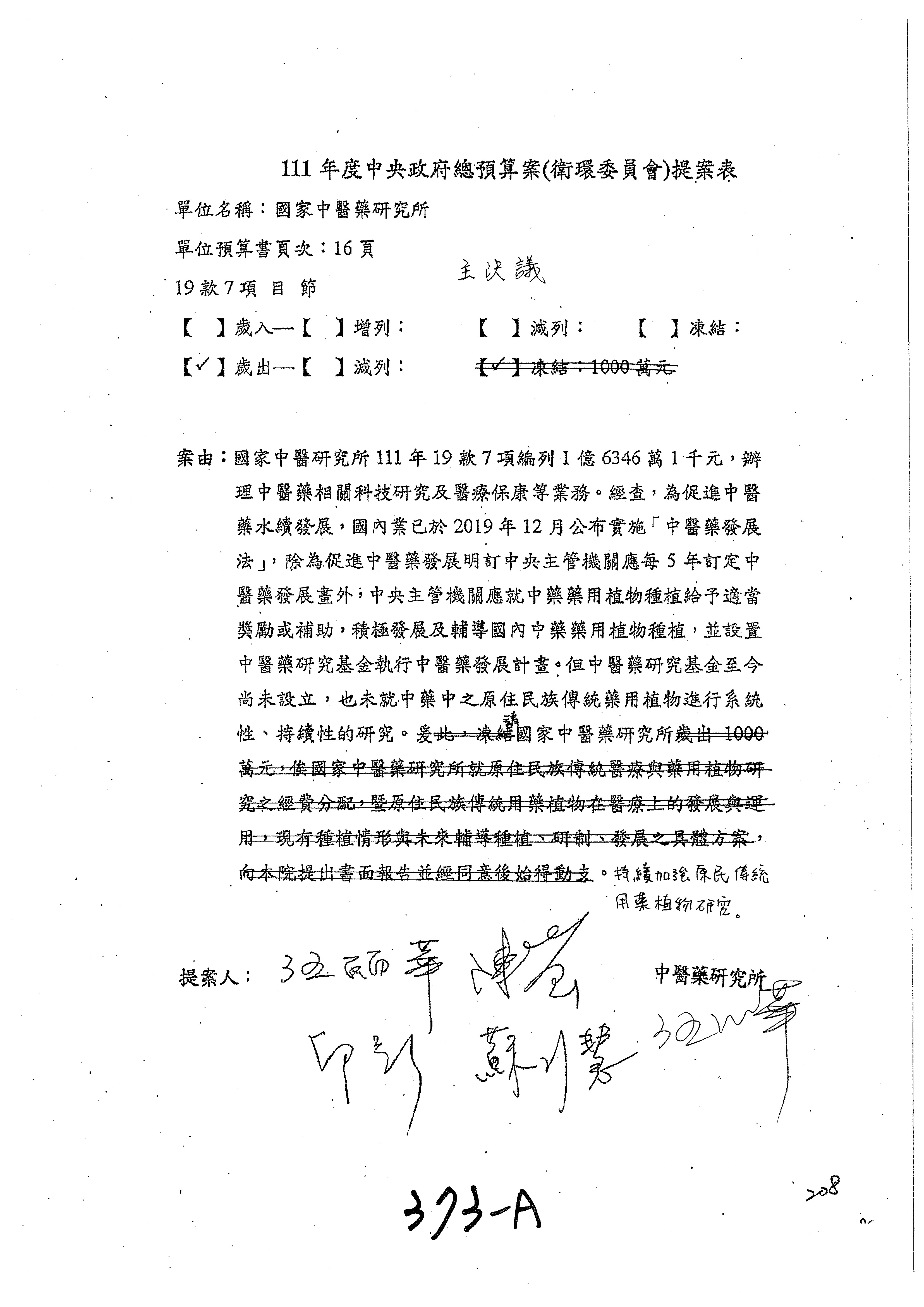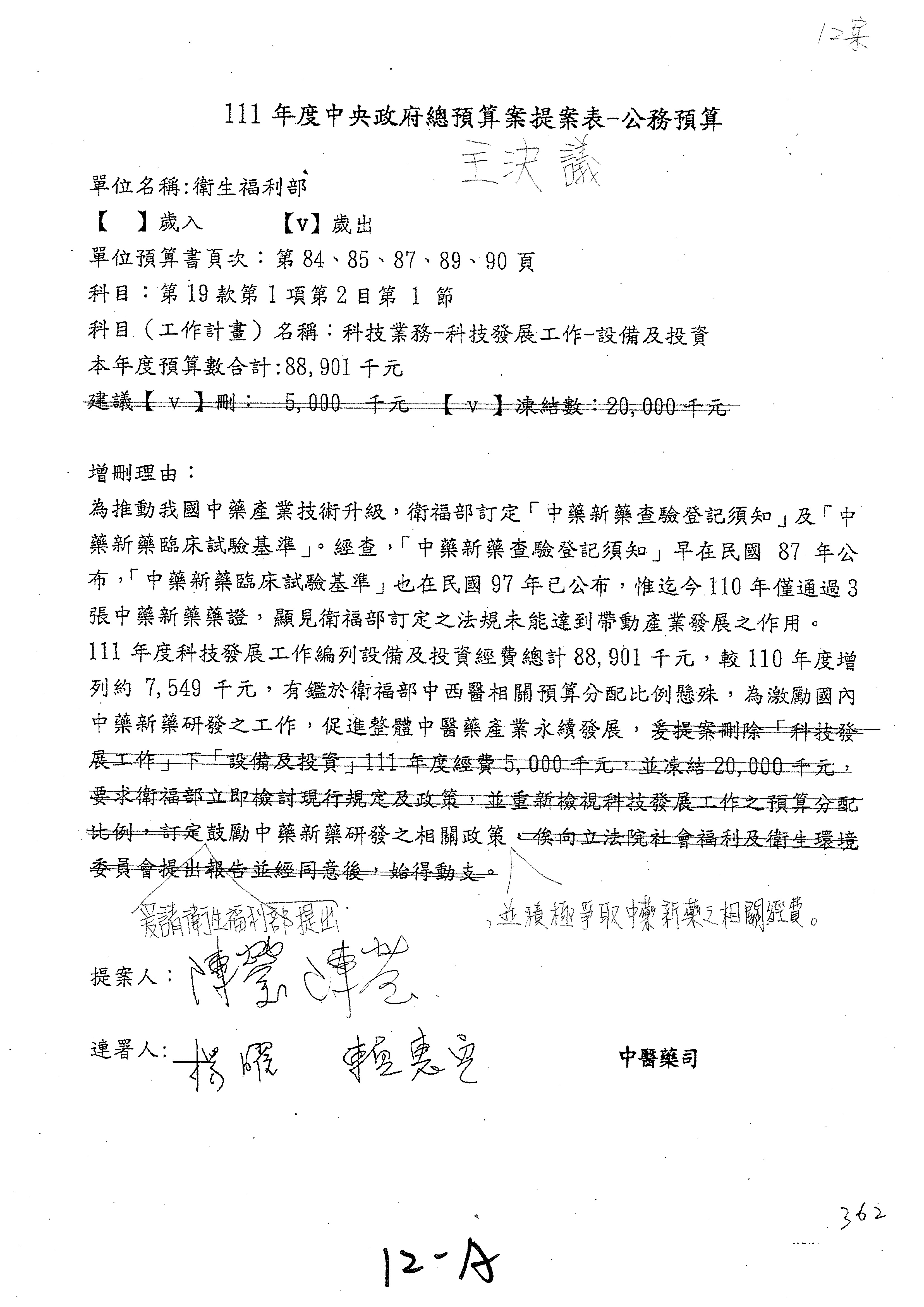 祝司長健芳:吳委員已經簽字,凍結「創新專業服務試辦計畫」這個分支計畫100萬元,並提出書面報告。
