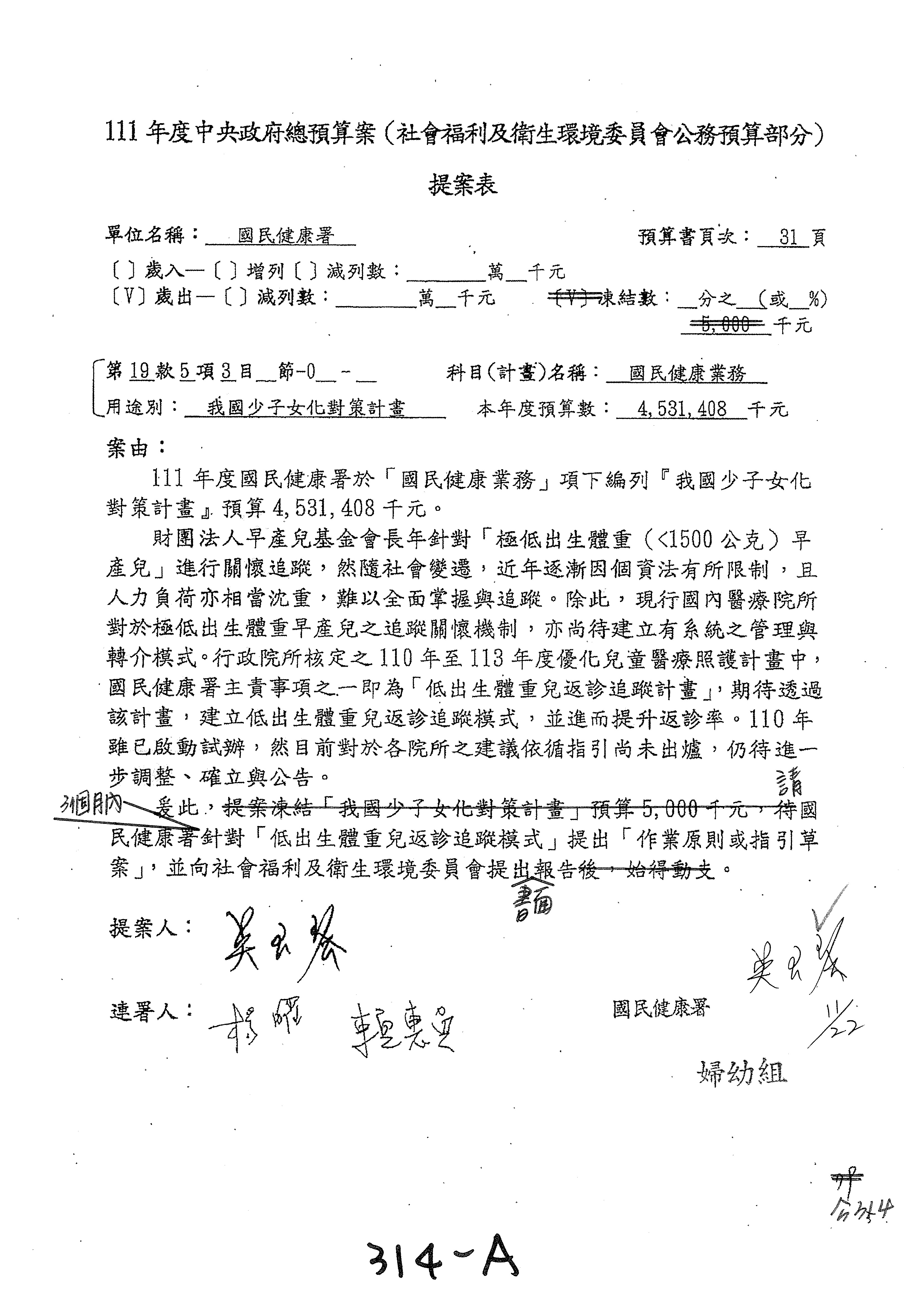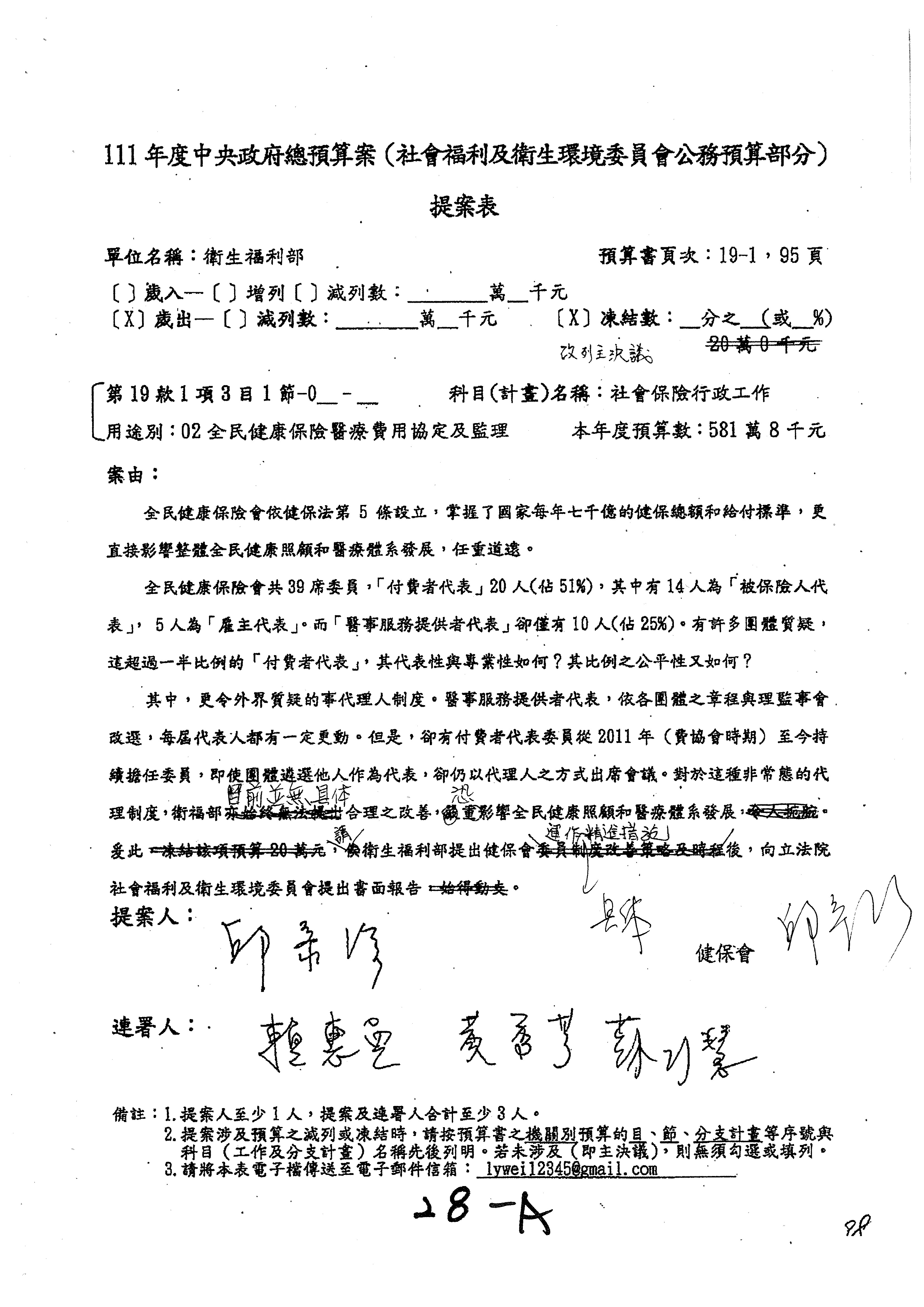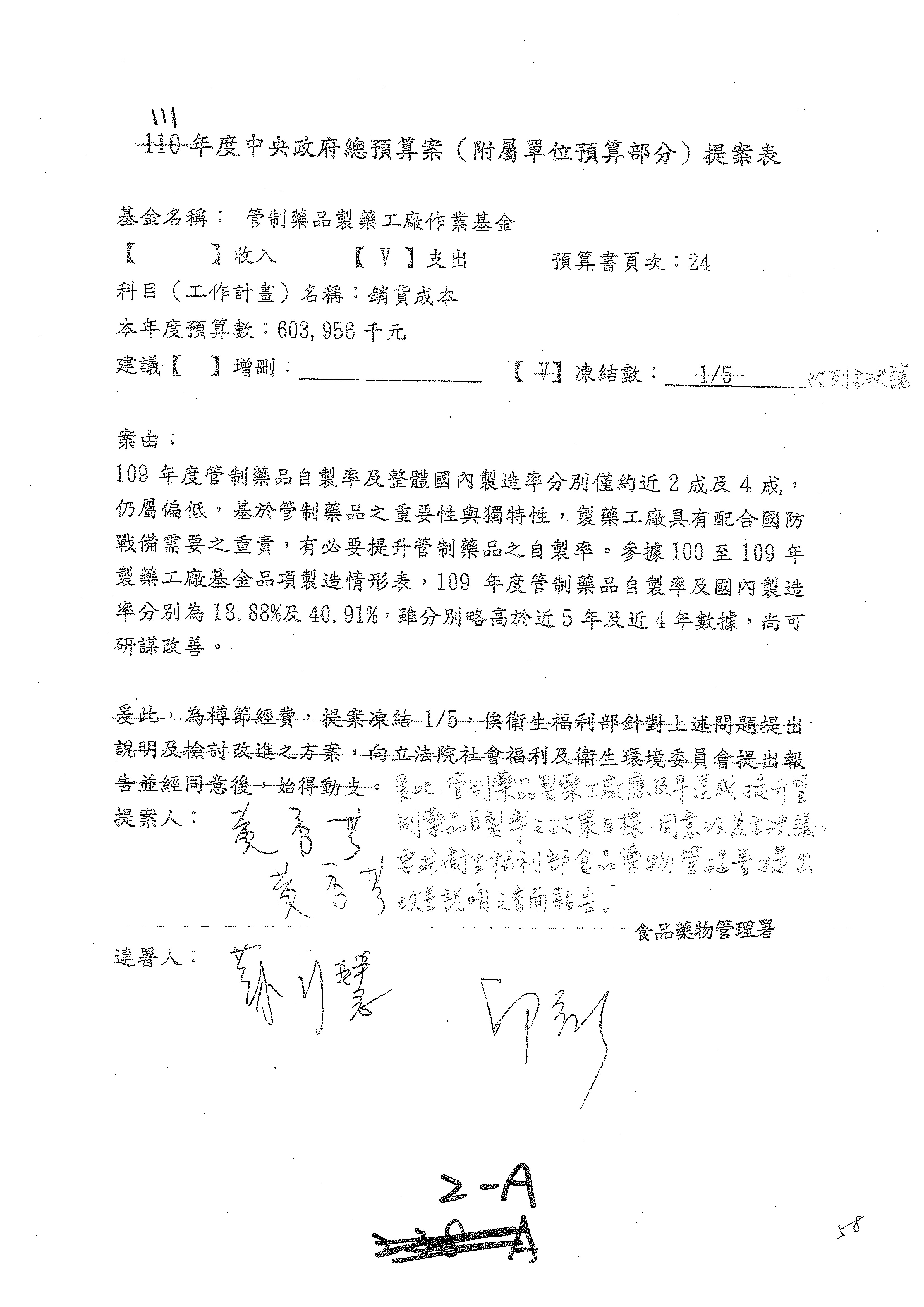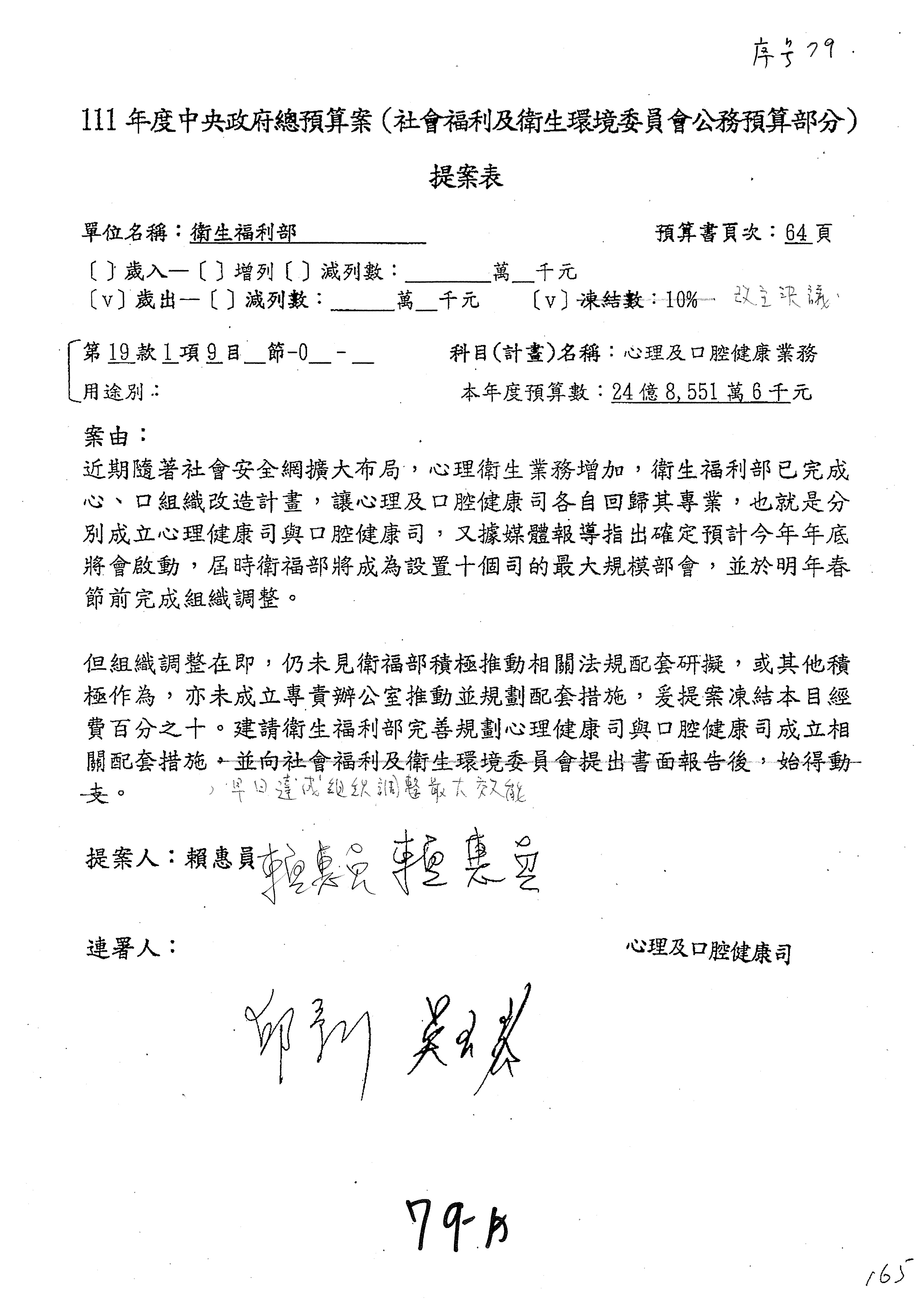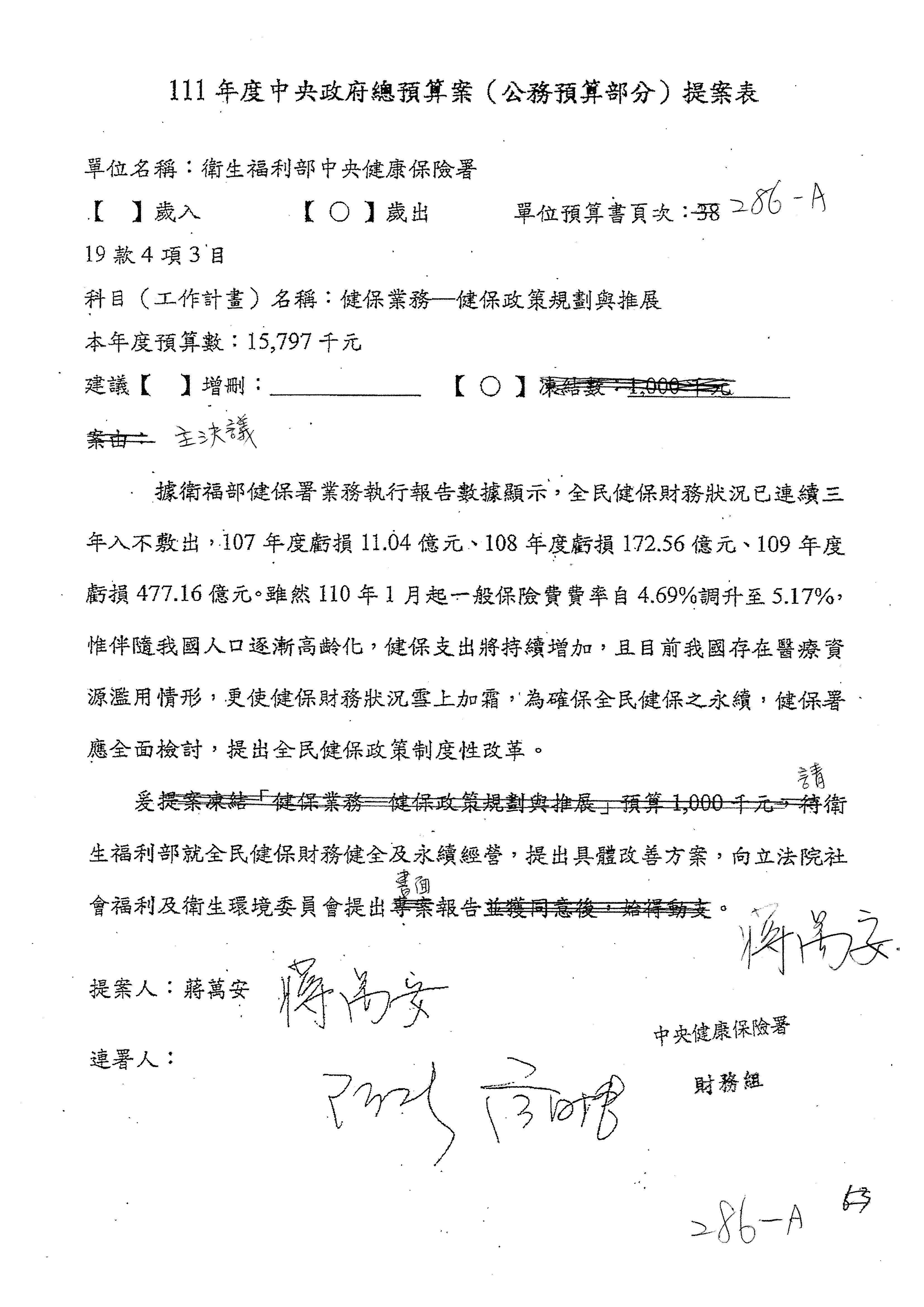 祝司長健芳:吳委員已經簽字,凍結「創新專業服務試辦計畫」這個分支計畫100萬元,並提出書面報告。