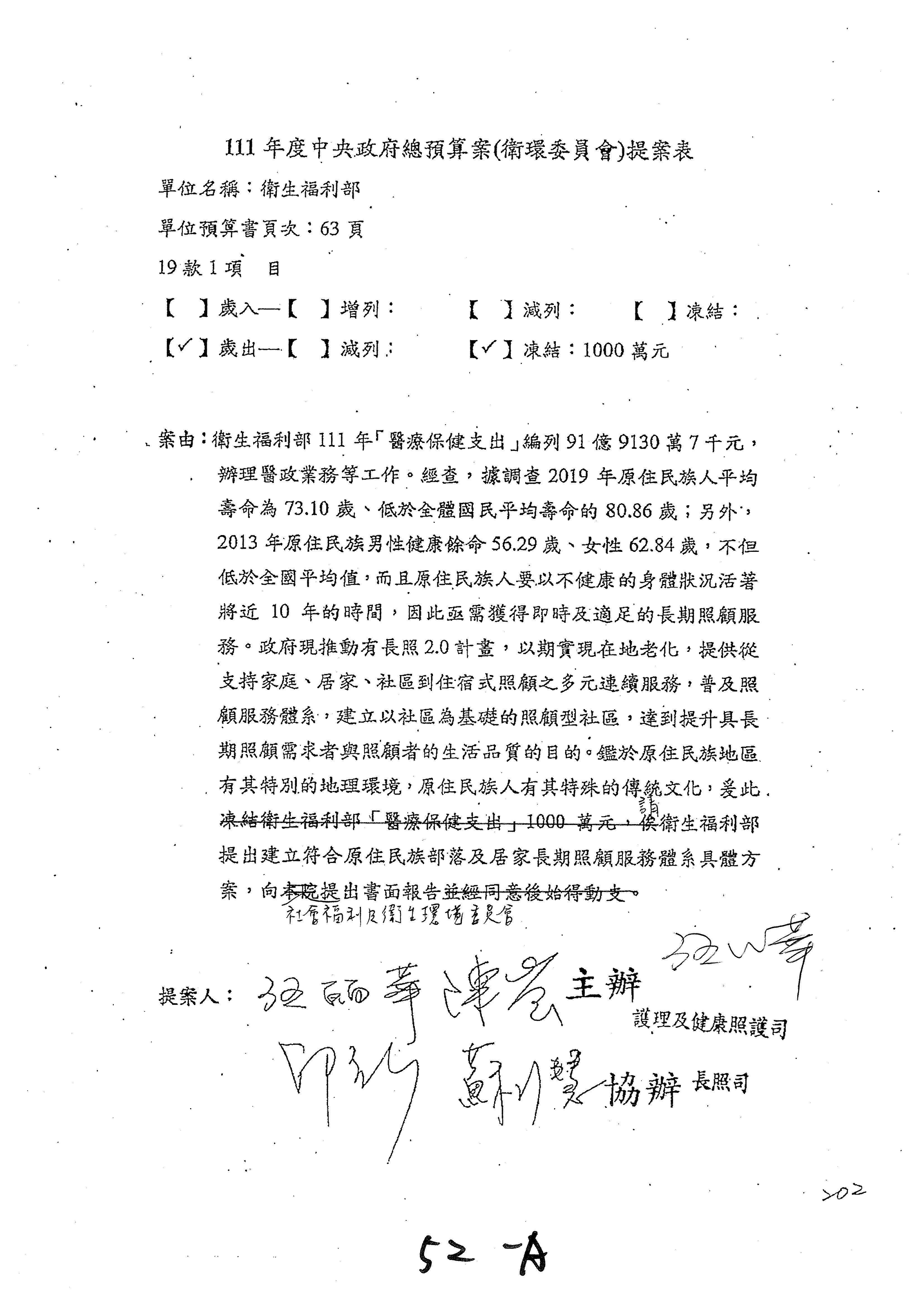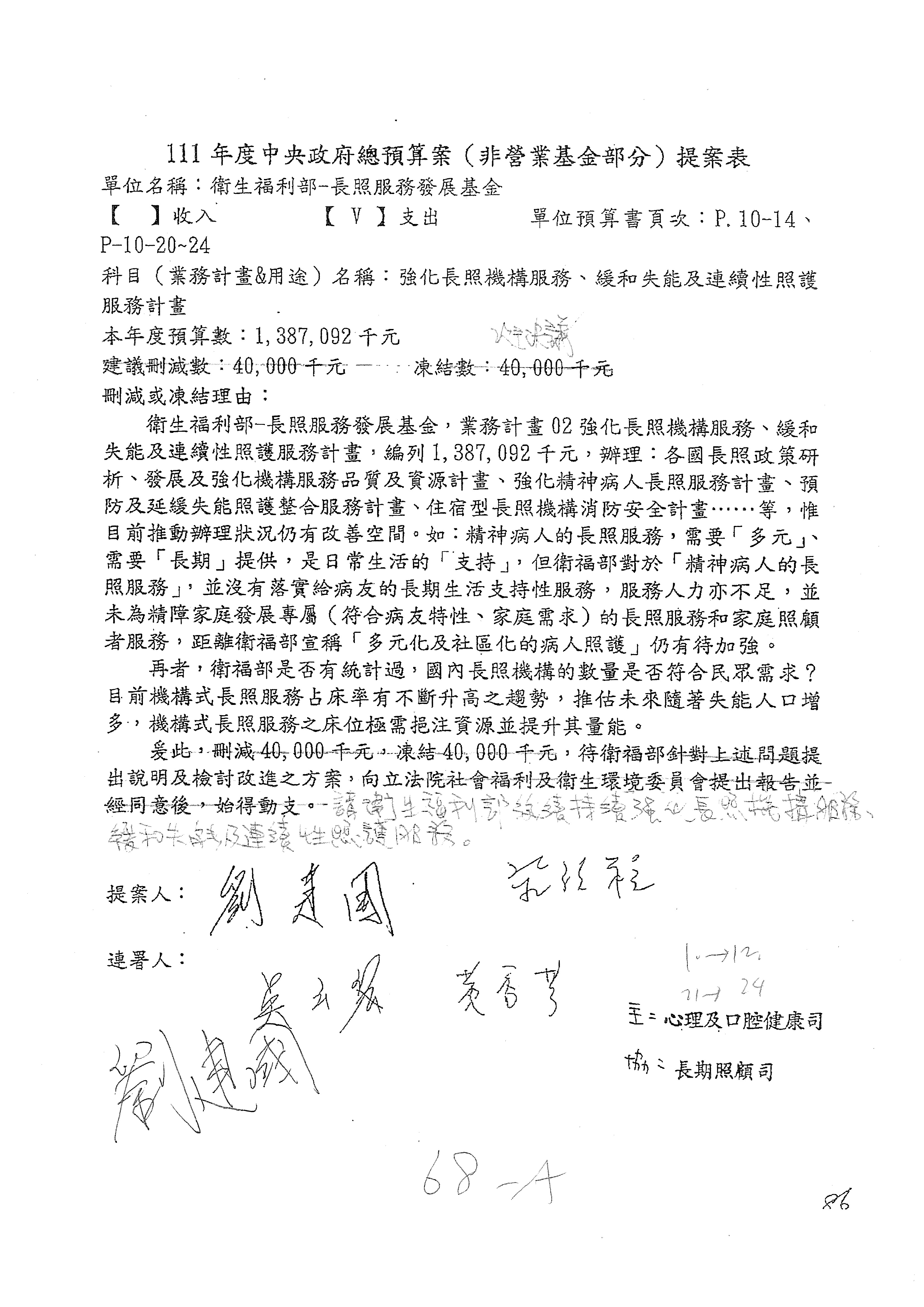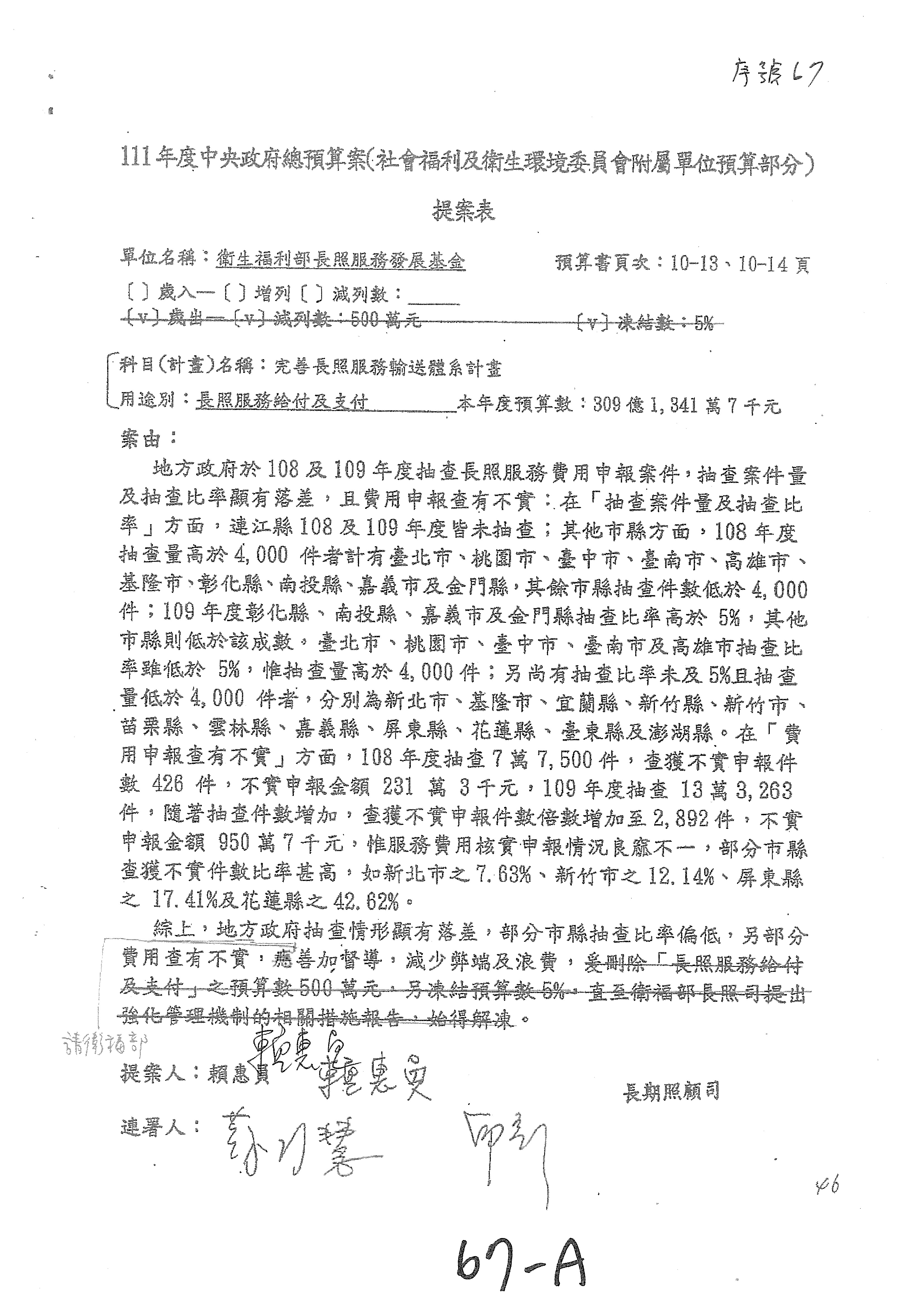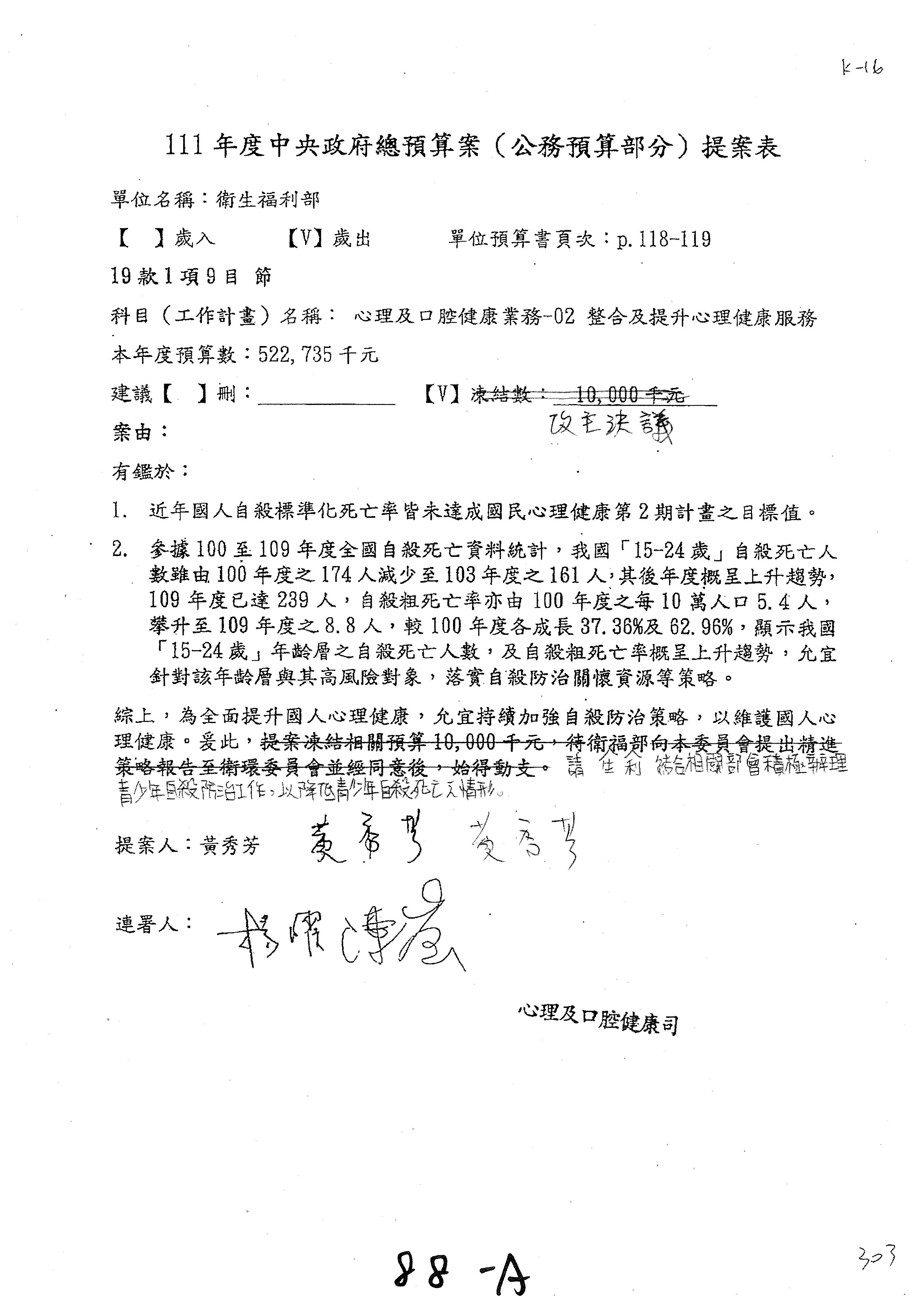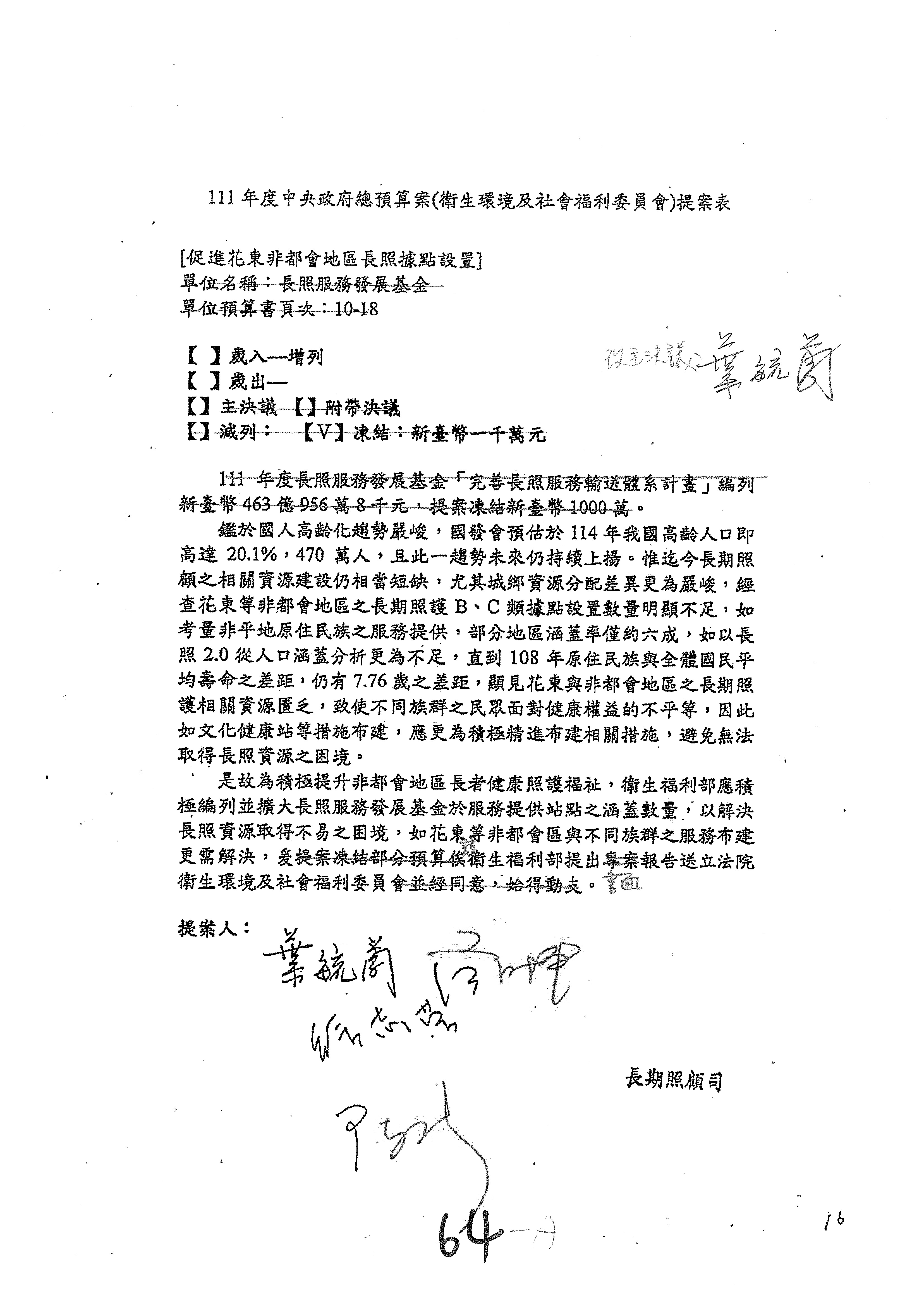 祝司長健芳:剛才吳委員提到第61案和第62案都是針對重症兒,包括喘息的機制建立及整個照服員的訓練,這個部分我們也都遵照委員剛剛的指示,另外再凍100萬元。