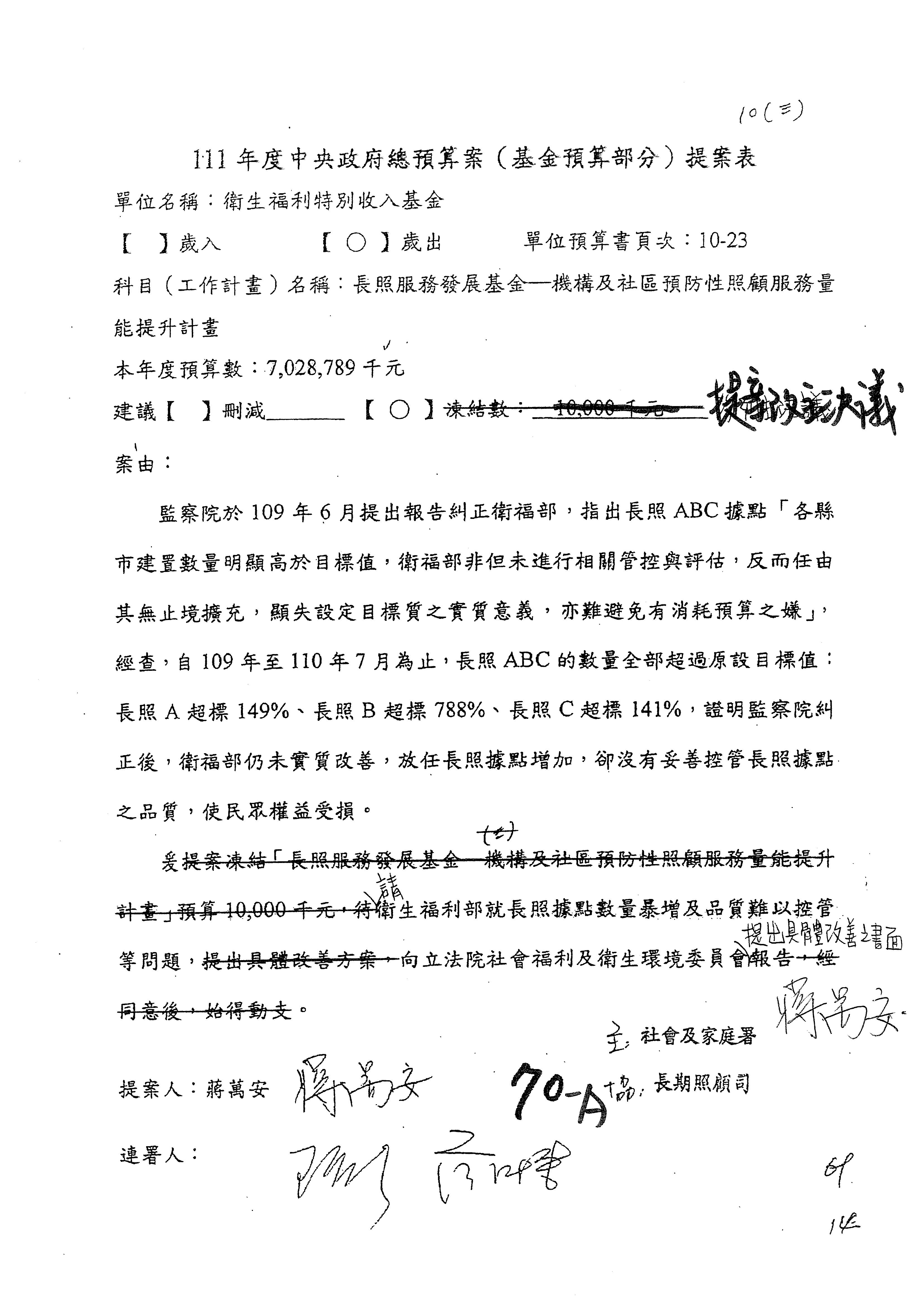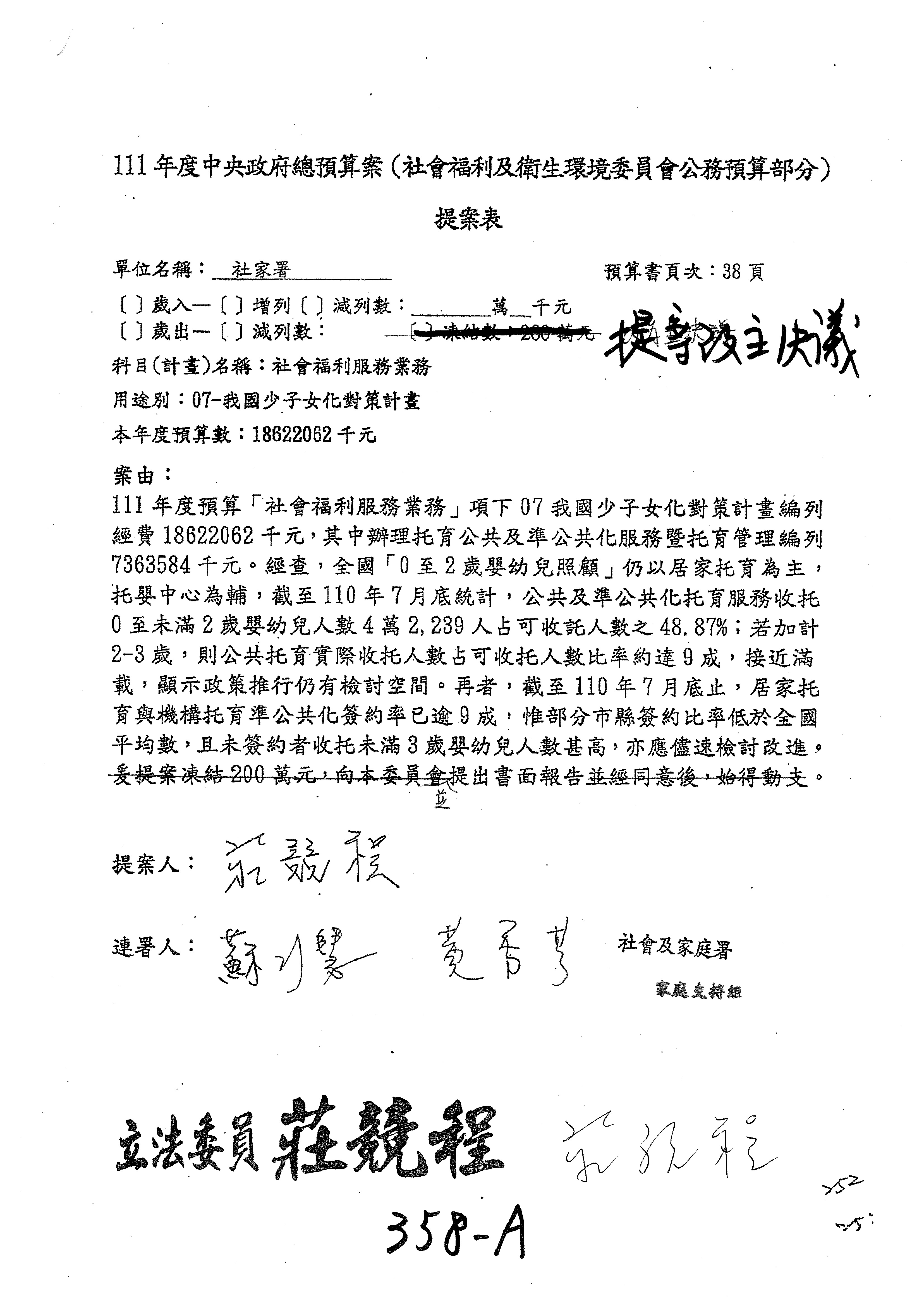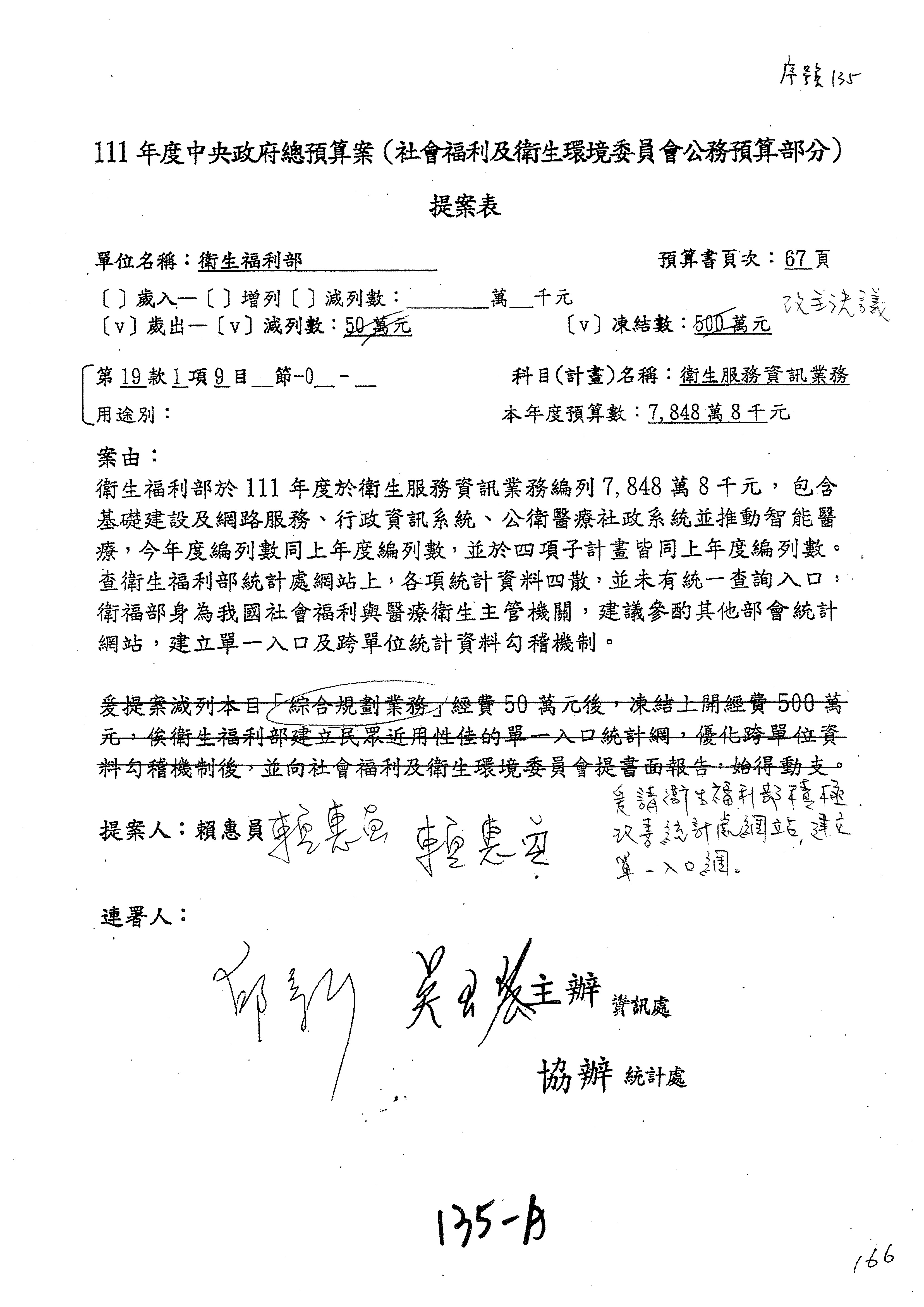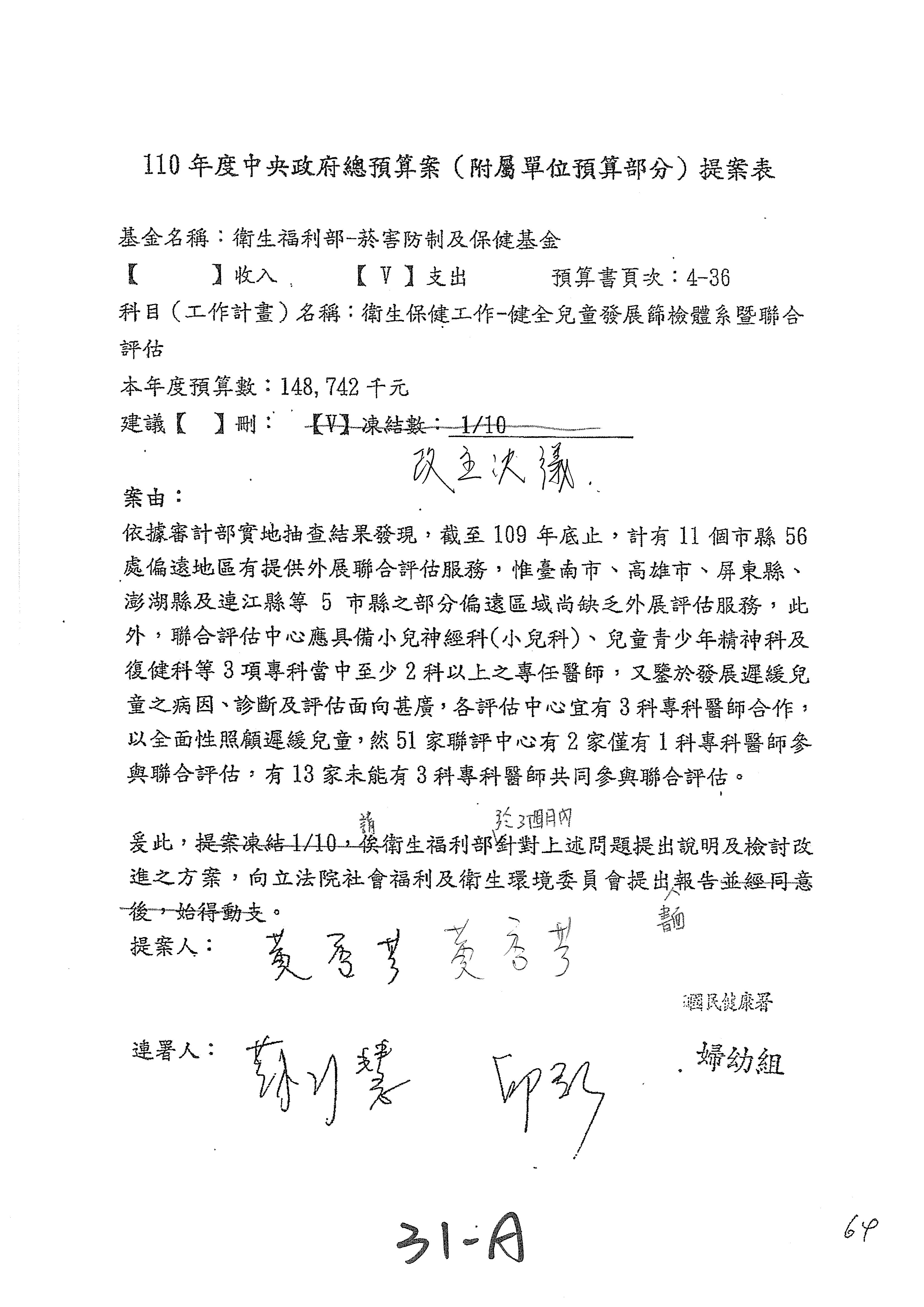 祝司長健芳:剛才吳委員提到第61案和第62案都是針對重症兒,包括喘息的機制建立及整個照服員的訓練,這個部分我們也都遵照委員剛剛的指示,另外再凍100萬元。
