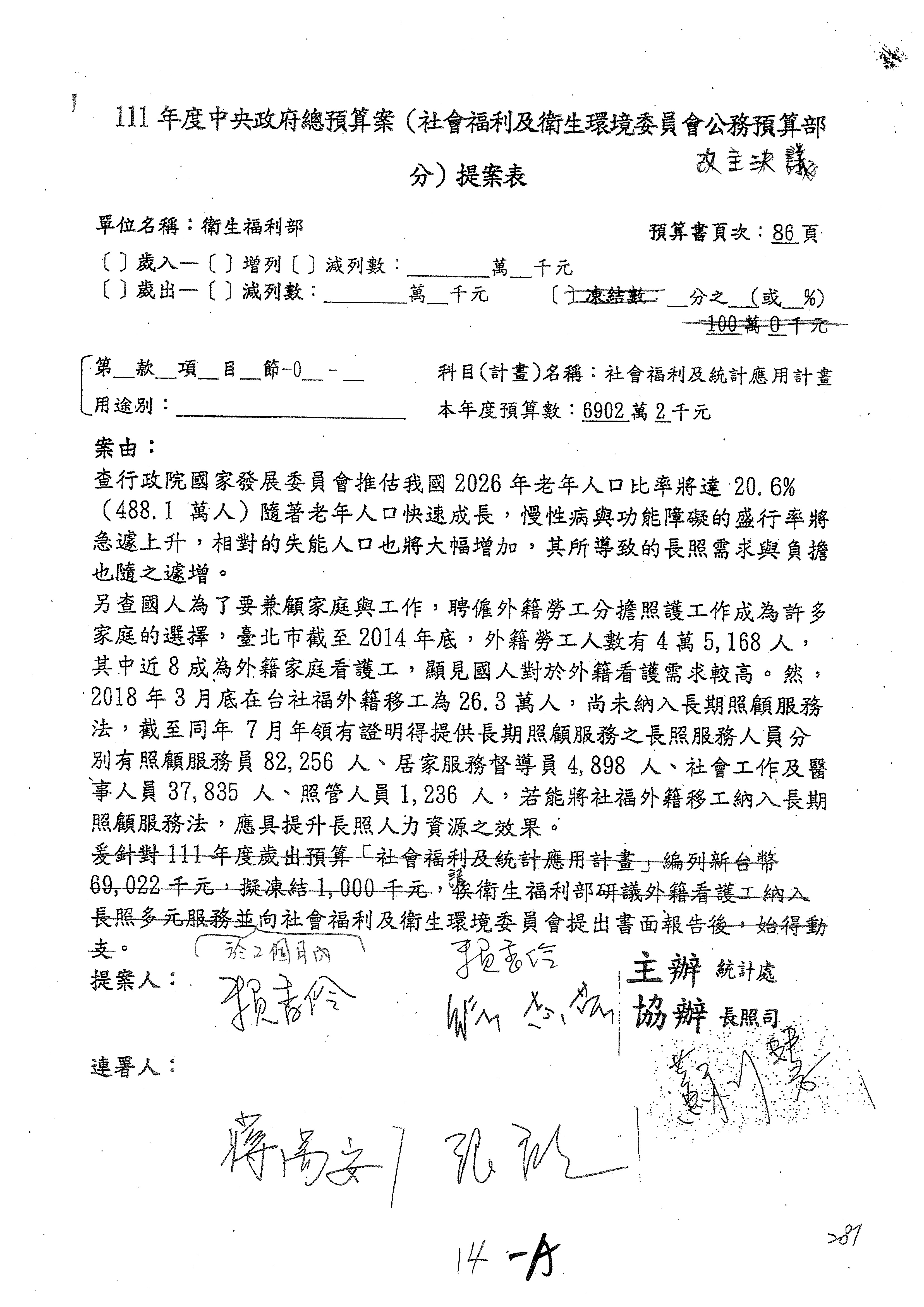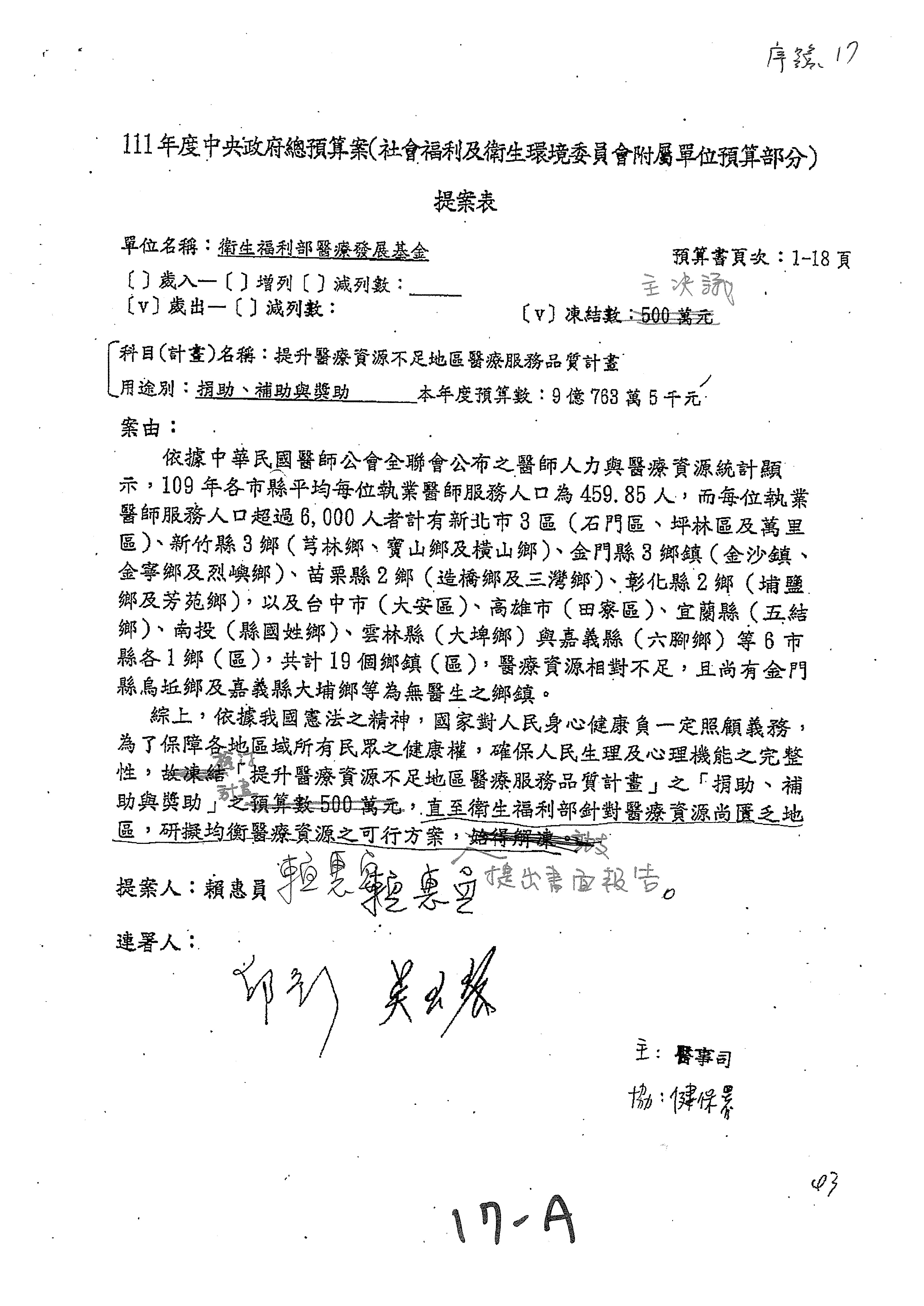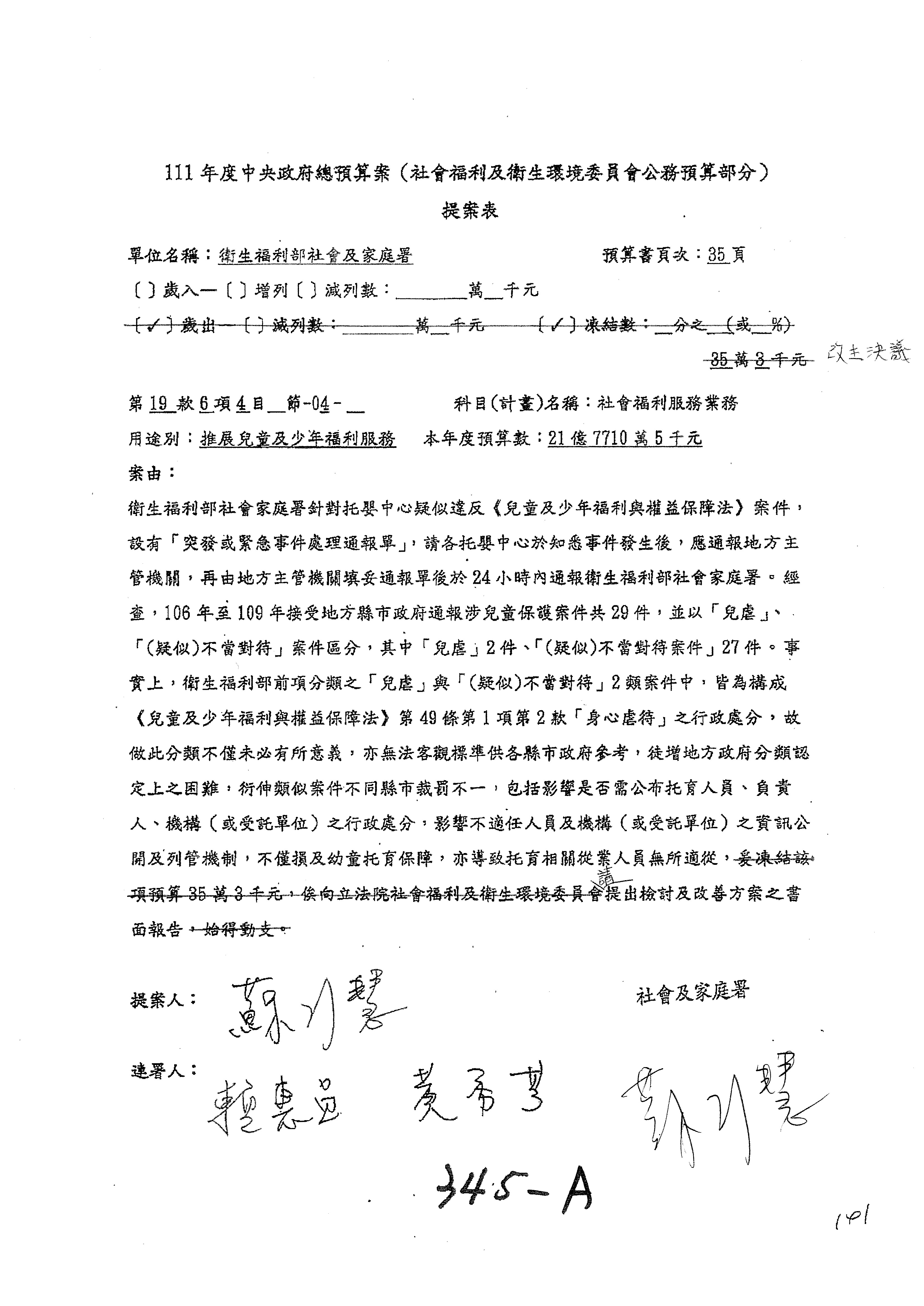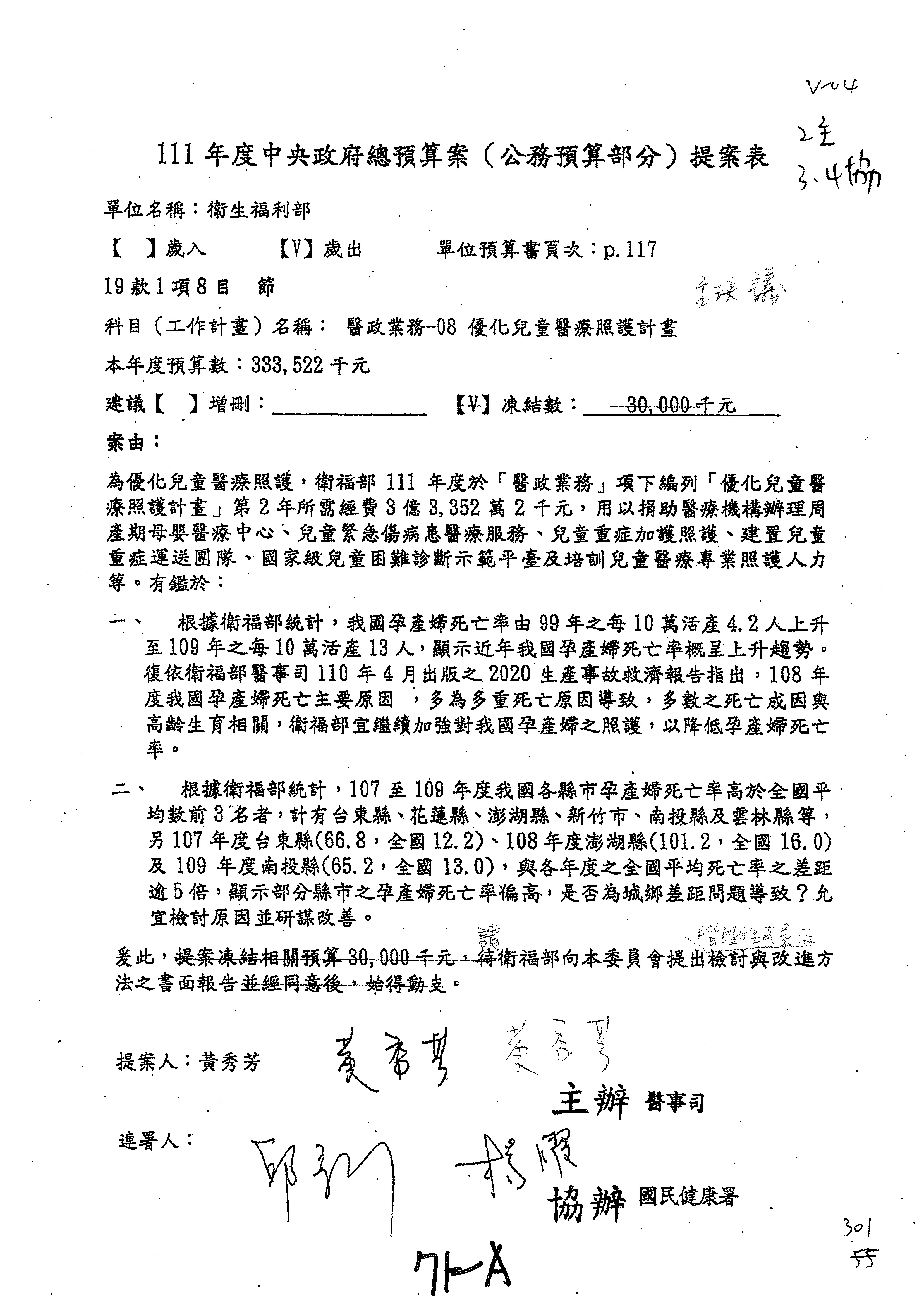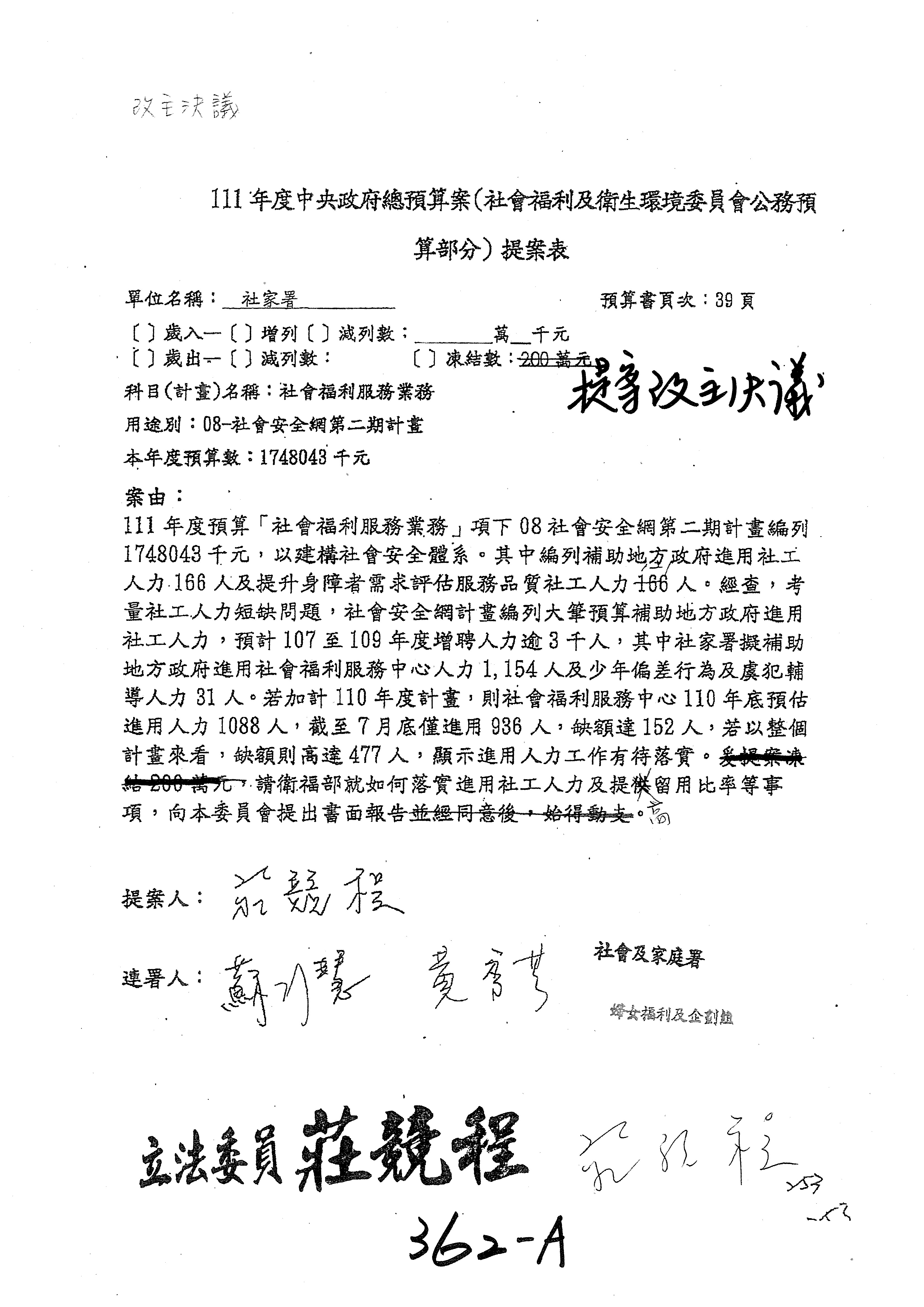 祝司長健芳:剛才吳委員提到第61案和第62案都是針對重症兒,包括喘息的機制建立及整個照服員的訓練,這個部分我們也都遵照委員剛剛的指示,另外再凍100萬元。