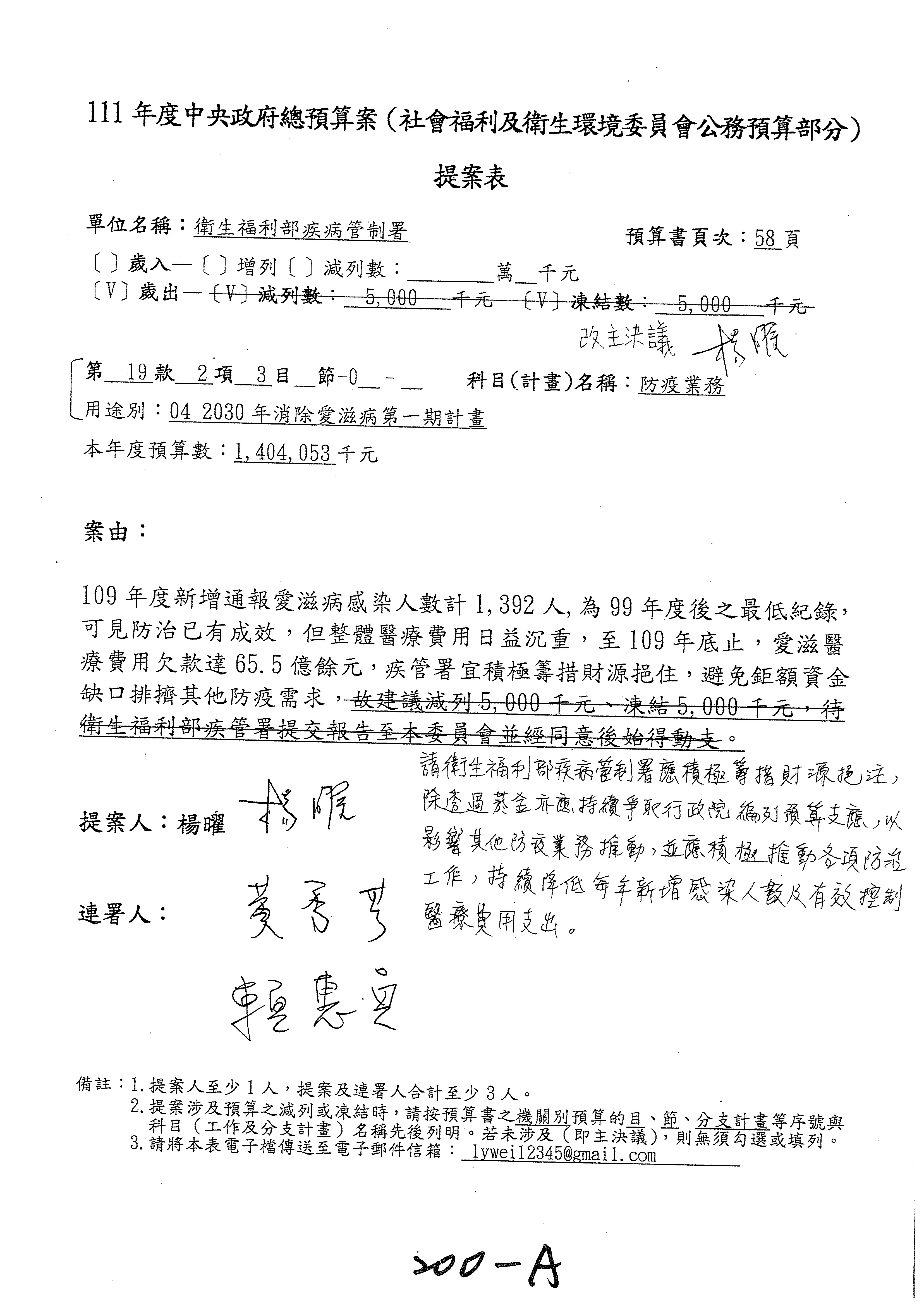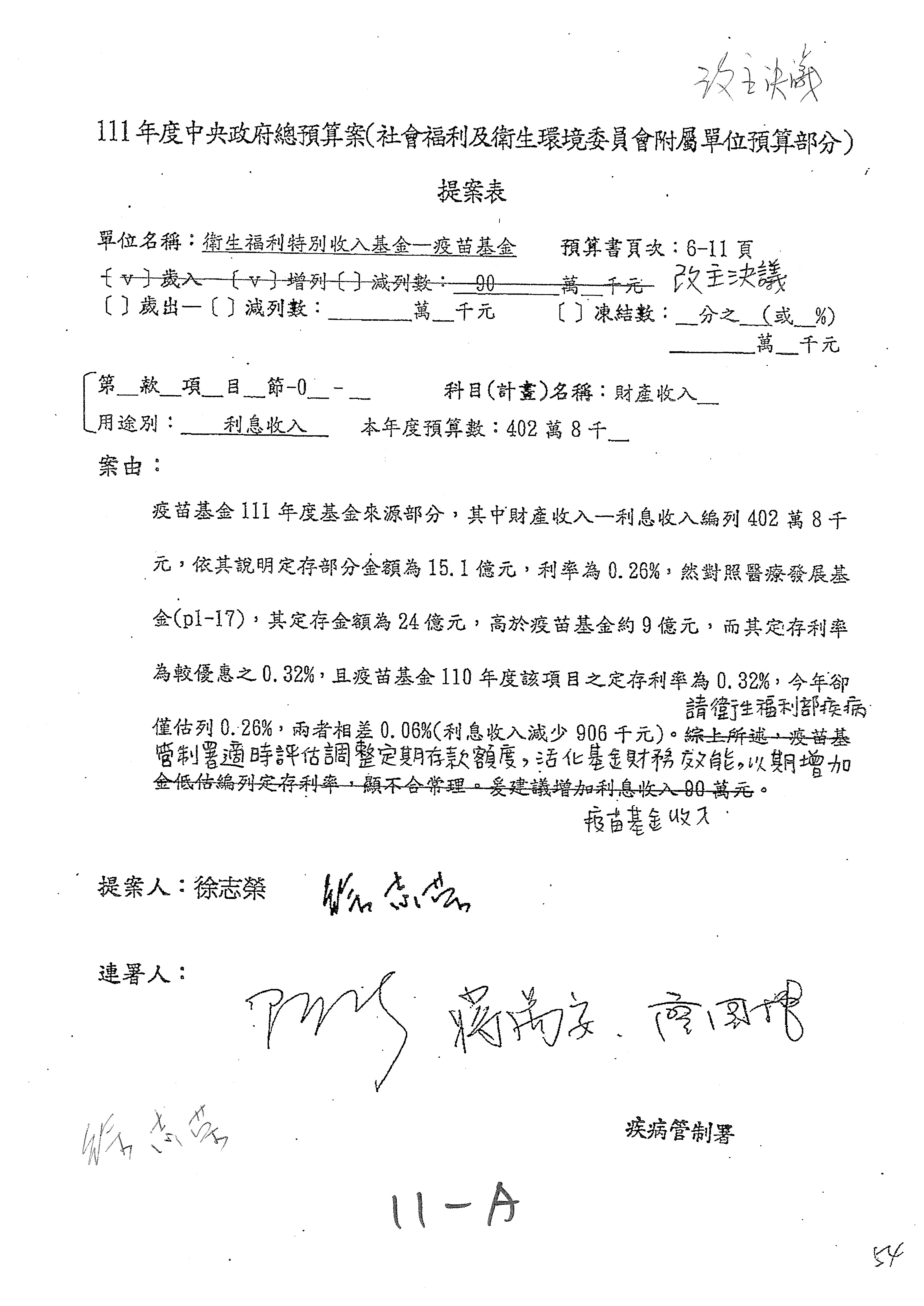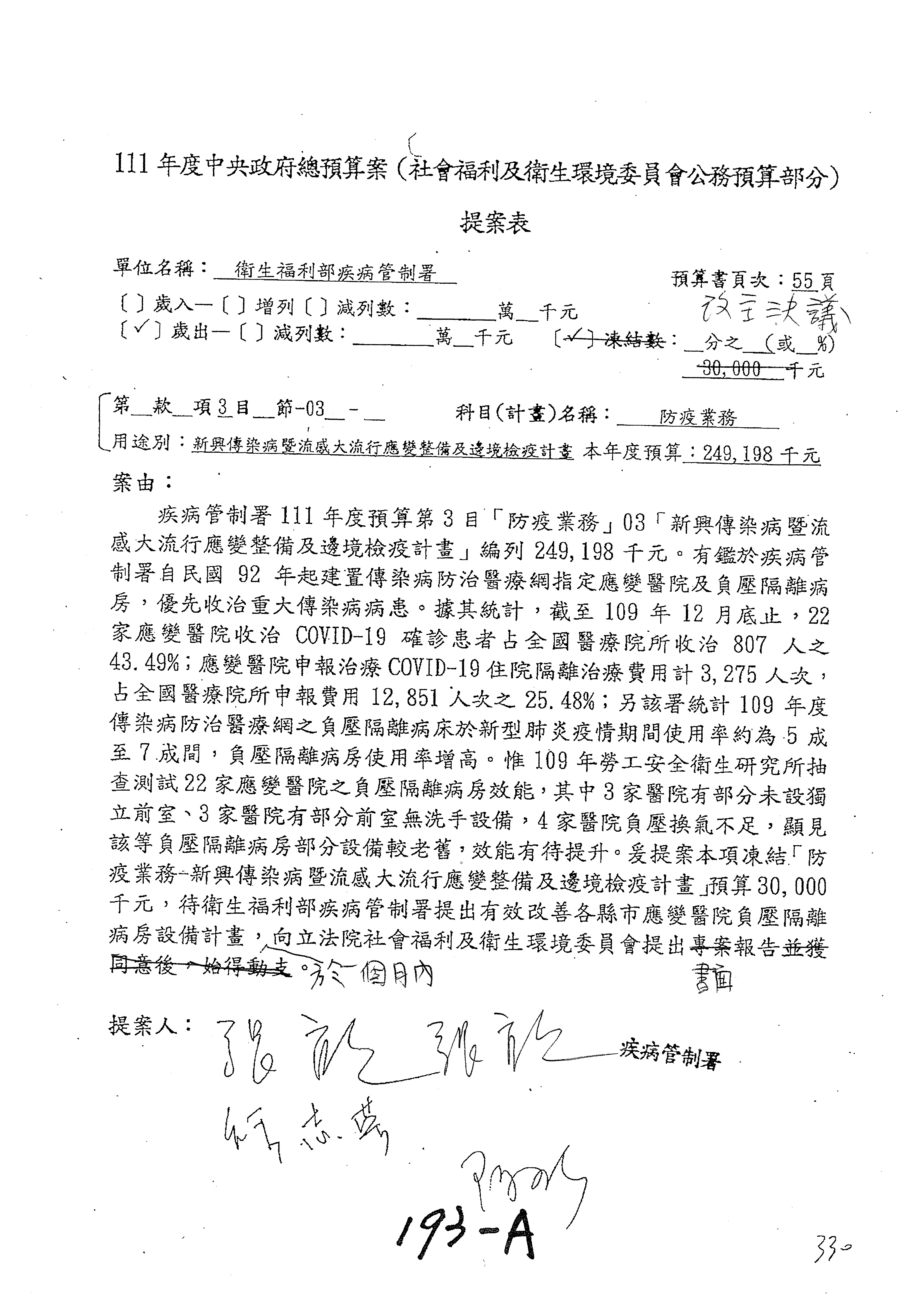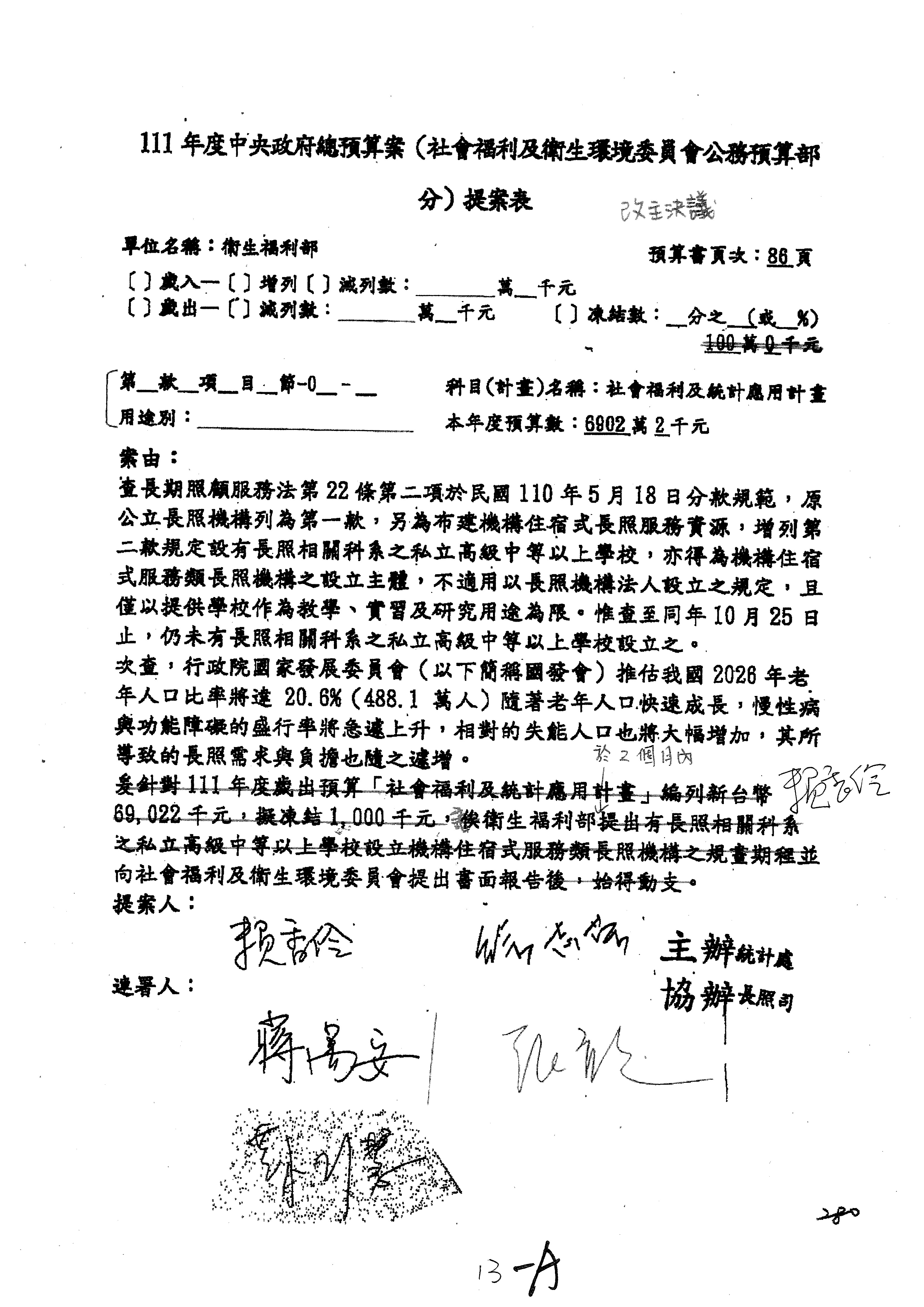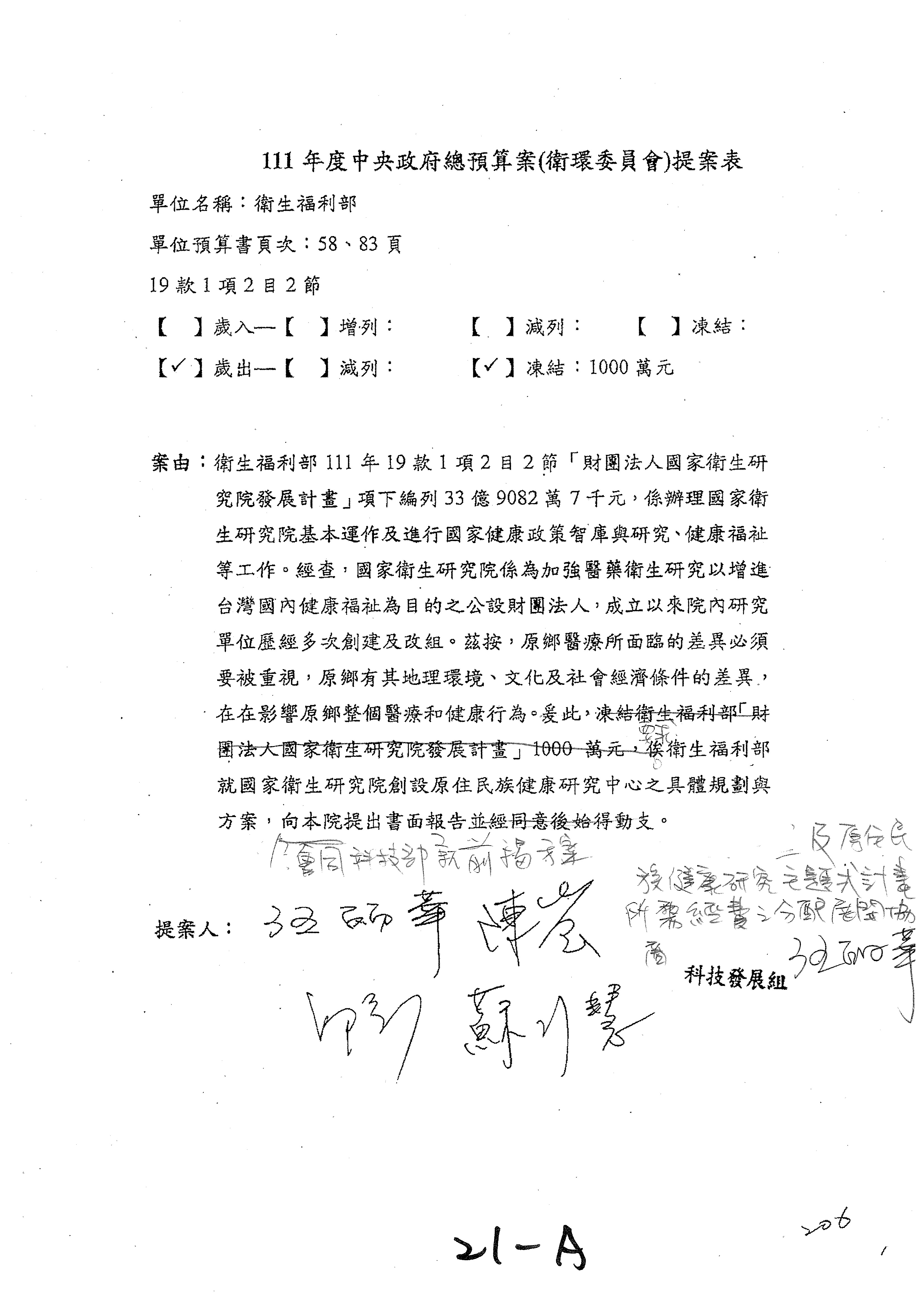 主席:作成以下決議:中華民國111年度中央政府總預算關於衛生福利部主管公務及基金預算案尚未審查完竣,後天(星期三)上午9時繼續審查,現在休息……