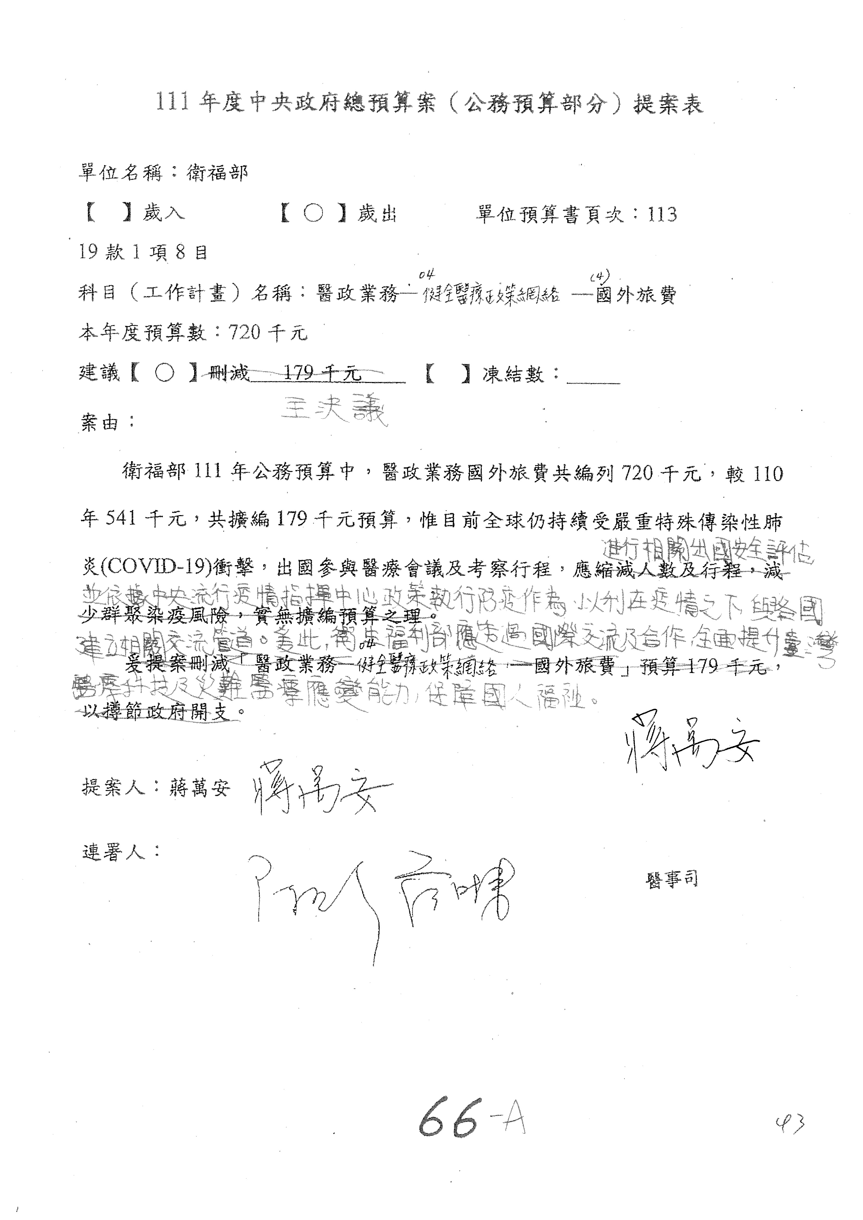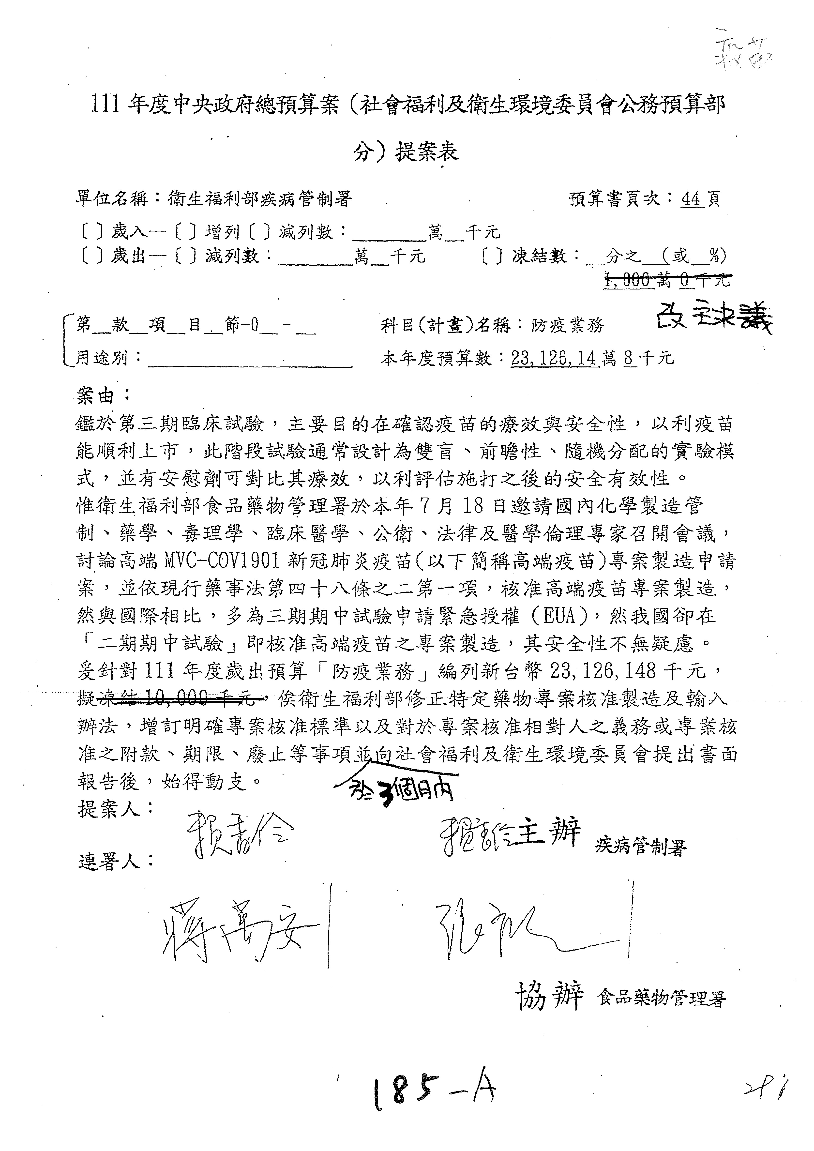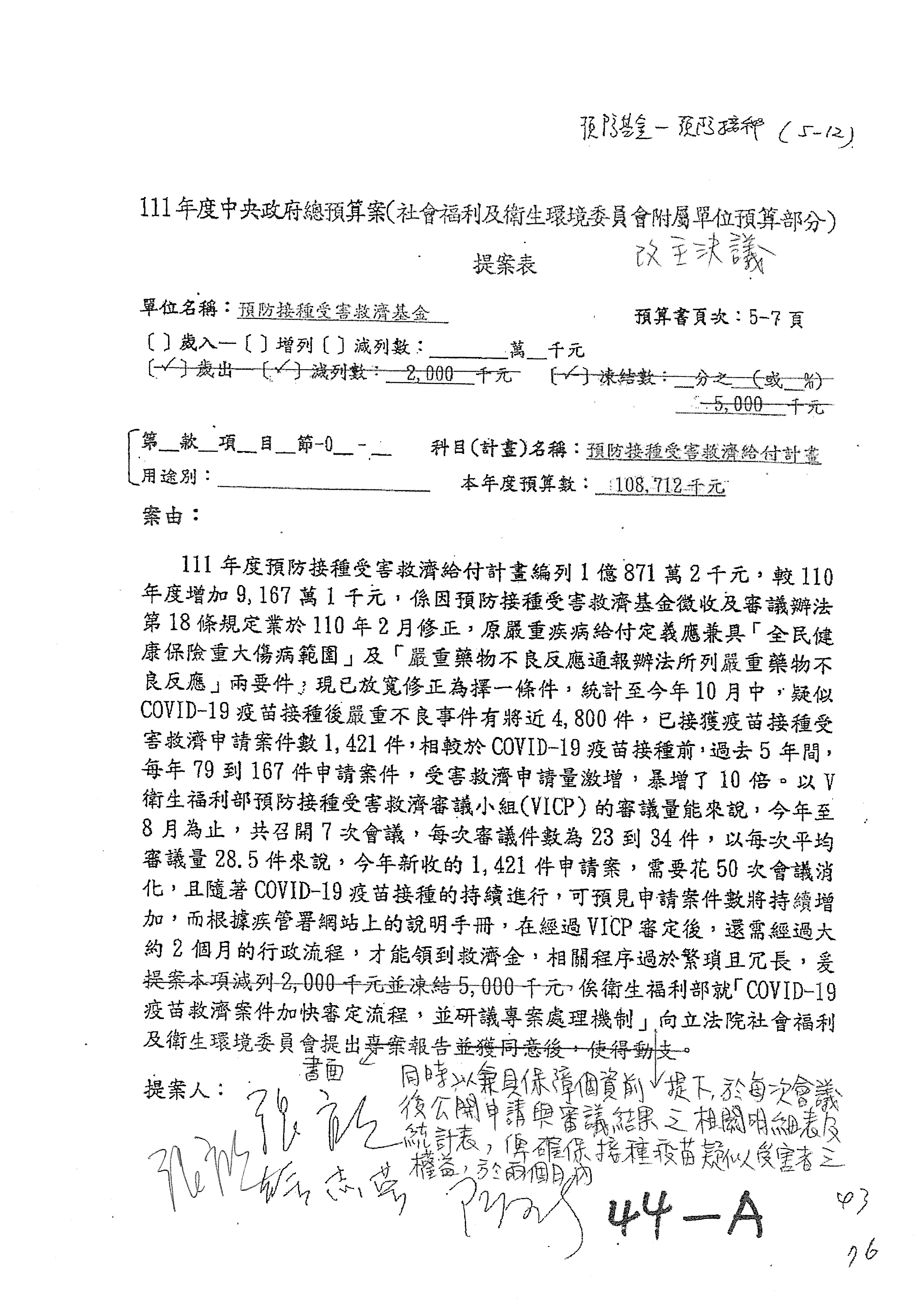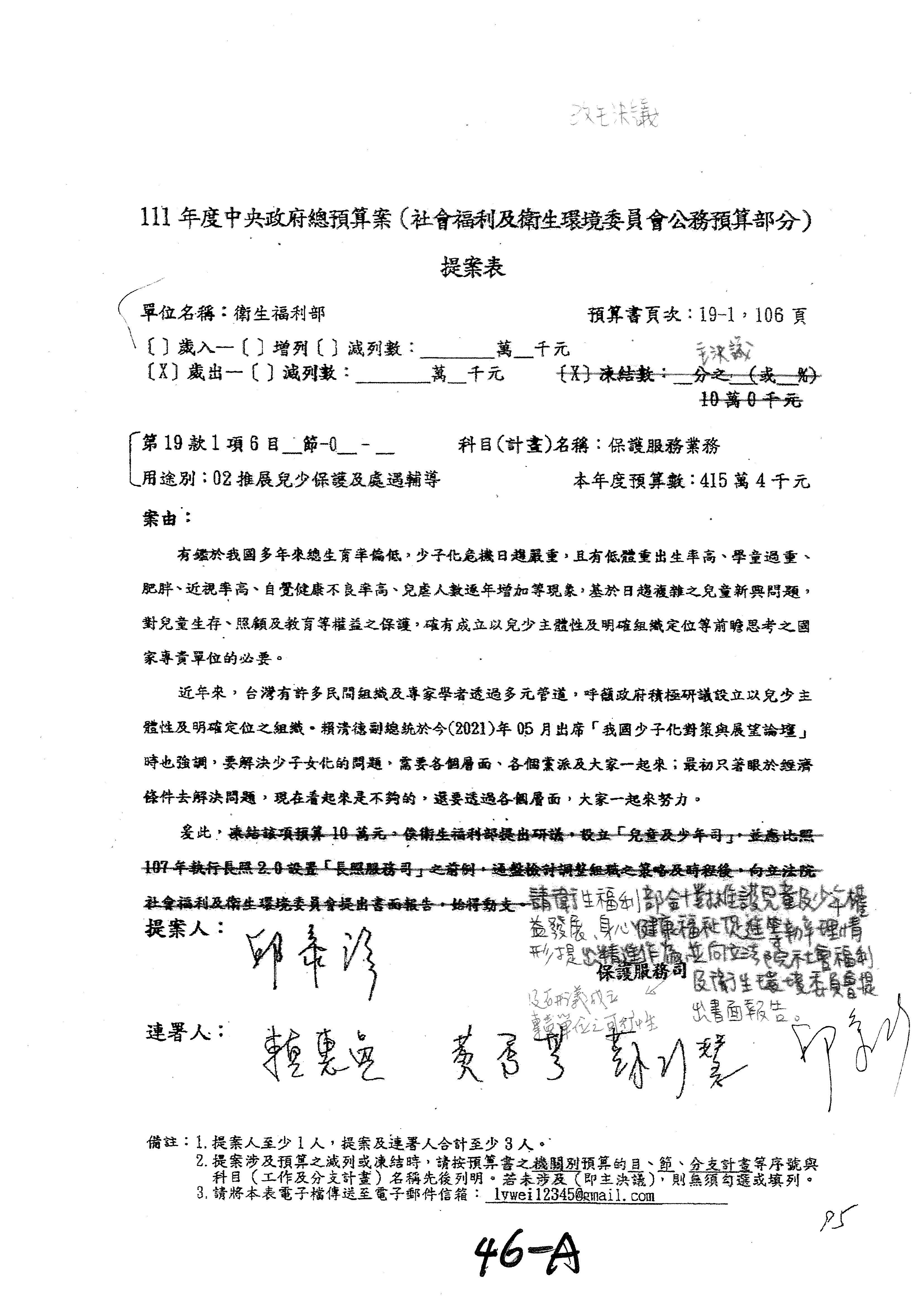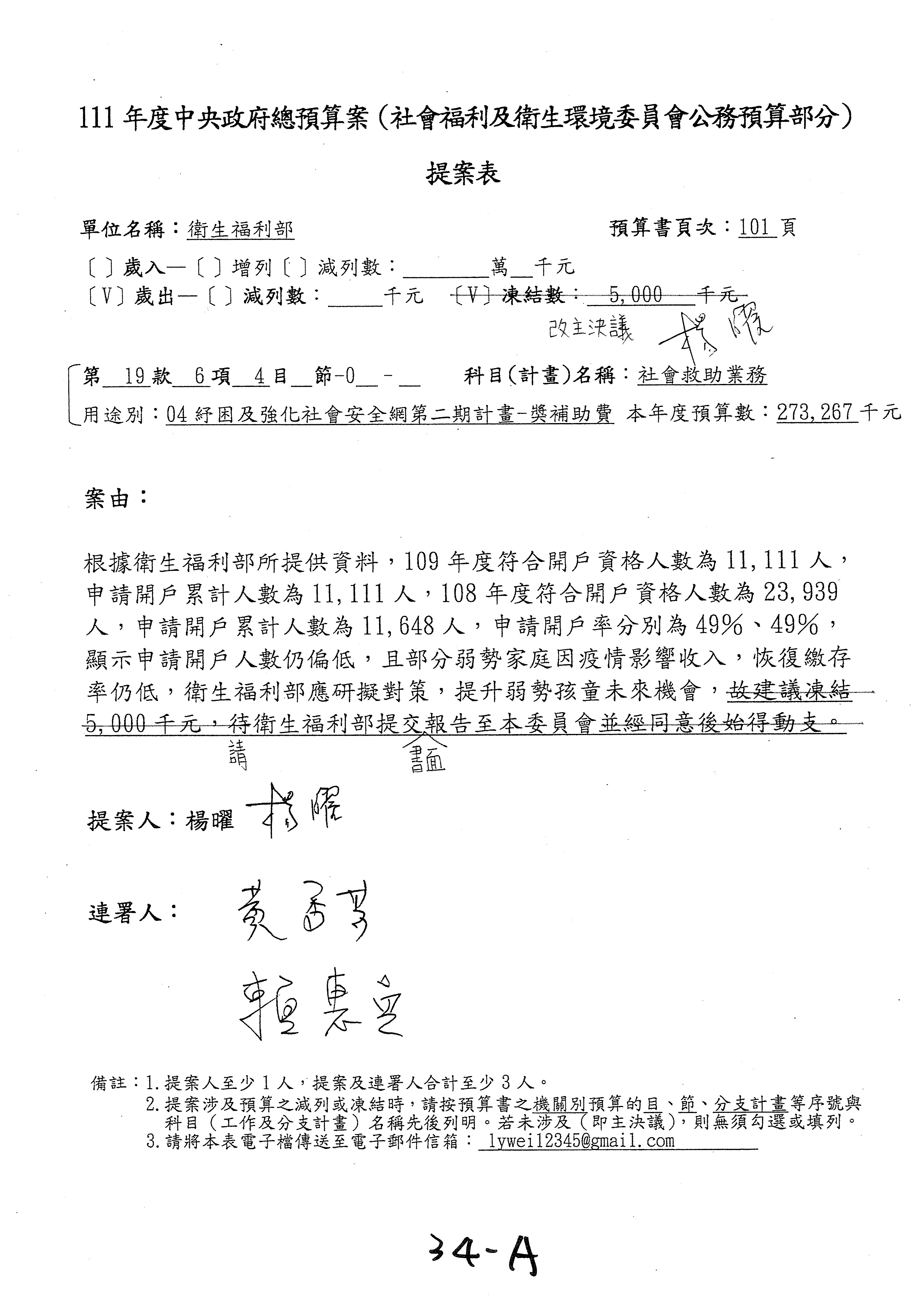 主席:作成以下決議:中華民國111年度中央政府總預算關於衛生福利部主管公務及基金預算案尚未審查完竣,後天(星期三)上午9時繼續審查,現在休息……