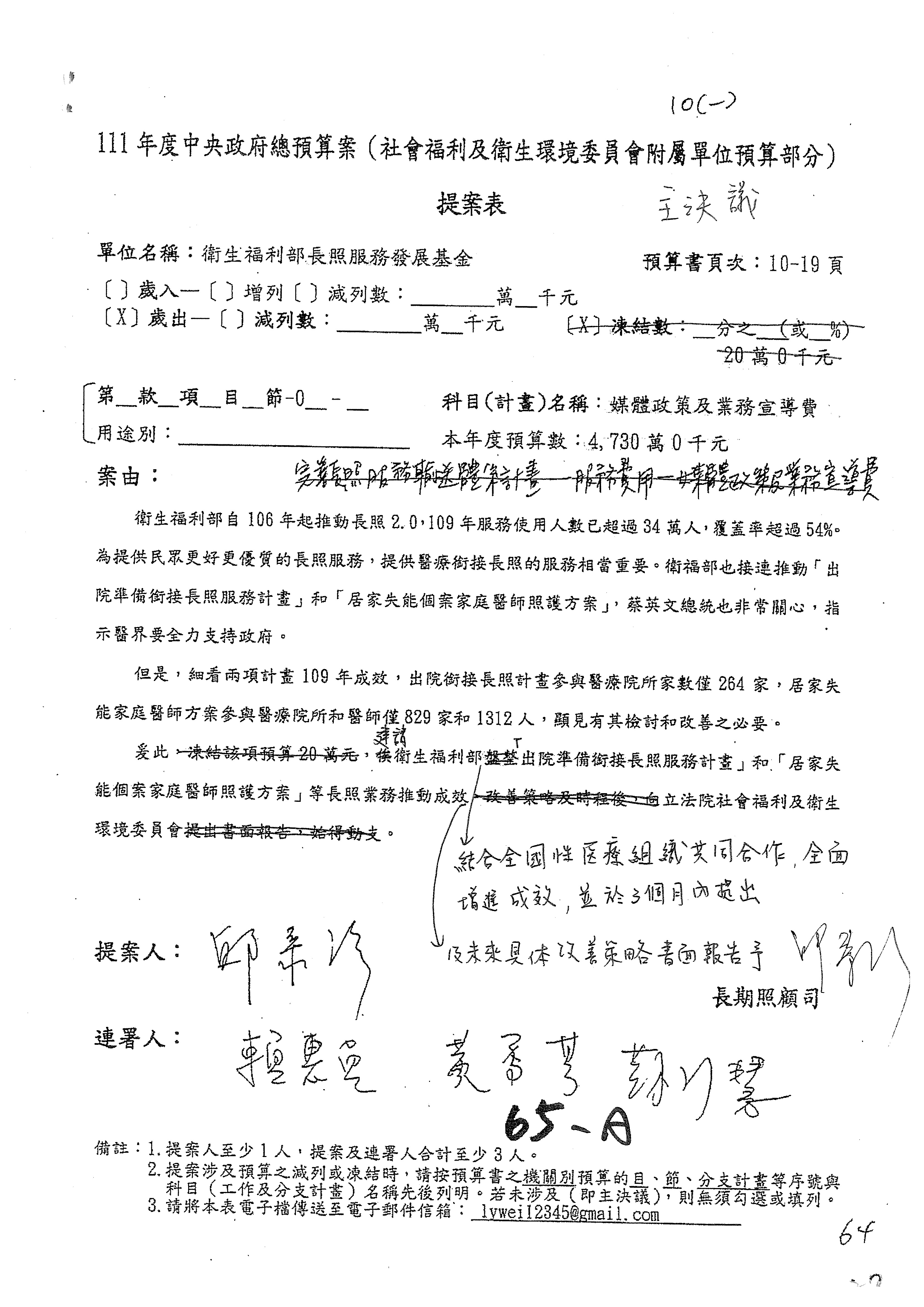 祝司長健芳:第64案葉毓蘭委員已經簽名了,同意改為主決議,提書面報告。