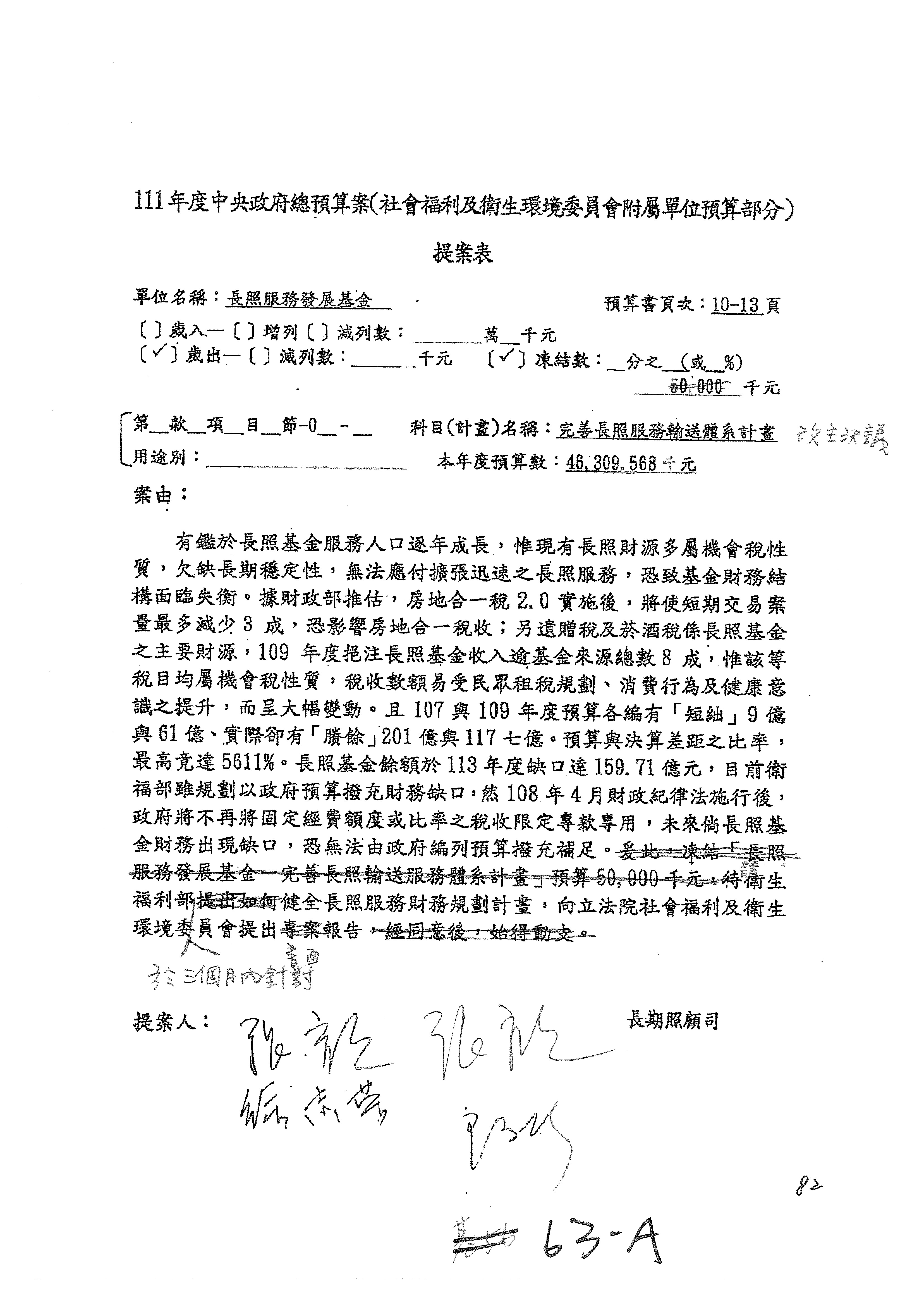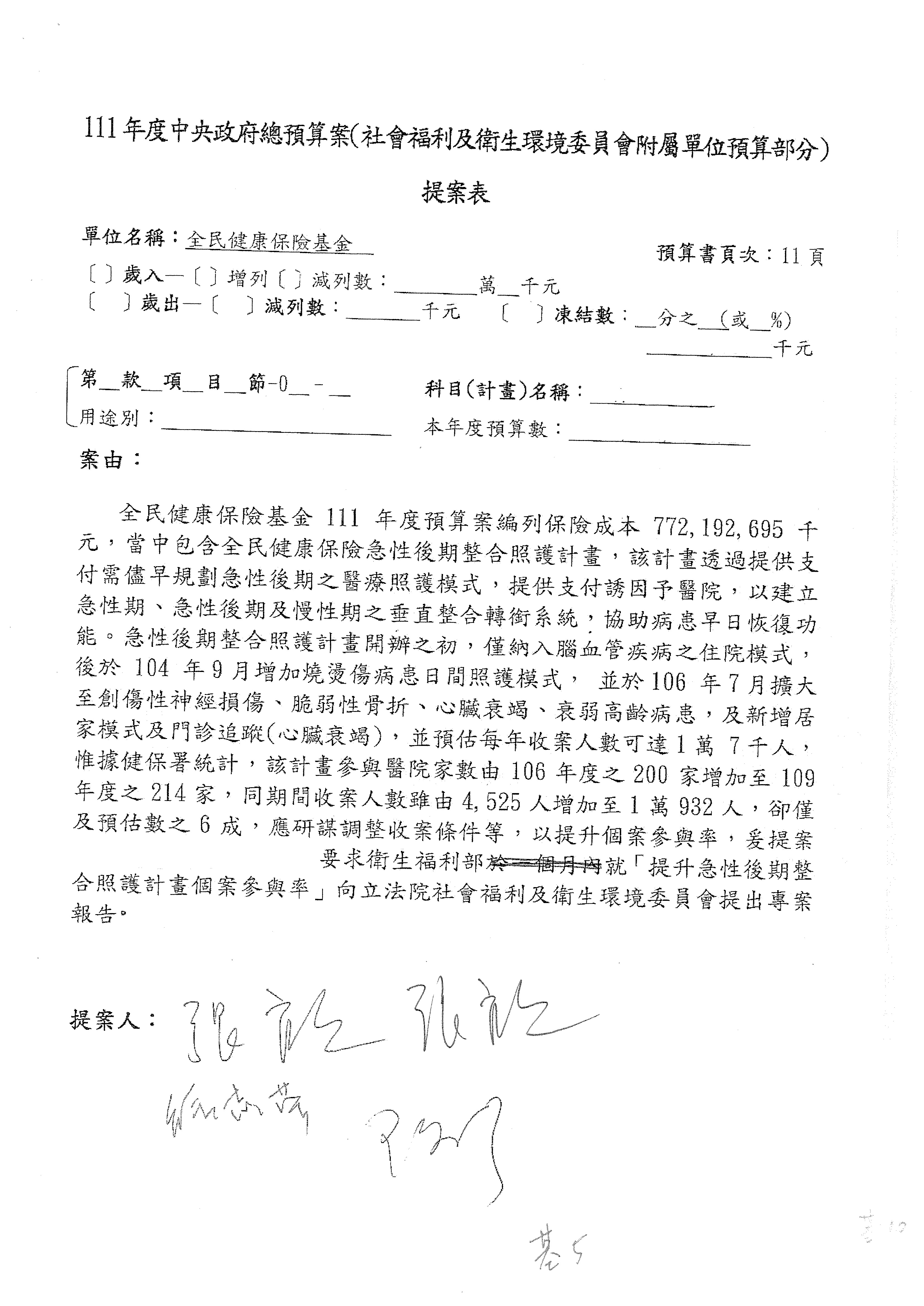 吳委員玉琴:長照司跟我們說明長照發展基金下面這個大項如果凍結的話,預算沒辦法執行,所以要我們凍結小項,所以才會凍結「創新專業服務試辦計畫」,不然我們平常不會隨便凍結創新服務方案,變成在這個項下小凍,我們凍100萬元,我的第60案、第61案、第62案提案不太一樣,第61案和第62案可以合併,因為是關於重症兒的議題,可以合併凍結100萬元,可是第60案是針對長照相關給支付的統計資料應該要開始有更清楚的資訊可以提供,讓我們對政策有比較清楚的方向和檢視,所以這個部分我還是建議凍結100萬元,後面兩案還要另外凍,就是分開總共凍200萬元。