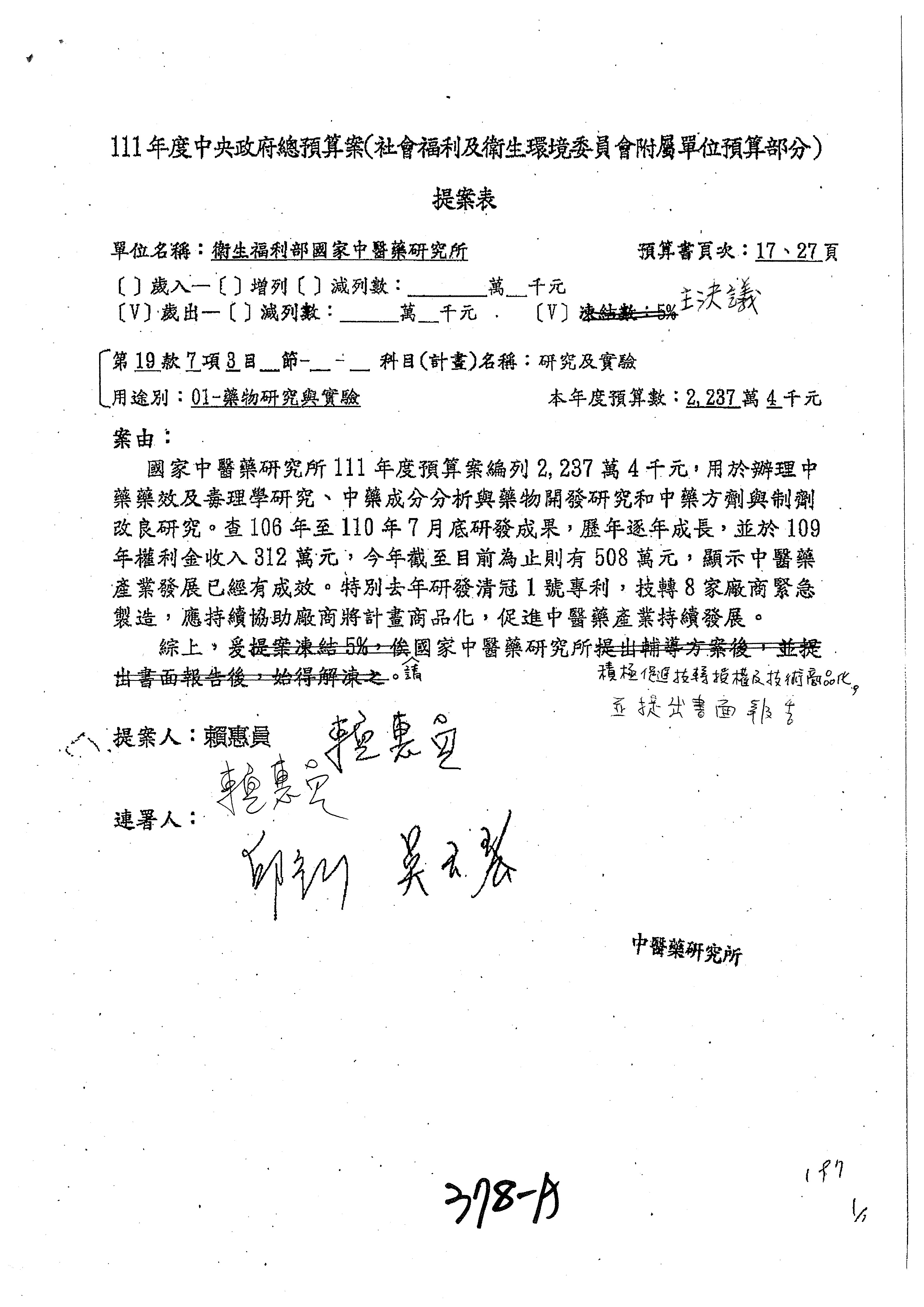 周署長志浩:第190案與第191案,謝謝委員同意兩案併案辦理,第191案文字酌予調整。謝謝委員同意併案,改為不刪減,凍結100萬元,提書面報告後解凍。
