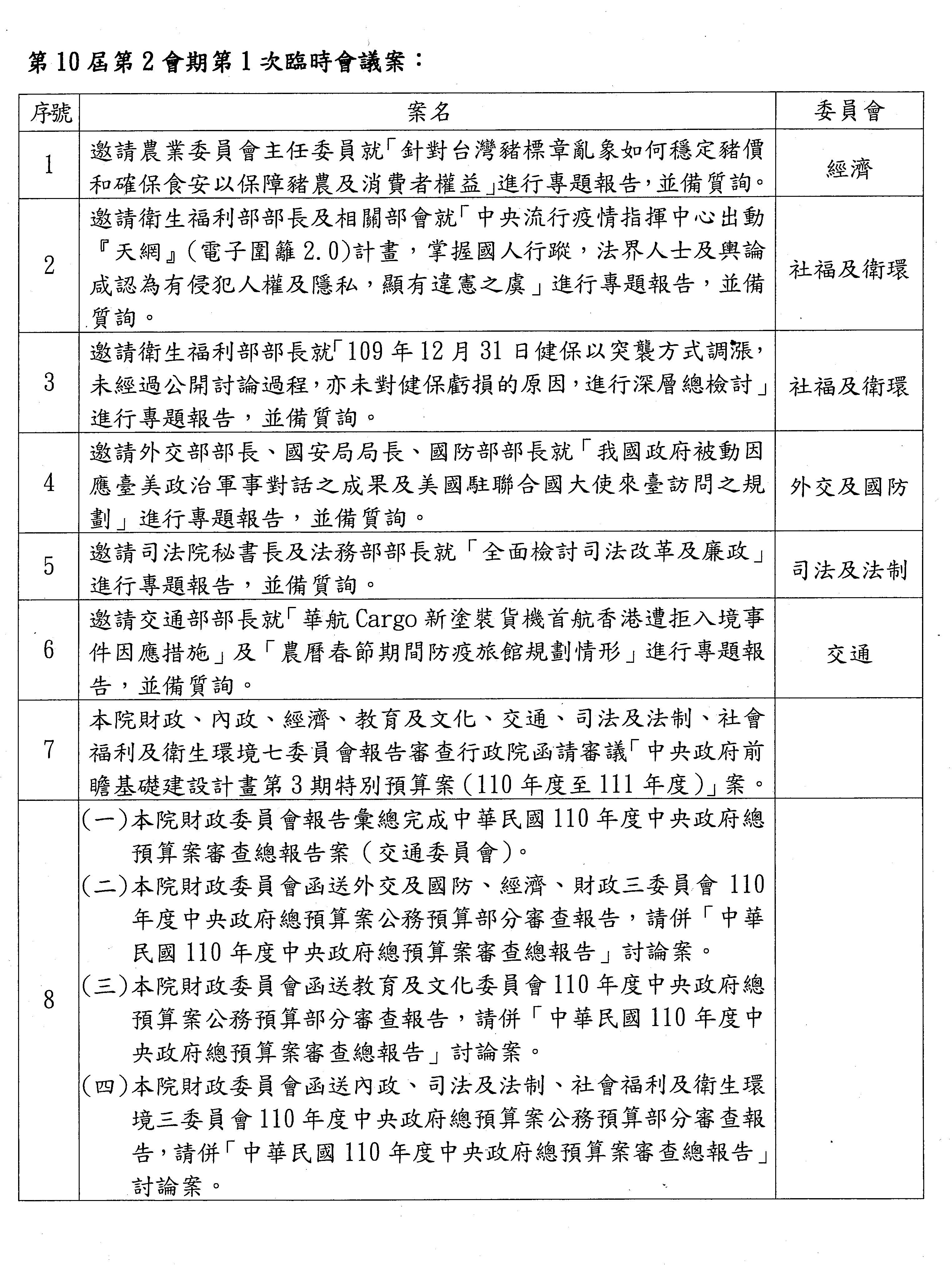 案由:本院委員林為洲、林奕華、鄭麗文等37人,有鑑於近來台灣豬標章亂象叢生、「天網」(電子圍籬2.0)計畫引發侵犯人權及隱私疑慮、健保偷襲調漲、對美關係判斷失誤、司法改革及廉政流弊、華航新塗裝貨機遭香港拒絕入境及防疫旅館量能不足等問題亟待釐清,爰建請依憲法第六十九條及立法院組織法第六條規定召開第10屆第2會期第1次臨時會,邀請各相關部會向本院有關委員會進行專題報告,並請審議「中央政府前瞻基礎建議計畫第3期特別預算案(110年度至111年度)」案及「中華民國110年度中央政府總預算案」等案(如附件),是否有當?敬請 公決