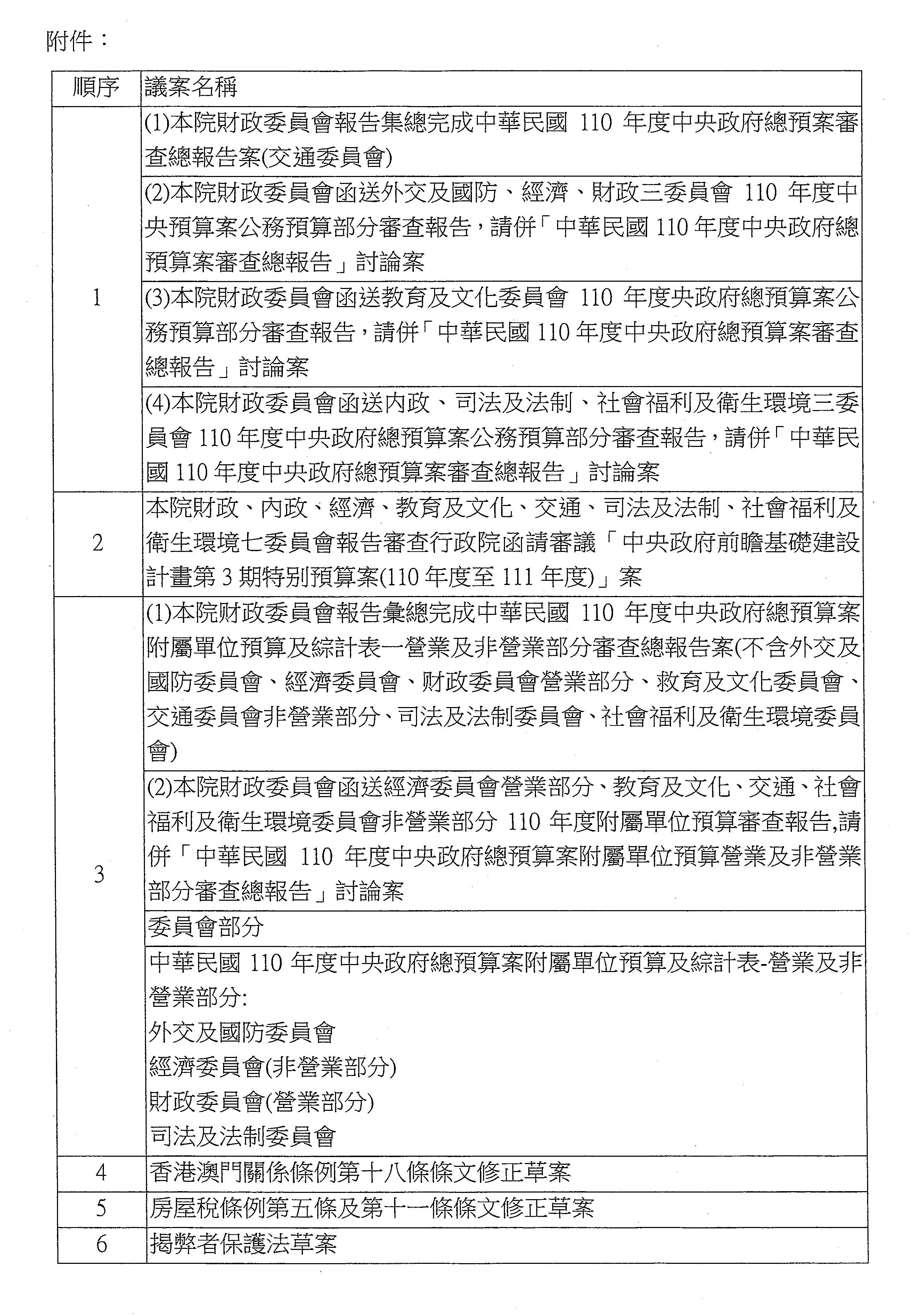 案由:本院委員賴香伶、張其祿、高虹安、邱臣遠、蔡壁如等41人,鑑於本會期為總預算審查會期,為維持國家施政運作及堅守財政紀律,落實立委監督政府施政之責;另,為真正落實台灣撐香港,建立港人政治疪護的法制基礎;為確實落實居住正義,解決台灣居大不易、高房價的問題;為保障及鼓勵民眾揭發重大不法行為,維護公共之利益。爰依憲法第六十九條及立法院組織法第六條第一項提請召開臨時會審議「中華民國110年度中央政府總預算案(含附屬單位預算及綜計表─營業與非營業部分)」、「中央政府前瞻基礎建設第3期特別預算案(110年度至111年度)」、及「香港澳門關係條例第十八條條文修正草案」、「房屋稅條例第五條及第十一條條文修正草案」、「揭弊者保護法草案」等重大議案,上述三案並自內政、財政、司法及法制委員會抽出逕付二讀(詳如附件);自110年1月11日(星期一)至1月29日(星期五)召開第二會期第一次臨時會,1月11日(星期一)中午舉行程序委員會,1月11日(星期一)下午召開第一次會議,並與1月15日(星期五)、1月19日(星期二)為一次會;1月20日(星期三)、1月21日(星期四)、1月22日(星期五)、1月25日(星期一)、1月26日(星期二)、1月27日(星期三)、1月28日(星期四)、1月29日(星期五)為第二次會議;1月12日(星期二)、1月13日(星期三)、1月14日(星期四)及1月18日(星期一)召開委員會會議。是否有當,敬請公決。