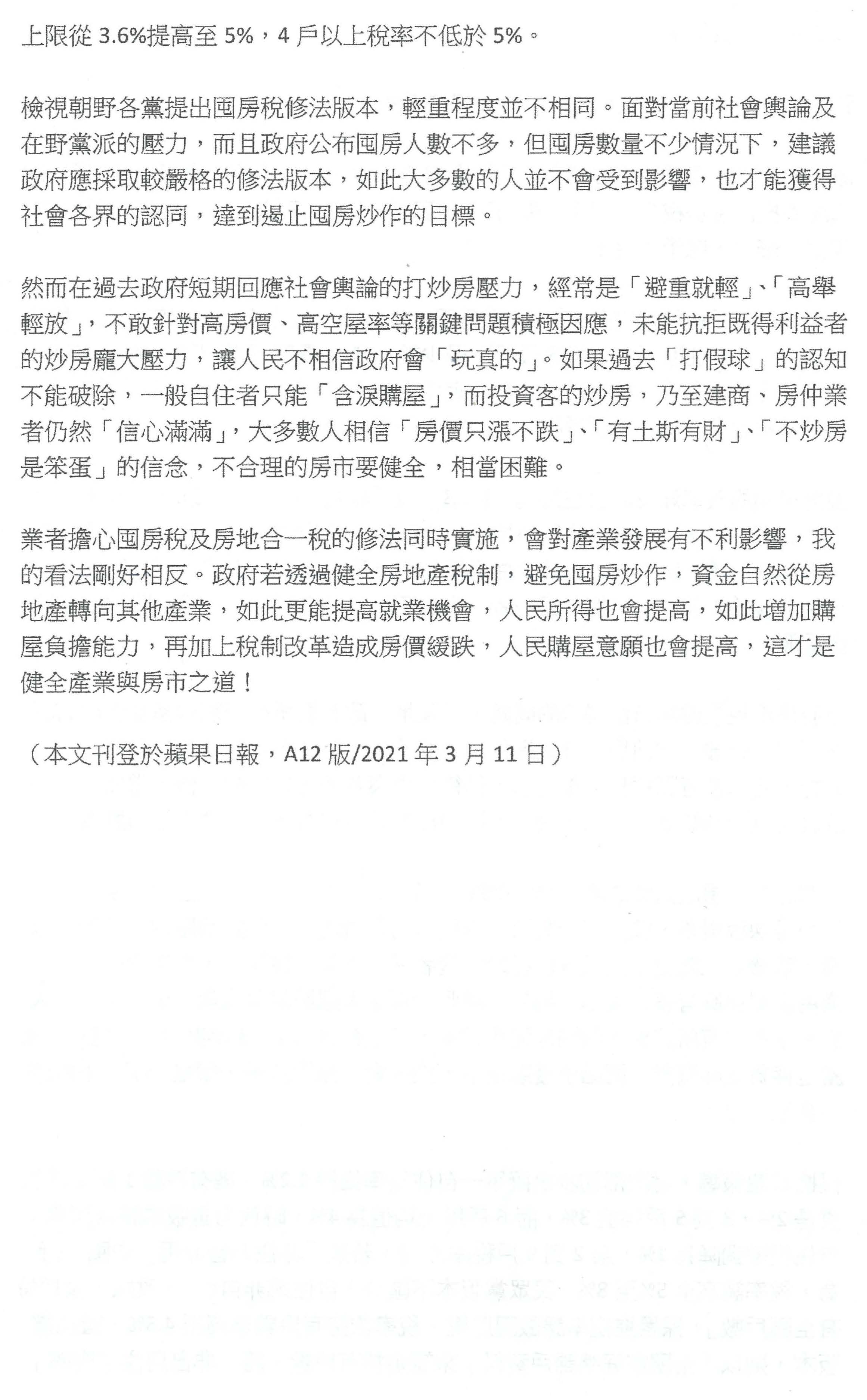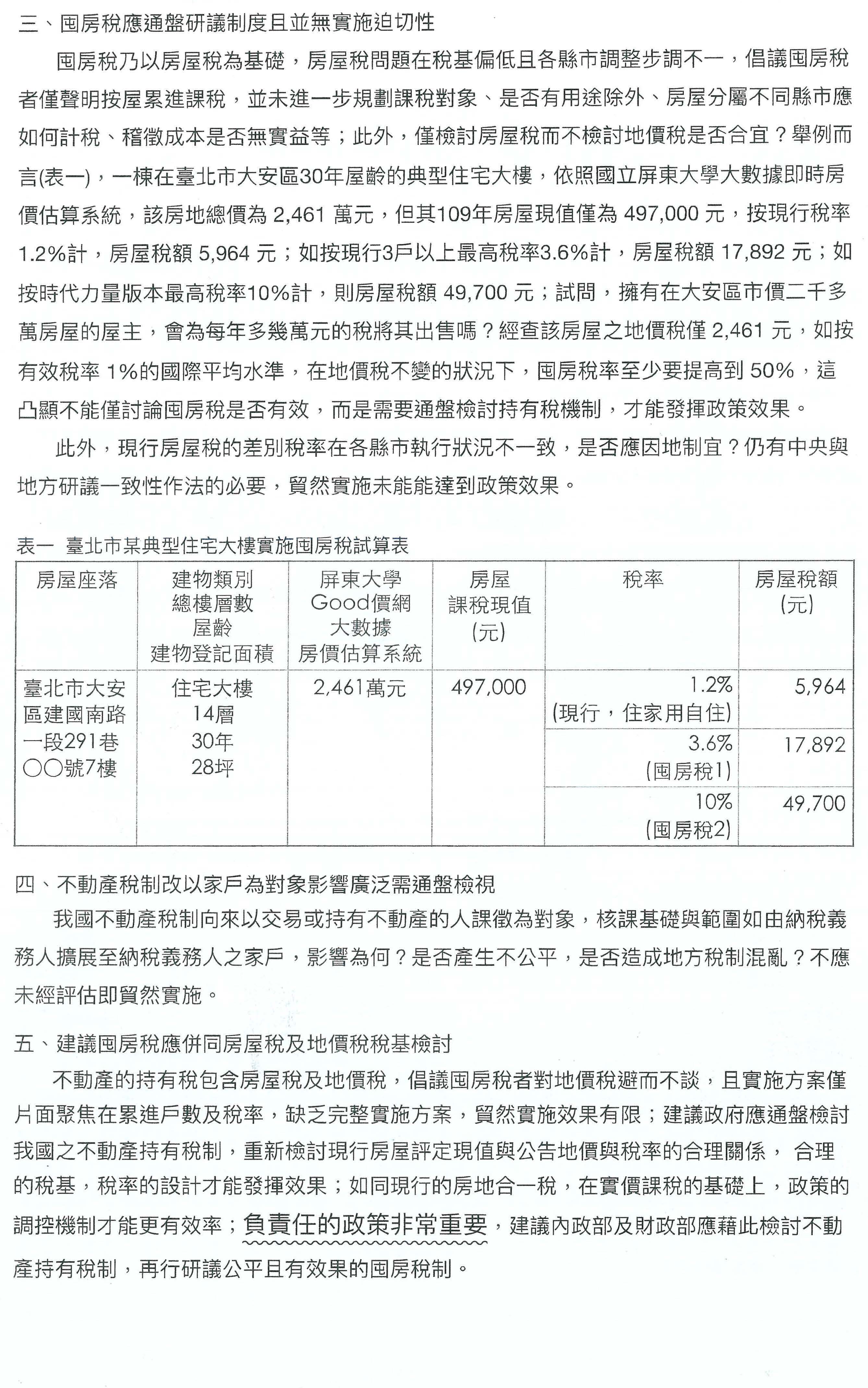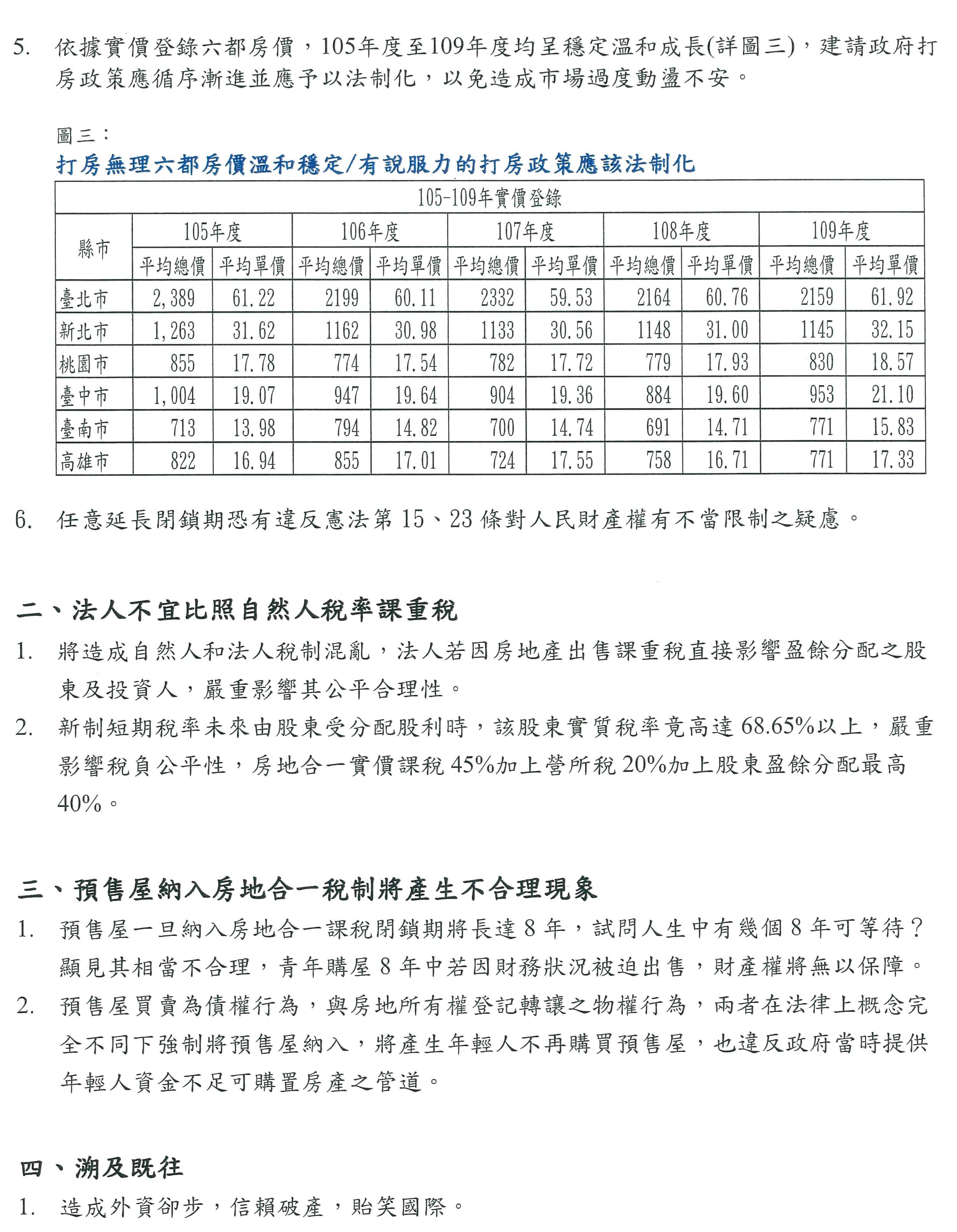 其實所有的房屋價格以六都來講,從105年到109年,所有的價格都非常溫和,臺北市只漲1%嘛!漲1%要打房嗎?要炒房嗎?臺南市只不過漲2%嘛!尤其是法人比照自然人課稅更是荒腔走板,45%的重稅,20%的營利事業所得稅,後面還要盈餘分配耶!所以法人跟自然人的稅制是完全不一樣的。本會堅決反對全部都是加稅的政策,年輕人跟產業應該會完全唾棄,以上是本會的建議。謝謝。