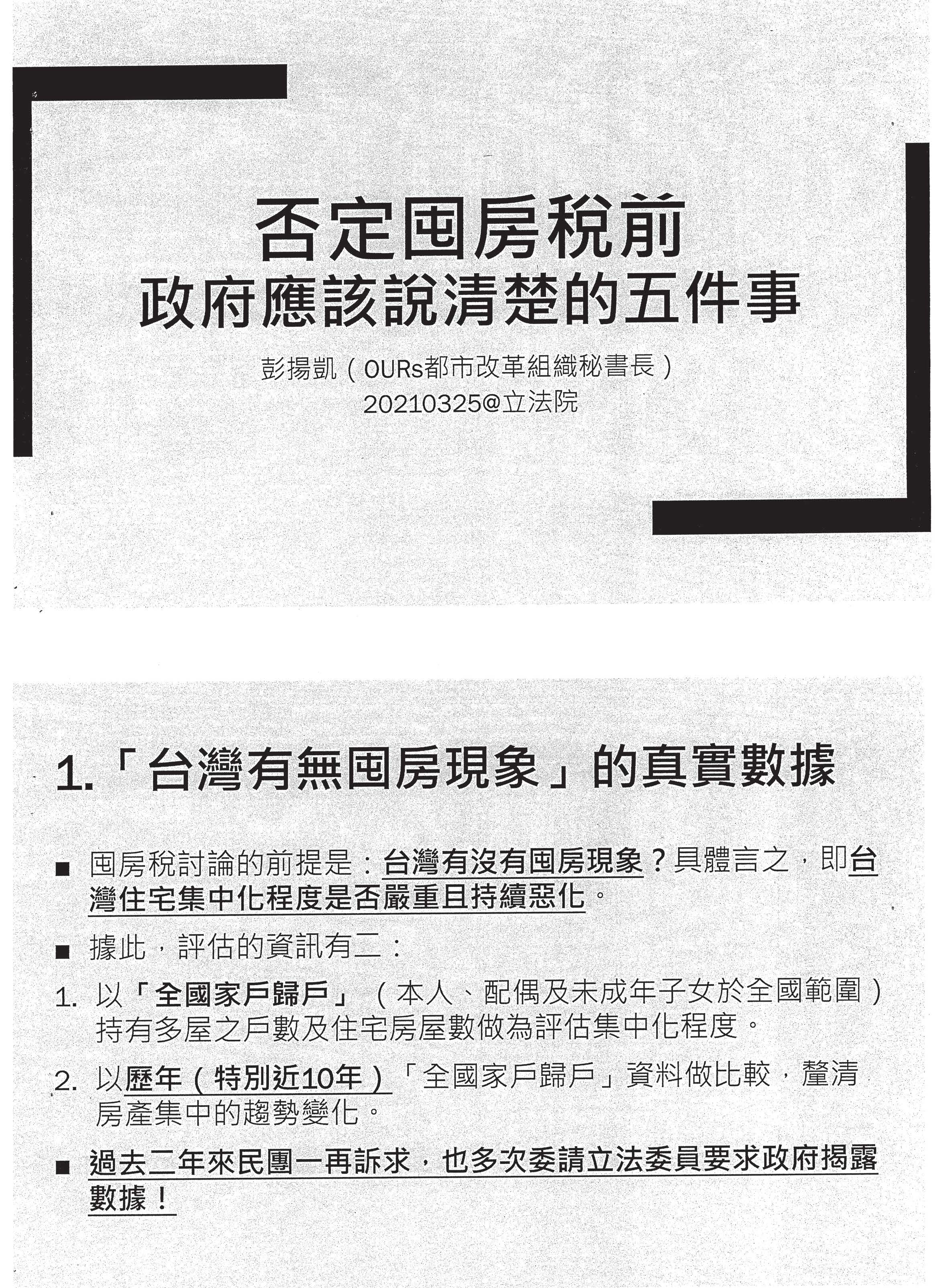 請OURs都市改革組織彭揚凱秘書長摘要發言。