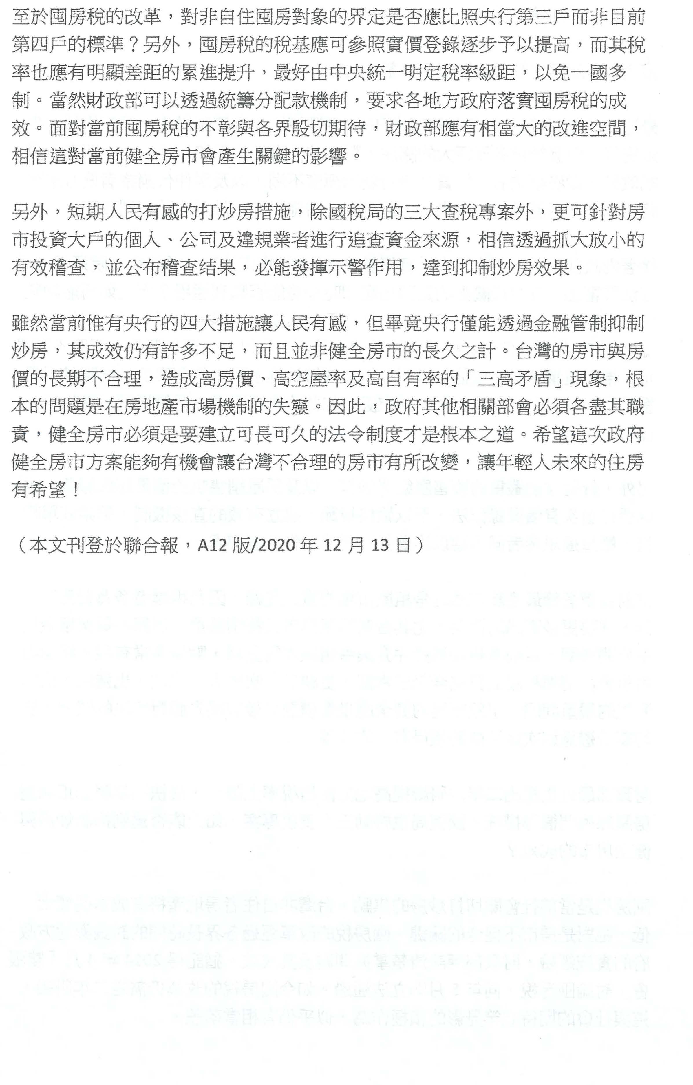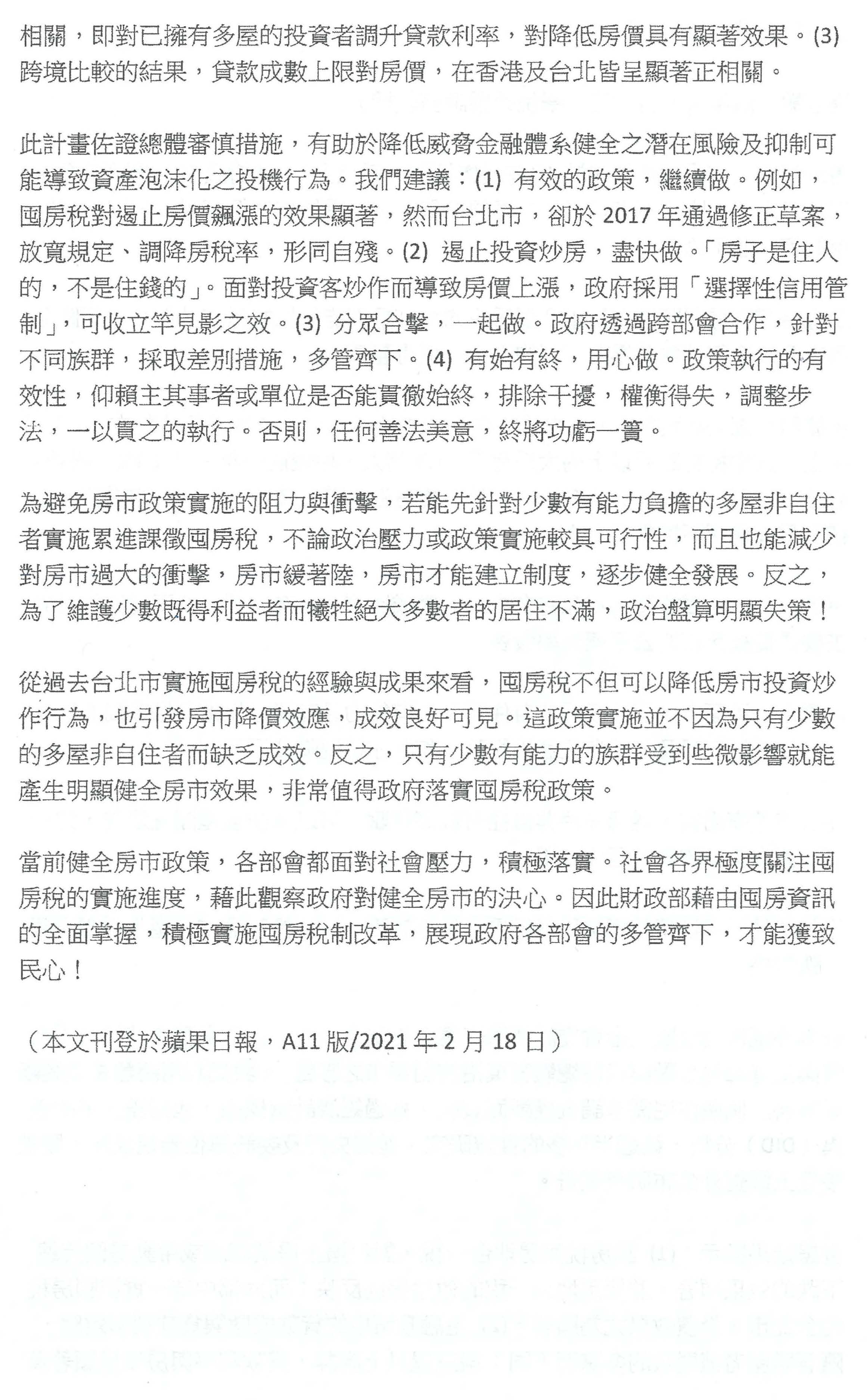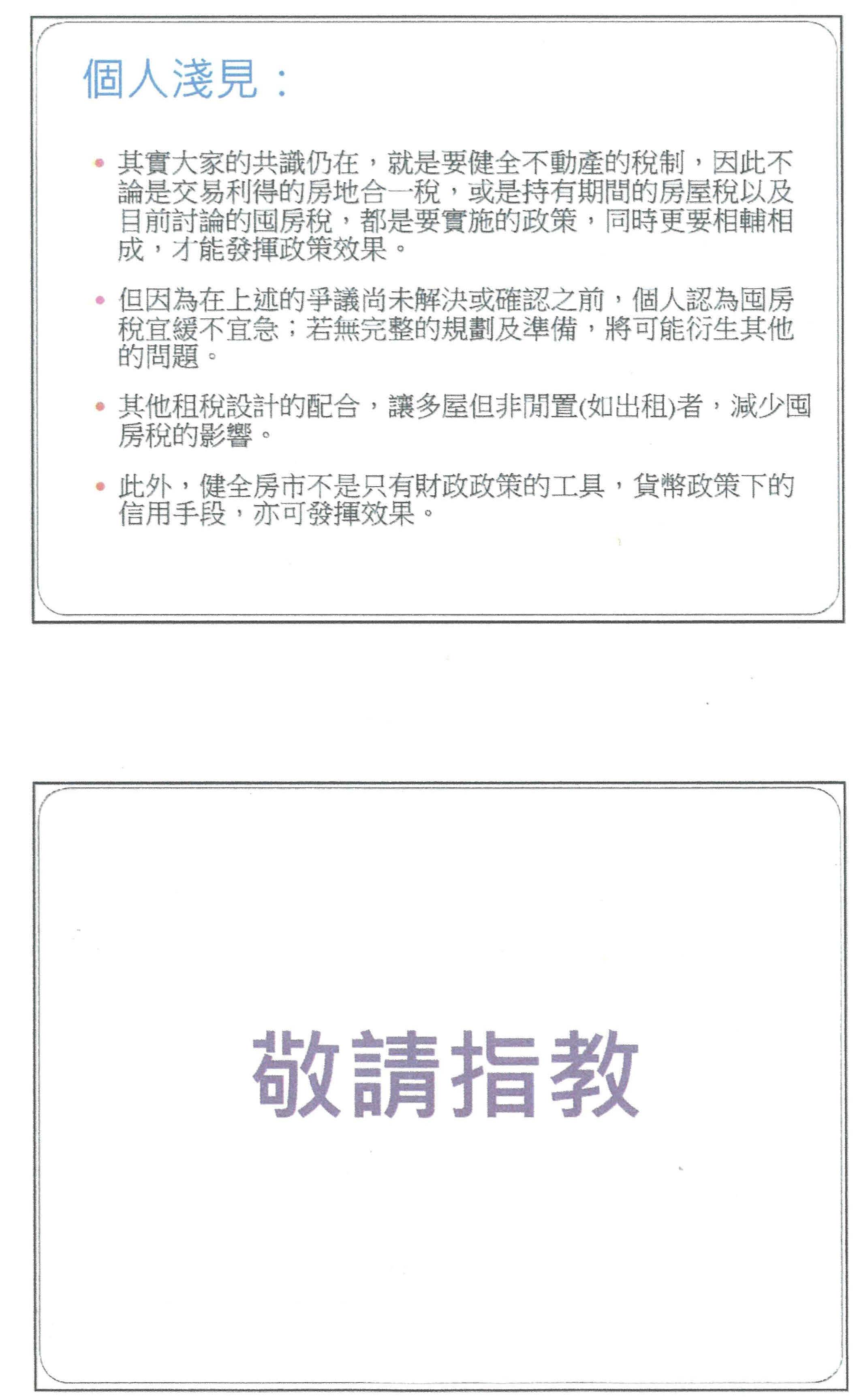 所以最後以我個人的淺見,我個人認為其實大家的共識都還是在的,就是要健全不動產的稅制,只不過在目前有些爭議和問題還沒解決、確認之前,我個人認為是宜緩不宜急,甚至可以再搭配一些租稅方面的設計,提高租金的扣除額,讓租屋可能有這樣的誘因去索取資料給房東,如果房東拿到這個證明,他的房屋確實沒有空閒,也申報了租金收入,甚至課徵囤房稅之後,可以有特別的處理,我覺得這樣也許是一個思考的方向。最後,健全房市這不是只有財政工具上面的責任,貨幣政策下的信用管制,我個人也認為是有一些發揮的效果,以上是個人淺見,供大家參考,謝謝。