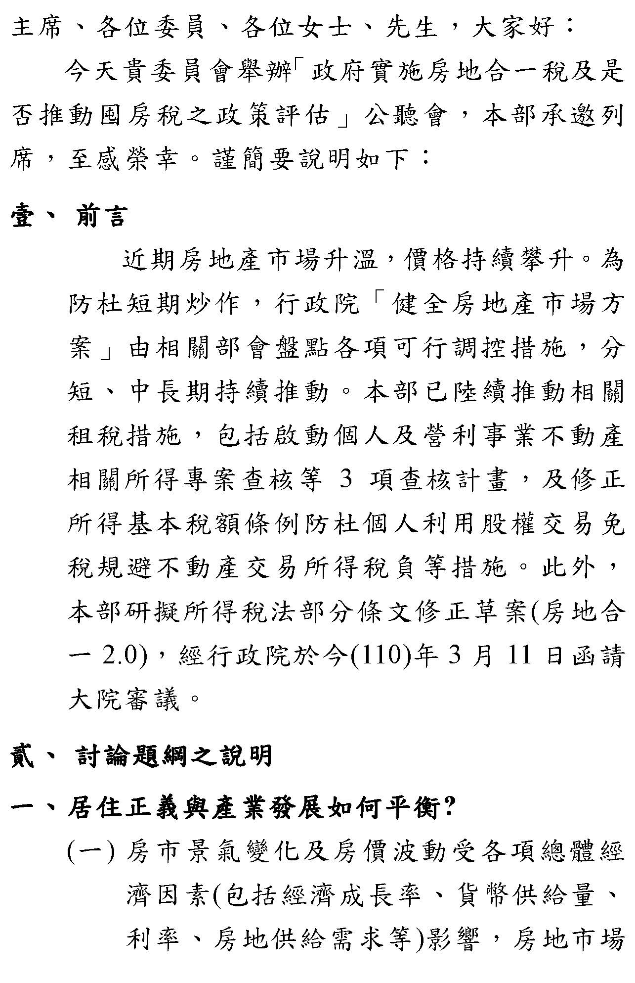 主席:報告委員會,現在開始開會。今天是舉辦公聽會,首先代表立法院歡迎各位專家學者,還有各部會、在場相關委員、政府機關代表來參加「政府實施房地合一稅及是否推動囤房稅之政策評估」公聽會。