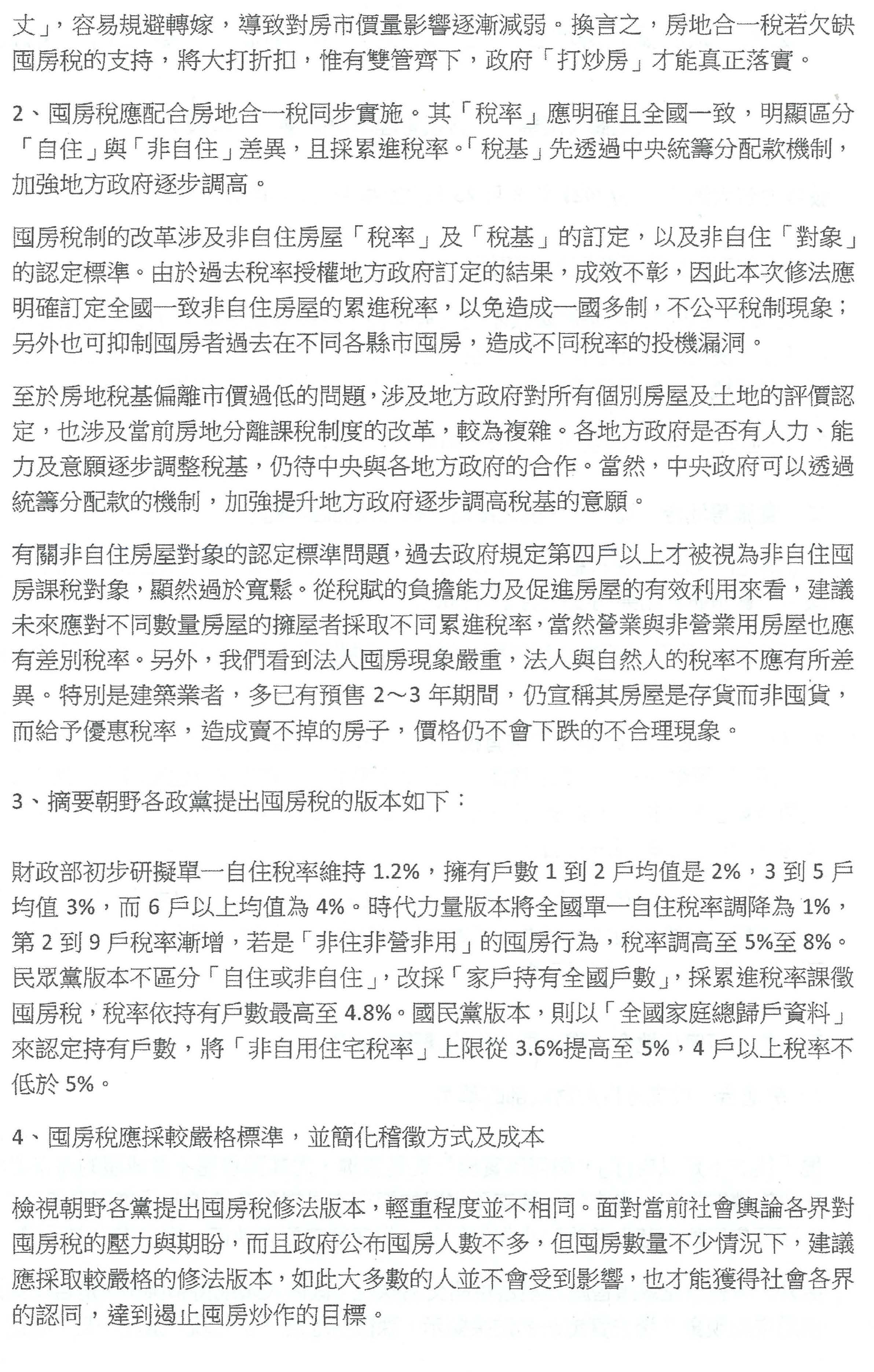 最後,我個人的意見、我們國民黨的意見是希望房地合一稅能夠溯及既往,囤房稅能夠立即推動,但是實施日期可以授權行政機關訂定。基本上,我們初步的想法是這樣。