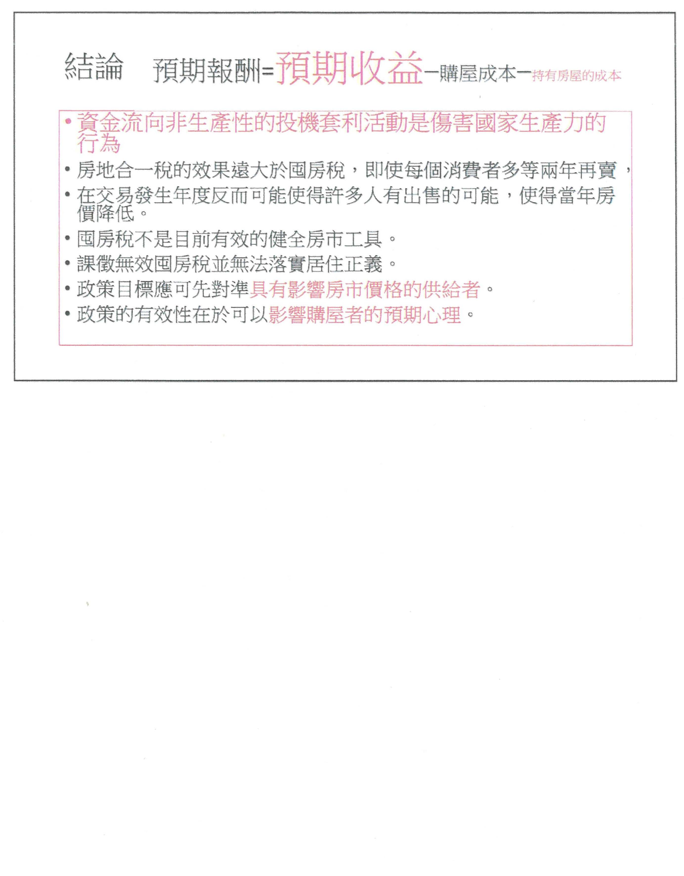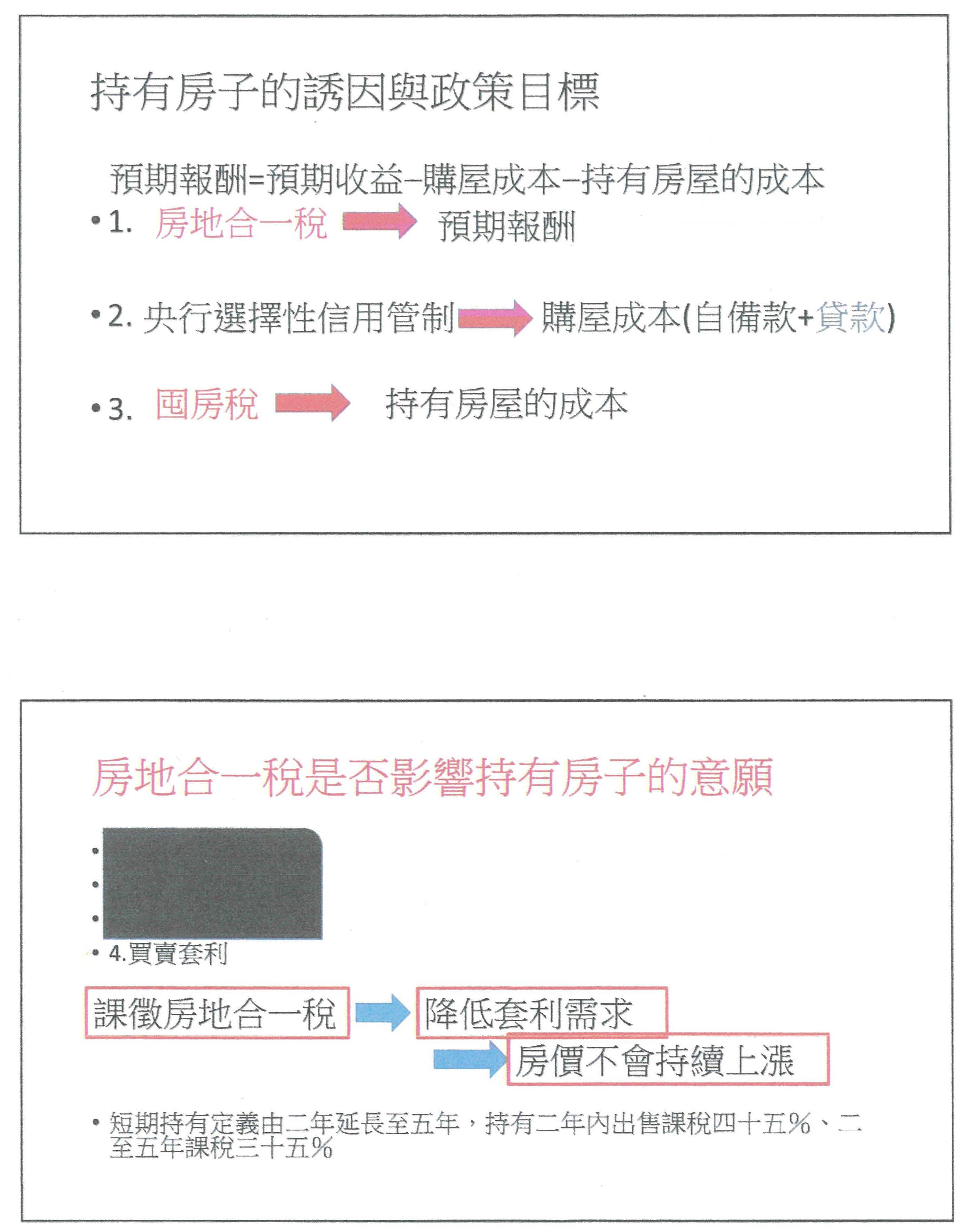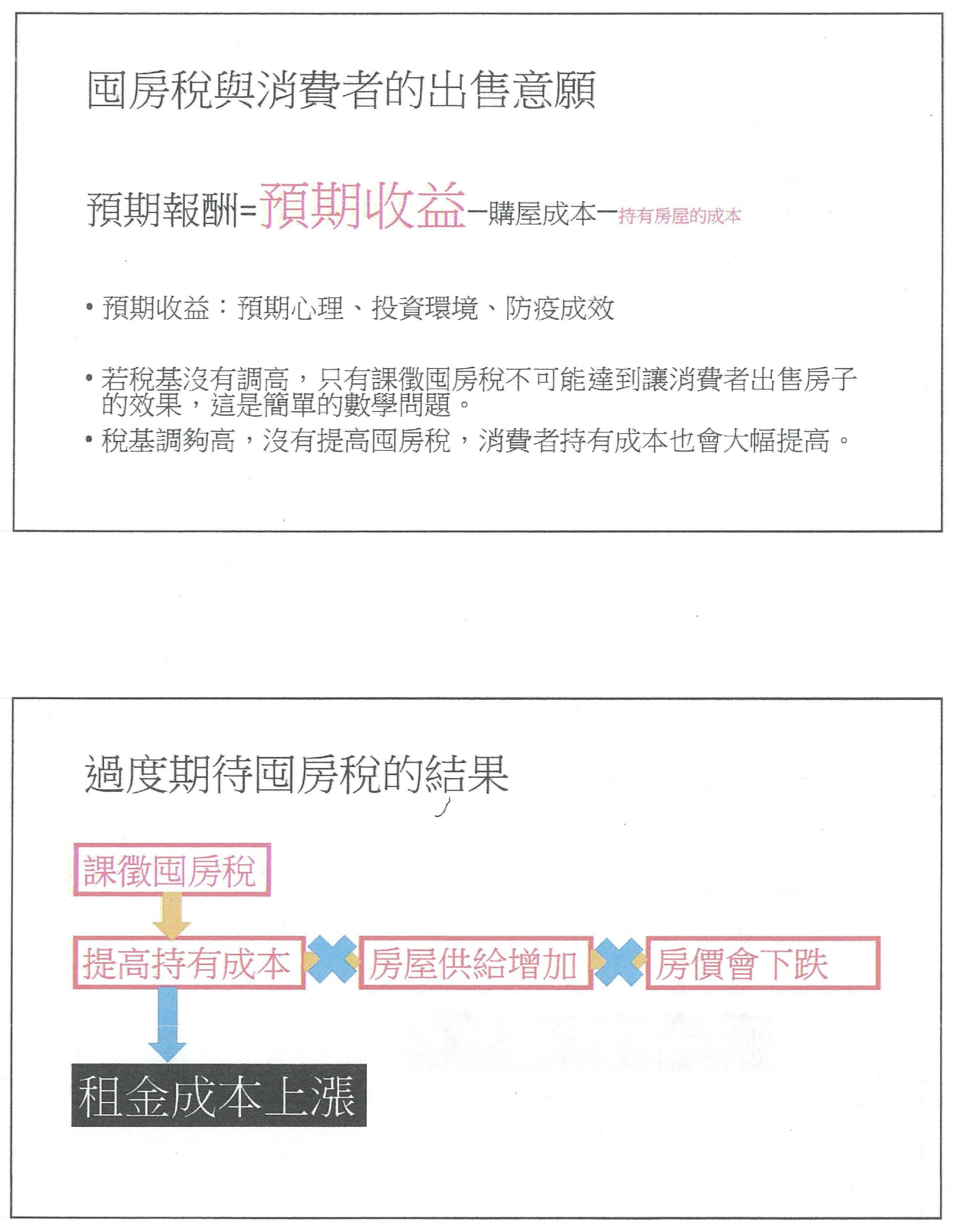 第一個、持有房子的誘因就是一條式子:預期報酬等於預期收益扣掉購屋成本及持有房屋的成本。房地合一稅當然會影響預期報酬;如果講到央行的信用管制,剛剛主席也有提到,就是購屋成本裡面的貸款,自己要出多少當然就會影響購屋成本;最後一個是大家都非常重視的,囤房稅會影響持有房屋的成本。我想這些基本不變的道理,其實都不需要有太多的辯證,房地合一稅是不是會影響到房子持有的意願,我就一個一個來講,第一個,居住會不會受到房地合一稅的影響?我就是要居住,當然不會;第二個,留給下一代會不會受影響?我如果真的要留給下一代,我就不會去交易,所以也不會受影響;第三個,固定收益呢?我就收的不錯、租金很固定,我為什麼要去做交易呢?所以這些都不會被影響,它影響到的是什麼?買賣套利,這個不就是我們實施所謂的健全房市政策所希望的嗎?所以課徵房地合一稅,其實是可以降低套利的需求,房價就不會持續上漲,我想這是第一件可以先想的部分。