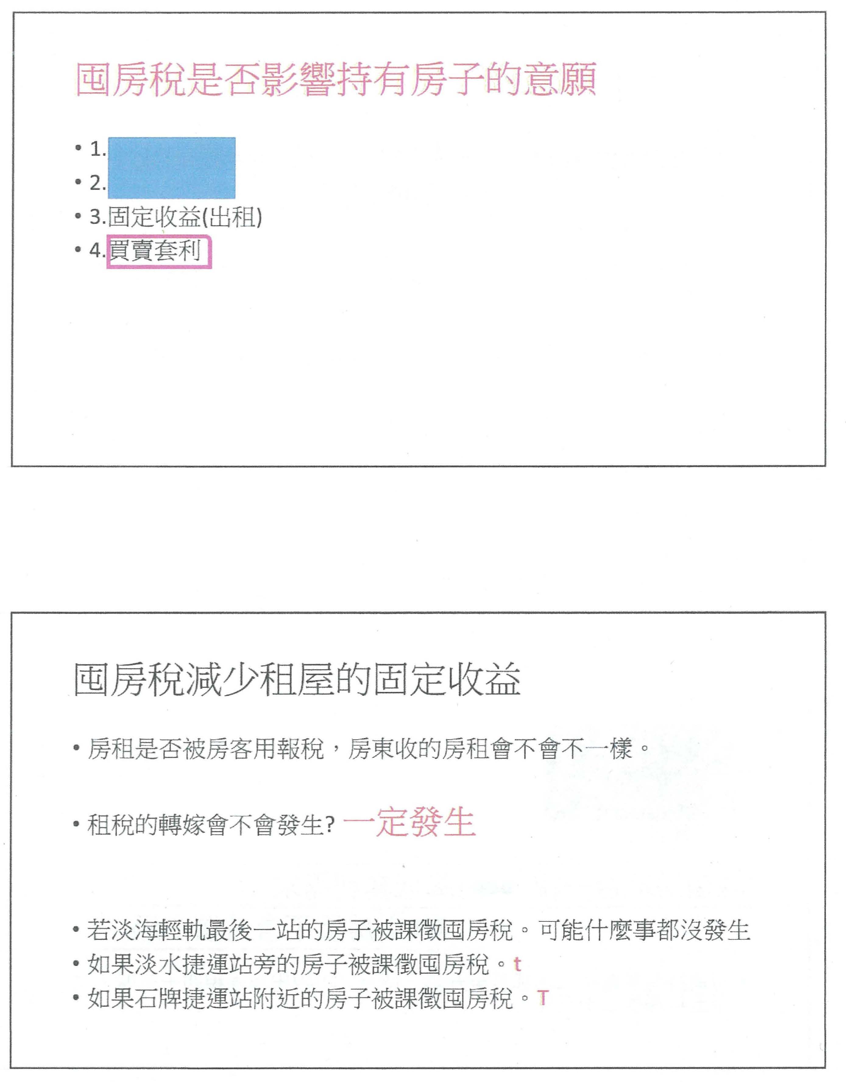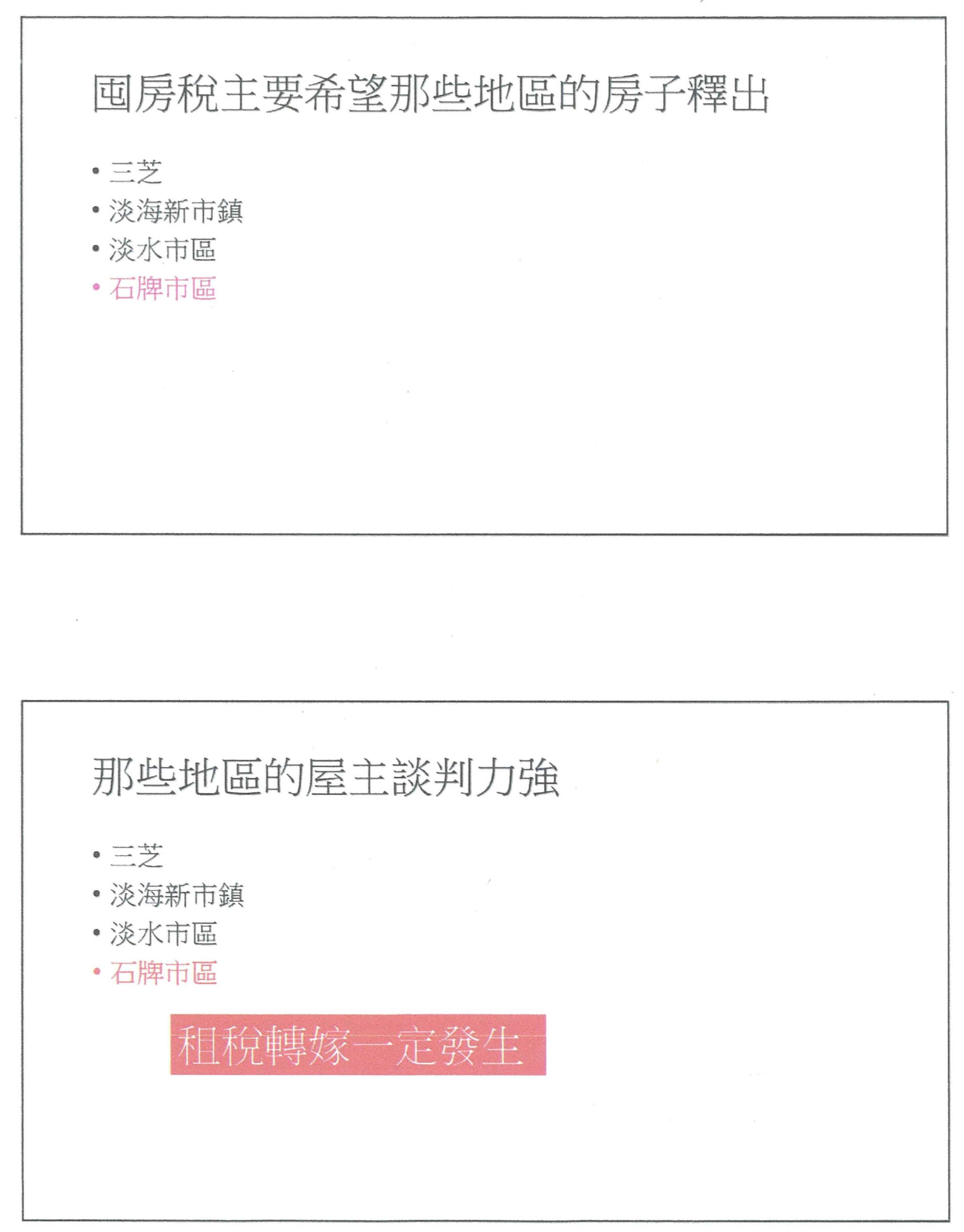 因此,如果課囤房稅以後,轉嫁會不會發生?百分之百肯定一定會發生,哪些地方不會發生?可能就是剛剛前一位老師所講的很偏僻的地方。因為我個人來自於淡江大學,順便跟大家宣傳一下整個淡水區域,第一個,如果你坐淡海輕軌到第一站,你在那邊課囤房稅,真的什麼事都不會發生,因為那邊也沒有太多人有囤屋的需求;第二個,你坐近一點到淡水捷運站,課囤房稅以後,我用一個小t表示,就是應該會有一點租稅轉嫁效果;第三個,坐到石牌捷運站,大家都知道榮總、振興醫院都在那裡,會不會有囤房稅的效果?當然會有囤房稅的效果,是會轉嫁的效果,因為那邊住的人很多、需求多,房屋就這麼多,除非老舊社區有一些都更,釋放出大量的房子出來,不然現場既有的大家都需要,當然就會受到影響。