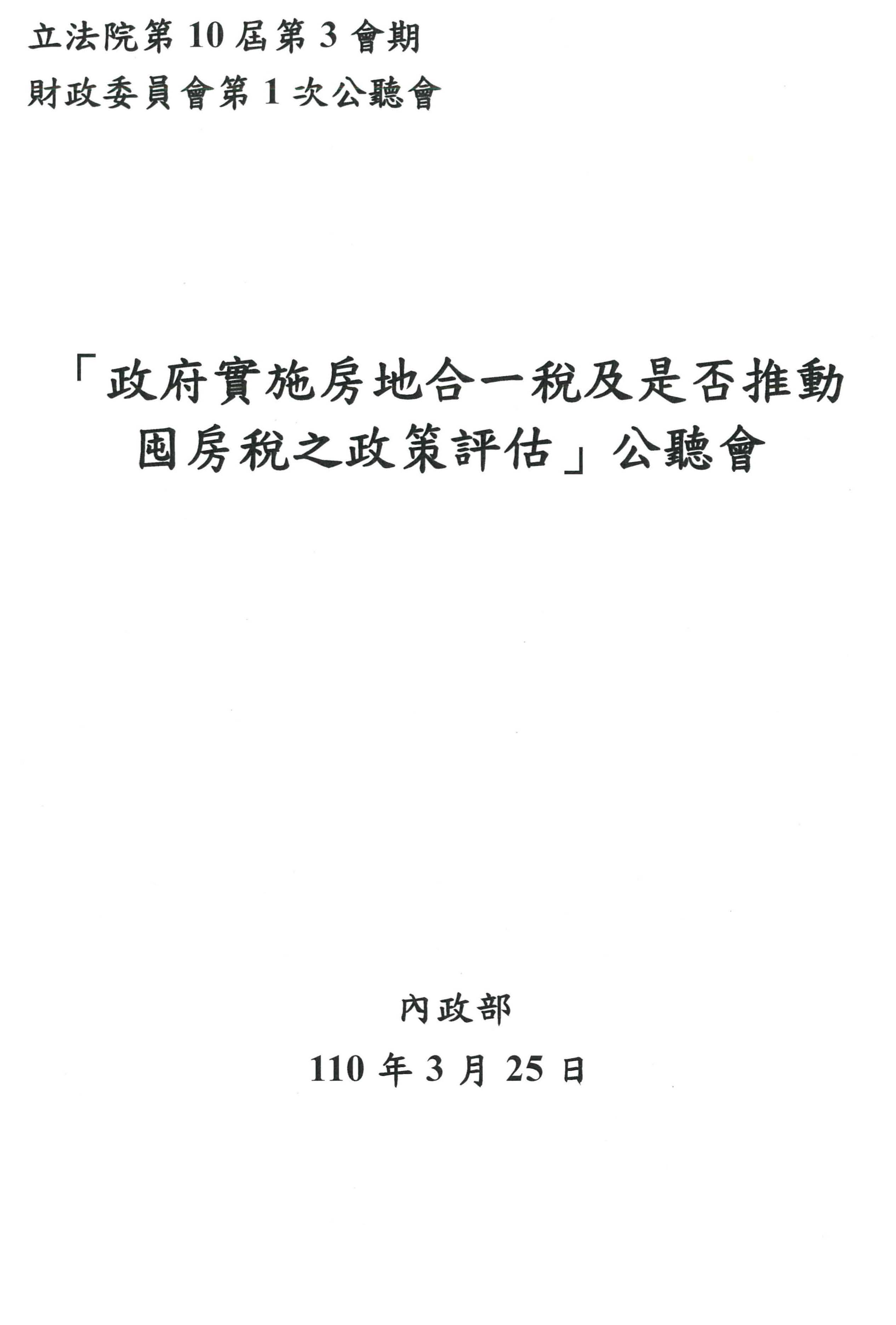 立法院第10屆第3會期財政委員會第1次公聽會舉辦「政府實施房地合一稅及是否推動囤房稅之政策評估」公聽會會議紀錄