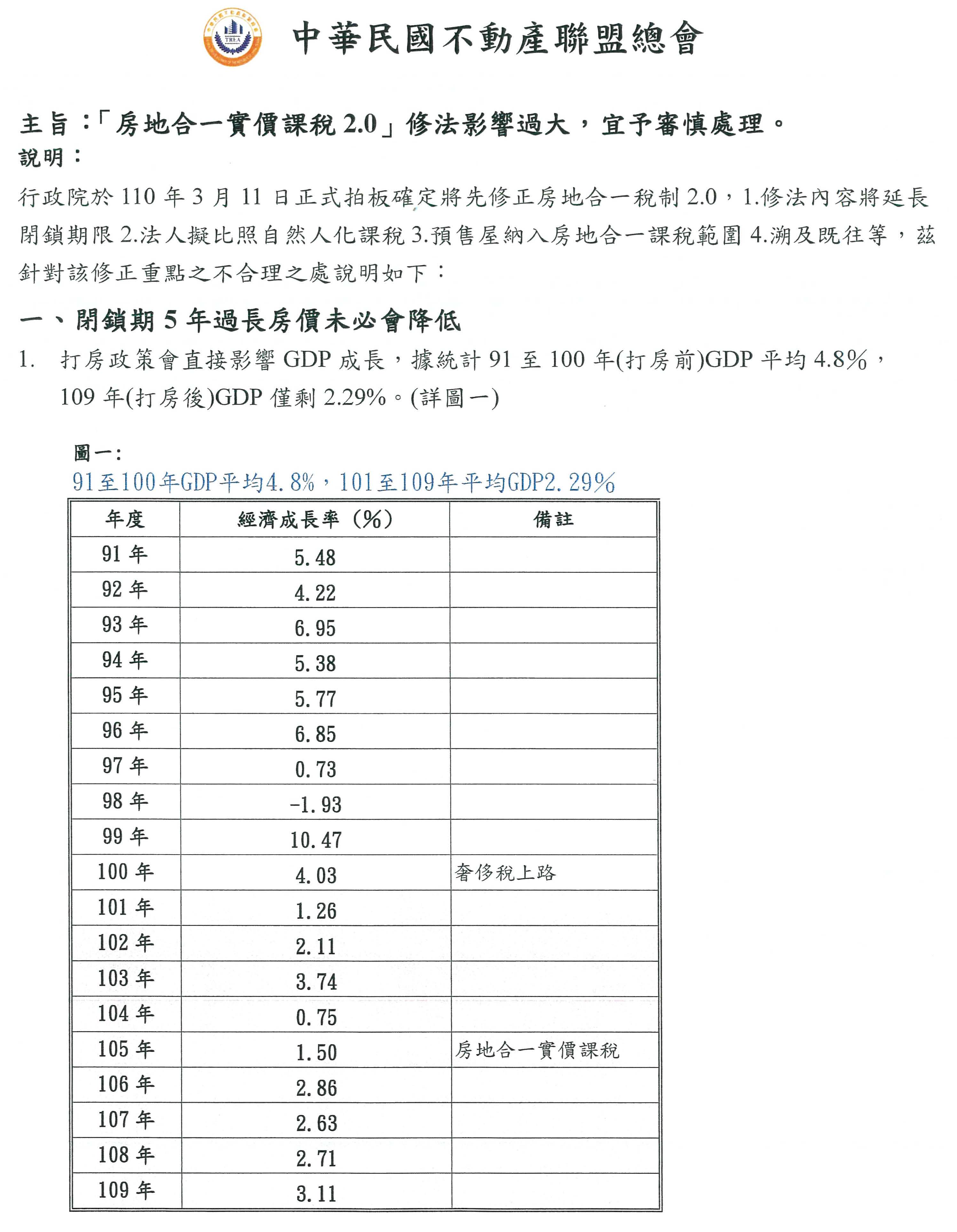 對於房地合一實價課稅的部分,我個人覺得閉鎖期太長,閉鎖期太長會影響我們的GDP。奢侈稅是從100年開始實施,100年之前臺灣的GDP平均4.8%,打房後臺灣的GDP已經被搞成平均百分之二點幾。百工百業那麼認真,GDP為什麼被搞成百分之二點幾?這個我們非常非常不贊成。第二個,現在平均年移轉棟數是三十幾萬棟,奢侈稅開始實施的隔年(106年)是28年來最低的移轉棟數,是24.5萬棟,民國85年的時候,最高移轉棟數是50萬棟,這樣對臺灣經濟成長的傷害不大嗎?我們預估如果閉鎖五年,年輕人再也買不到好的房子,因為要賣的人都有45%的重稅,所以他們沒有辦法買到房子。我們預估這個法案通過後,閉鎖期過長,全國的移轉棟數應該會急凍到18萬棟,這是第二個。