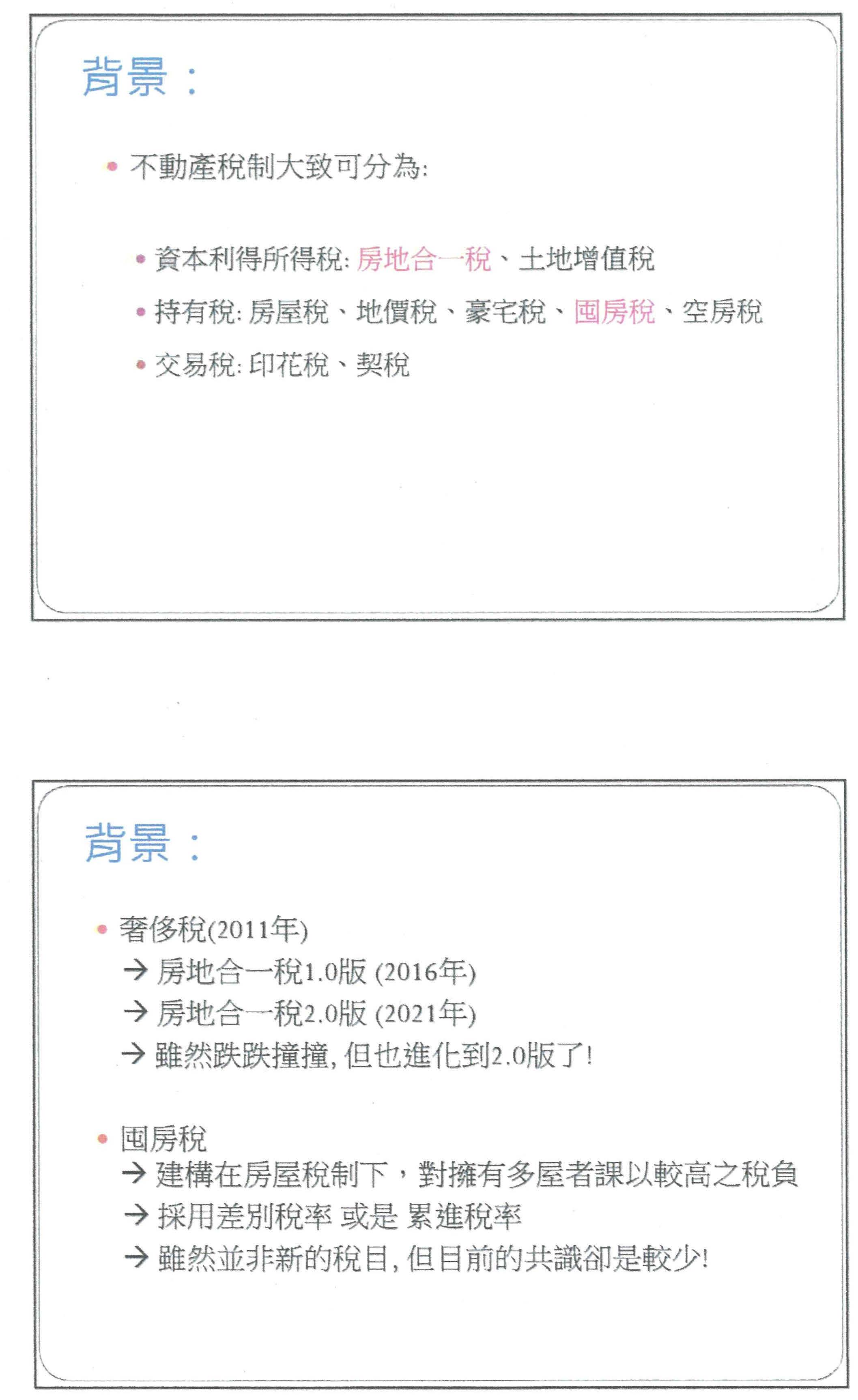 在那麼多的租稅當中,我必須要強調的是,不同的租稅有不同的政策目的和它必須要達成的手段,我們知道房地合一稅是特別針對資本利得去做處理,而囤房稅或房屋稅就是在持有期間,我們增加他的持有成本,也因為這樣的關係,其實從過去稅改的經驗,在民國100年的時候,我們有奢侈稅,奢侈稅剛開始是把房屋跟土地列在其中,不過從租稅理論來說,奢侈稅是一個消費稅的性質,我們利用消費稅性質的一個工具,但是卻要達成我們希望達到資本利益所謂所得稅的目的,當然就衍生了很多的問題。所以在105年,我們把它轉換成房地合一稅,現在也提出房地合一稅的2.0版,雖然這樣跌跌撞撞,不過大致上都朝著一個比較正確的方向做處理,從自然人到法人,或者是期間拉長、稅率提高等等。但是就囤房稅來說,它其實建置在目前的房屋稅之下所額外增加的,對多屋者可以課比較高的租稅,採取的是差別稅率,或者是我們期待的累進稅率,所以它雖然不是一個新的稅目,但是我們發覺它的共識確實是比較少一點,最主要是有幾個爭議,第一個,什麼叫做囤房?大家對於囤房數量的定義有不同的見解,不過我從租稅理論來說,如果是從財富稅的角度,因為他擁有多間房屋代表他能力比較高,那麼囤房稅不單單只是考慮數量,還要考慮面積和價格。如果是用消費稅的角度,他擁有太多的房屋可能造成所謂的外部吸引跟寓禁於徵,那麼我們可能就要考慮他的數量和面積。如果又回到奢侈稅的角度,當然價格是最主要的因素。所以它並不是很簡單就可以從單單的數量來定義囤房,即使用同樣的標準,財富稅、消費稅或者奢侈稅是不是要全國一致或因地制宜?5間在臺北市的房子跟5間在臺東的房子所代表的財富、消費、奢侈或者我們希望達到的目的,可能都不太一樣。