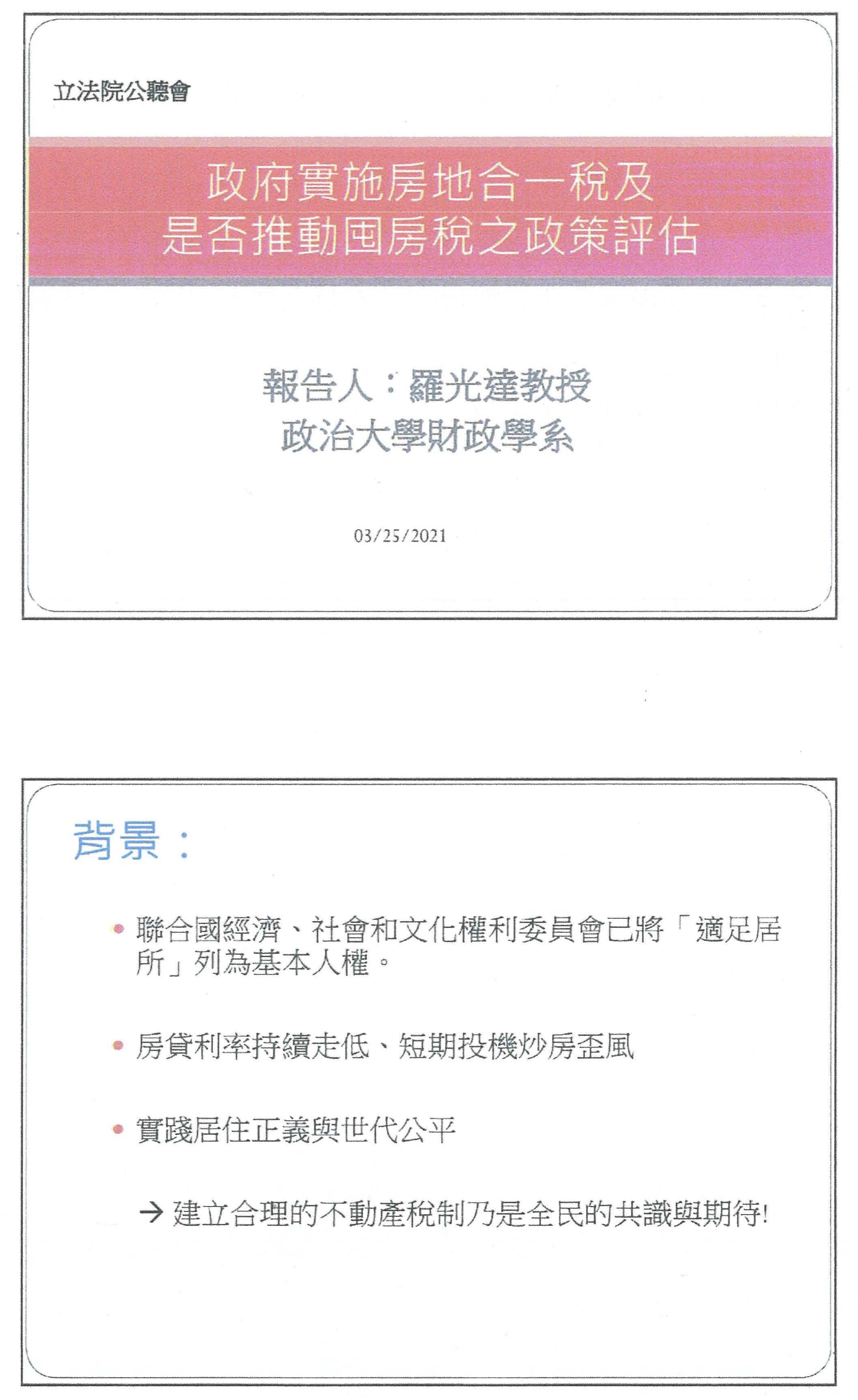 羅光達教授:主席、在座的各位代表,還有專家學者先進,大家好。我是政治大學地政系的羅光達,今天很高興有這個機會來這裡,針對這個議題提出自己的看法和分享自己的想法。其實居住正義或是房地合一稅制的問題,不論是在國際或是我們國內所面對的目前環境,民眾都有非常高的共識跟期待,特別是在聯合國,其實已經把居住權、糧食以及用水權當成一個基本的人權,所以身為政府,必須針對這三個基本的人權做出非常妥適的政策處理,就國內而言,其實我們長期處於一個比較低的房貸利率,再加上民眾對於這種短期投機炒房這樣的現象非常反感,所以建立一個合理的不動產稅制,其實是大家非常高的一個期待跟共識。也因為這樣的關係,其實我們在租稅上面的手段就有不同,不動產稅制大概可以分成三個面向,第一個是交易之後,如果有賺錢,特別針對資本利得來課稅,就像我們今天所要討論的房地合一稅或是土地的增值稅。當然,還有在持有期間所要課的租稅,譬如一般的房屋稅、地價稅,或是針對特別的房屋或特別的擁有者所課徵的豪宅稅、空屋稅,或者我們現在要討論的囤房稅。當然在交易的過程當中,增加交易成本的交易稅、印花稅或契稅。