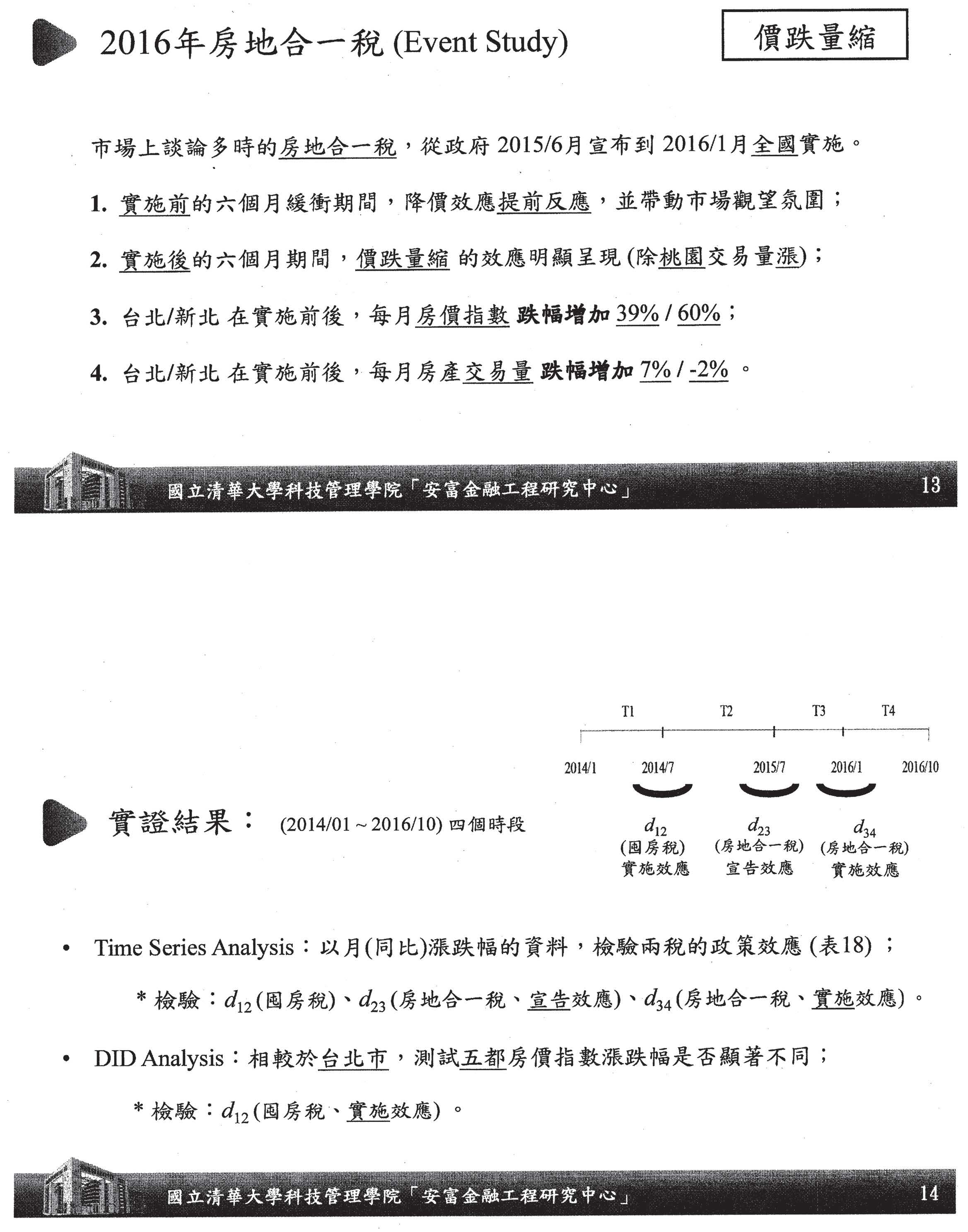 對房地合一稅我們同樣做了實證研究,發現前六個月跟後六個月到底成效如何?發現前六個月價格稍微緩下來了,可是到了實施六個月下來的幅度稍微多一點,可是並沒有那麼多,因為它有宣示效果,前一年時有宣示效果,後來會慢慢緩下來,越來越減少,減少的原因是什麼?因為實施之後,大家知道有後門條款,大家知道怎麼樣來避稅,很多人不會那麼聰明的,大家開始延到囤房稅去了,所以房地合一稅實施的結果是價格跟數量會慢慢、慢慢的減緩,反而沒有囤房稅,長期持有,根本跑不掉,這才是真正的關鍵,這個是有效的,所以你可以看到,房地合一稅的結果,實施前提前反映,實施六個月是有價跌量縮,可是價跌量縮是慢慢減緩下來,臺北、新北市都是如此。我們有針對不同階段,在實施前、實施後房地合一稅宣告效果之間的比較,做時間序列的研究分析我們看到房地合一稅的確有一些效果,可是宣告效果哪一個比較大,是在d23階段下。結論是根據實證研究,在各種狀況下,囤房稅跟房地合一稅當然有效,可是囤房稅是持續的,房地合一稅是提前宣示的效果。