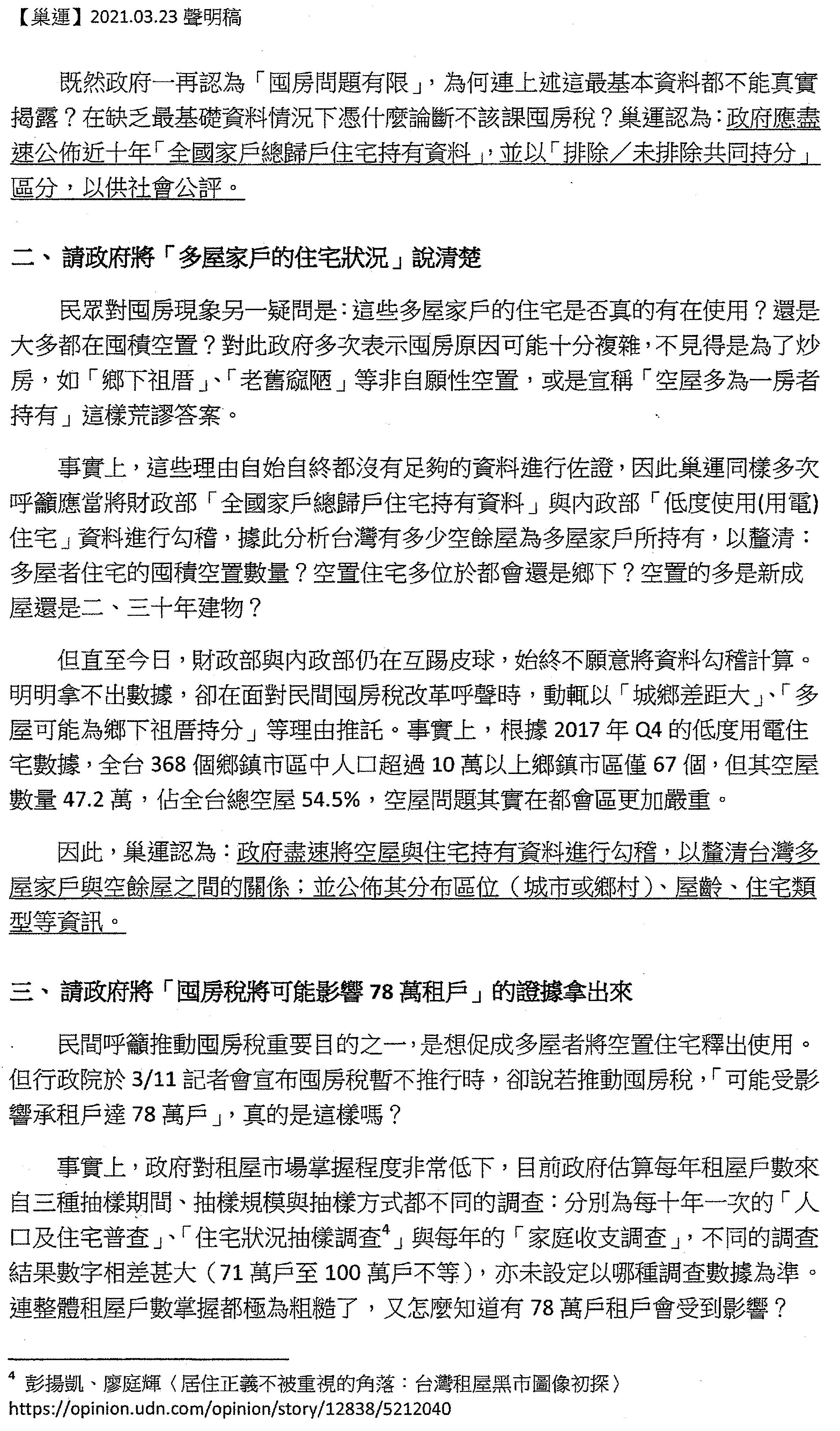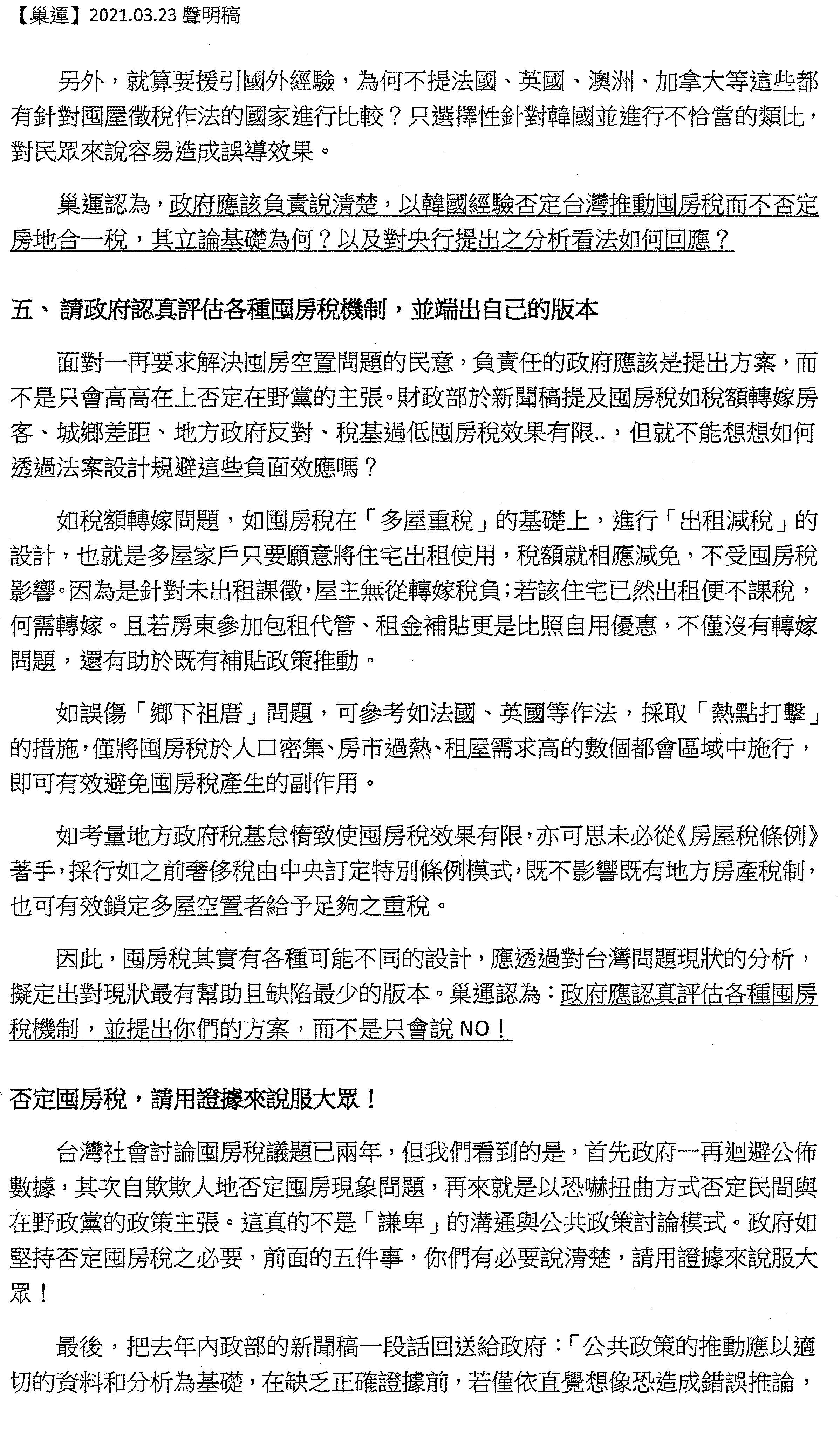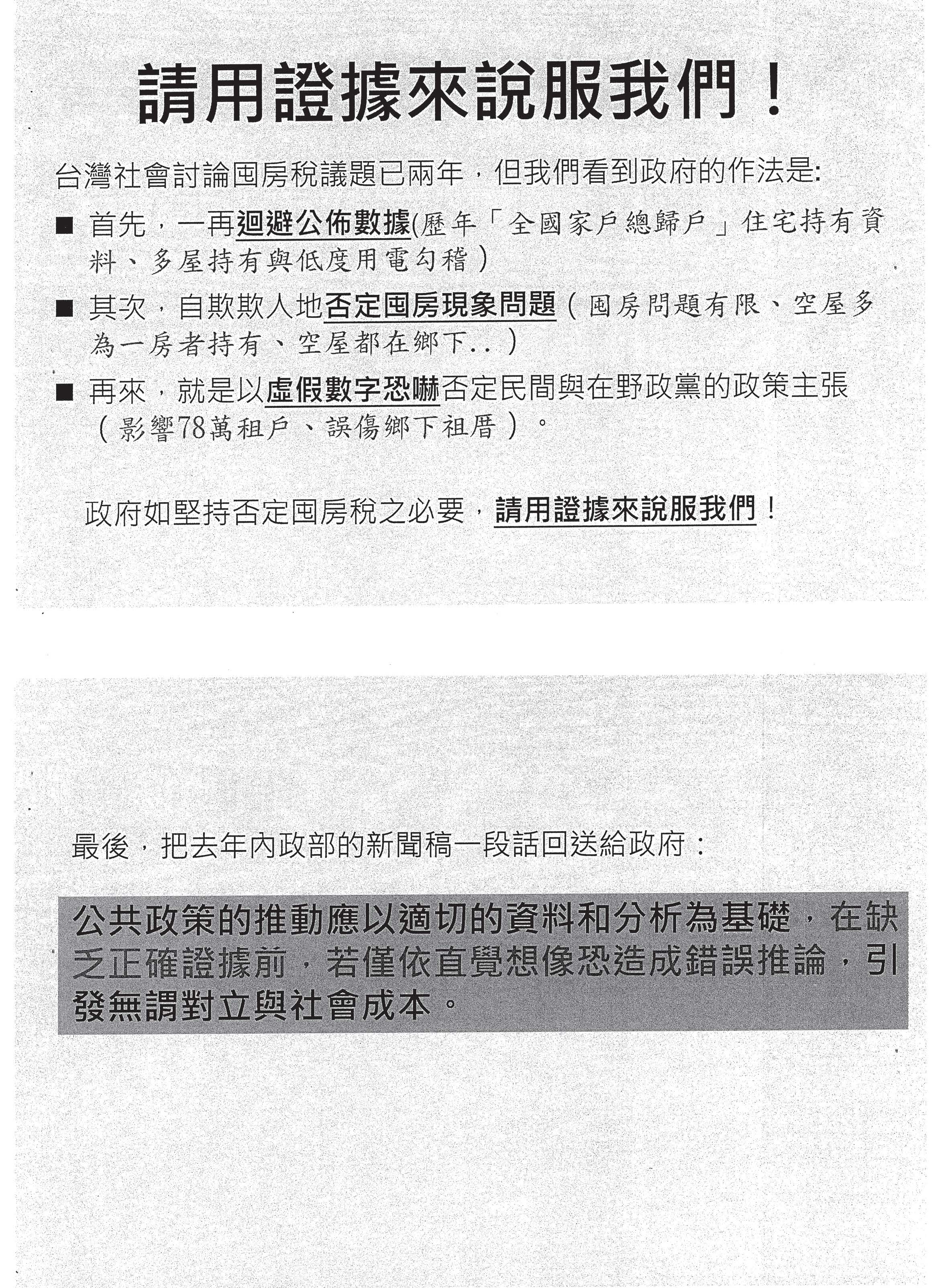 請用證據來說服我們!臺灣社會討論囤房稅的議題已經兩年了,可是我們看到的作法一向都是,首先,一再迴避公布數據(歷年「全國家戶總歸戶」住宅持有資料、多屋持有與低度用電勾稽),始終沒有公布,不斷迴避真實的狀況。其次,自欺欺人地否定囤房現象問題(囤房問題有限、空屋多為一房者持有、空屋都在鄉下),不斷否定問題,因為否定問題就不用再解決問題了。再來,就是以虛假數字恐嚇跟否定民間所提出來的主張(影響78萬租戶,有些鄉下祖厝很可憐、被誤傷到)。如果政府持續要用這樣子的態度討論公共事務,我們覺得這非常令人遺憾,如果真的堅持必須要否定囤房稅,請用證據說服我們!請用證據說服民間!
