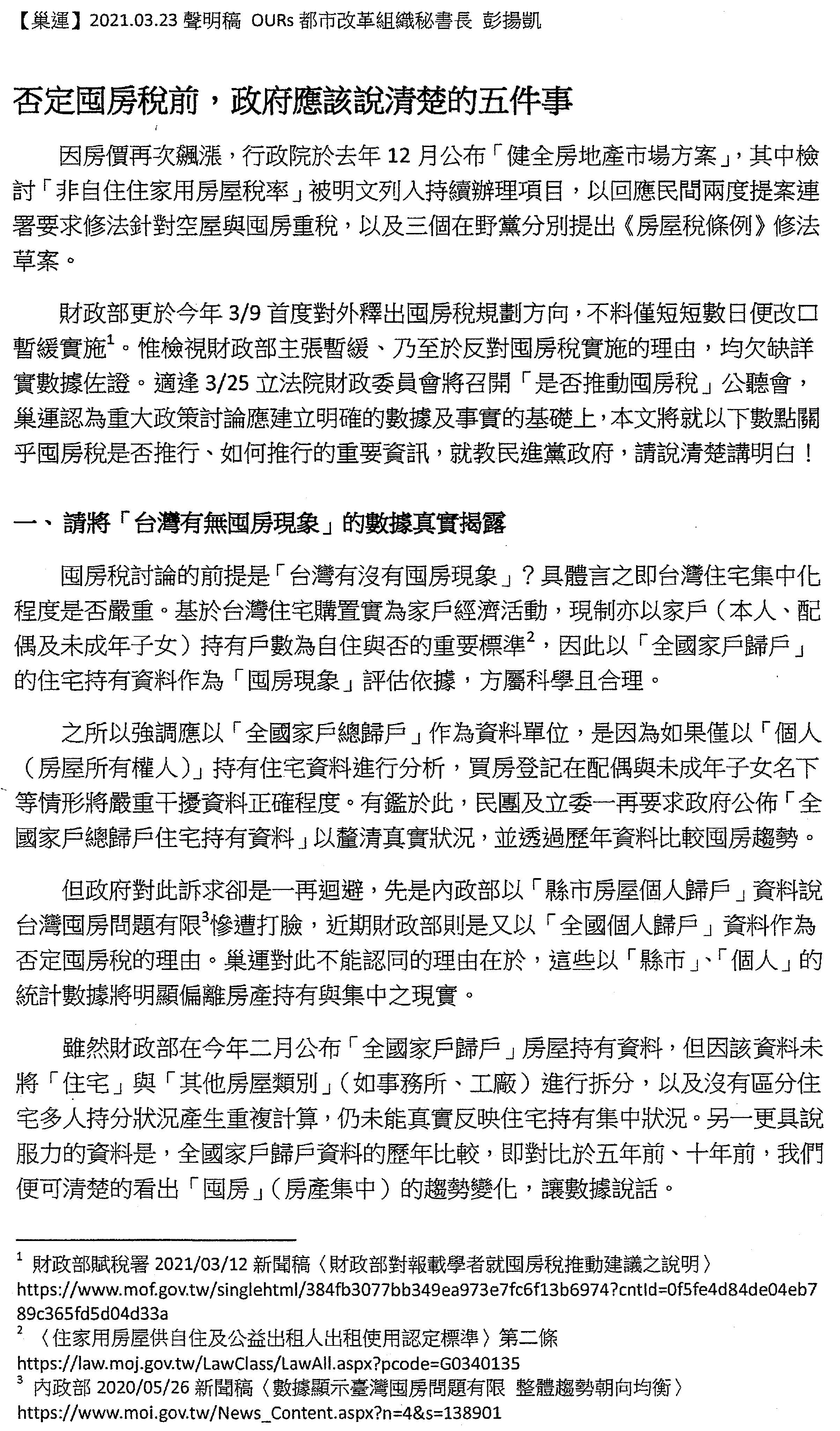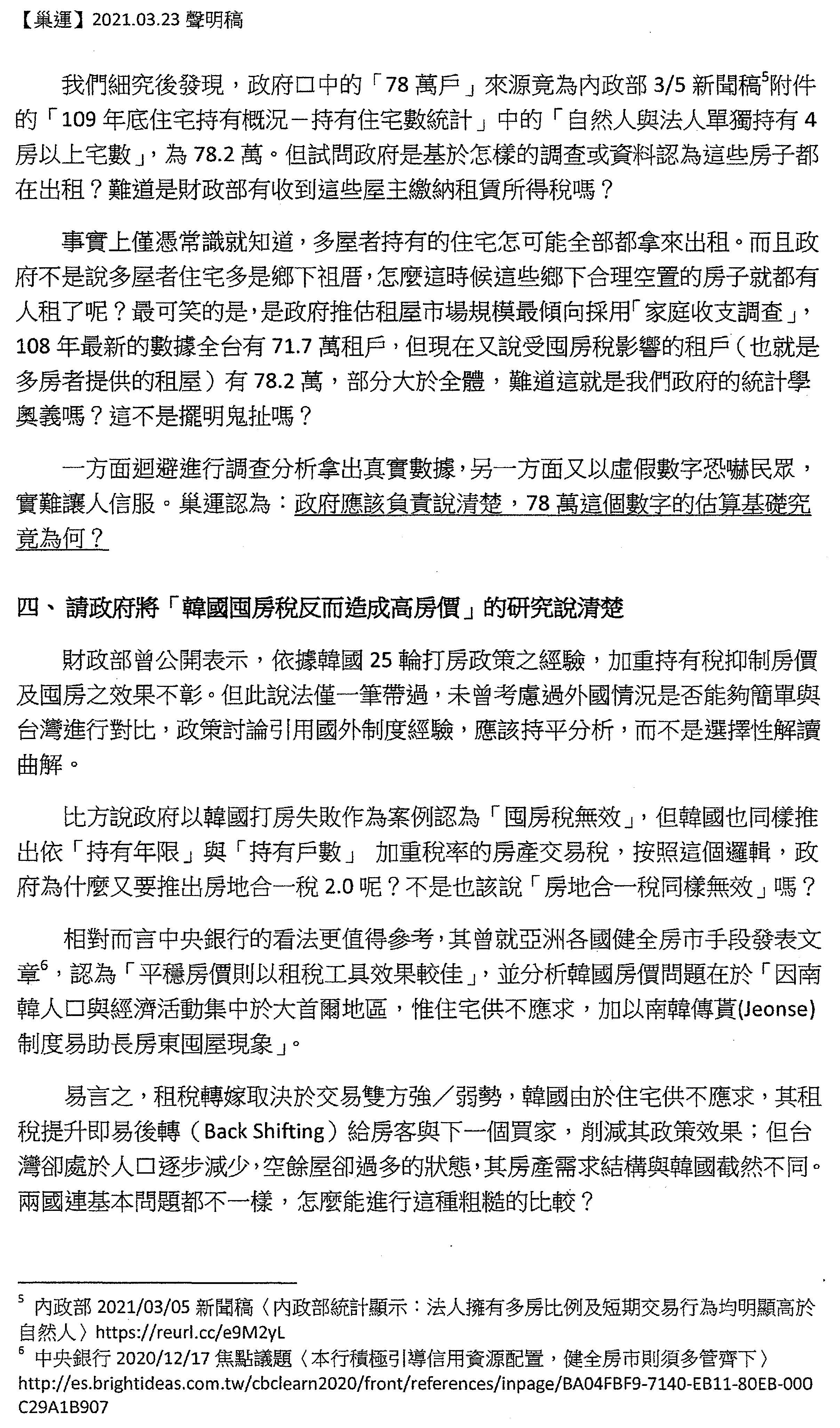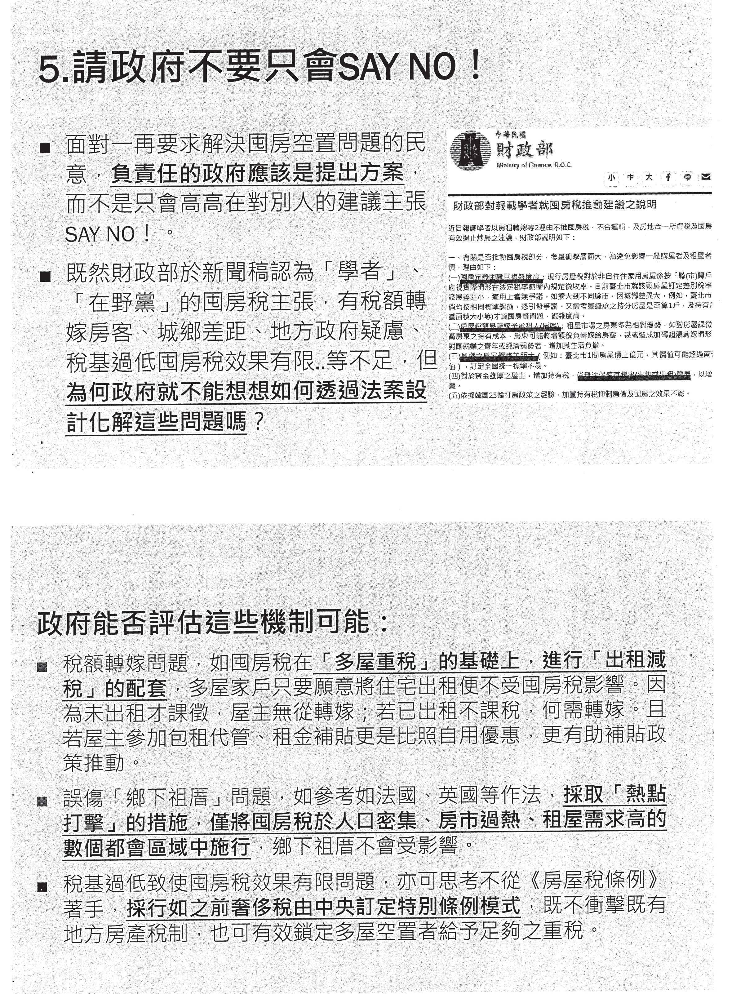請用證據來說服我們!臺灣社會討論囤房稅的議題已經兩年了,可是我們看到的作法一向都是,首先,一再迴避公布數據(歷年「全國家戶總歸戶」住宅持有資料、多屋持有與低度用電勾稽),始終沒有公布,不斷迴避真實的狀況。其次,自欺欺人地否定囤房現象問題(囤房問題有限、空屋多為一房者持有、空屋都在鄉下),不斷否定問題,因為否定問題就不用再解決問題了。再來,就是以虛假數字恐嚇跟否定民間所提出來的主張(影響78萬租戶,有些鄉下祖厝很可憐、被誤傷到)。如果政府持續要用這樣子的態度討論公共事務,我們覺得這非常令人遺憾,如果真的堅持必須要否定囤房稅,請用證據說服我們!請用證據說服民間!