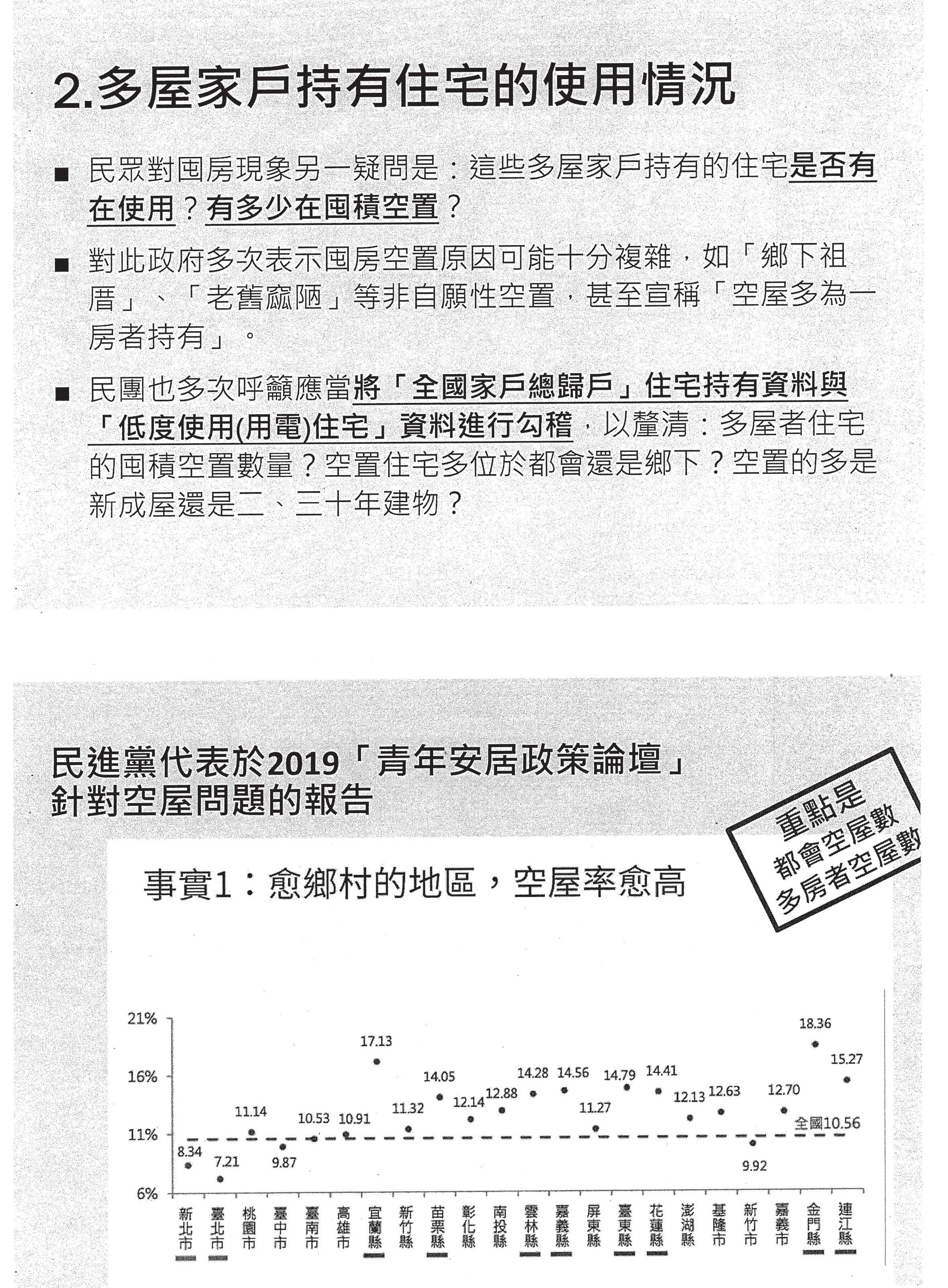 民進黨在2019年年底的時候來到我們舉辦的青年安居政策論壇,他們有說其實空屋都在鄉下,因為越鄉下空屋率越高,可是實際上對於這個議題,我們要看的是空屋數,因為鄉下的房子數量本來就少,你說一個只有一、兩千間房子的鄉下,它的空屋率很高其實沒有任何意義,重點是都市裡面的空屋數是不是過多。實際上按照這一個數據來看,其實空屋率雖然高的都是比較偏鄉村的地區,可是其實空屋數高的都是都市地區。另外一個就是內政部也說空屋都是一房者所有,當然就有一個最直接的反問,那這些人到底住在哪裡?他們都是從鄉下跑來臺北打拼租房子,是嗎?這就是缺乏家戶歸戶所造成的一個錯誤資訊。一直到現在財政部跟內政部一直都還在踢皮球,他們始終不願意把資料勾稽計算,我們問財政部的時候,財政部都說家戶是內政部的資料,去跟內政部講;我們問內政部的時候,內政部就說這些資料要財政部同意,我們不能隨便用,那到底什麼時候可以拿出正確的資料?我們要求政府儘速進行勾稽,並且公布這些資訊。