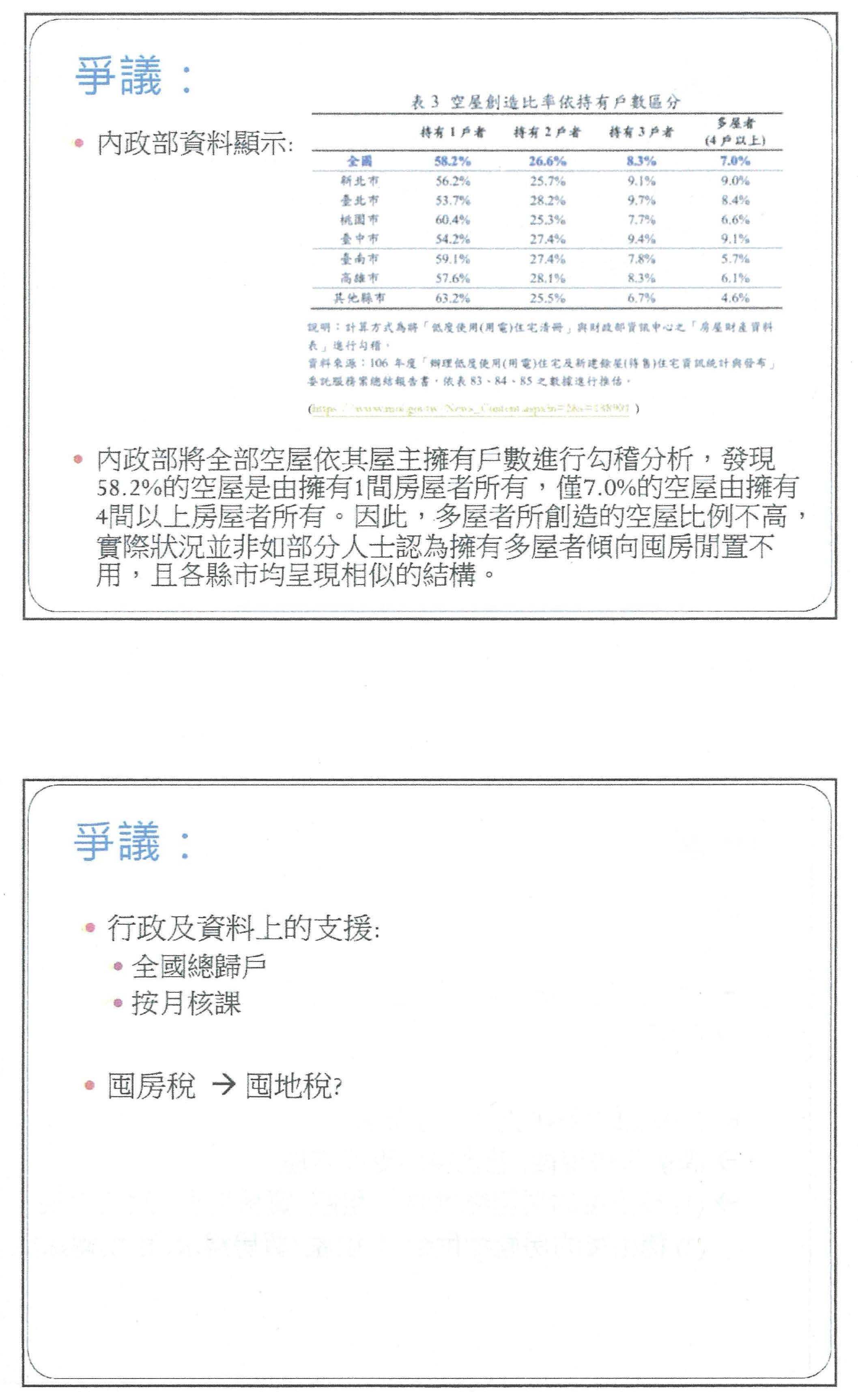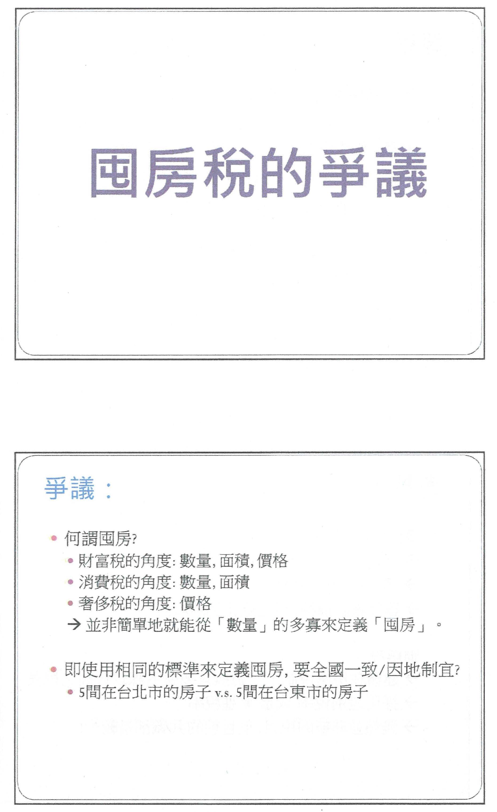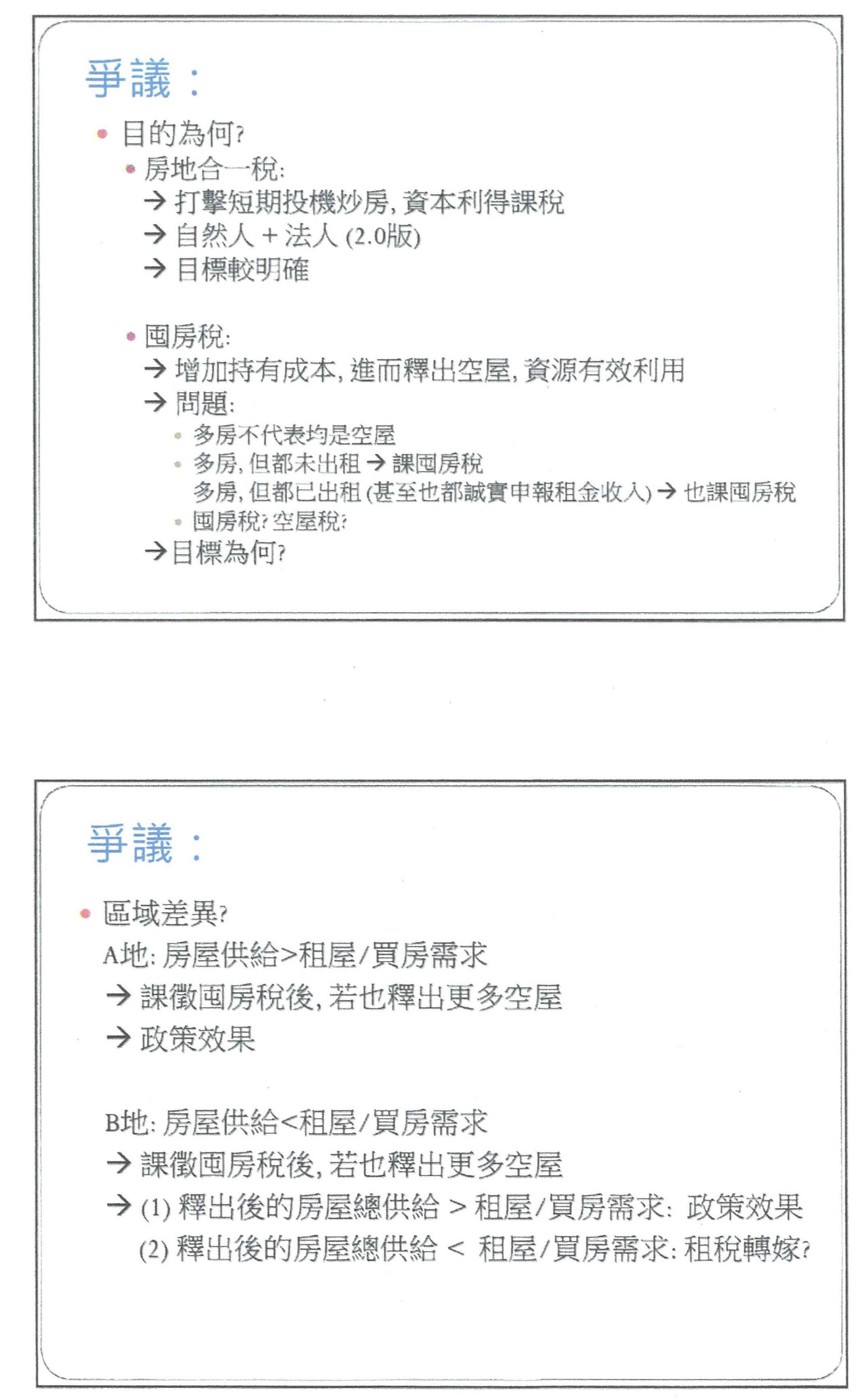 第二個爭議,我認為是目的為何?房地合一稅其實大家比較有共識,它就是在打擊短期投資炒房,所以它的目標明確。但是就囤房稅來說,如果按照我們的討論或意見,都是希望增加所謂的持有成本,經由釋出空屋,將資源做有效的利用。不過我要提出一個問題,擁有多房屋的人並不是代表他真的全部都把房屋空閒在那邊,例如我有多間房屋,但是我都沒有出租出去,那麼就是我們希望達到的一個政策目的,我們需要對這些人課稅。但是如果我擁有很多房子,我都妥善利用、出租出去,甚至也誠實申報租金收入,這些人是不是我們要打擊的對象?如果是,當然也要課囤房稅。所以對於囤房稅,我們的目的在於擁有多間房屋,還是我們希望釋出空閒的房屋,而變成所謂的空屋稅?所以針對這個目的,我覺得大家好像比較沒有很大的共識。