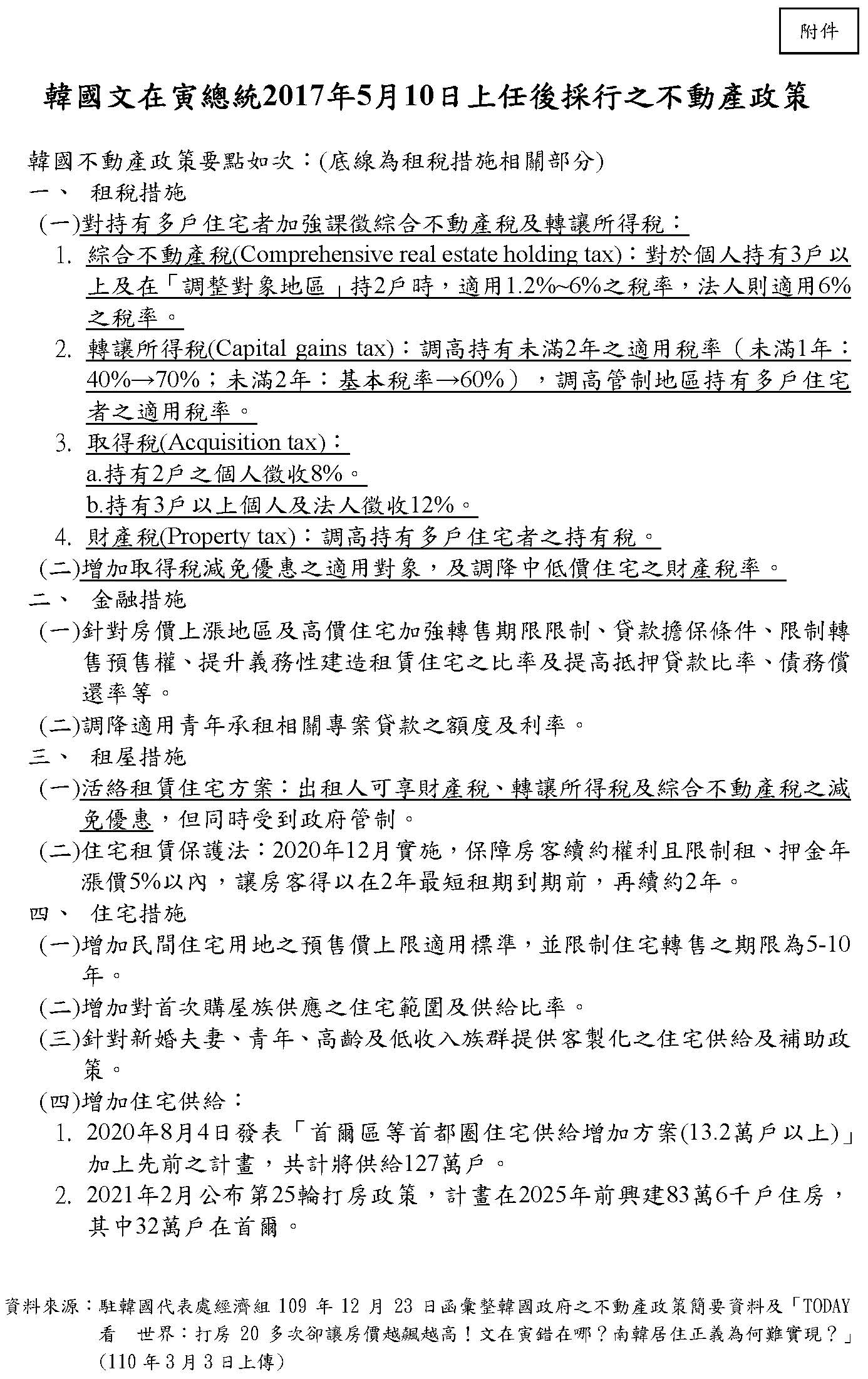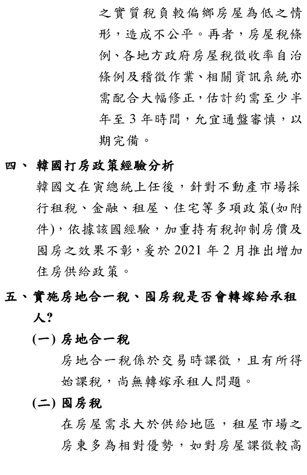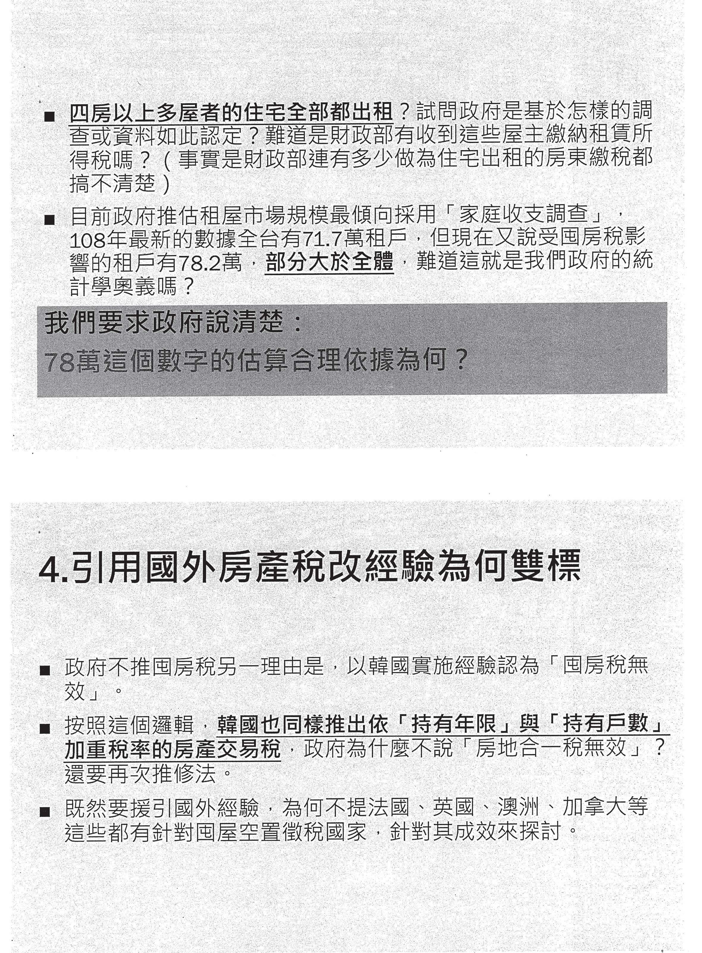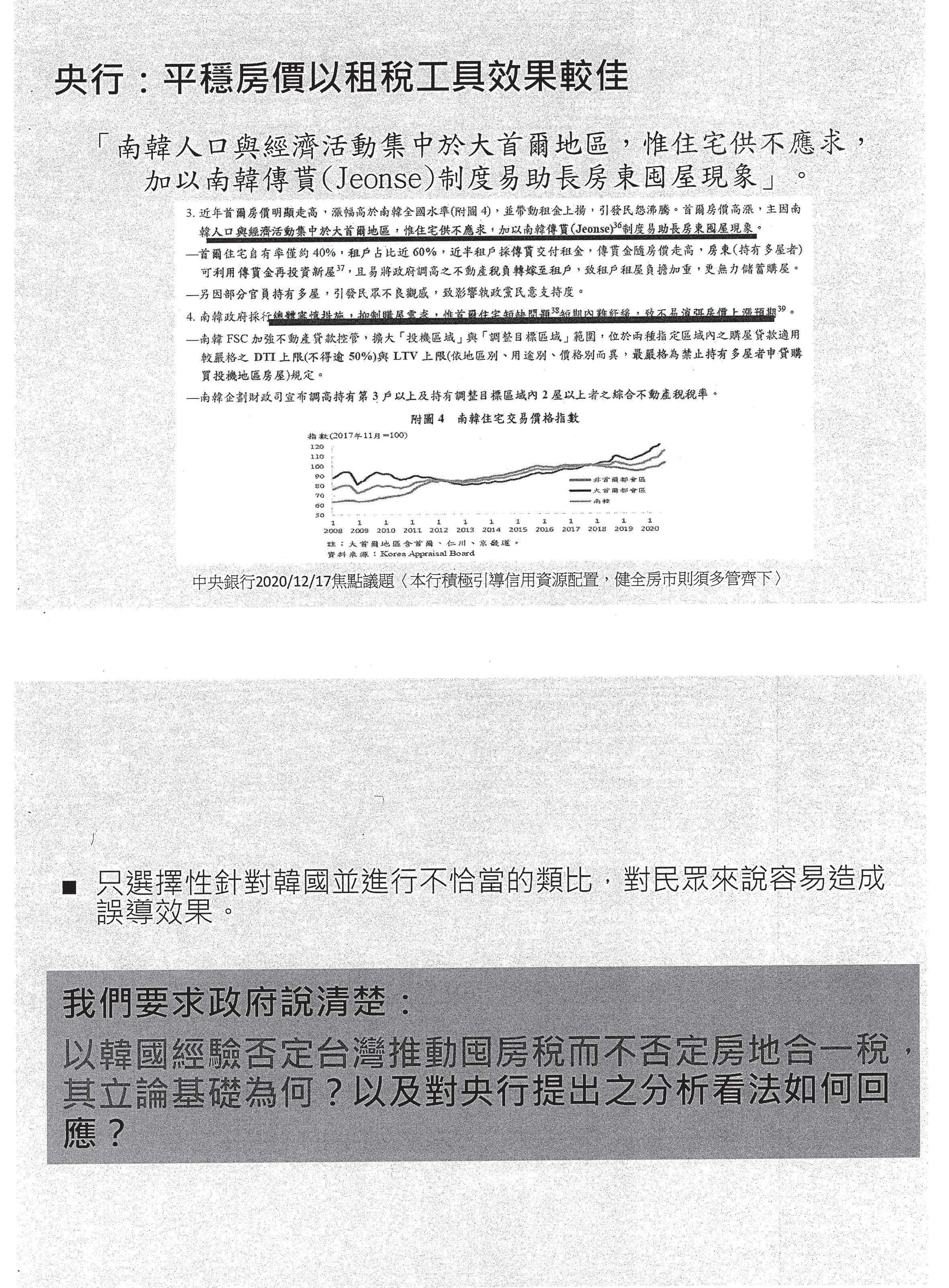 在這個部分我先回應一下財政部講說用韓國的例子,我只簡單講一件事情,大家如果真的去看韓國的打房,就會知道韓國除了實施囤房稅之外,他們也有實施持有年限很短的提高交易稅,所以韓國也做房地合一稅,韓國的央行也做限貸,就是買第二屋、第三屋的時候,會被壓縮房屋貸款的成數。如果用這個邏輯來說韓國無效,那為什麼財政部就覺得裡面只有囤房稅無效,韓國做房地合一稅的時候,他怎麼不覺得無效?韓國做限縮融資貸款成數的時候,為什麼不覺得無效?所以不能夠對一個經驗採片段性的解釋。事實上我覺得央行已經講得最清楚,央行在去年底的報告就很清楚,他指出一個最重要的關鍵是韓國,特別是首爾地區因為住宅供不應求,請大家記住住宅供不應求,請問這個現象是臺灣有的現象嗎?過去十年來臺灣的空屋跟餘屋不斷地增加,這是全世界一個很奇特現象,就是我們的高房價跟高空屋率,跟建商越賣餘屋越多的現象是同時存在的,所以我們不是一個所謂供不應求的現象,所以不要做這樣的比較。