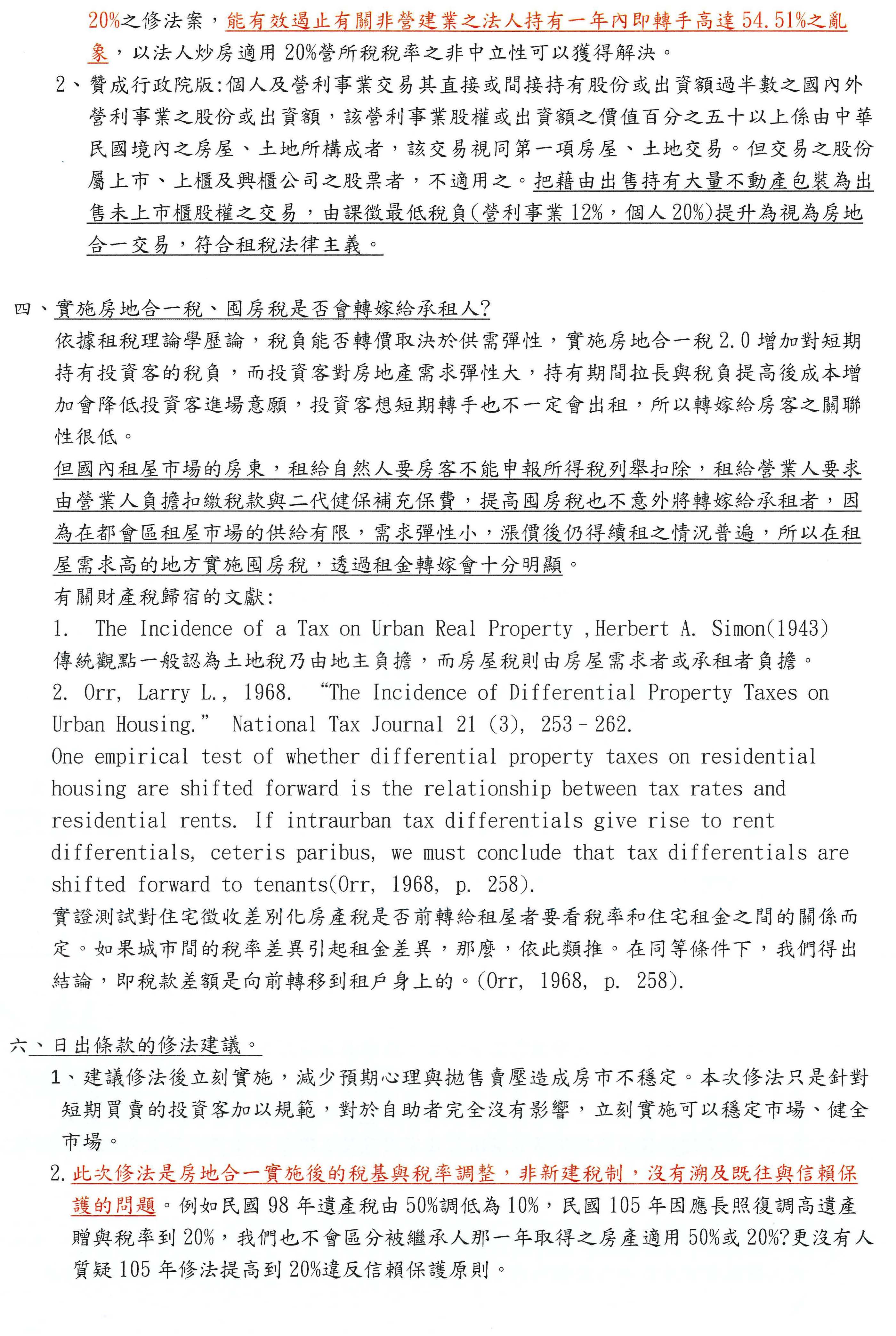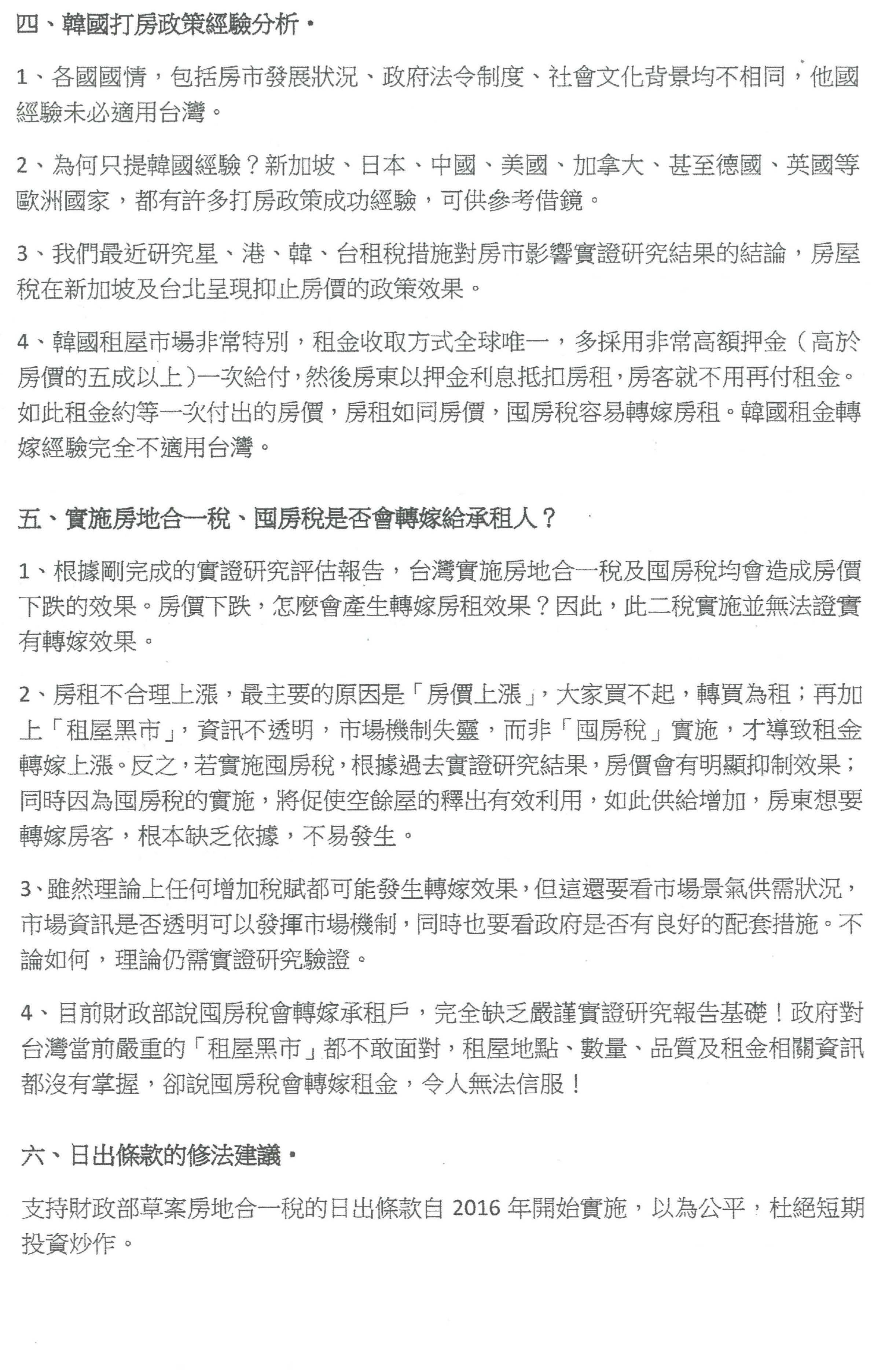 第四個、房地合一稅會不會被轉嫁?我們是用韓國的資料,我用的是囤房稅的資料,以本身來講,我們以前讀財政學租稅理論時,很多文獻、國外的文獻都會提到房屋的供給和需求部分,因為我們租屋者對房屋的需求比較沒有彈性,非租不可,所以房東有可能會轉嫁;我們臺灣的房東是包括扣繳稅款都要你負擔、補充保費也要你負擔,其實都轉嫁到房客身上,也不讓你去報稅;所以如果未來稅負真的提高了,沒有什麼配套的話,從國內外的一些角度來看,我相信轉嫁有可能會發生,雖然不一定是囤房的人,但是有房子的人就會有轉嫁的可能。