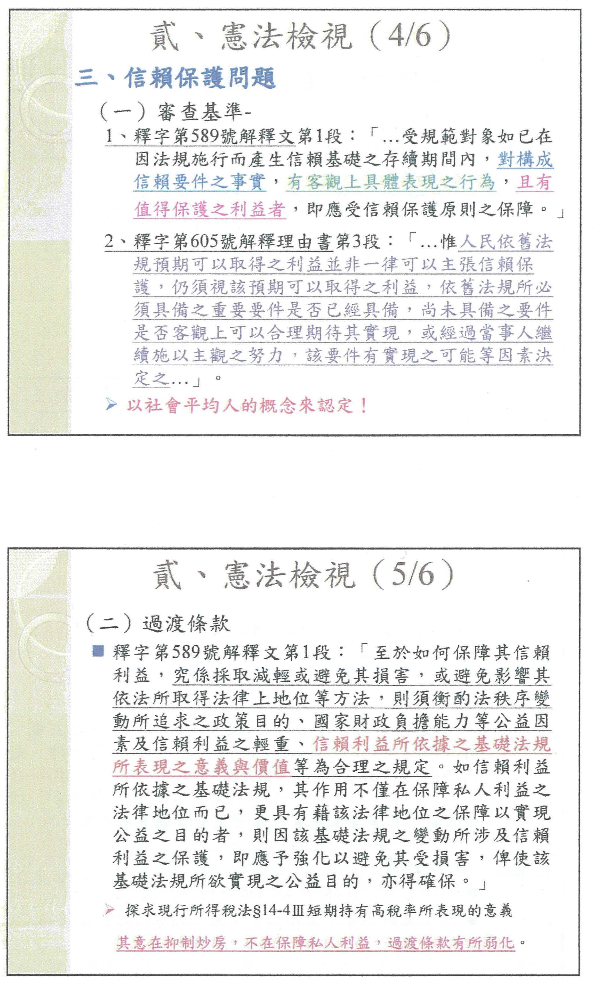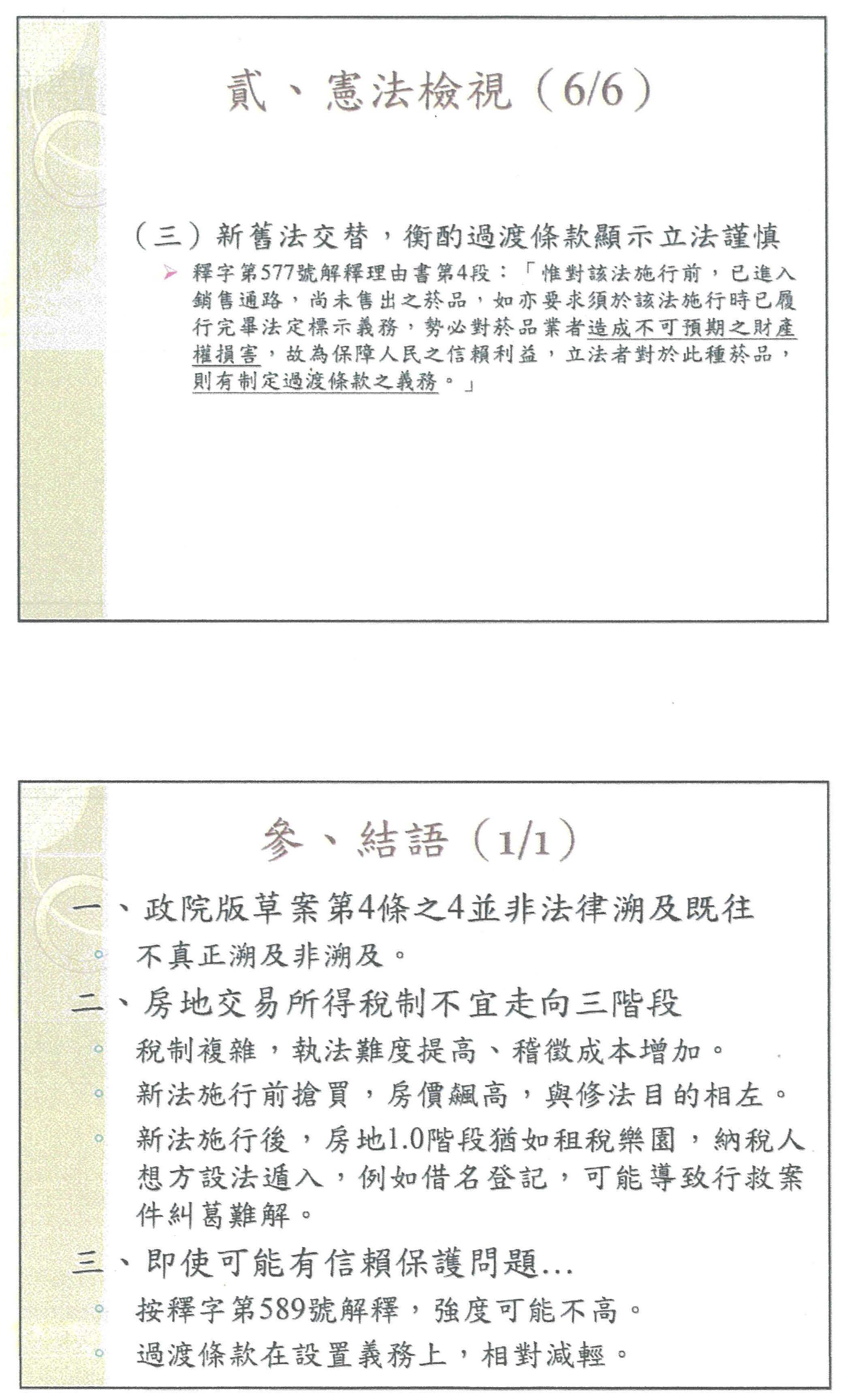 如果這樣,進一步可能衍生的是信賴保護的問題,不真正溯及的部分,其信賴保護其實是偏弱的,尤其不管是德國或者美國的文獻,租稅涉及財政經濟,其審查密度也是比較偏低的。在這樣的狀況下,關於信賴保護的問題,其審查的基準,歷來在大法官的解釋當中,也有非常多的釐清,其基本標準用在本案上,坦白說我覺得最能夠援用的大概是大法官第589號解釋,其中提到人民相信法律的規定,然後讓他有一些相對應的安排,他是否受到信賴保護的保障?這要解讀其所信賴的條文真正的立法目的、價值為何。所得稅法第十四條之四,關於短期持有課高稅率,它的目的,其實不是在保障個人的私益,而是防杜炒房,所以如果從條文來看,民眾在信賴保護上,應該是比較偏低,這樣的情況,如果縝密來講,可以考慮所謂過渡條款的問題,有關這個過渡條款,我覺得還可以再進一步思考,也許現在的條文在稅負上不會很好的原因,是因為條文是自105年1月1日起,說實在的,其真正的意義,反而是排除104年12月31日以前取得的,如果是這樣,可以減少一些稅負有關溯及既往問題。
