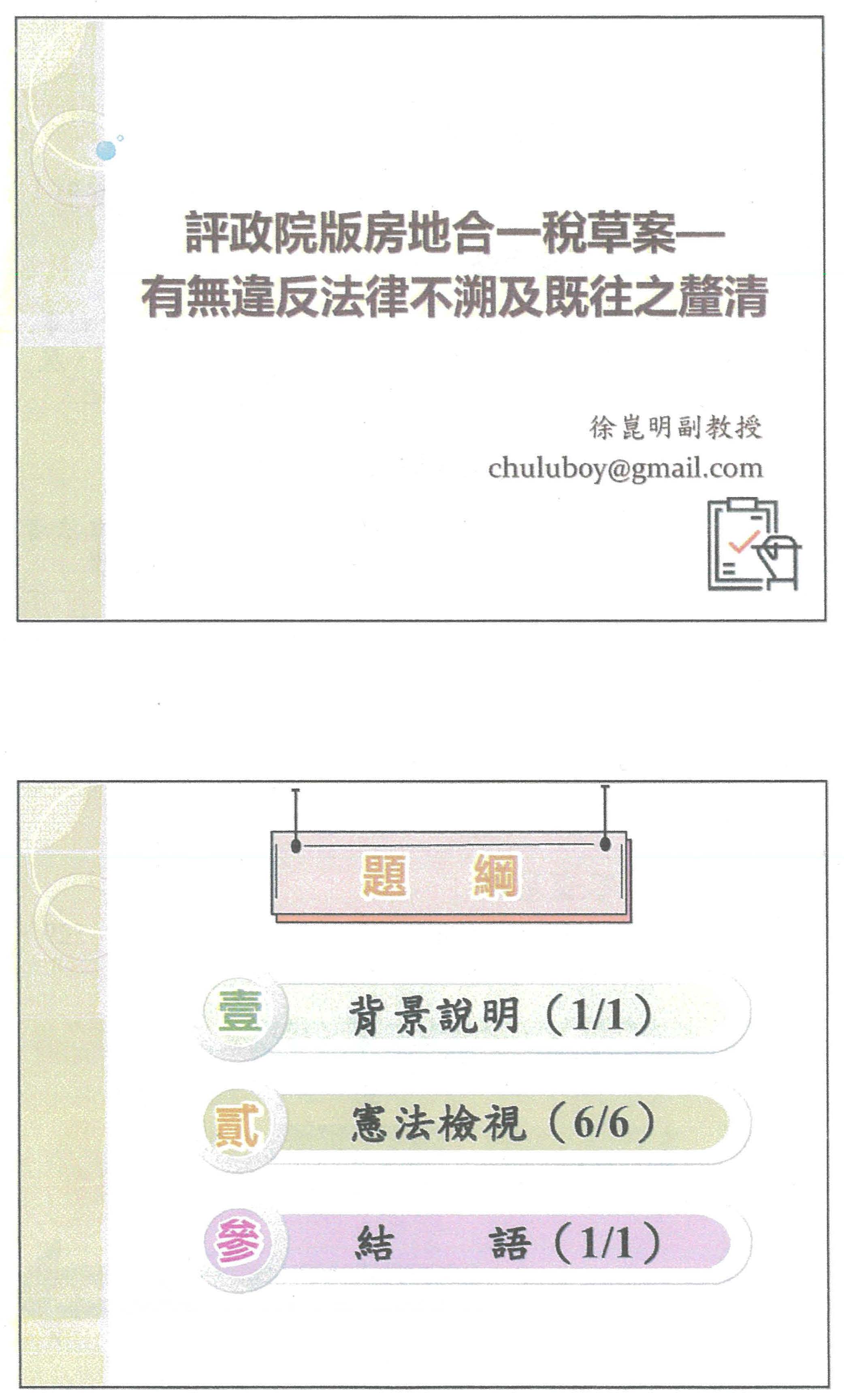 徐崑明教授:主席、各位委員,還有各位先進大家好,今天我針對房地2.0部分有一些個人看法,我有準備一個簡單的簡報,大家手上都有。首先在背景說明部分,其實我前陣子看到媒體上所呈現的政院版,標題直接就是說違反法律不溯及既往以及信賴保護原則,我個人看完這個媒體的報導之後,我就很有感,我覺得這應該是要在立法過程中被釐清的問題,一直到剛剛,主席的說明也都還是在談不溯及既往的概念,所以我就覺得這是在立法的過程當中,提前跟憲法對話的一個很好的時機。