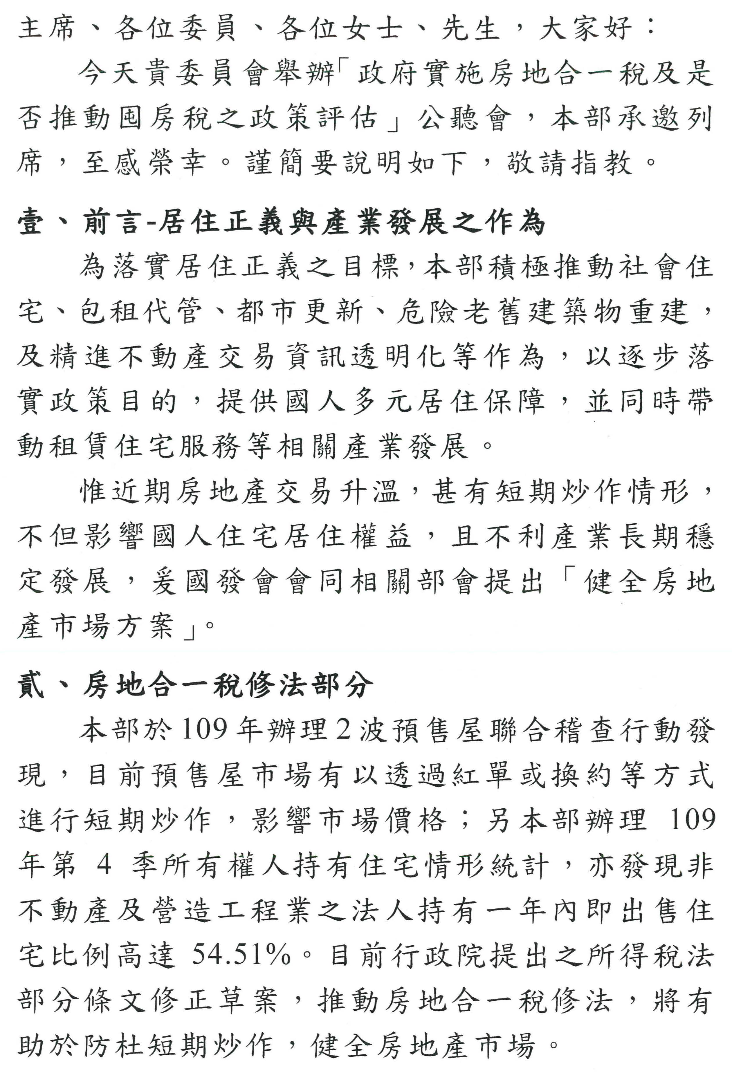 有關囤房稅或房地合一稅,目前我們看到政府提出一些方案或者是增加更多配套,也希望透過今天的公聽會,請大家具體提出一些改進措施。