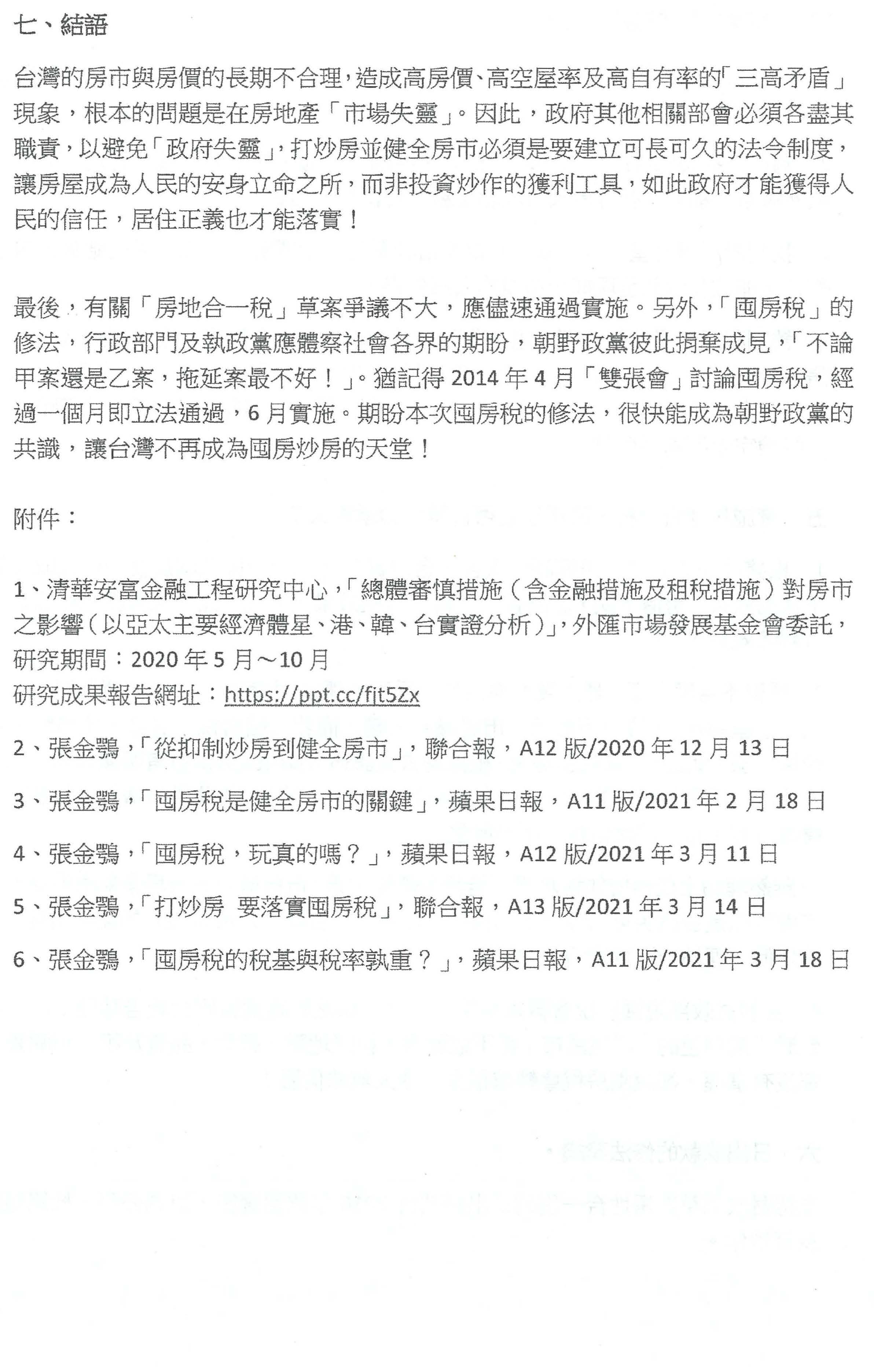 結論就是,就像之前央行祭出「第二波房市管制」措施,我們是肯定的。同樣的,我們希望財政部也跟上,房地合一稅沒有問題,我們全力支持。囤房稅其實也是可以做的,雖然可能需要多一些時間,但是我們繼續加油,把這些事情都做好。我想這真的是國人最大的期盼,歷次的民意調查,高房價幾乎都是民怨之首,我們一定要趁這次機會,既然朝野也有不錯的共識,我們覺得就是要極力地把它推動成功,謝謝大家。