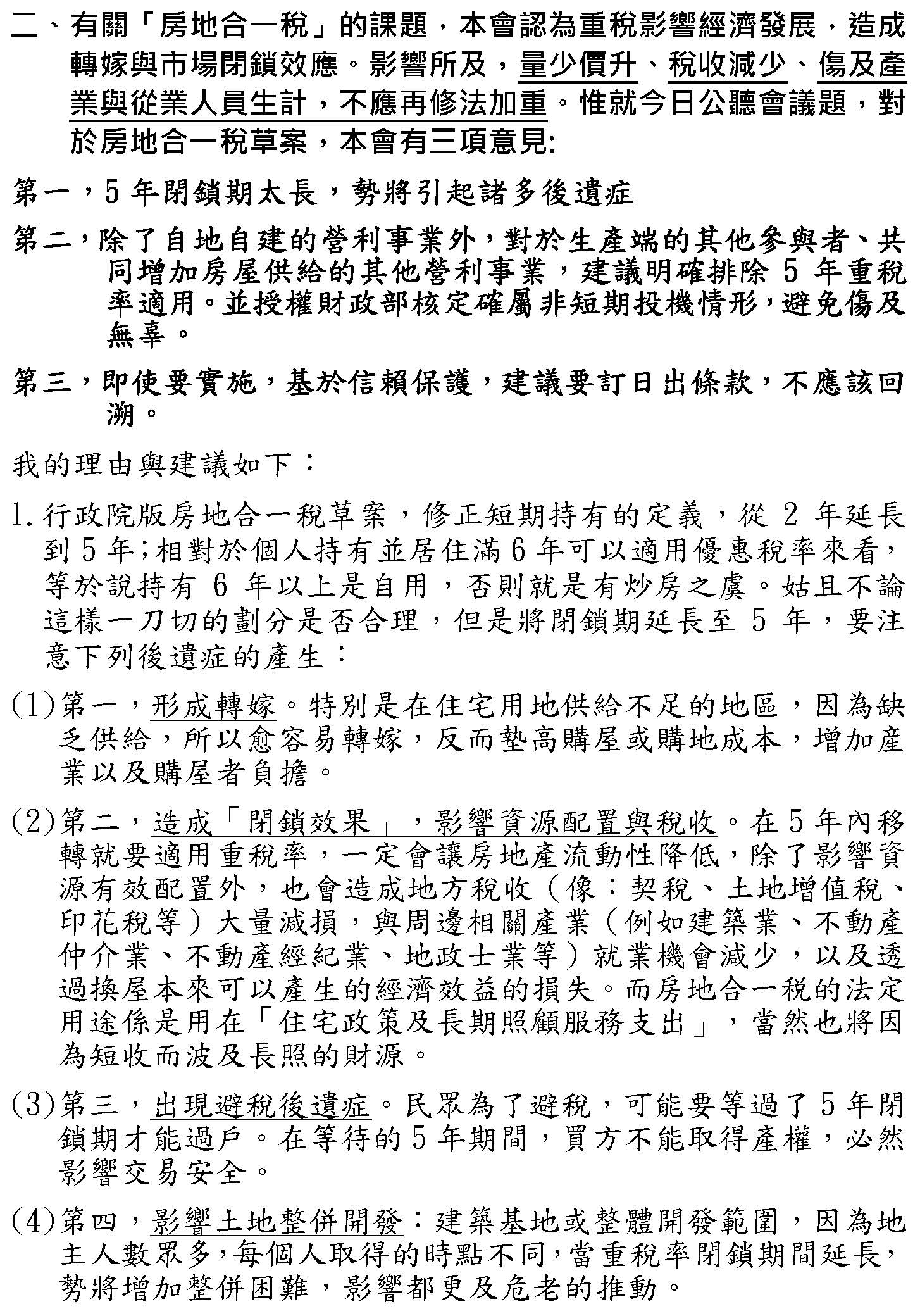 二、有關房地合一稅的課題,本會認為重稅一定會影響經濟發展,造成轉嫁與市場閉鎖,影響所及─量少價升,稅收減少、傷及產業與從業人員生計,不應再修法加重。僅對房地合一稅草案,本會有3個建議:(一)5年的閉鎖期真的太長,將引起眾多的後遺症。(二)除了自地自建的營利事業外,對生產端的其他參與者、共同增加的房屋供給的其他營利事業,建議明確排除在5年重稅的適用,並授權財政部核定確屬非短期投資情形,避免傷及無辜。(三)即使要實施,基於信賴保護,建議要訂出日出條款,不應該回溯。我在理由建議詳如本會所提供的書面,請大家可以參閱。