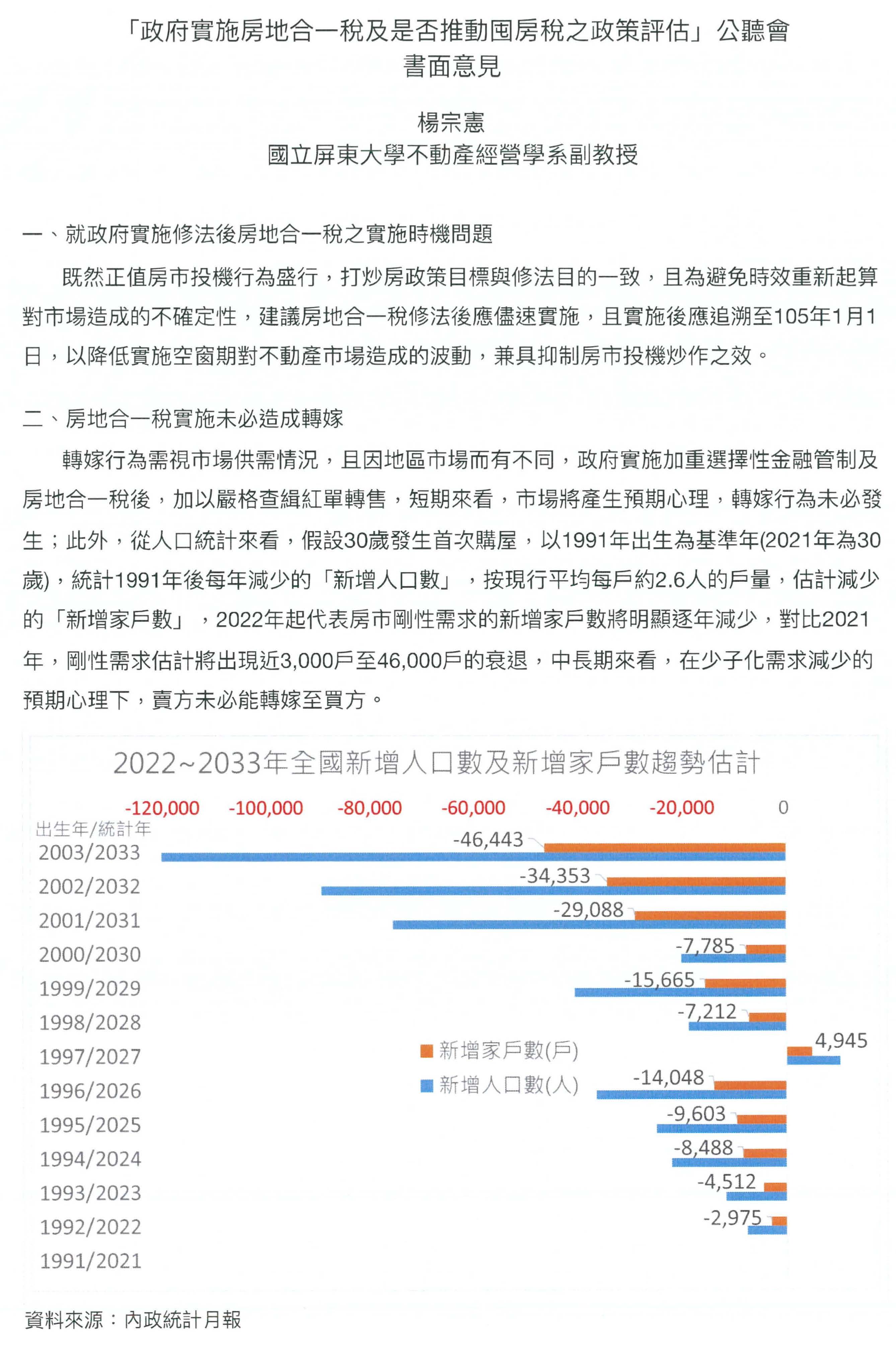 我這裡有一個圖,我來解釋一下,現在大家都在講少子化,如果以30歲購屋來看,今年30歲的人是1991年出生的,用1991年為基準年及30歲購屋的角度來算,明年我們原來應該增加的新增人口數其實已經減少了,我們再用內政部統計的每戶平均戶量2.6人去算,我們可以算出明年因為少子化所減少的新增家戶大概就2,975戶,逐年減少,十年後最高一年減少4萬多戶,這是對比今年的程度,新增家戶在市場上就是所謂的剛性需求,所以長期來看,我覺得少子化的影響是滿嚴重的,在預期心理之下,是不是會有轉嫁這件事,我覺得是可以再研議。
