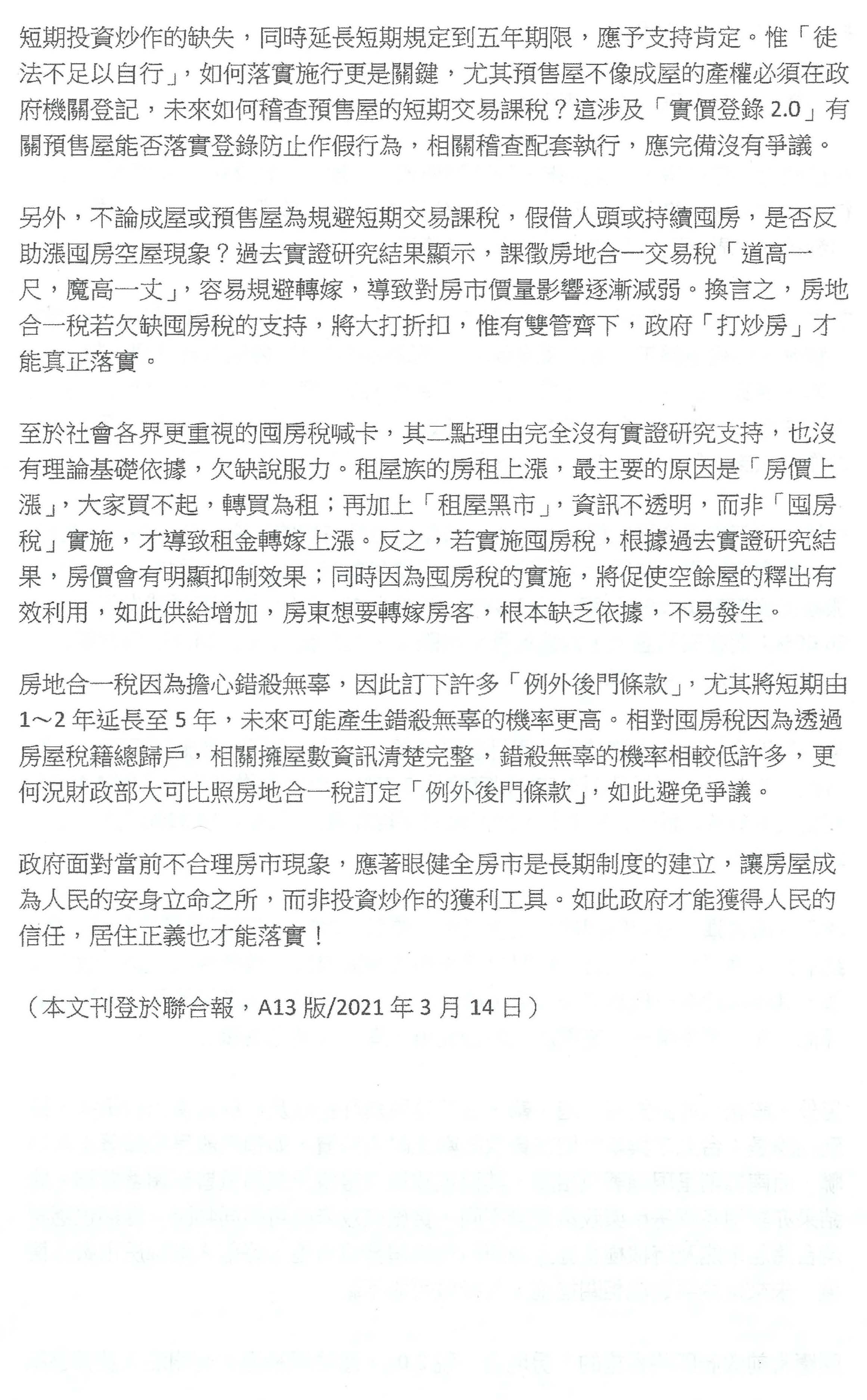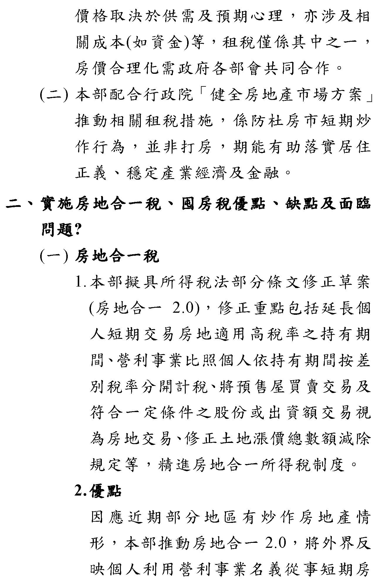 第二個,有關短期這件事情,其實囤房稅是可以短期幫助所謂的房地合一稅,兩者同時執行,這也是個短期方案,絕對不是長期方案。謝謝!