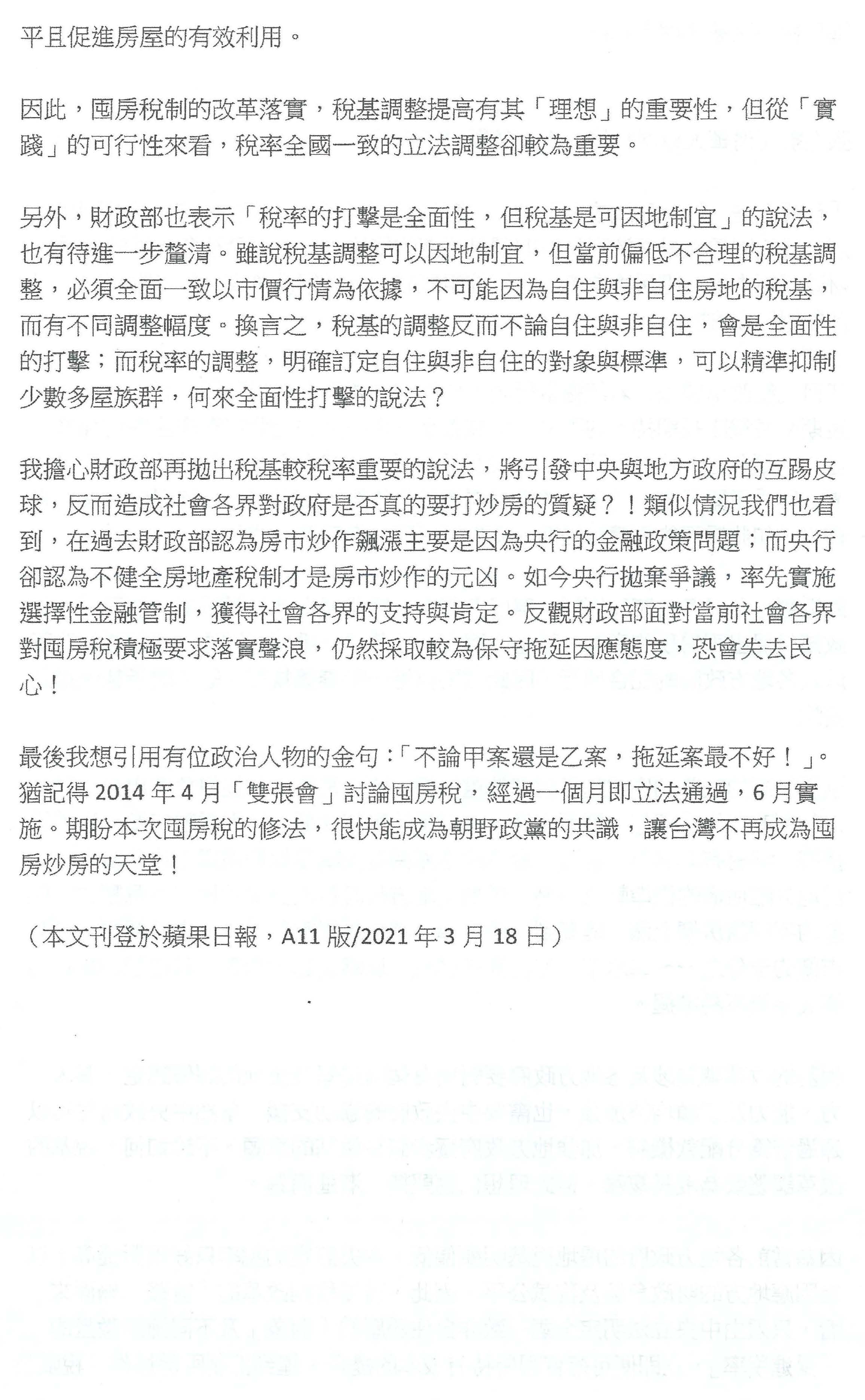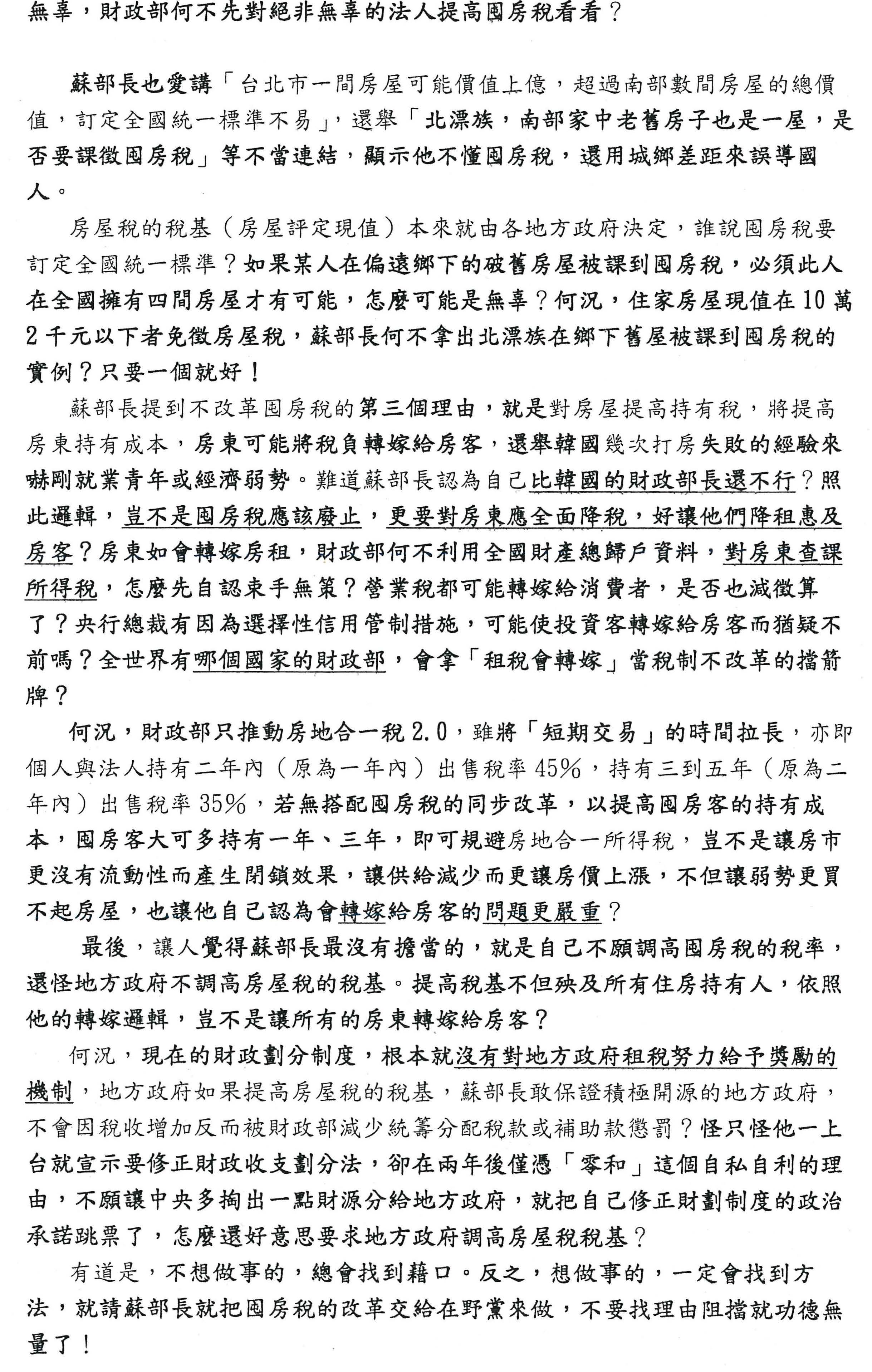 最後一點是財政部要求地方政府提高房屋評定現值的稅基,財政部自己都不提調高稅率,把責任都推給地方政府,請問財政部有沒有提供地方政府財政努力的獎勵機制?沒有啊!本來就可以修正財劃法把它納入,可是跳票的是財政部,就因為「零和」這個理由,中央政府不願意多撥一點財源給地方政府,所以就沒修改財劃法,地方政府當然就沒有誘因調高房屋評定現值,中央自己不帶頭調高稅率,怎麼好意思要求地方政府調高稅基?從以上的觀點,我認為不想做事總會找到藉口,反過來講,想做事的一定會找到方法,如果財政部不想推動囤房稅,那就把改革囤房稅的任務交給在野黨,不要再找理由阻擋囤房稅的改革,謝謝。