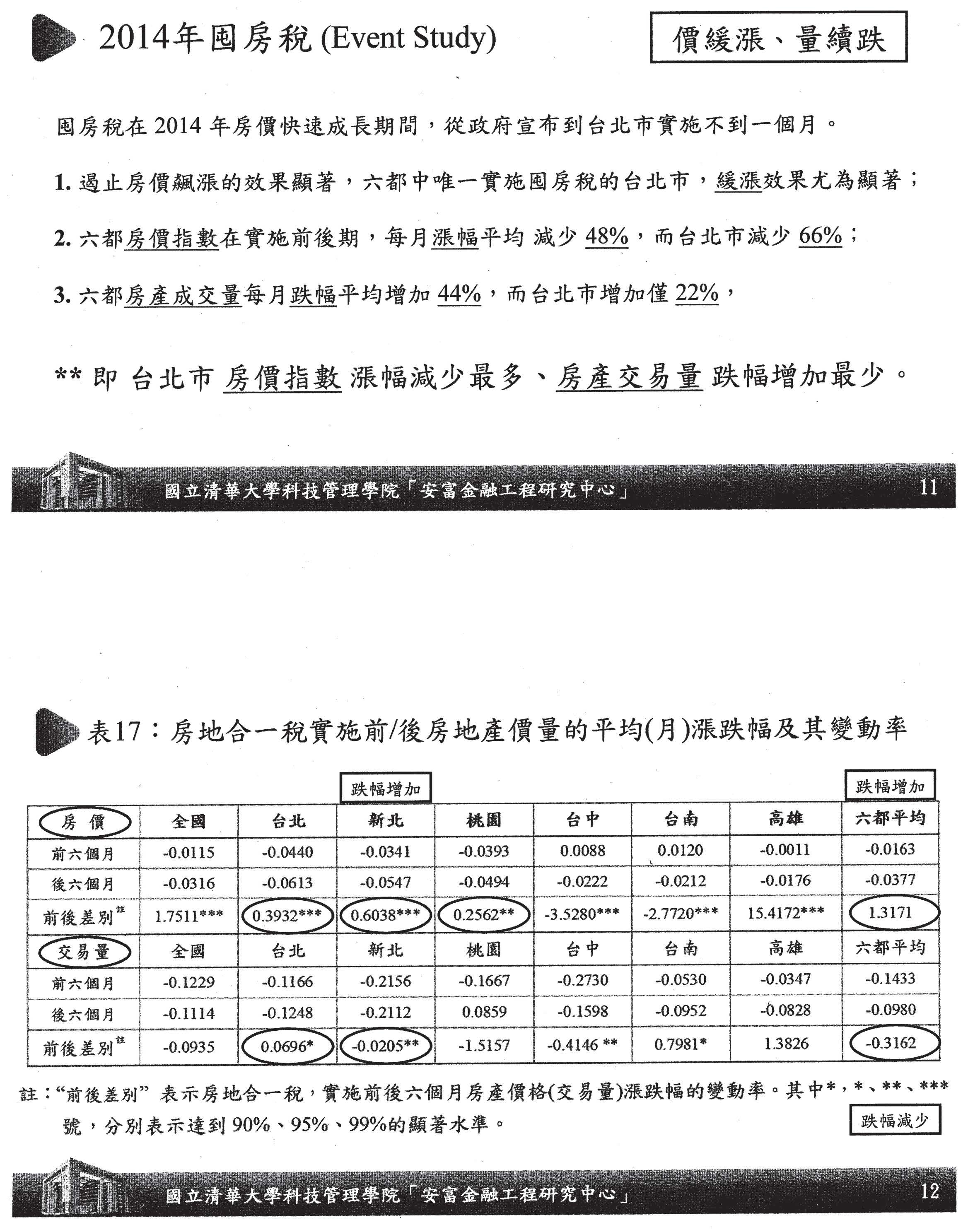 你可以看到,我們做了3個研究,第一個,我們做事件的分析,看到囤房稅的結果,我們用實施前、後六個月的比較,你看,臺北市前六個月上漲本來是百分之八點多,後六個月實施之後,變成百分之二點多,差距到66%,換句話說是降緩它的實施。全國也是一樣,得到房價慢慢緩漲的效果。交易量方面,可以清楚看到臺北市交易量萎縮了,六都也相對萎縮,所以在實證結果上可以發現,2014年囤房稅有價緩漲、量續減,價漲要讓它緩下來是不容易的喔!這個結果看到,臺北市大概是僅增加22%,本來漲很多的時候,現在只增加很少,六都也是相對降低的情況,這是實證的結果,我想大家可以瞭解這樣的結果吧!