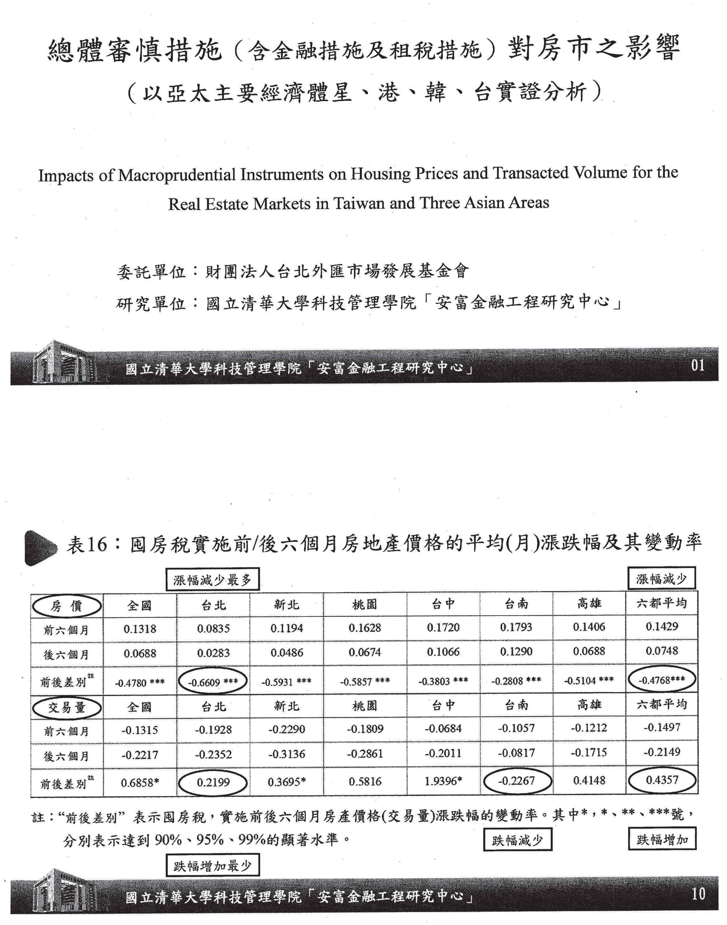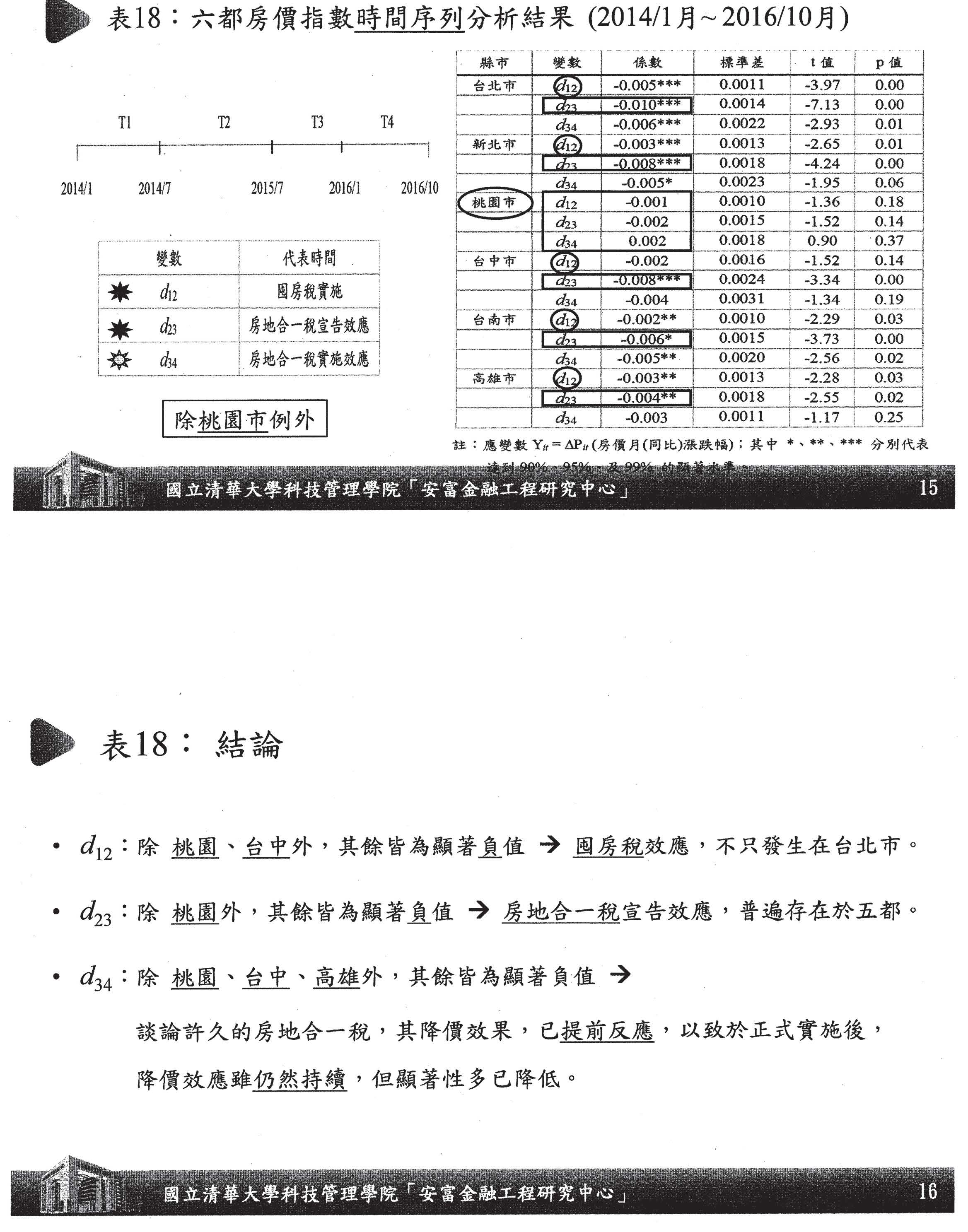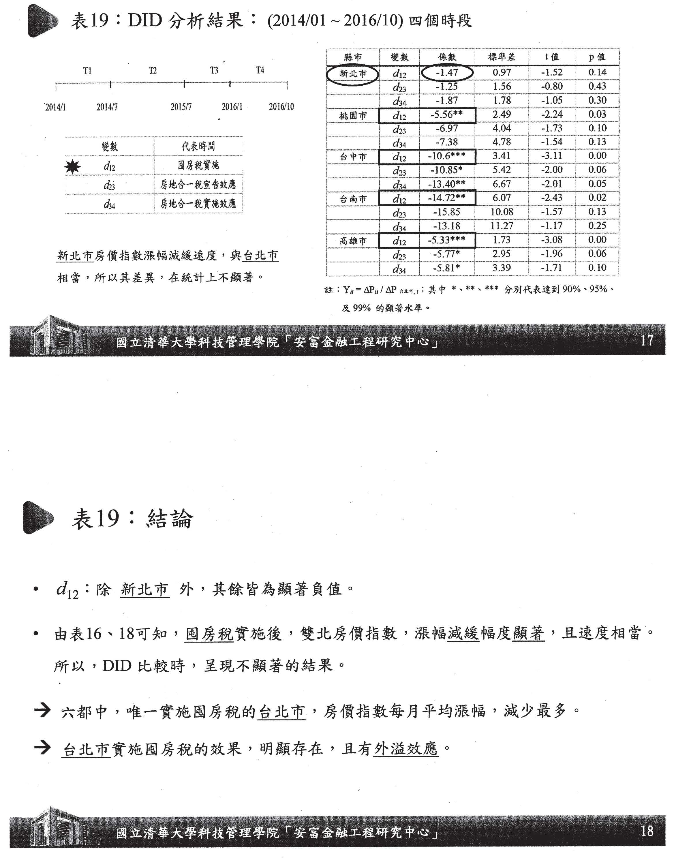 我們另外還做了DID,也就是實驗組跟對照組,之前跟之後,這是最新的研究,囤房稅在各個地方跟臺北市做比較,很清楚發現桃園、臺中、臺南、高雄在沒有實施的結果下,顯然沒有臺北市的效果大。你就發現到,的確更嚴謹的控制了實驗組、對照組,而不是大家講的,房價到底會不會跌?其實這個答案是很清楚的,理論上沒有什麼用處,實證的結果就是這樣子,對不對?這個結果就是告訴大家,其實囤房稅是減緩漲幅顯著有效,而且六都中,唯一實施囤房稅的臺北市是平均漲幅減少最多的地方,是最有效的地方,而且它有外溢效果。這個結論可以看到囤房稅的實施效果以及房地合一的宣示效果都是顯著的。我想這個實證結果告訴大家「有效政策繼續做,遏止投炒趕快做,分眾合擊一起做,有始有終用心做」,這樣的結論希望給大家做參考。