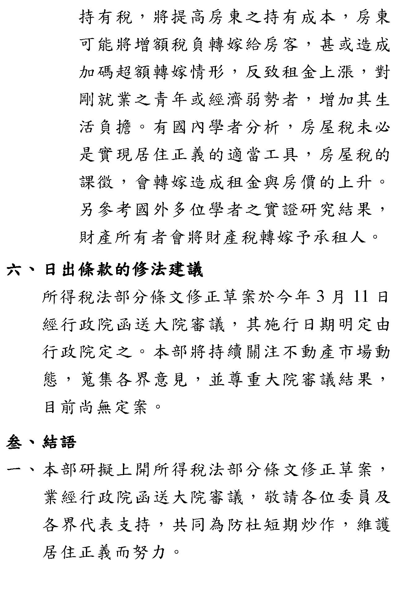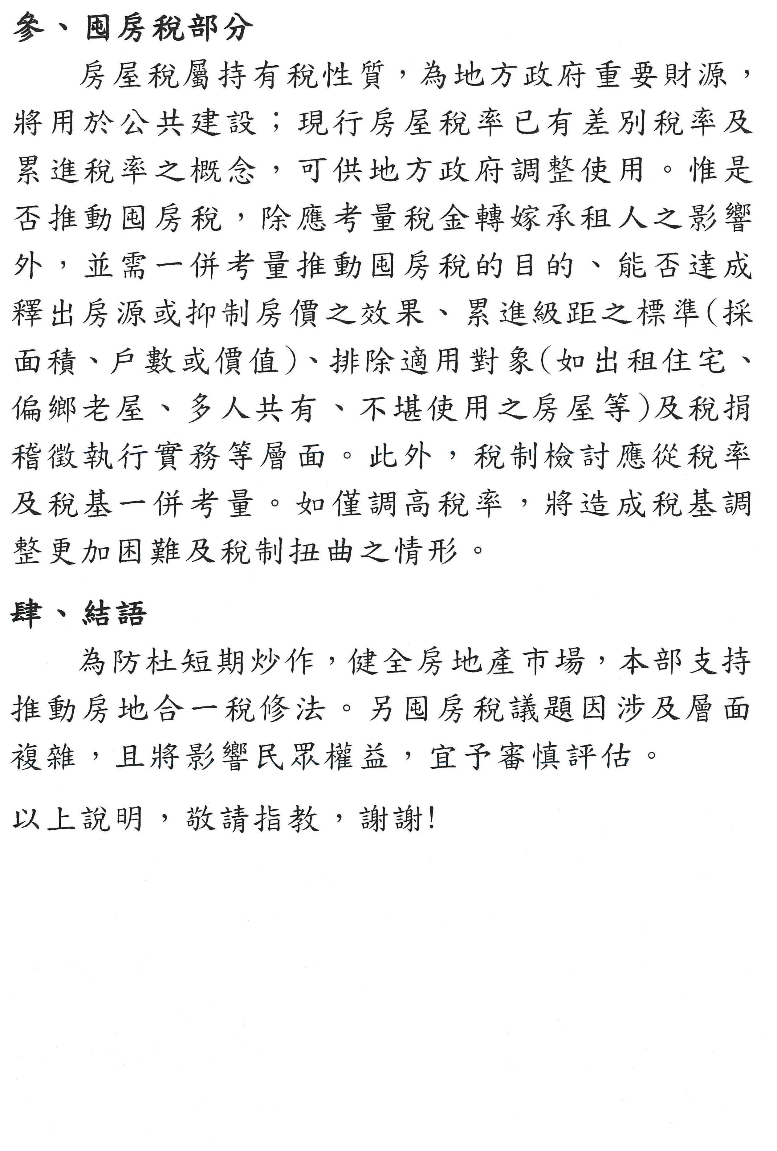 當然,還有就是房地合一稅的部分,剛才有專家提到預售屋的問題,我們也瞭解把預售屋納入房地合一稅基本上是一個新的政策,至於它在法律位階上,我們會進一步再跟內政部來瞭解、研議,看看會不會產生一些問題。最後,非常謝謝各位學者專家所提供的相關意見,基本上我們並沒有去否定房屋稅改革這個共同的目標,但因為房屋稅改革所涉及的層面較廣,我們也會虛心地來檢討,期望能在行政院的房地產健全方案中逐步來落實,謝謝大家。