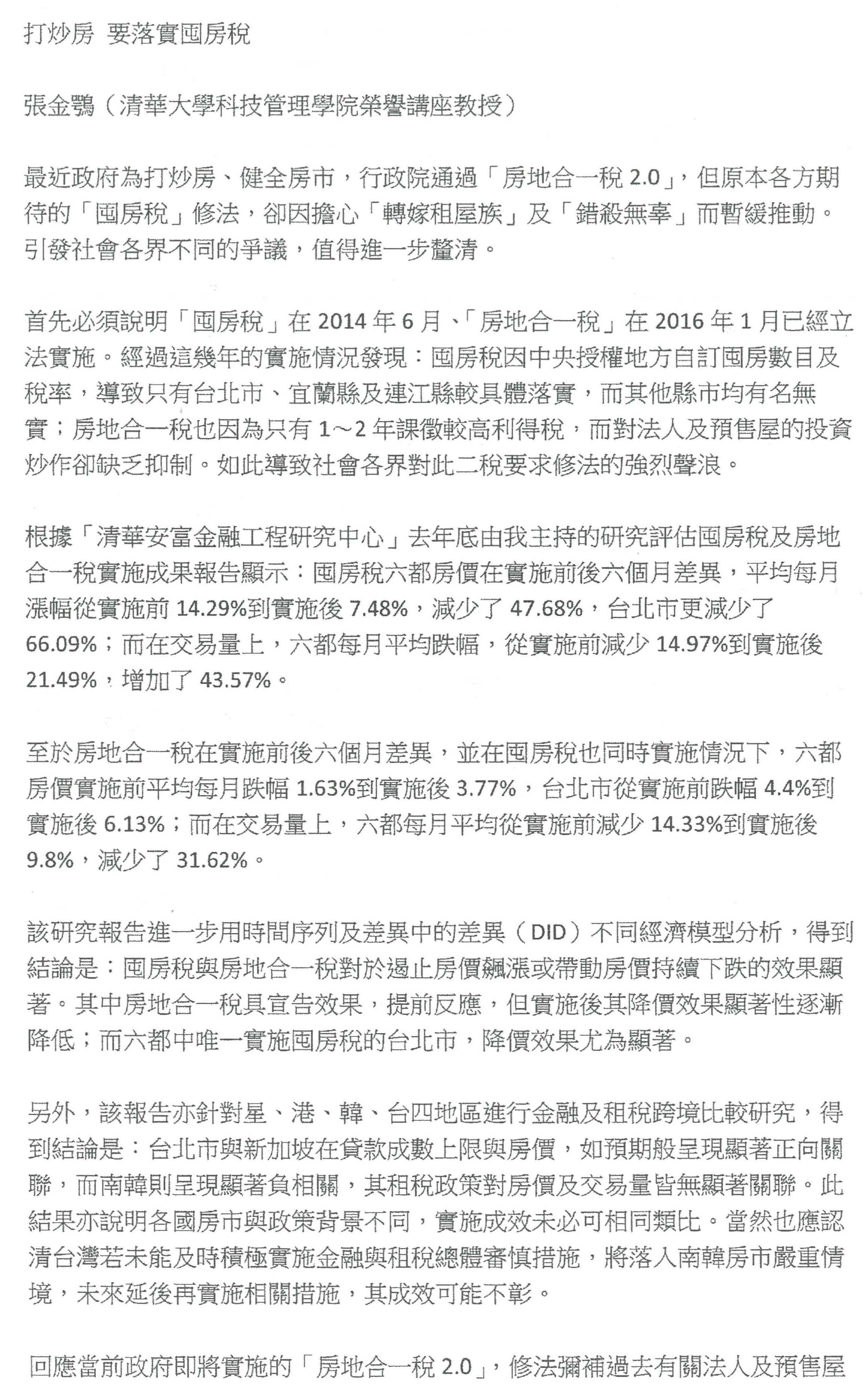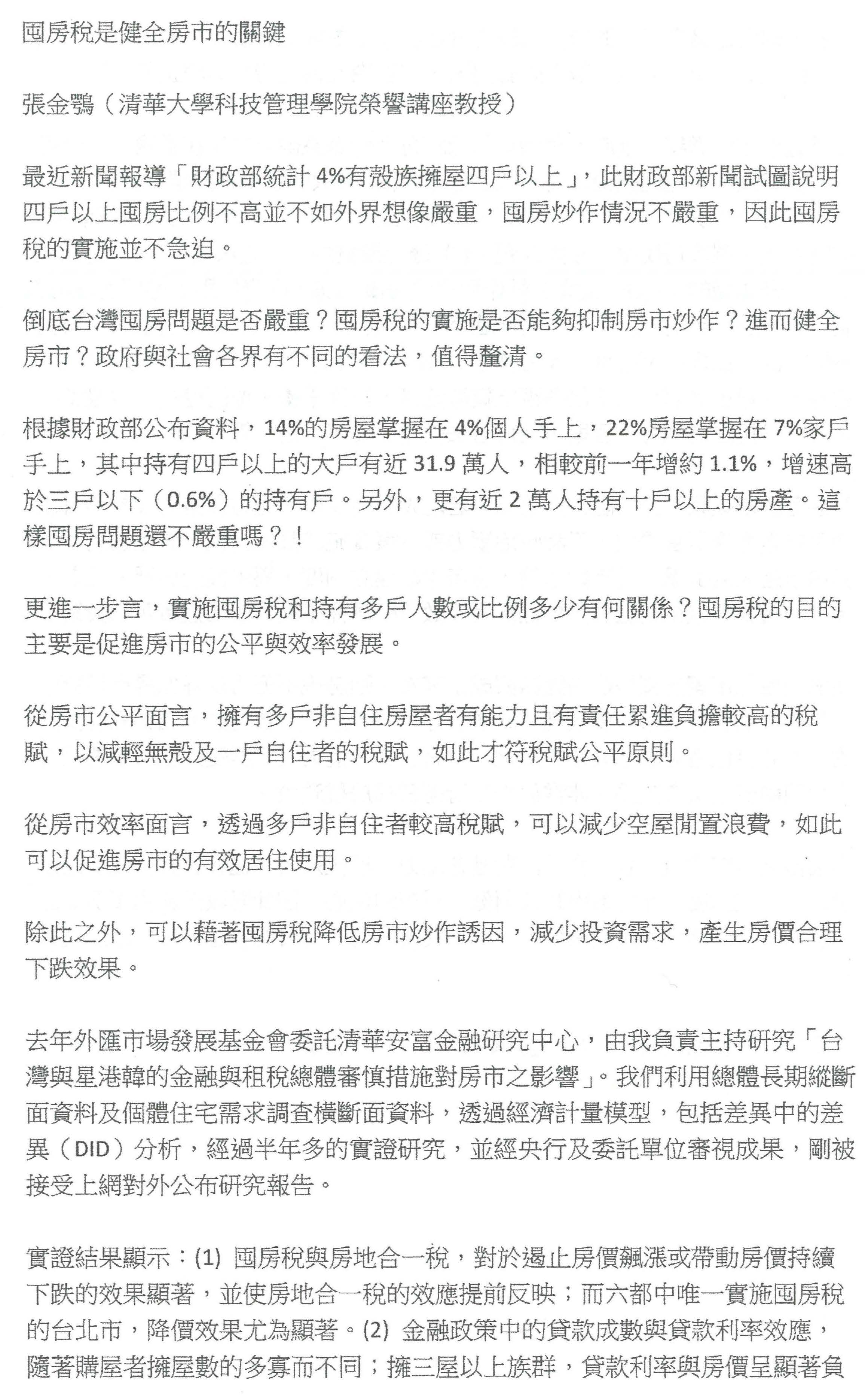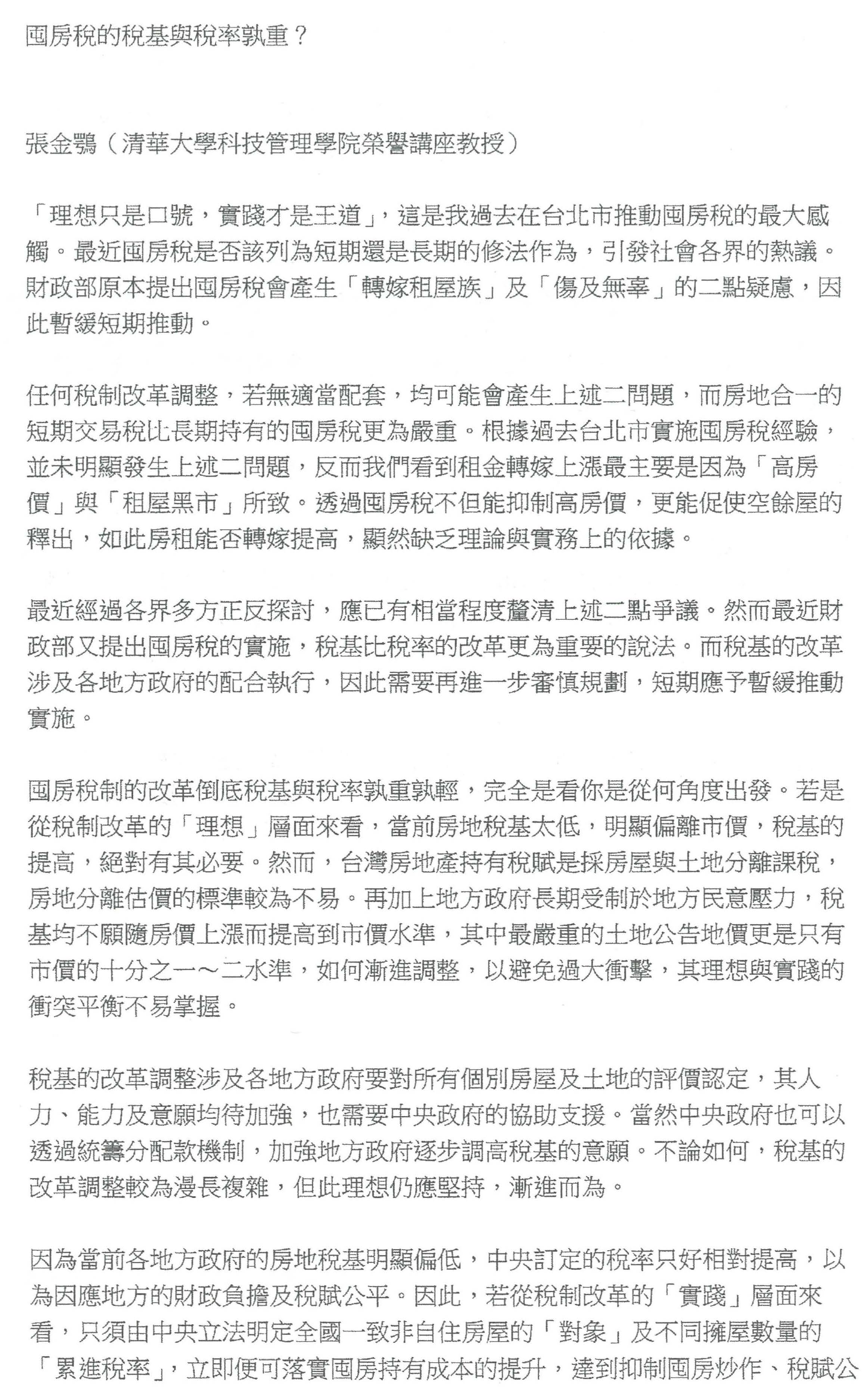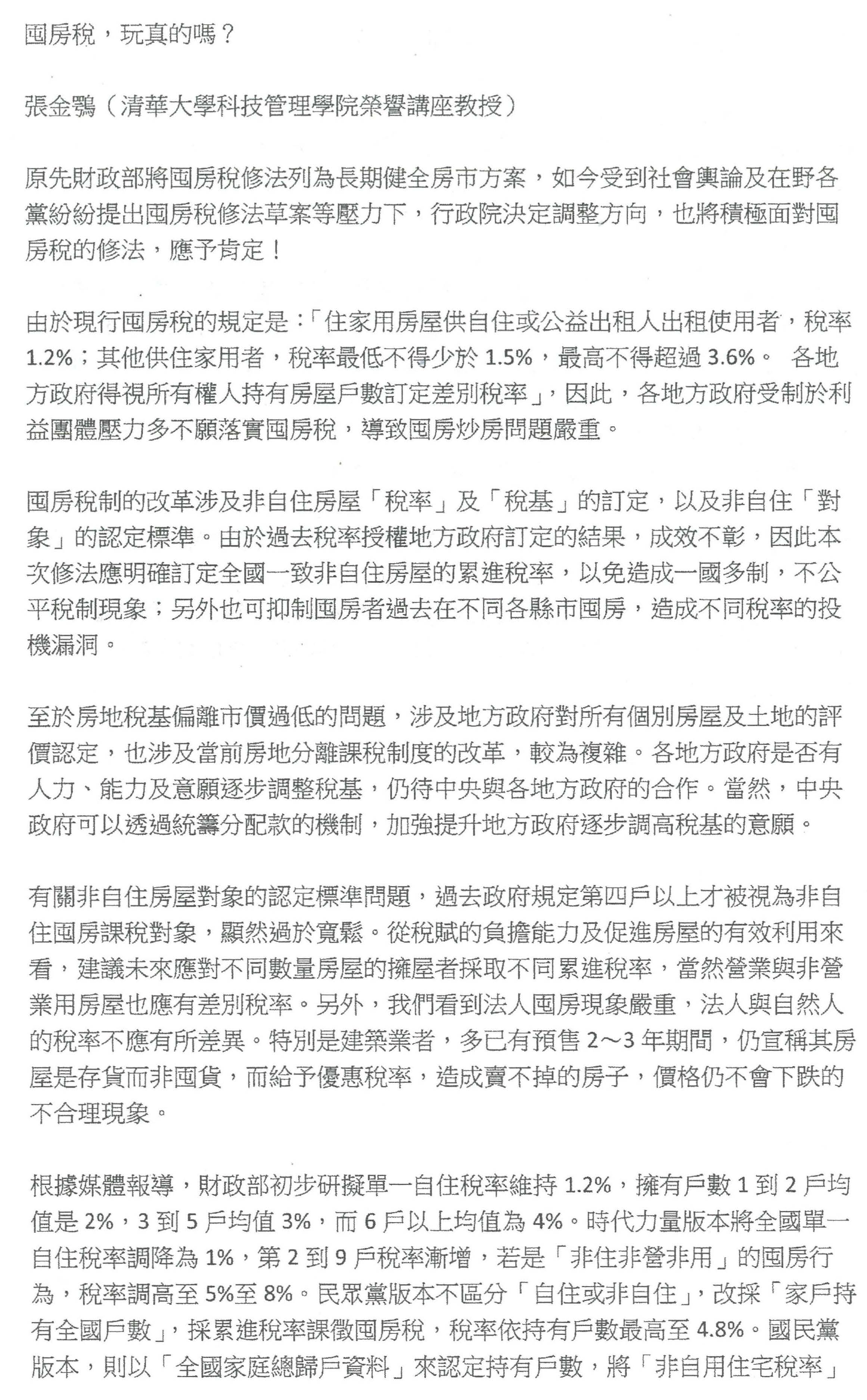 張金鶚教授:我只是想補充回應一下剛剛部長跟次長兩位的說明。第一,落實地方政府這件事情,其實不論囤房稅也好,房地合一稅也好,地方政府都不是沒有做過,都是已經在做的,而且做的層次已經都有評估的檢討,臺北市已經有很清楚的報告,我想也可以做檢討。因此以這個為基礎下,其實不需要再大費周章,我們現在只要按部就班、漸進的把稅率問題先解決掉,這是一個很重要的想法。
